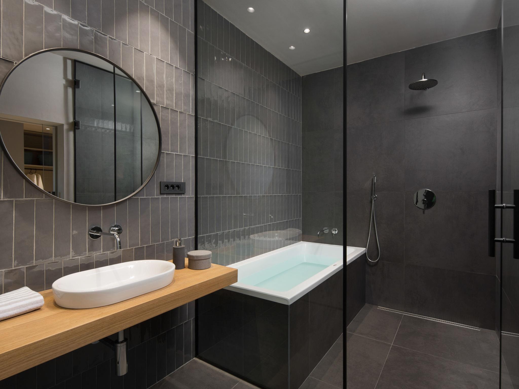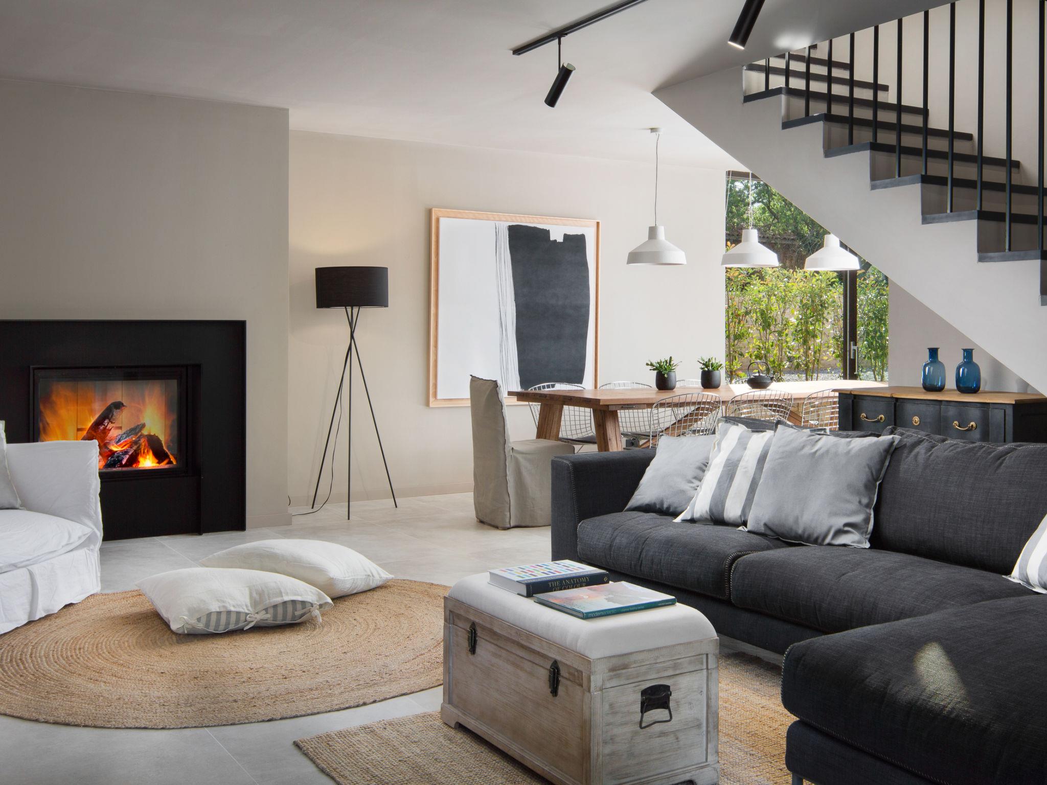 6-room villa 360 m2 on 2 levels. Modern and stylish furnishings: living/dining room with satellite TV and air conditioning. Exit to the swimming pool. 1 room with 1 french bed (180 cm, length 200 cm), shower/WC, double hand-basin, satellite TV and air conditioning. Open kitchen (oven, dishwasher, 4 induction hot plates, kettle, microwave, freezer, electric coffee machine). Upper floor: 1 room with 2 beds (90 cm, length 200 cm), shower/WC, satellite TV and air conditioning. Exit to the terrace. 1 room with 1 french bed (160 cm, length 200 cm), bath/shower/WC, satellite TV and air conditioning. 1 room with 1 french bed (160 cm, length 200 cm), bath/WC, satellite TV and air conditioning. 1 room with 1 french bed (180 cm, length 200 cm), shower/bidet/WC, double hand-basin, satellite TV and air conditioning. Electric heating. Deck chairs. Facilities: washing machine, iron, baby cot, hair dryer. Internet (WiFi, free).