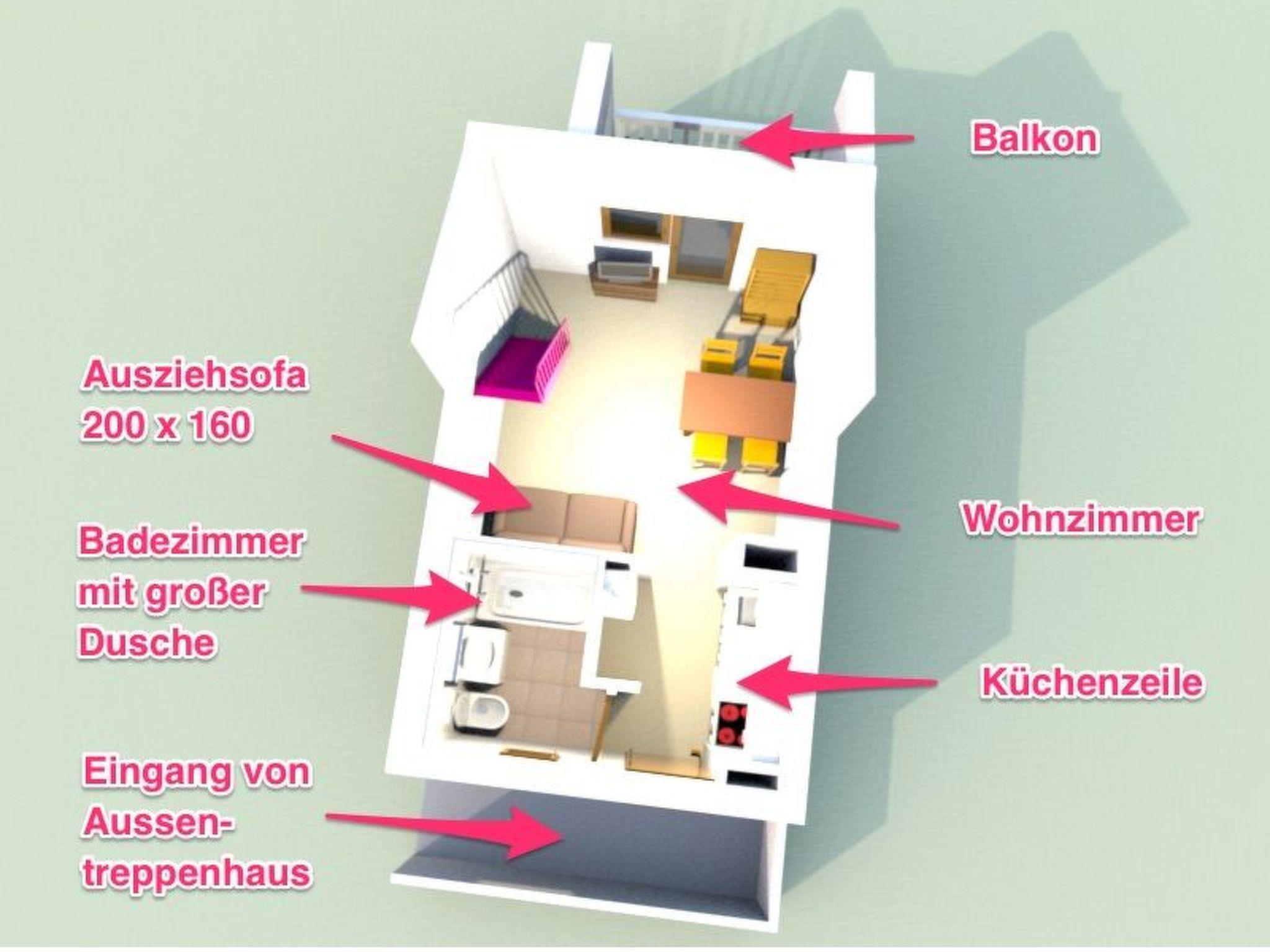 My holiday flat has 39 m² and offers space for up to 4 adult guests or 2 adults and 2 children. The entrance is via an external staircase and a gallery on the second floor of a residential building. In addition to the gallery in front of the entrance to the flat, it also has two balconies (one on the south side and one on the north side). It therefore offers many opportunities to spend time in the fresh air and sunshine. It has a small, fully equipped kitchen in the hallway directly by the entrance and the gallery, a bathroom with shower, a living room with sofa bed and a bedroom with double bed. The sofa bed in the living room can be converted into a double bed. The flat has two floors. The entrance, hallway, kitchen, bathroom and living room are on the lower floor. The bedroom is on the upper floor and can be reached via a staircase from the living room. In front of the bedroom is a nice balcony facing south to the courtyard and from it you have a view of the sea, which is somewhat limited by neighbouring buildings. In the street in front of the building there is ample free parking and you can see your car from the north balcony of the flat.