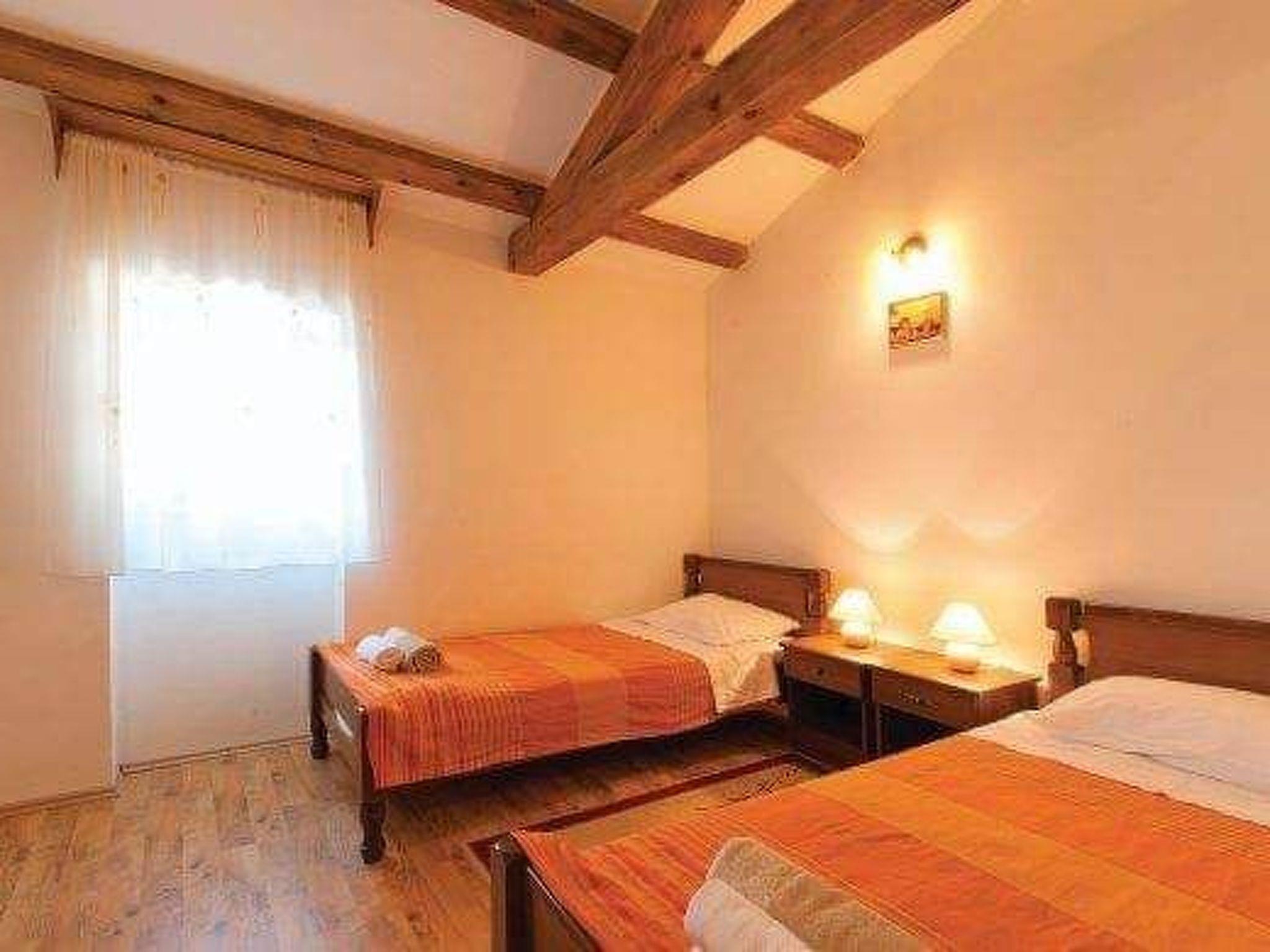 The 100m² house has air conditioning and can accommodate four people. The first bedroom has a double bed and its own terrace with a table and two chairs. The second bedroom has two single beds and a supplementary bed. The kitchen is fully-equipped with a gas and electric stove, a fridge-freezer, dishwasher, microwave and coffee machine. Right next to the kitchen there is a little dining space for four people. A stone archway leads into the big living room with its traditional Istrian fireplace, where you can sit comfortably on leather sofas and armchairs. Next to it there is the larger dining table with space for ten people. Modern entertainment electronics include a radio, a DVD player and satellite TV. The utility room provides a washing machine, an iron, an ironing board and a clothes horse. The two bathrooms have a shower and a toilet.