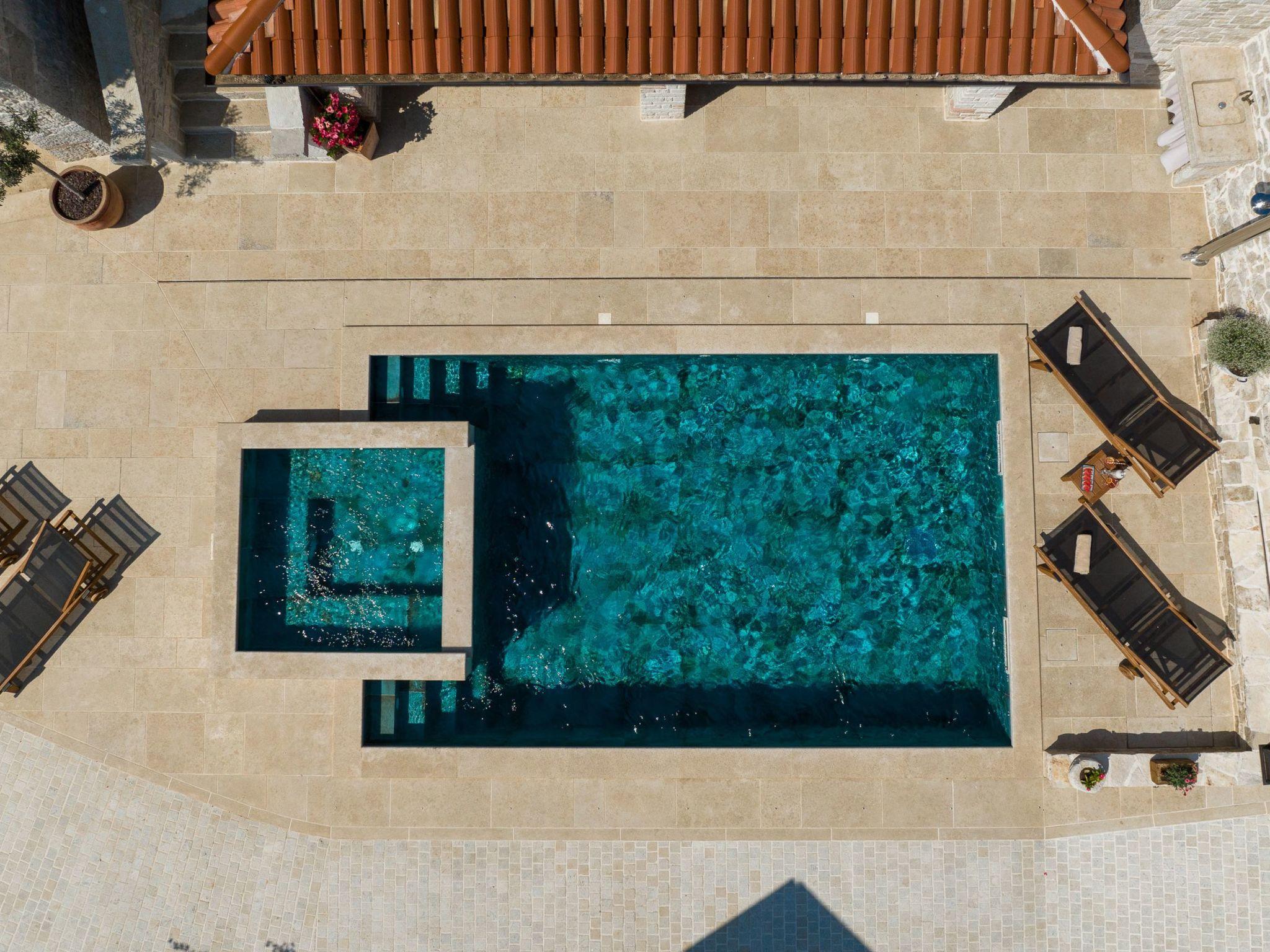 Villa Caterina has a capacity of 10-12 people, covers a total of 350 m² of living space, consists of three separate units and is ideal for larger groups or several families. The first unit consists of a ground floor with living room with fully equipped kitchen, dining table, sofa bed for 2 persons and fireplace as well as a bathroom with shower/WC. From the living room there is direct access to the covered terrace and pool. On the first floor there is a bedroom with separate beds, a spacious bedroom with a double bed and a bathroom with shower/WC in the hallway. Both rooms offer a beautiful view of the garden and pool.