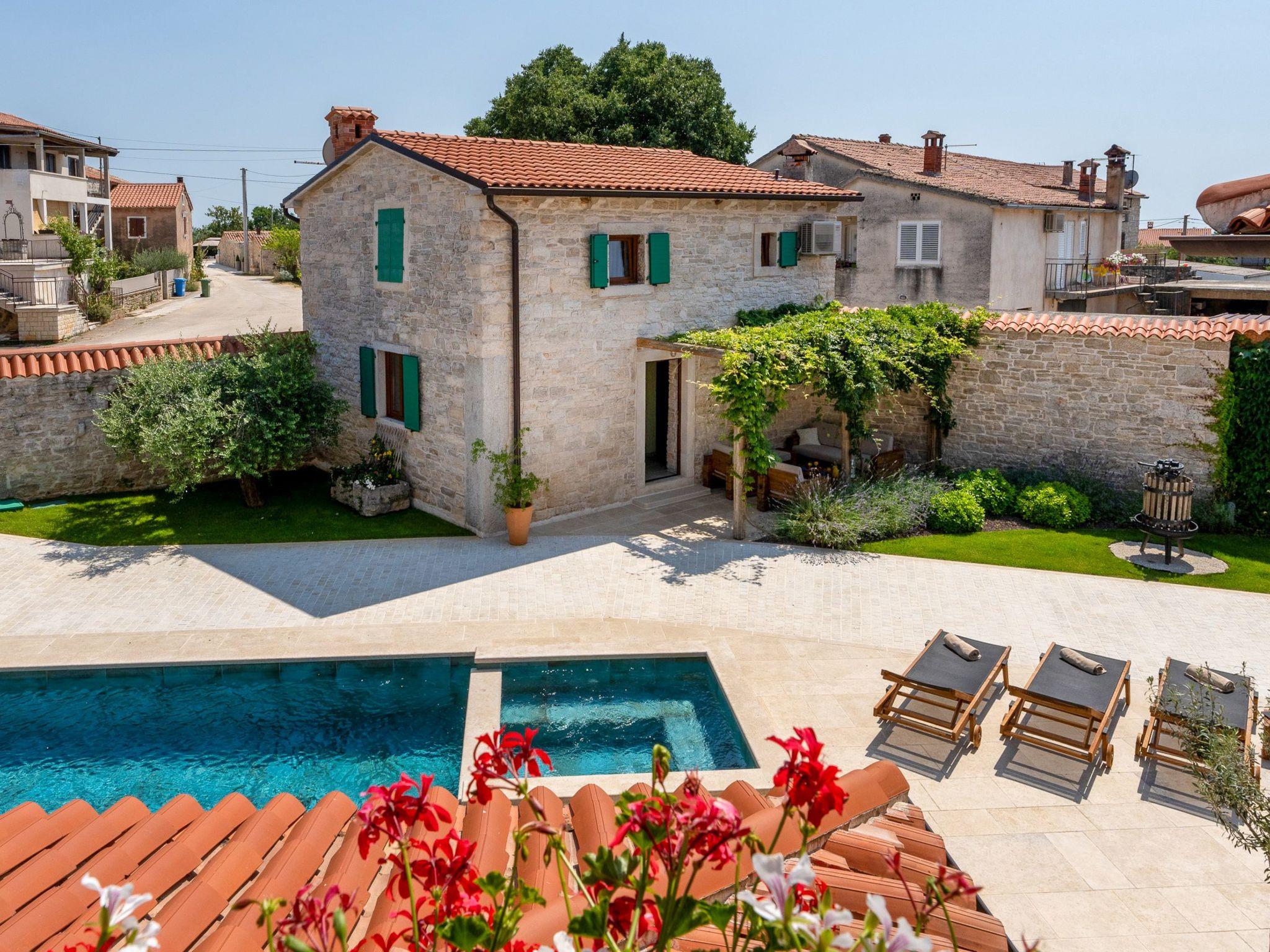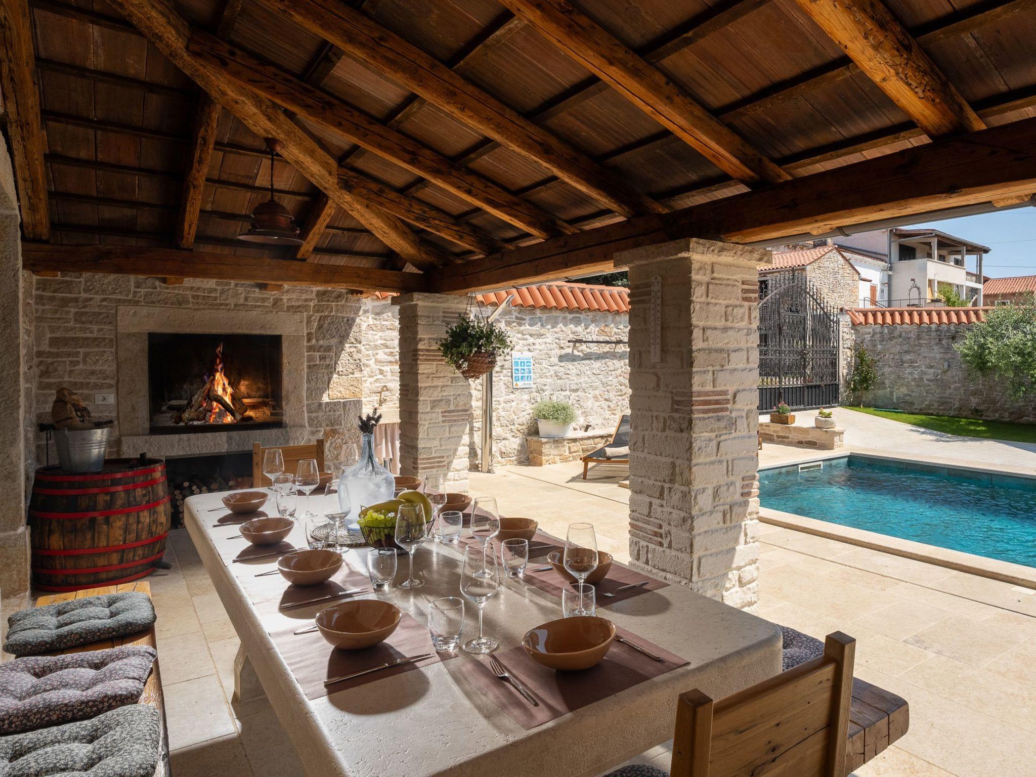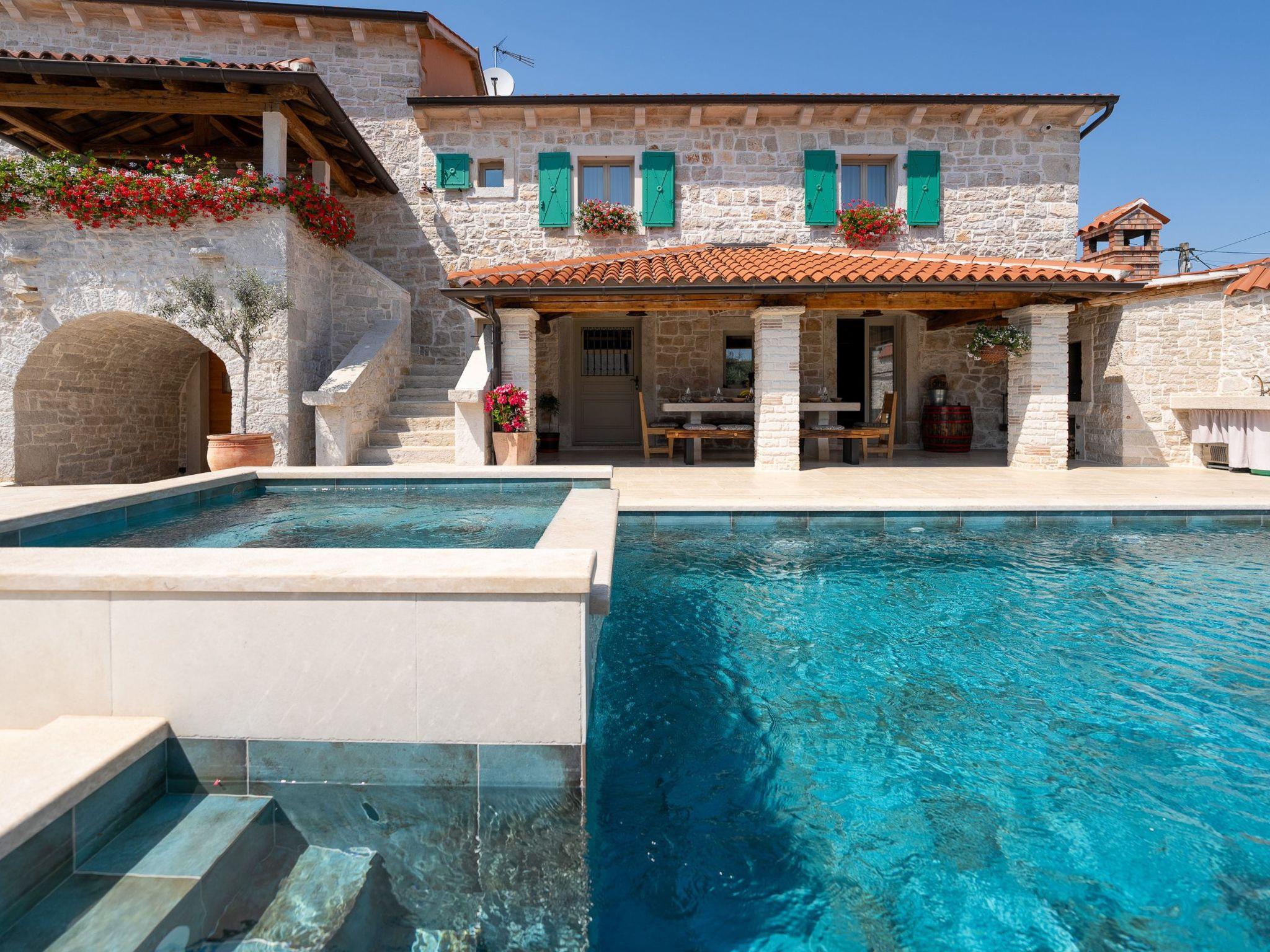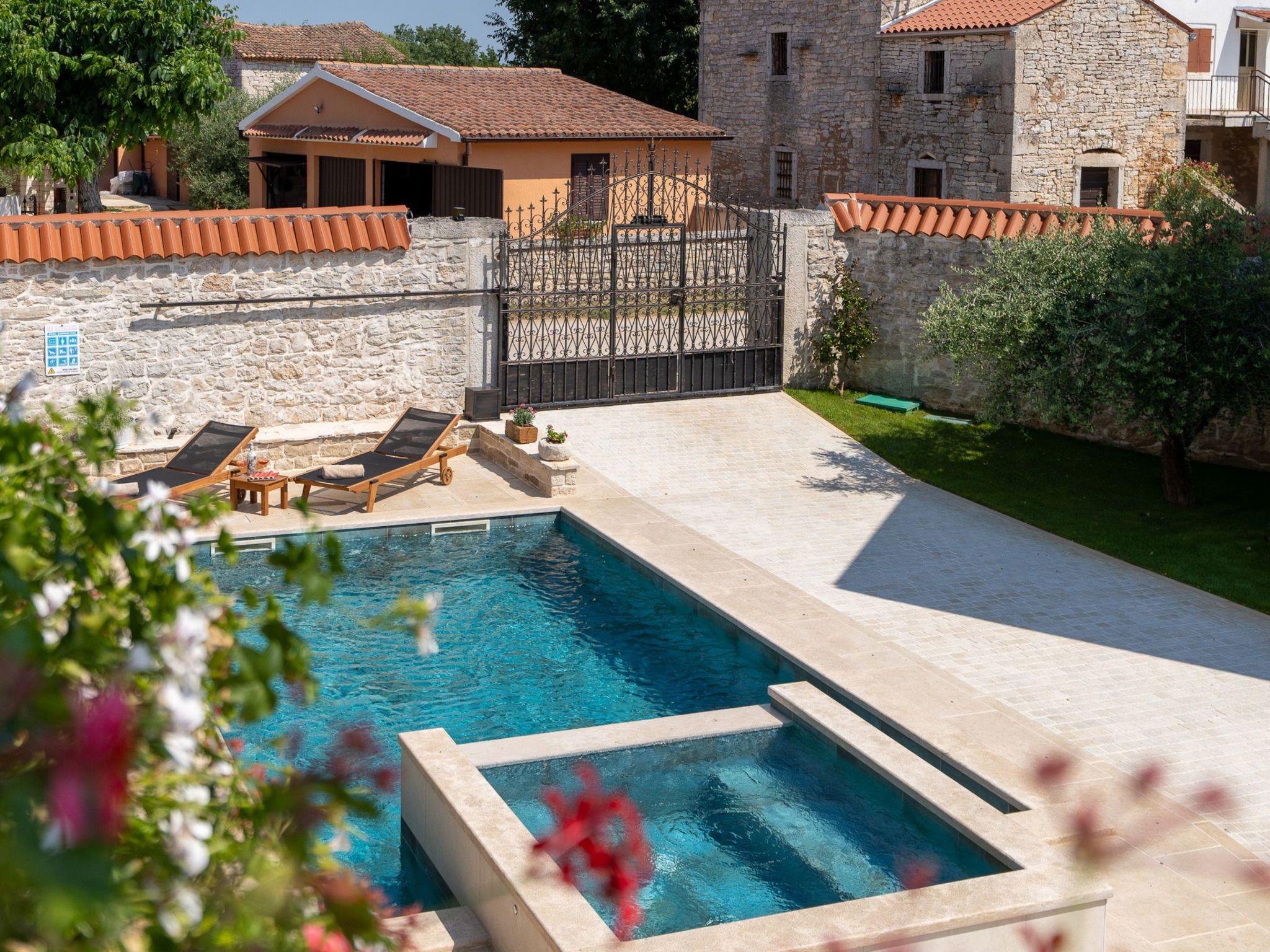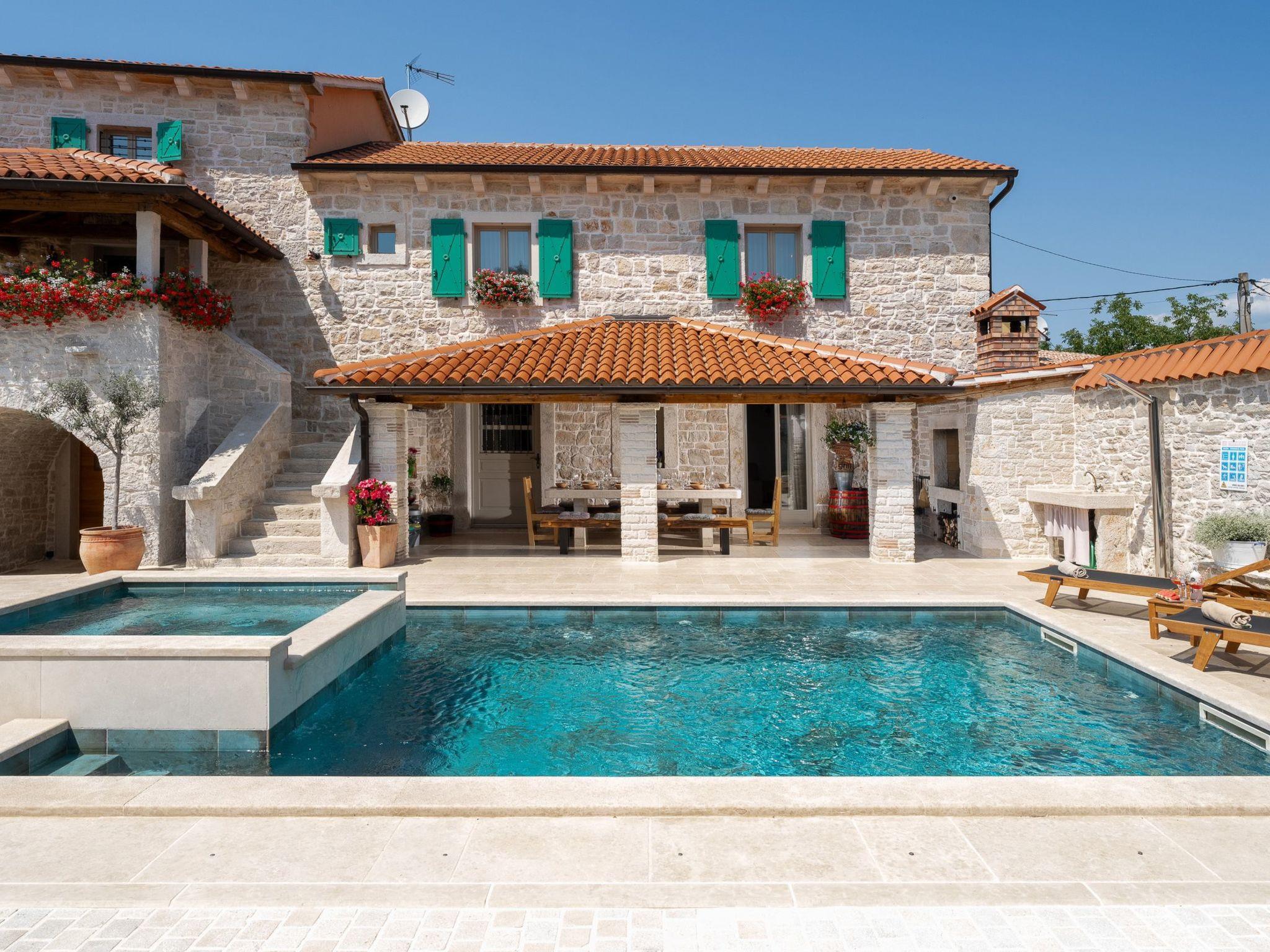 Villa Caterina is a holiday home with pool near St. Lovrec, only 15 km from Porec and the beach, and the Lim Channel is 8 km away. The house is located on a fully fenced garden of 500 m² with manicured lawn and flowers, 26 m² swimming pool, jacuzzi and sun loungers. Next to the pool is a lovely covered terrace with a large table for 12 people and a charcoal barbecue. There are several parking spaces in front of the house.