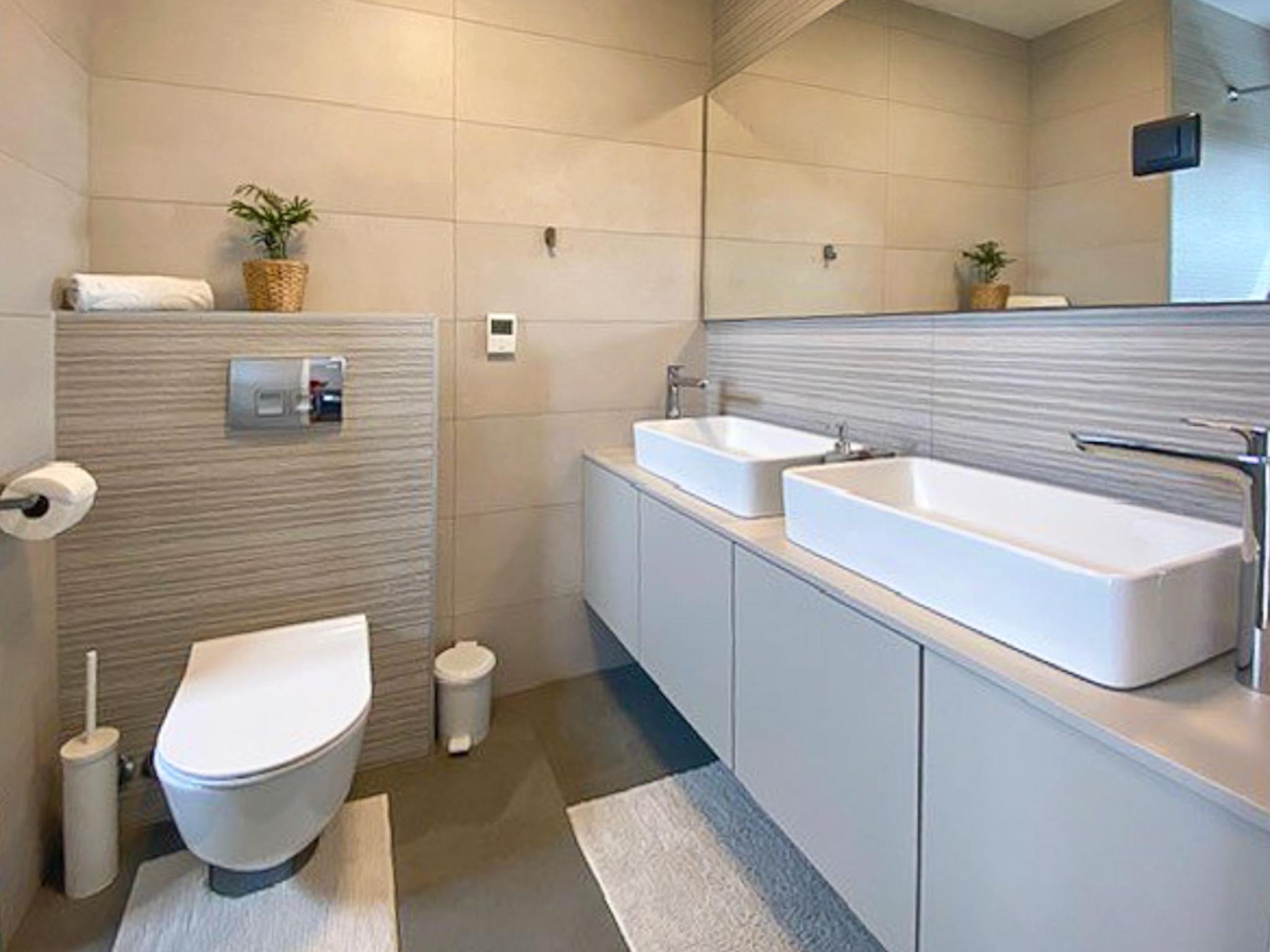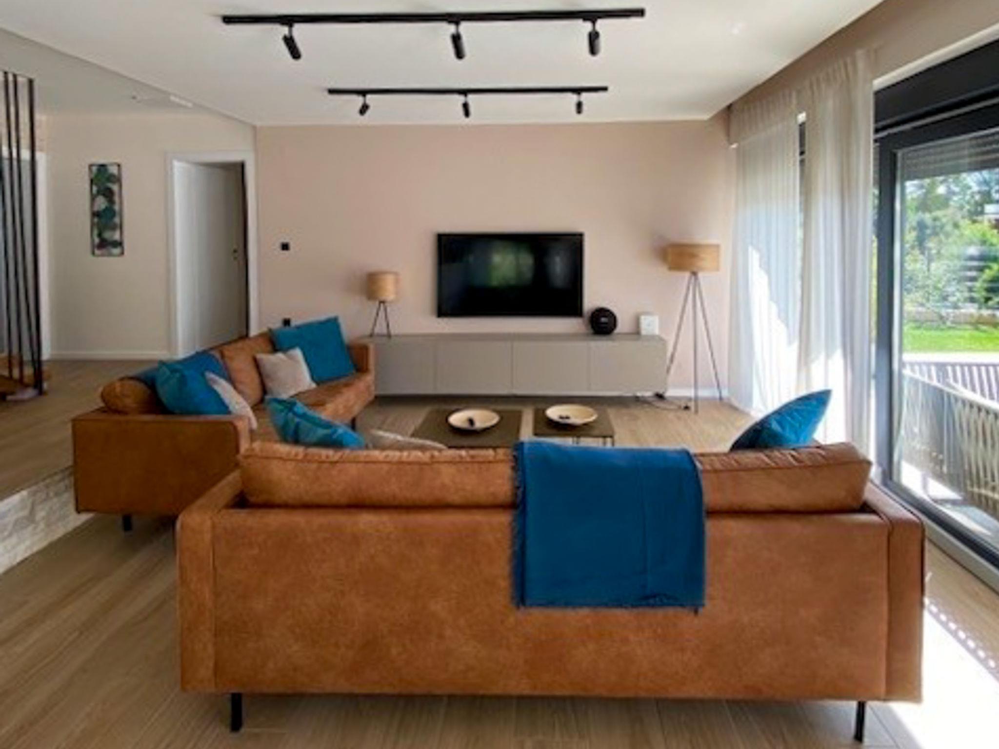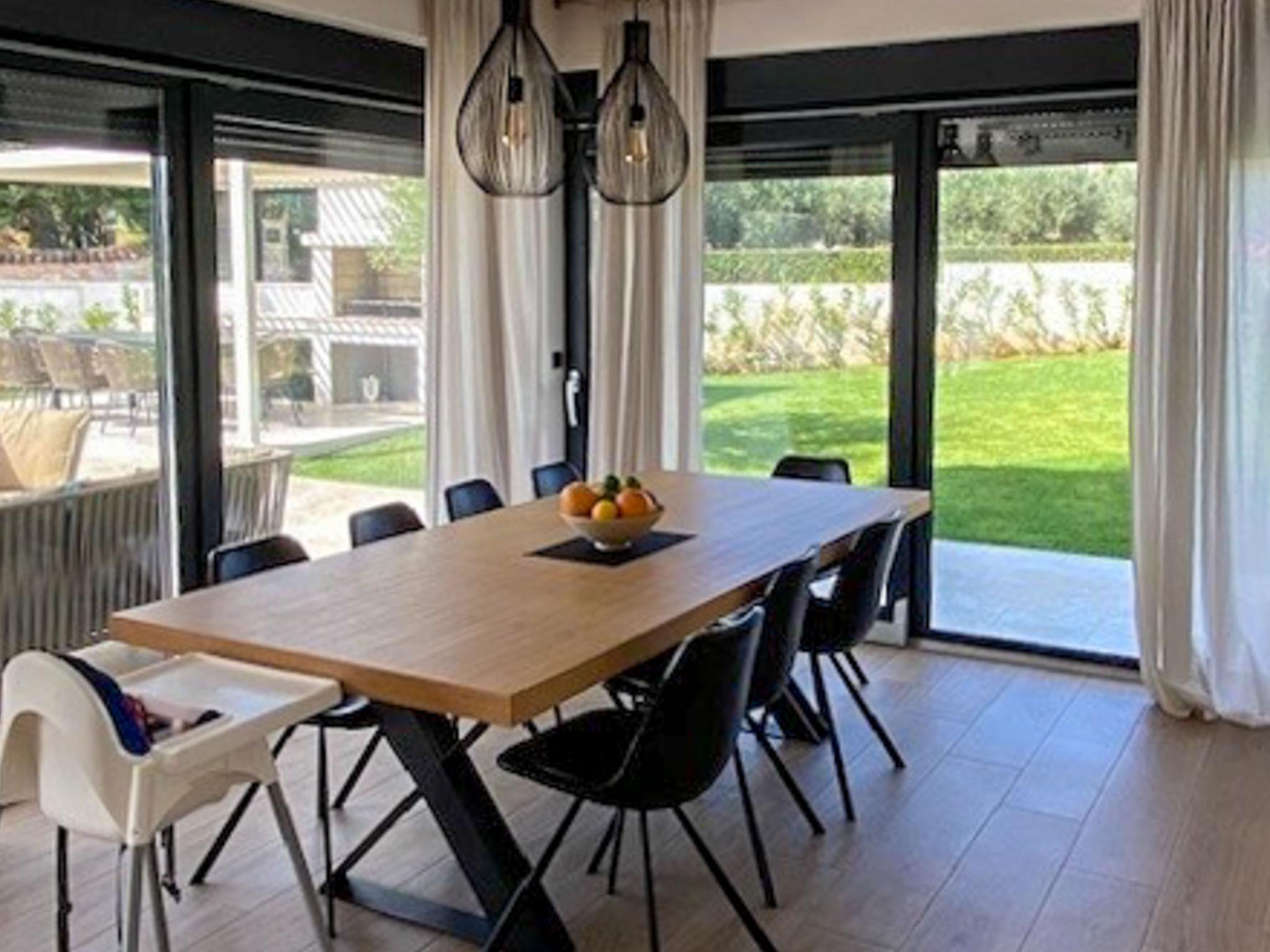 5-room villa 200 m2 on 2 levels. Modern and tasteful furnishings: living/dining room with satellite TV and air conditioning. Exit to the swimming pool. 1 room with 2 beds (90 cm, length 200 cm), shower/WC and air conditioning. Exit to the swimming pool. Open kitchen (oven, dishwasher, 4 ceramic glass hob hotplates, toaster, kettle, microwave, freezer, electric coffee machine). Sep. WC. Upper floor: 1 room with 2 beds (90 cm, length 200 cm), shower/bidet/WC and air conditioning. Exit to the terrace. 2 rooms, each room with 2 beds (90 cm, length 200 cm), shower/WC and air conditioning. Exit to the terrace. Forced-air heating. Terrace 50 m2. Terrace furniture, deck chairs. Facilities: hair dryer. Internet (WiFi, free).