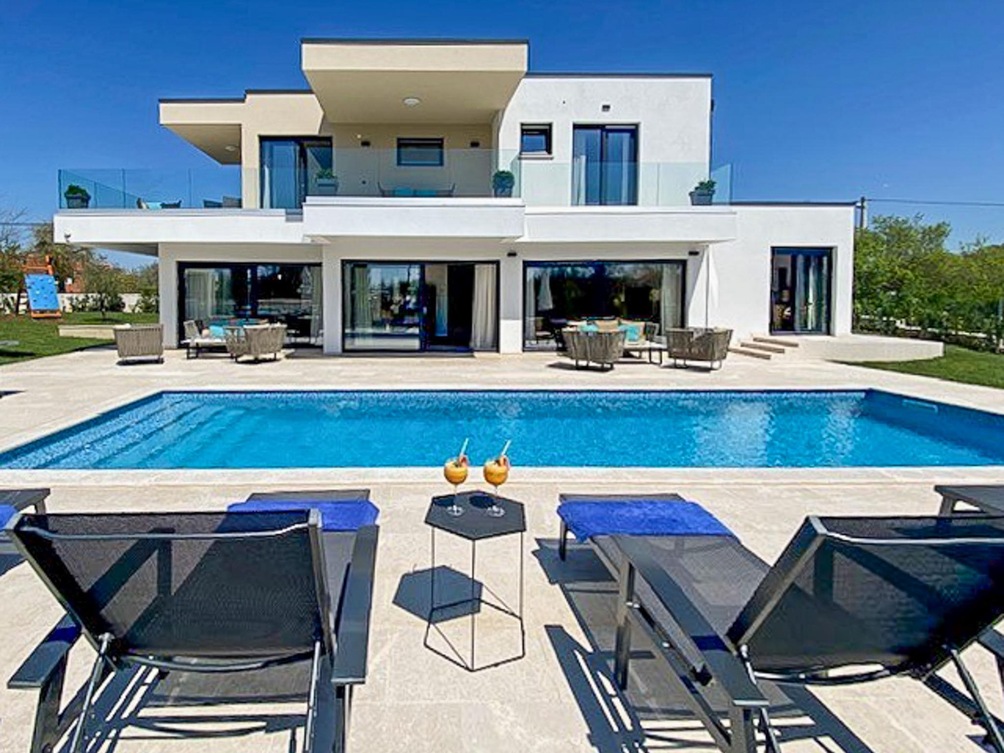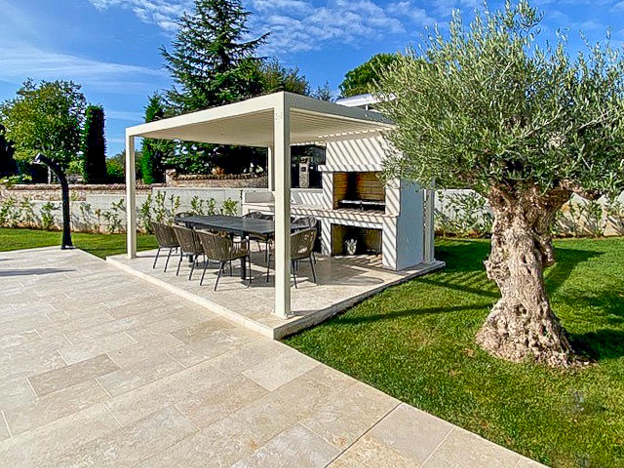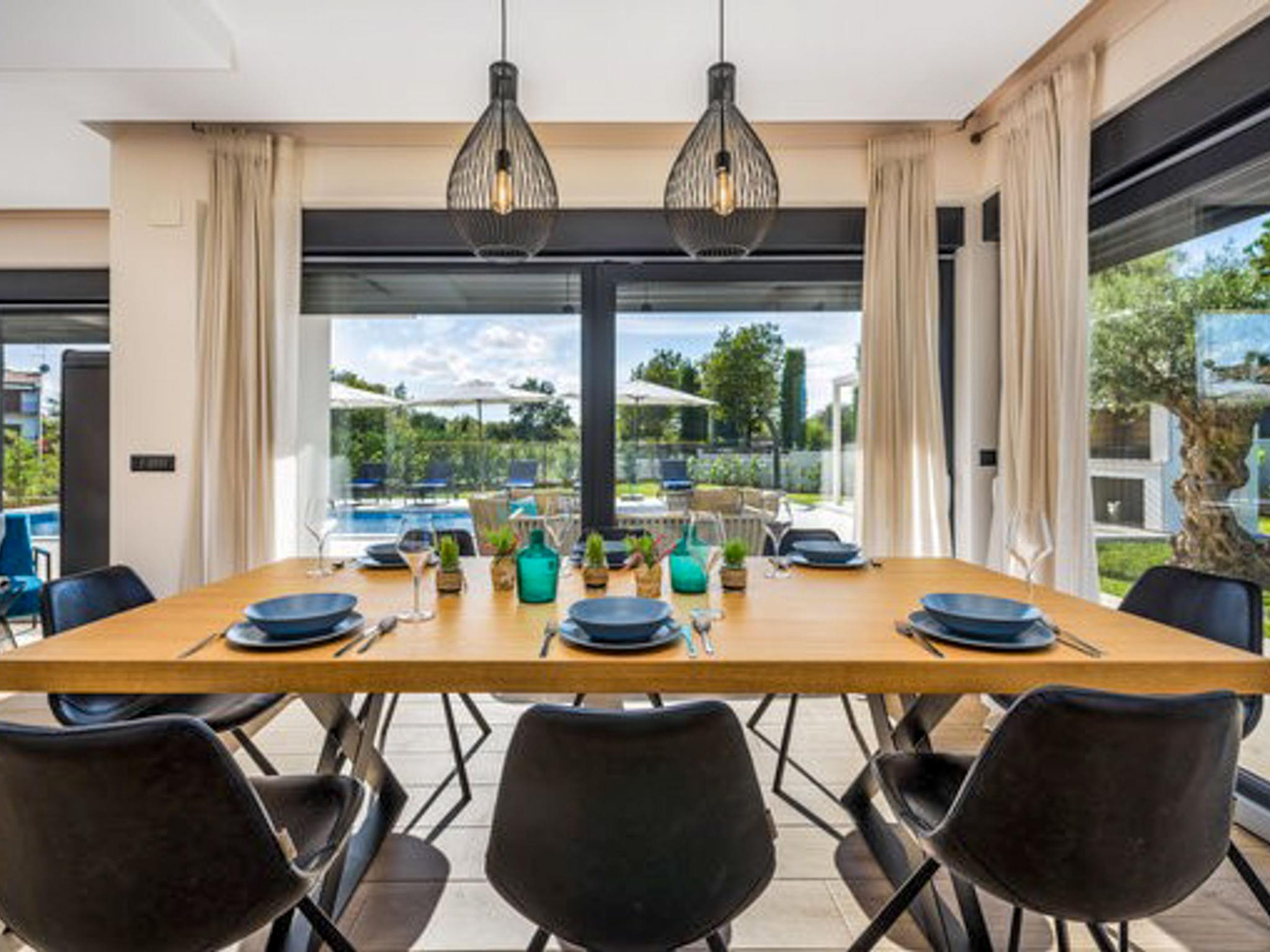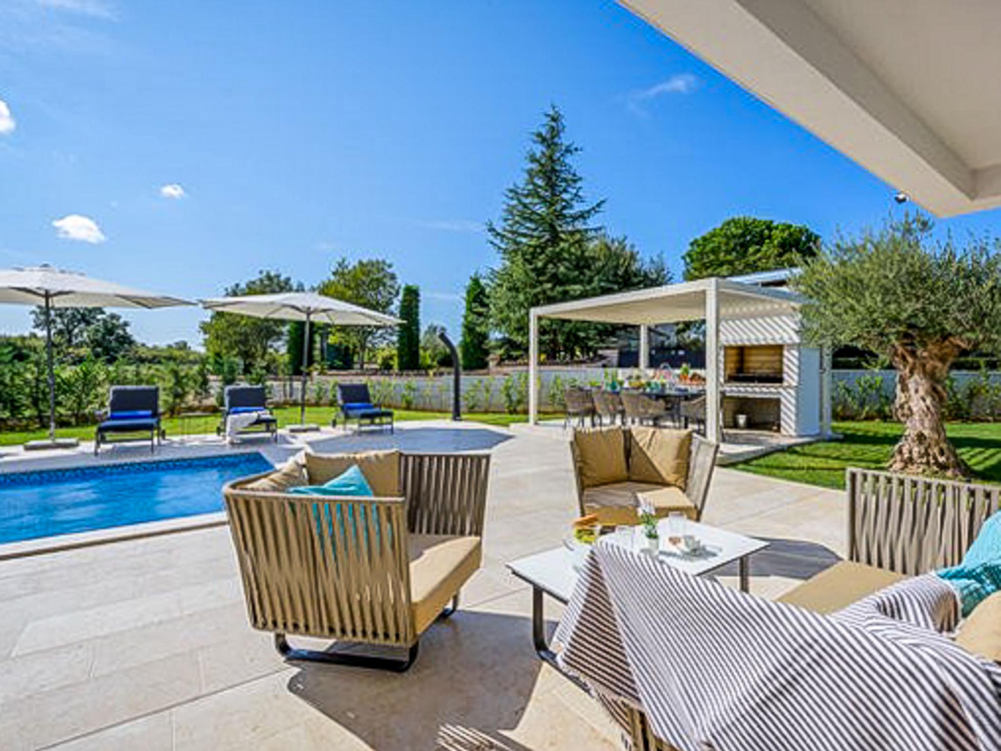 Jehnici 8 km from Porec: Luxurious villa "Frani", 2 storeys. In a quiet, sunny position, 11 km from the sea. Private: property 950 m2 (fenced) with lawn, swimming pool angular, heated (3 x 10 m, depth 150 cm, seasonal availability: 12.Apr. - 01.Nov.) with internal staircase. Outdoor shower, barbecue, children's playground (slide, swing). In the house: internet access, table tennis, washing machine, tumble dryer. Parking (for 3 cars) at the house on the premises. Shop 3 km, restaurant 3 km, bus stop 3.5 km, public bathing area 11 km. Walking paths from the house 100 m, cycle lane 150 m. Nearby attractions: Aquapark 11 km. The owner does not accept any youth groups. Swimming pool heated (extra).
