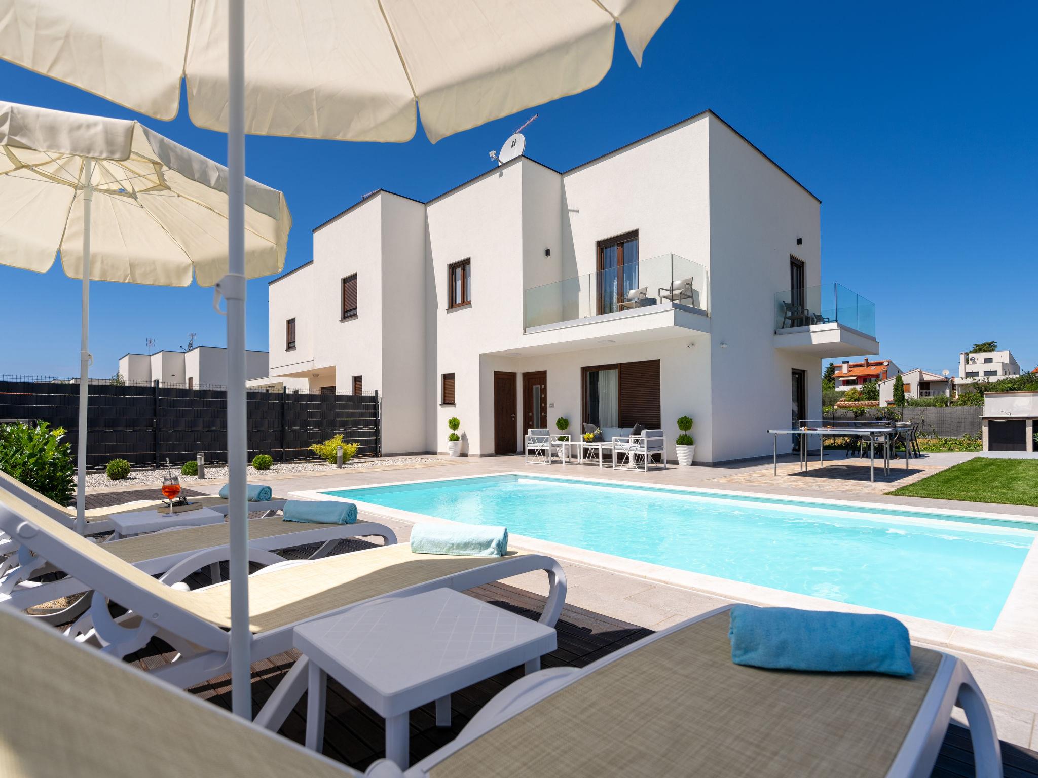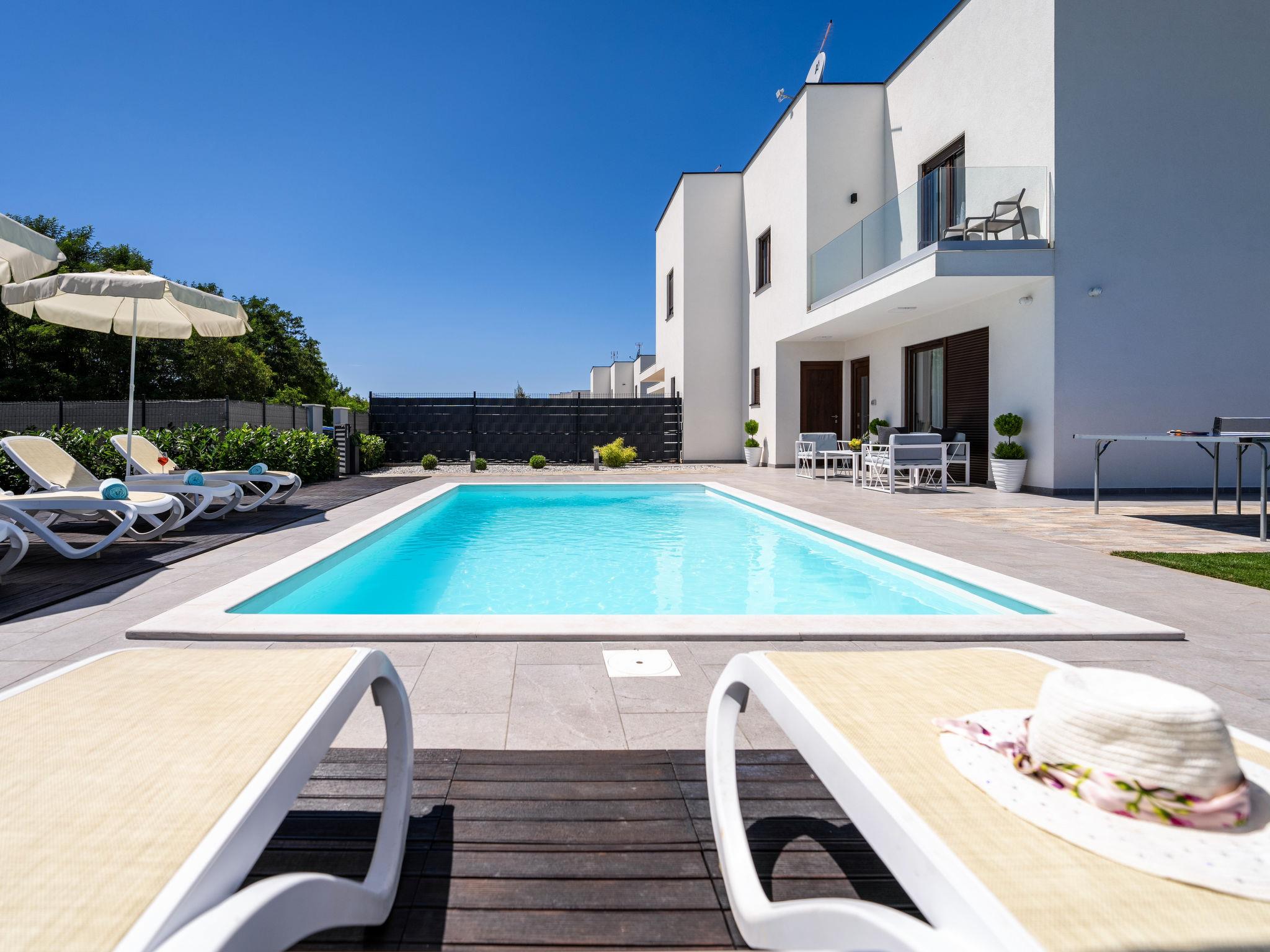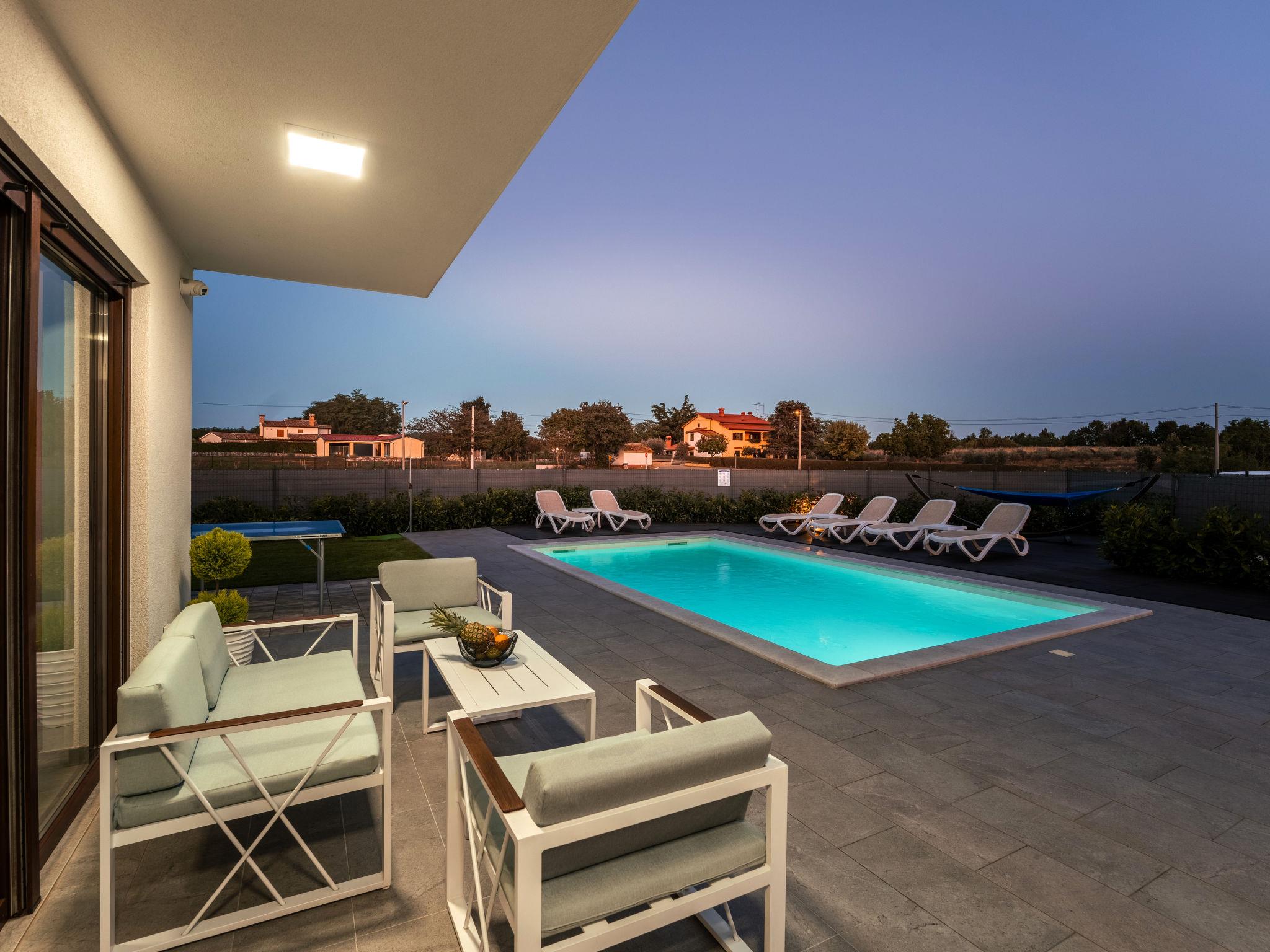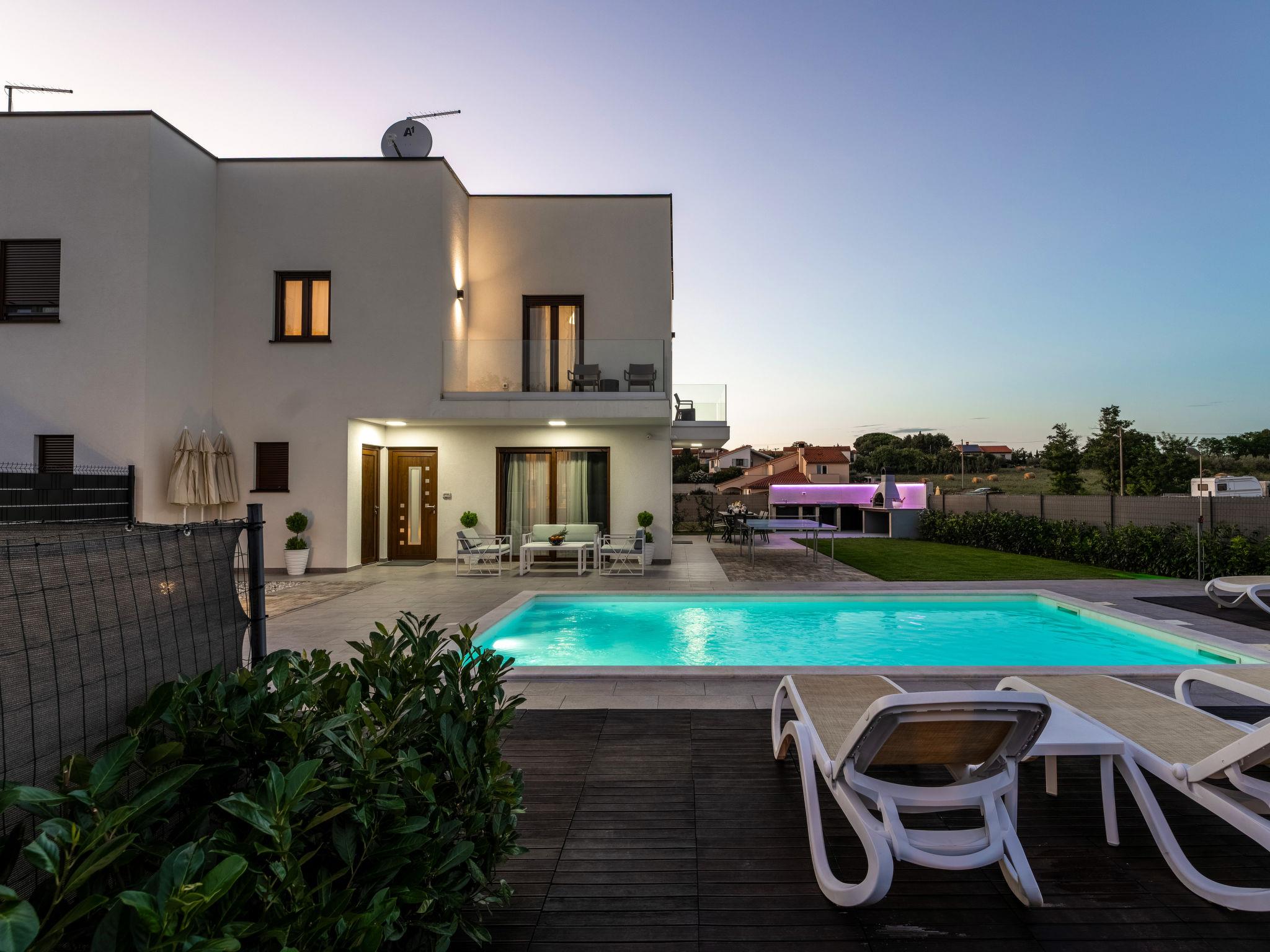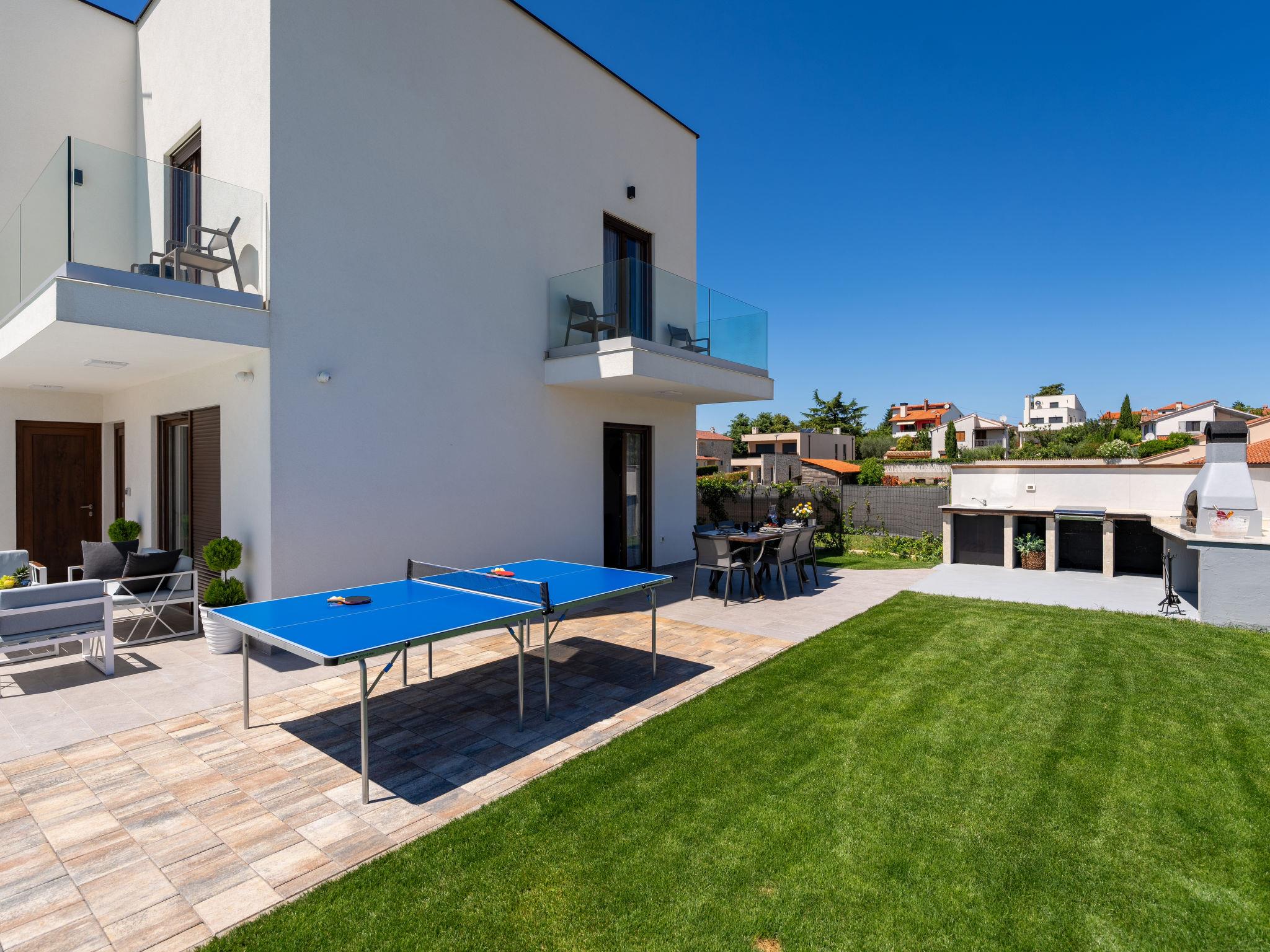 Beautiful terraced house "Aria Blue", 2 storeys. In the hamlet Krancici 500 m from the centre of Kaštelir, 15 km from the centre of Porec, in a sunny position, 10 km from the sea. Private: property 275 m2 (fenced), swimming pool angular (7 x 4 m, depth 145 cm, seasonal availability: 01.Mar. - 10.Dec.) with internal staircase. Outdoor shower, table tennis, terrace (10 m2), garden furniture, barbecue. In the house: internet access, washing machine. Parking (for 2 cars) at the house. Shop 500 m, restaurant 2 km, bus stop 6.1 km, pebble beach 10 km, rocky beach 10 km. Walking paths from the house 100 m, cycle lane 150 m. Please note: suitable for families. The owner does not accept any youth groups.