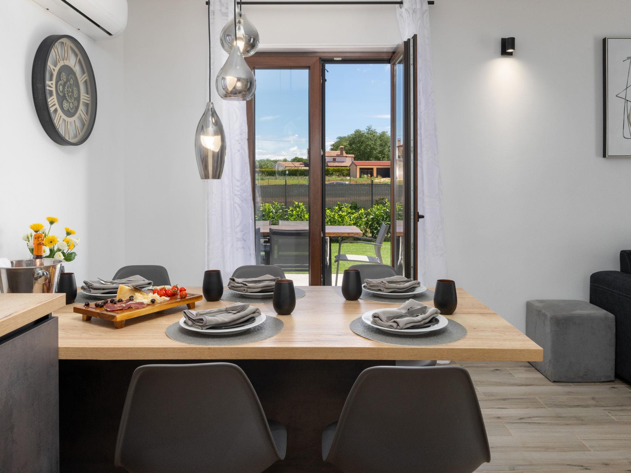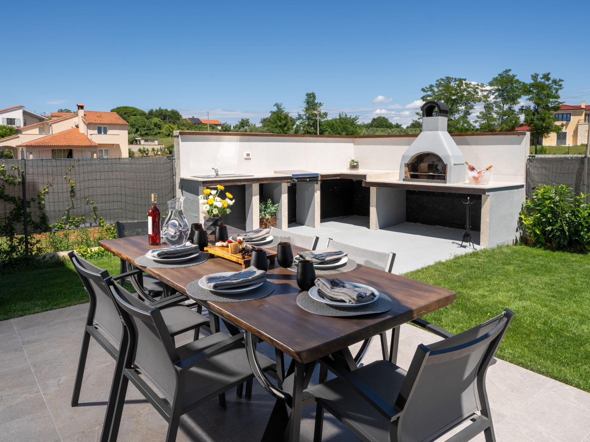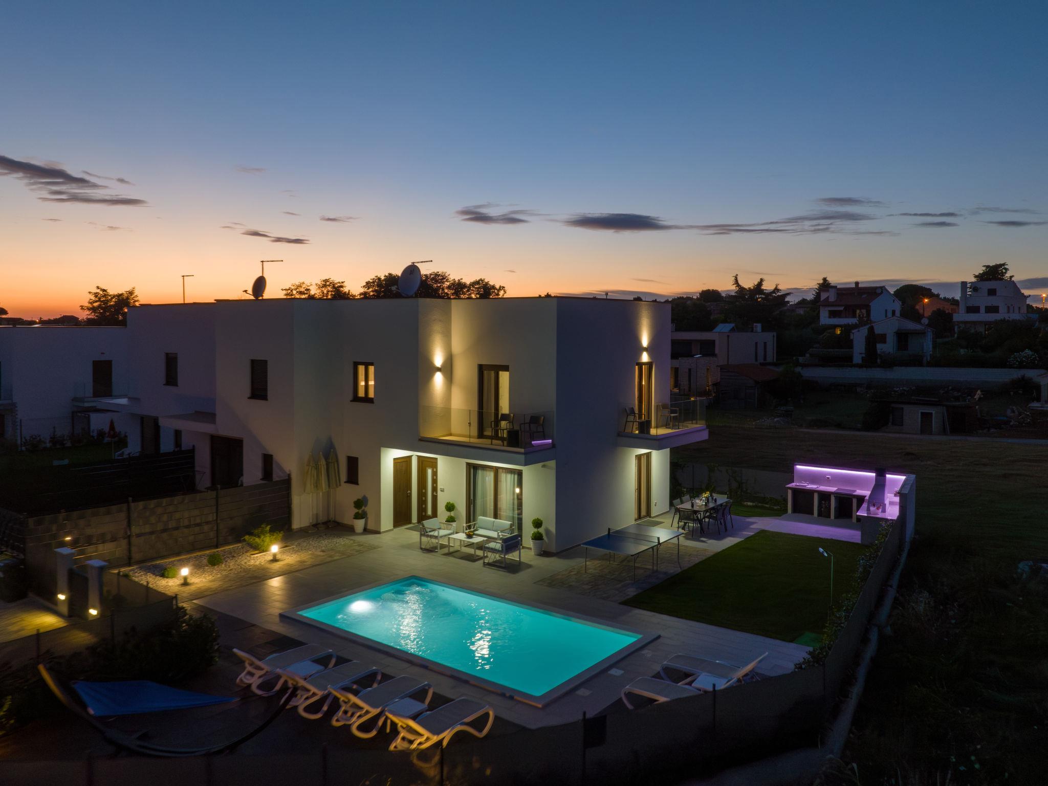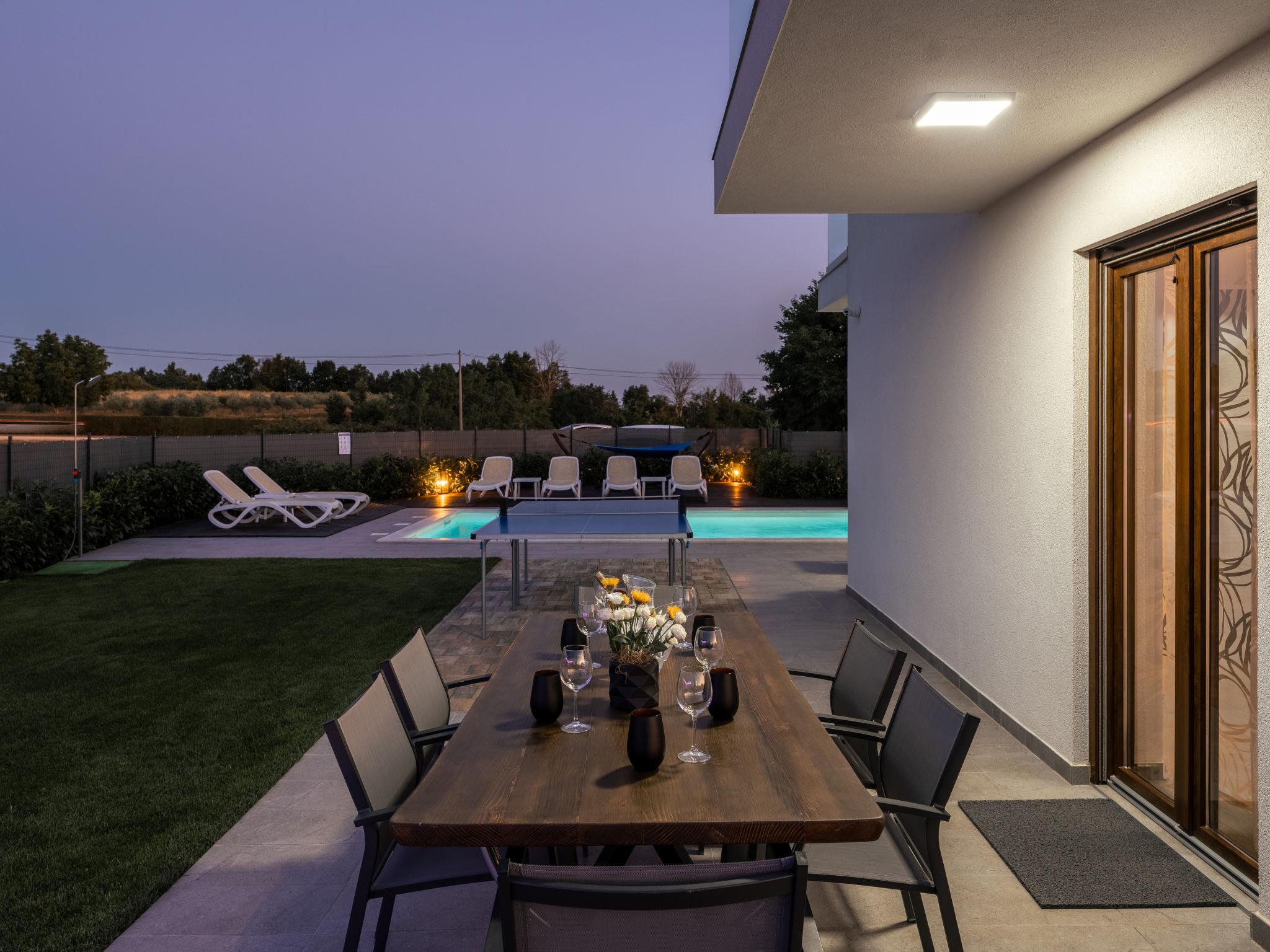 Beautiful terraced house "Aria Blue", 2 storeys. In the hamlet Krancici 500 m from the centre of Kaštelir, 15 km from the centre of Porec, in a sunny position, 10 km from the sea. Private: property 275 m2 (fenced), swimming pool angular (7 x 4 m, depth 145 cm, seasonal availability: 01.Mar. - 10.Dec.) with internal staircase. Outdoor shower, table tennis, terrace (10 m2), garden furniture, barbecue. In the house: internet access, washing machine. Parking (for 2 cars) at the house. Shop 500 m, restaurant 2 km, bus stop 6.1 km, pebble beach 10 km, rocky beach 10 km. Walking paths from the house 100 m, cycle lane 150 m. Please note: suitable for families. The owner does not accept any youth groups.