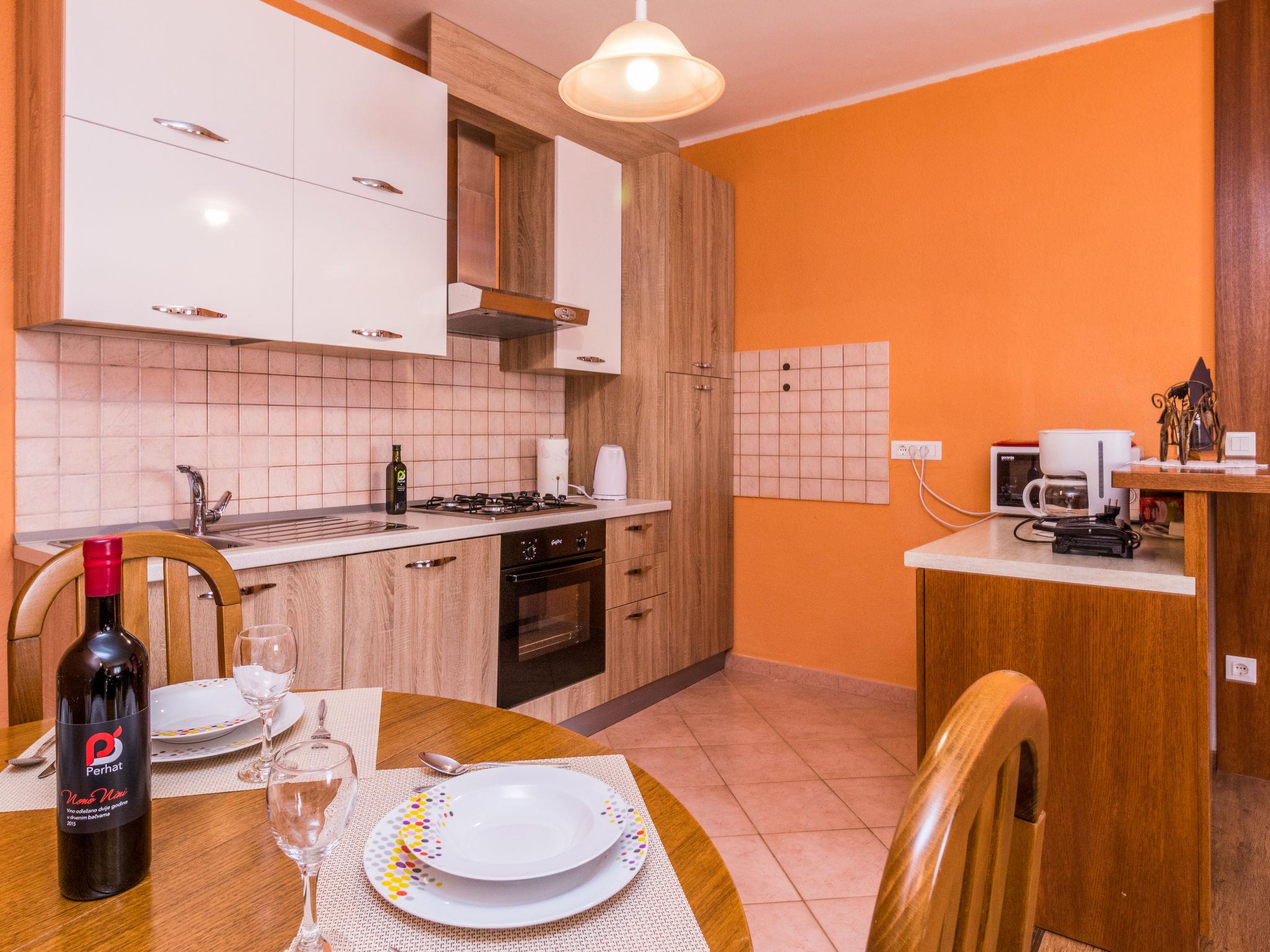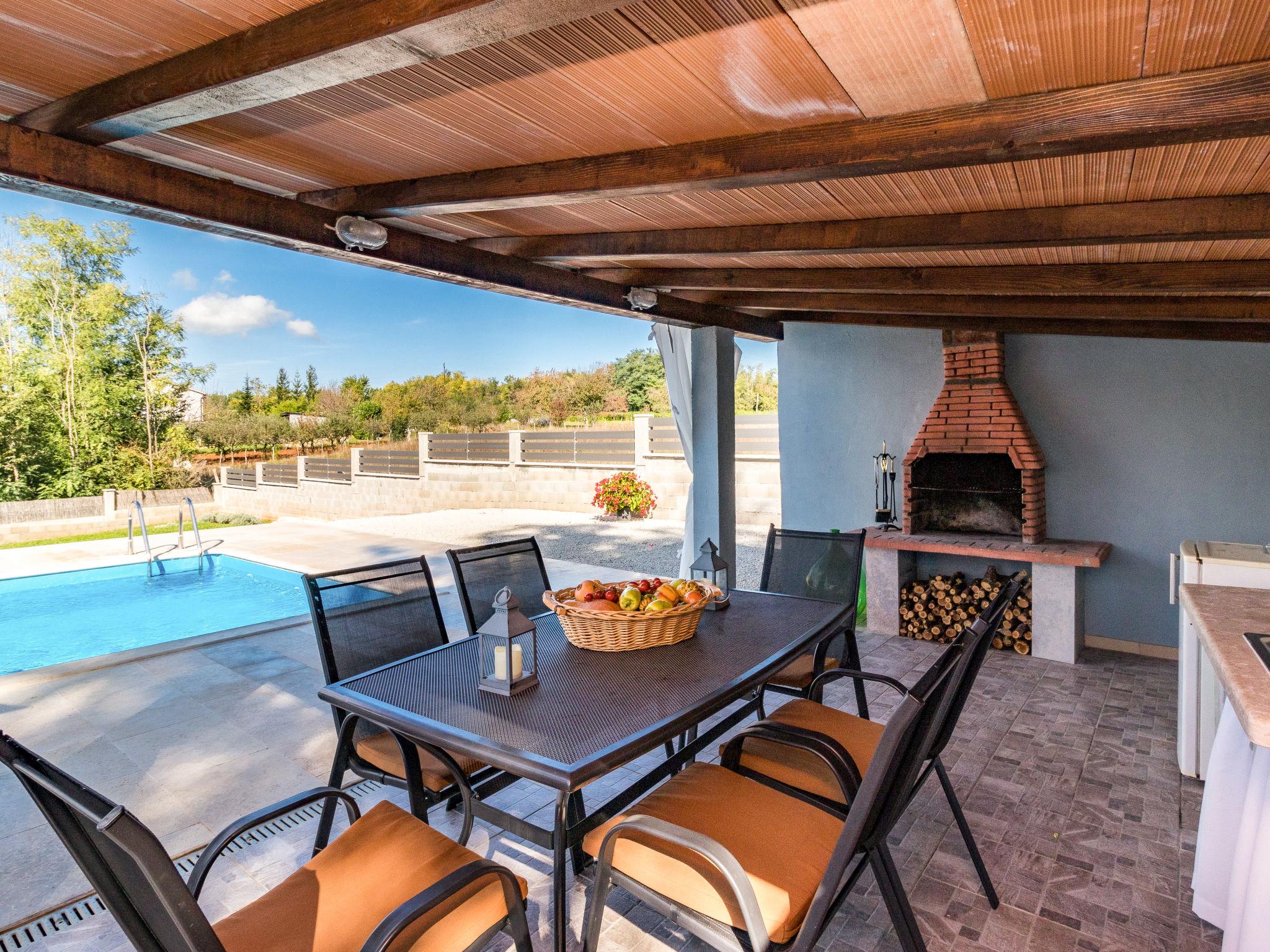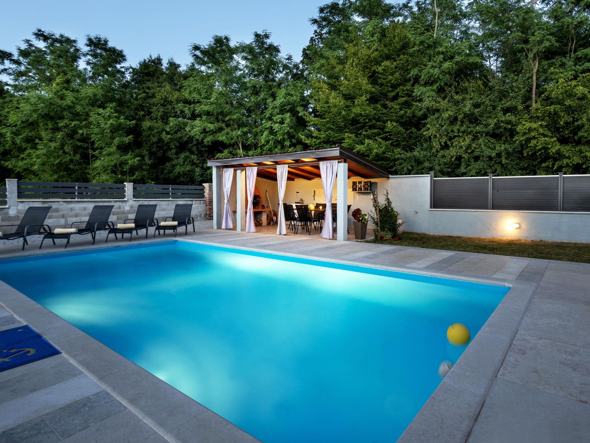 Single-family house "Villa Laura", 2 storeys. In the hamlet Prhati 5 km from the centre of Višnjan, 20 km from the centre of Porec, 20 km from the sea. Private: property 800 m2 (fenced) with lawn, swimming pool (8 x 4 m, depth 150 cm, seasonal availability: 27.Mar. - 05.Nov.). Outdoor shower, terrace, garden furniture, barbecue, pool maintenance by the owner/gardener. In the house: internet access, washing machine. Motor access to the house (200 m via unmade road). Parking (for 2 cars) on the premises, single garage. Shop 5 km, bus stop 21 km, railway station 21 km, pebble beach 20 km. Please note: 1st floor is closed and not occupied.