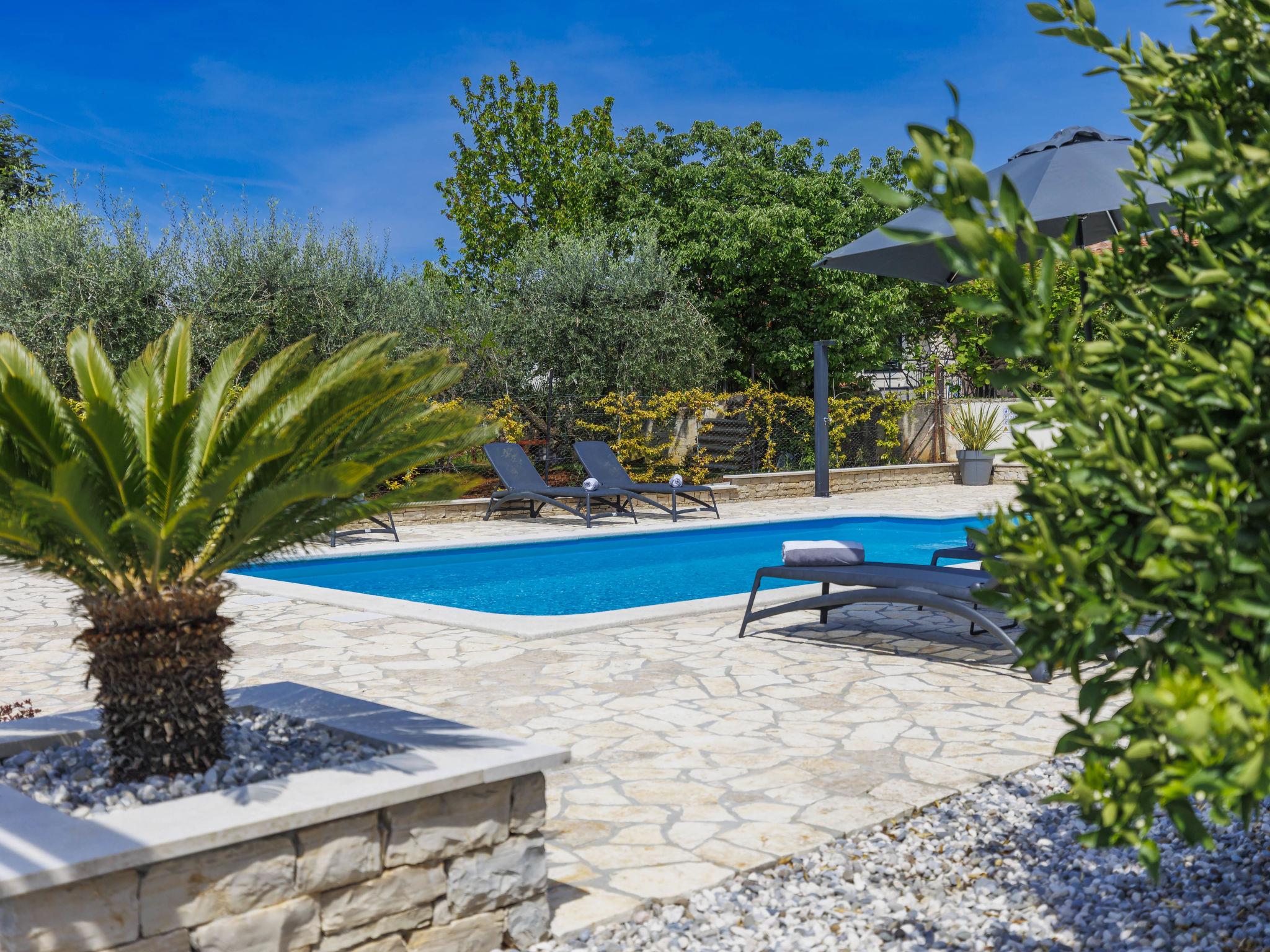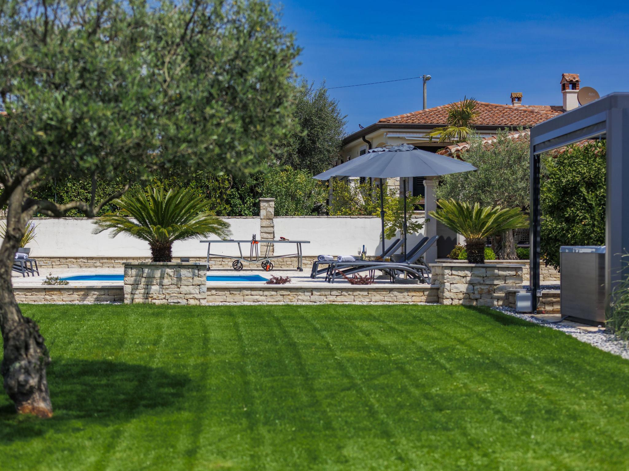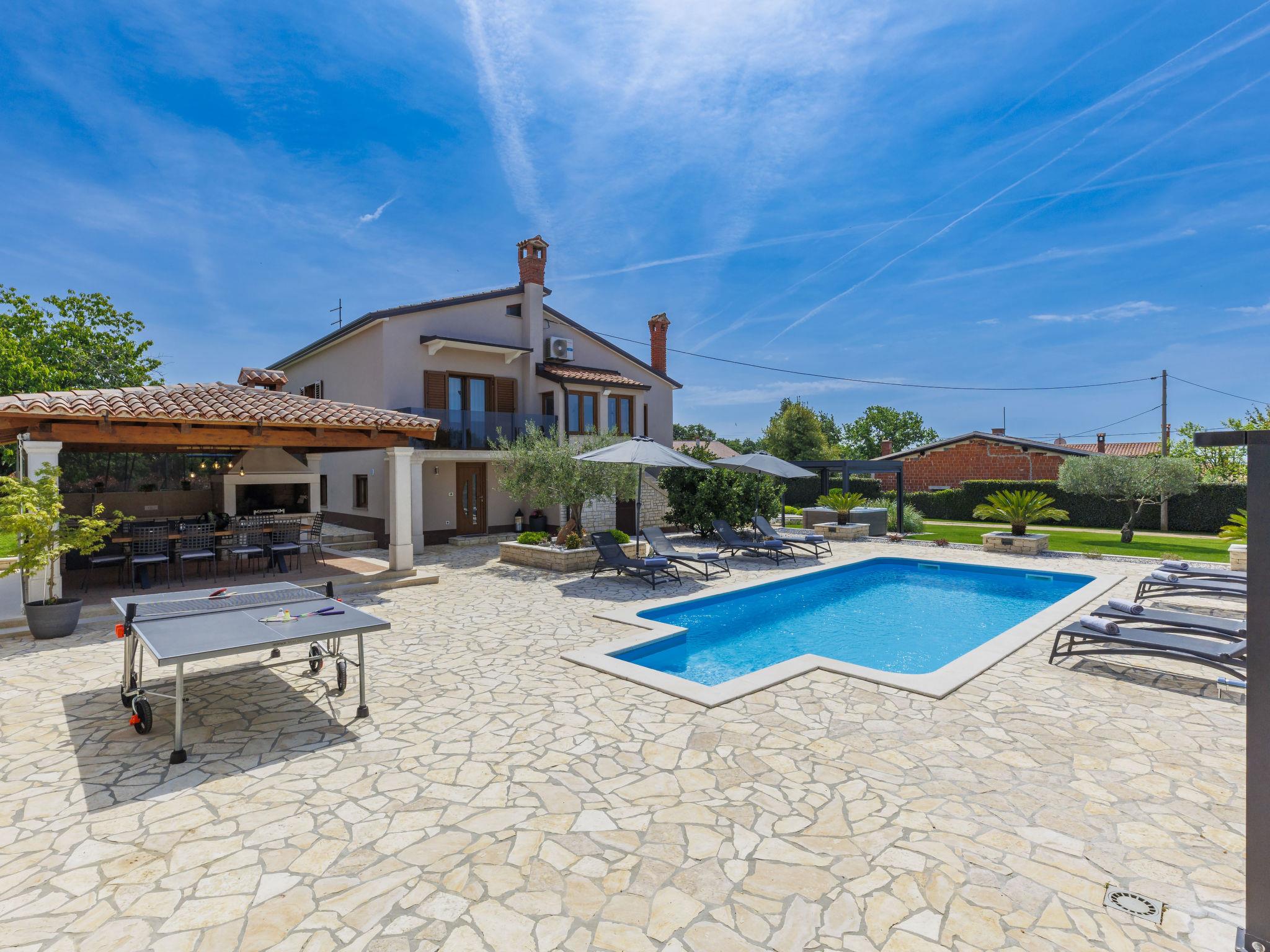 Single-family house "Sara", 2 storeys. In the hamlet Rogovici 3 km from the centre of Tar, 4 km from the centre of Kaštelir, 13 km from the centre of Porec, 4 km from the sea, 4 km from the beach. Private: property 1'200 m2 (fenced) with lawn and wildlife garden, swimming pool (8 x 4 m, depth 150 cm, seasonal availability: 01.May. - 15.Oct.) with internal staircase. Outdoor shower, hot tub, table tennis, terrace, garden furniture, barbecue (swing), pool maintenance by the owner/gardener. In the house: internet access, trampoline, washing machine, tumble dryer. Parking on the premises, single garage. Shop 3 km, supermarket 2 km, restaurant 3 km, bus stop 3.5 km, pebble beach 4 km, rocky beach 4 km. The owner does not accept any youth groups.