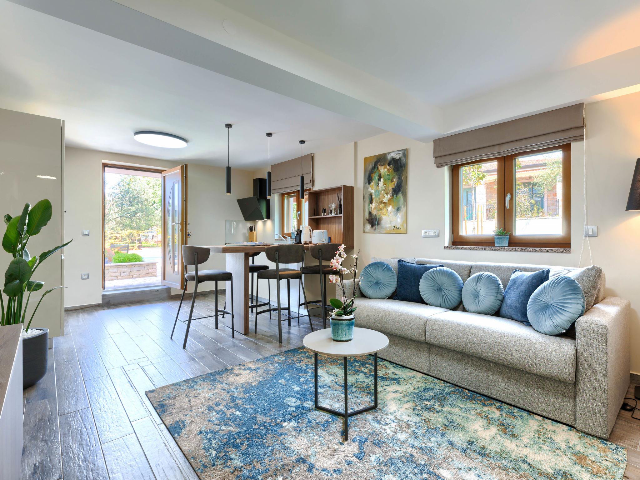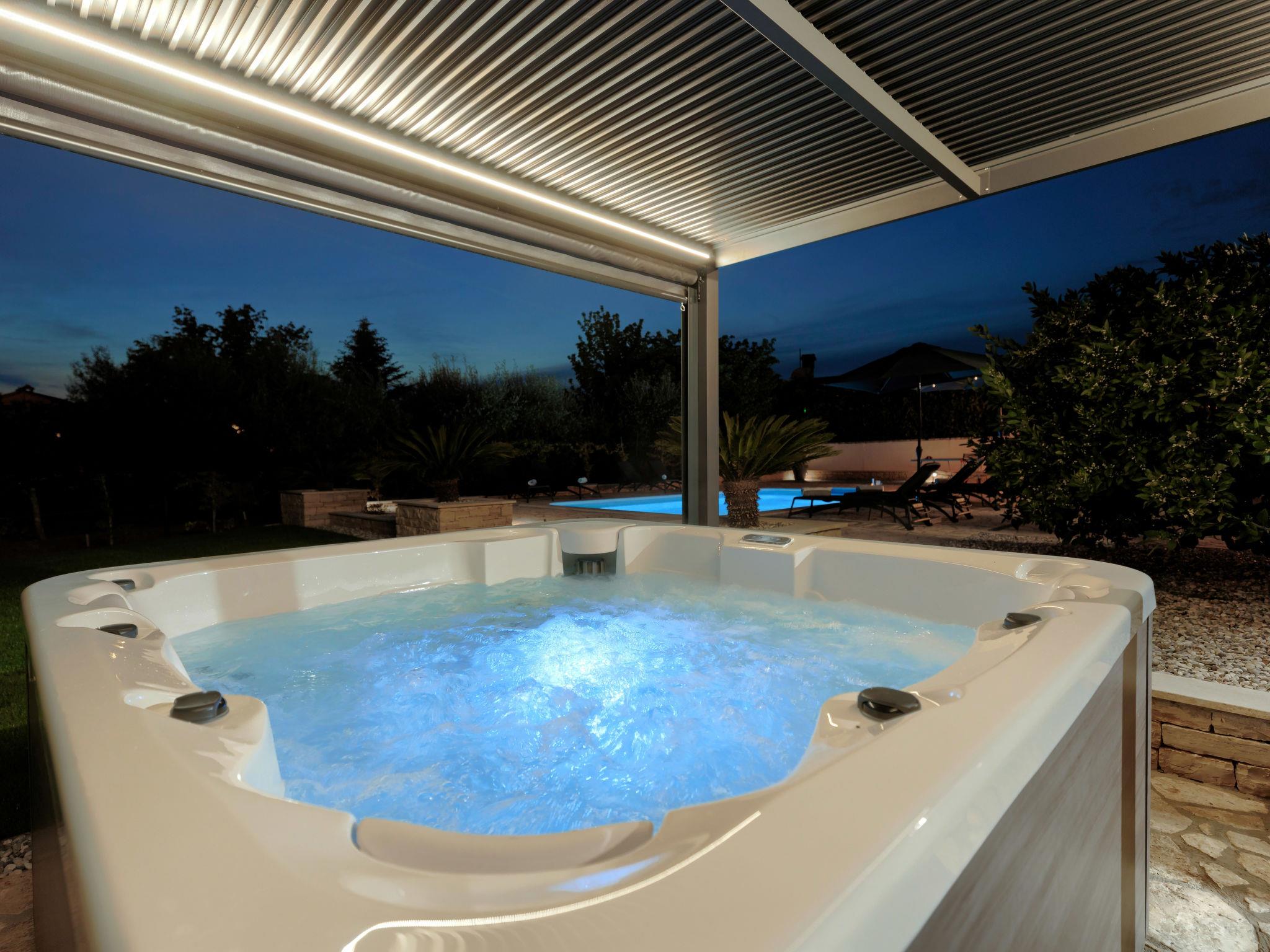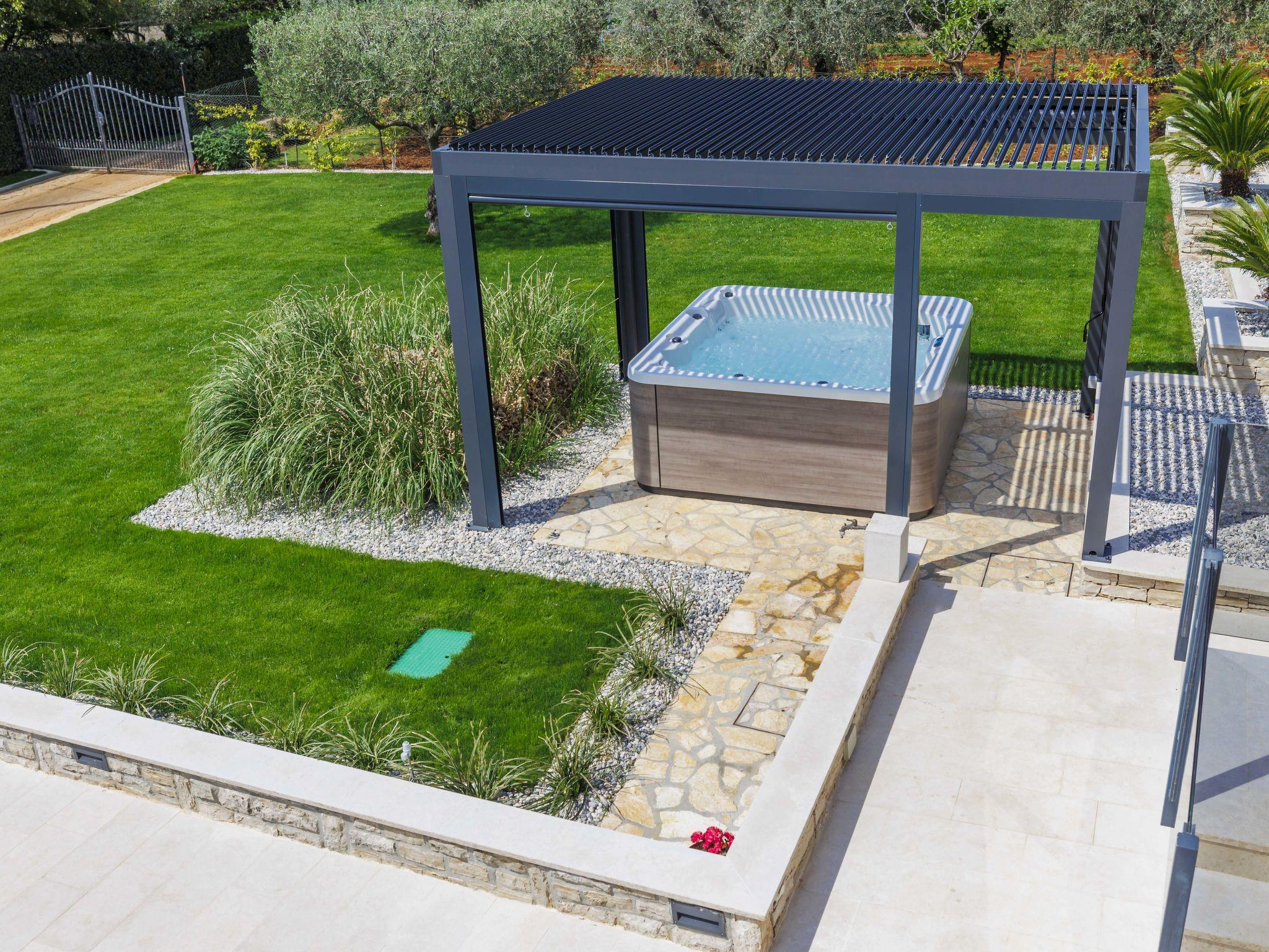 Single-family house "Sara", 2 storeys. In the hamlet Rogovici 3 km from the centre of Tar, 4 km from the centre of Kaštelir, 13 km from the centre of Porec, 4 km from the sea, 4 km from the beach. Private: property 1'200 m2 (fenced) with lawn and wildlife garden, swimming pool (8 x 4 m, depth 150 cm, seasonal availability: 01.May. - 15.Oct.) with internal staircase. Outdoor shower, hot tub, table tennis, terrace, garden furniture, barbecue (swing), pool maintenance by the owner/gardener. In the house: internet access, trampoline, washing machine, tumble dryer. Parking on the premises, single garage. Shop 3 km, supermarket 2 km, restaurant 3 km, bus stop 3.5 km, pebble beach 4 km, rocky beach 4 km. The owner does not accept any youth groups.