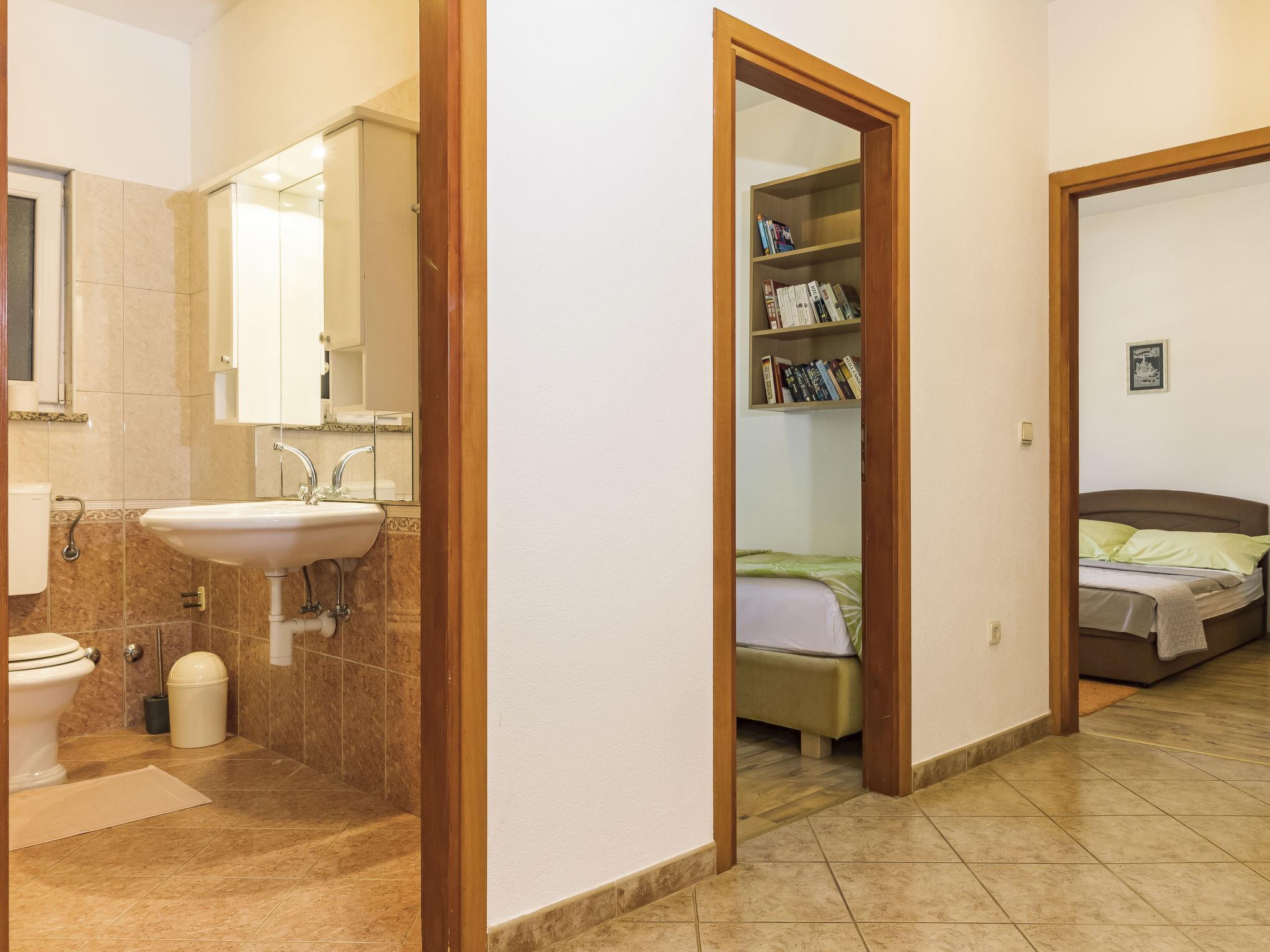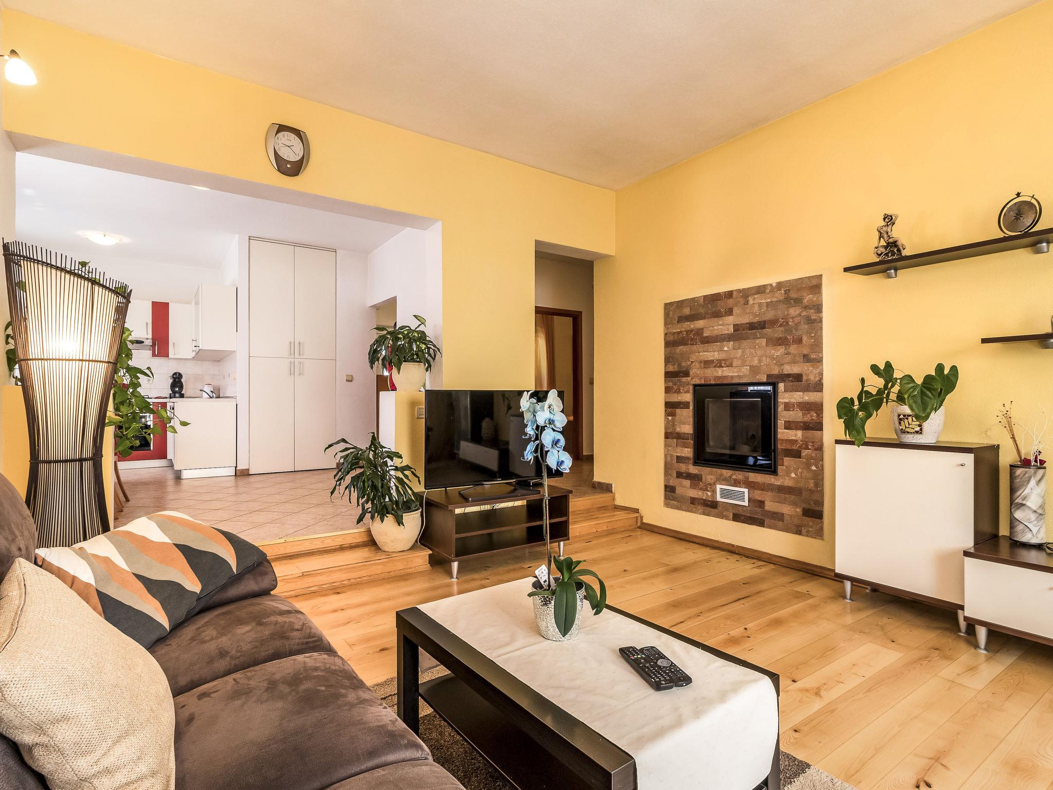 7-room house 200 m2 on 2 levels. Living/dining room with satellite TV and air conditioning. Exit to the veranda. 1 room with 1 french bed (140 cm, length 200 cm). 1 room with 1 bed (90 cm, length 200 cm). 1 room with 1 french bed (180 cm, length 200 cm). Open kitchen (4 hot plates, oven, dishwasher, microwave, freezer). Shower/WC, sep. WC. Upper floor: (exterior staircase) living/dining room with sloping ceilings with satellite TV and air conditioning. Exit to the balcony. 1 room with sloping ceilings with 1 french bed (160 cm, length 200 cm). 1 room with sloping ceilings with 2 beds (90 cm, length 200 cm). With sloping ceilings, open kitchen (4 hot plates, microwave, electric coffee machine). Exit to the balcony, to the terrace. Bath/WC with corner bath. No heating option. Balcony, terrace roofed. Terrace furniture, deck chairs. View of the swimming pool and the garden. Facilities: mosquito net, baby cot. Internet (WiFi, free). Please note: non-smoking house. Maximum 1 pet/ dog allowed. On the ground floor: konoba with dining table and open-hearth fireplace.