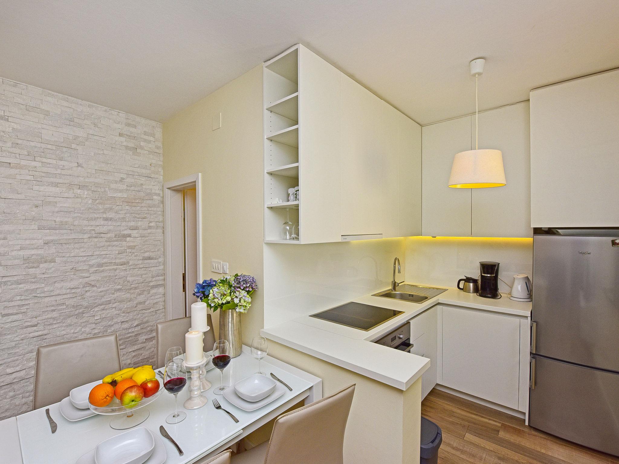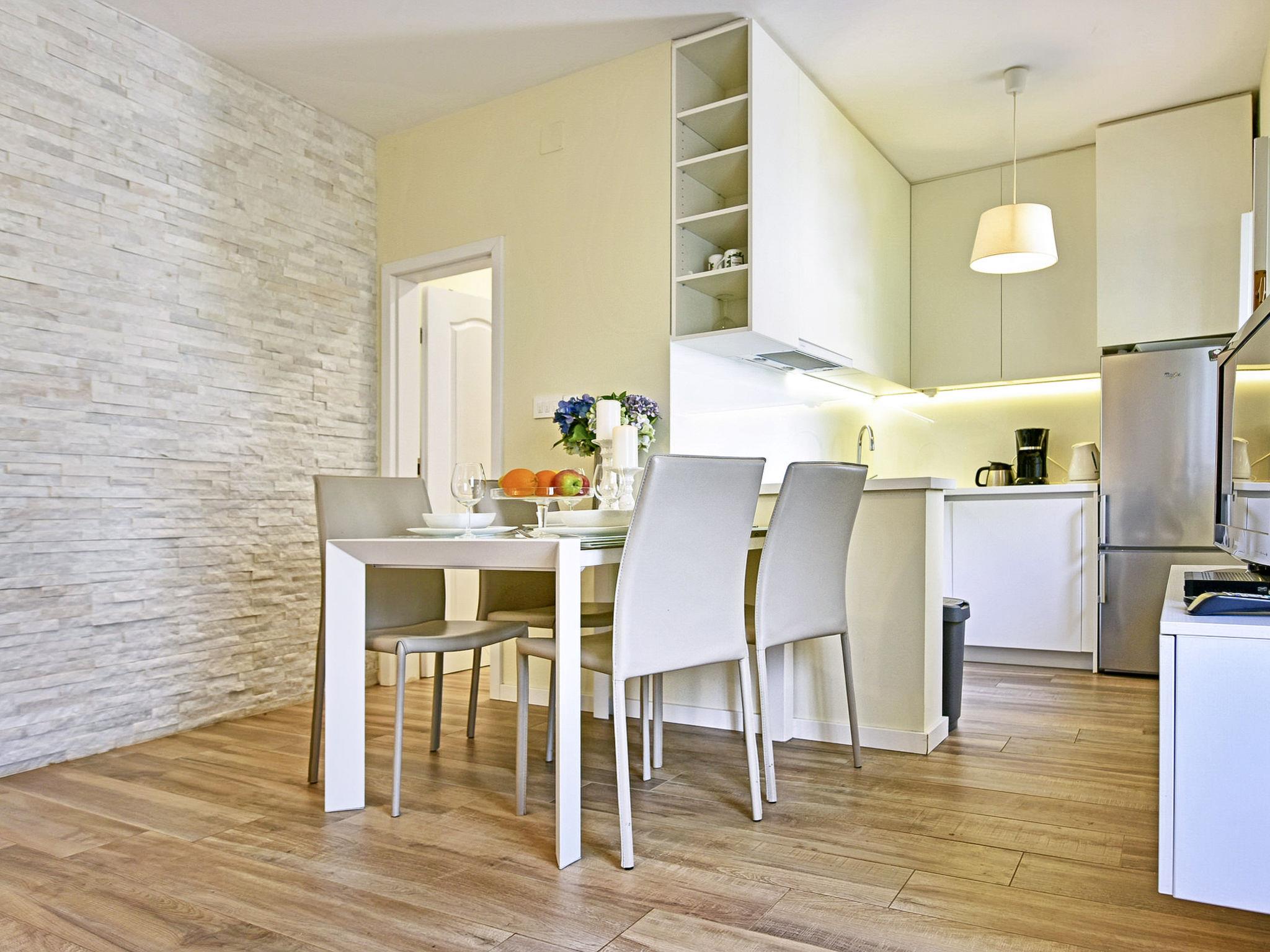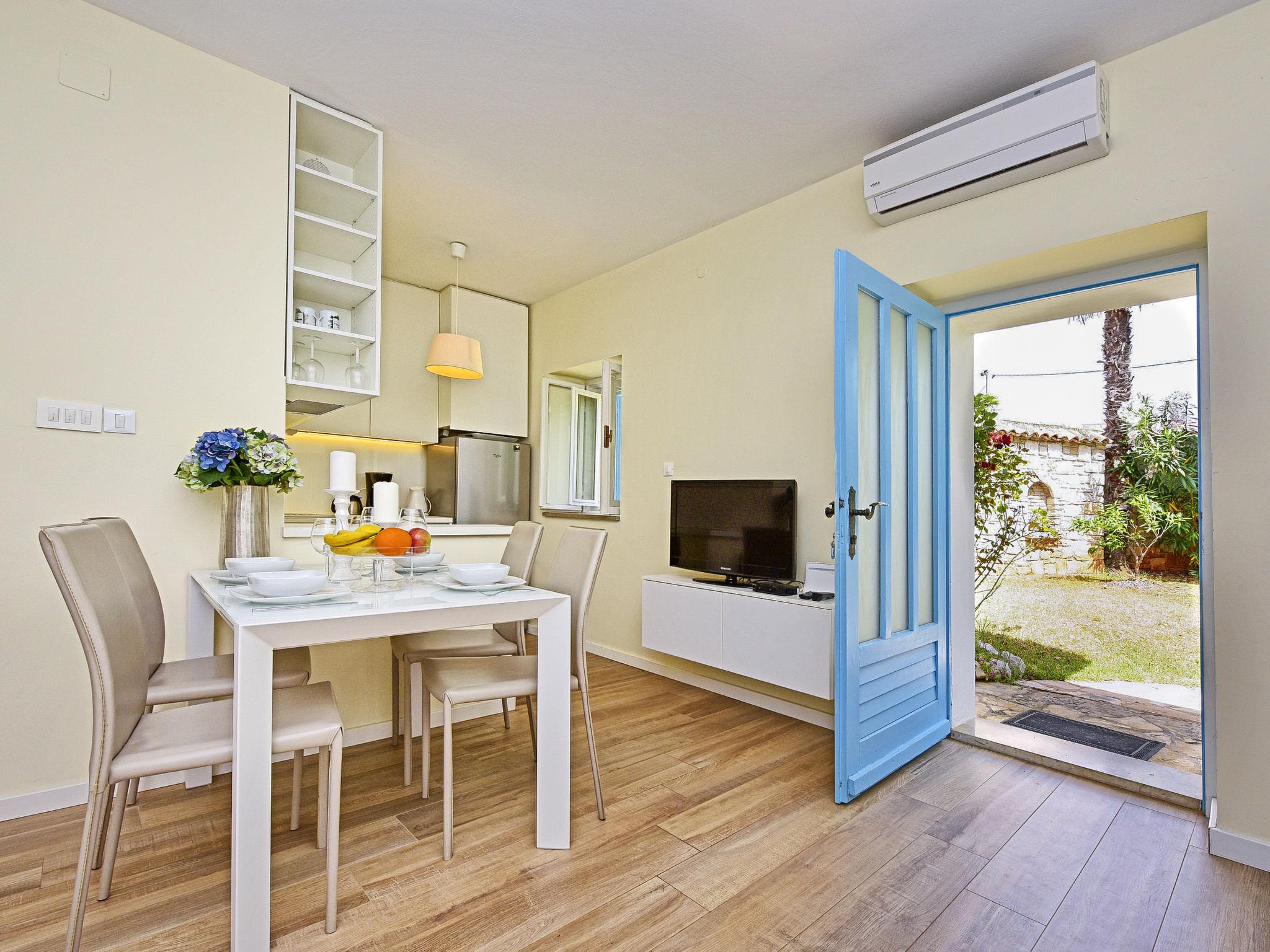 "Glicinia", 2-room semi-detached house 35 m2, on the ground floor. Living/dining room with 1 double sofabed and satellite TV (flat screen), air conditioning. 1 room with 1 double bed. Open kitchen (oven, dishwasher, 4 ceramic glass hob hotplates, kettle, microwave, freezer, electric coffee machine). Shower/WC. Heating (extra), air-conditioning (extra). Facilities: washing machine. Internet (WiFi, free). Please note: non-smoking house.