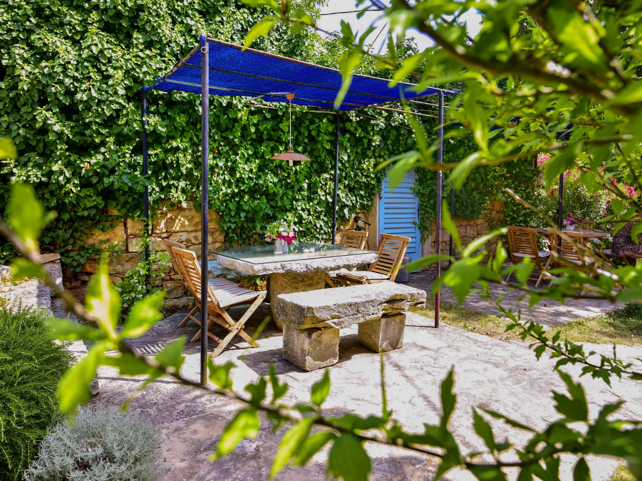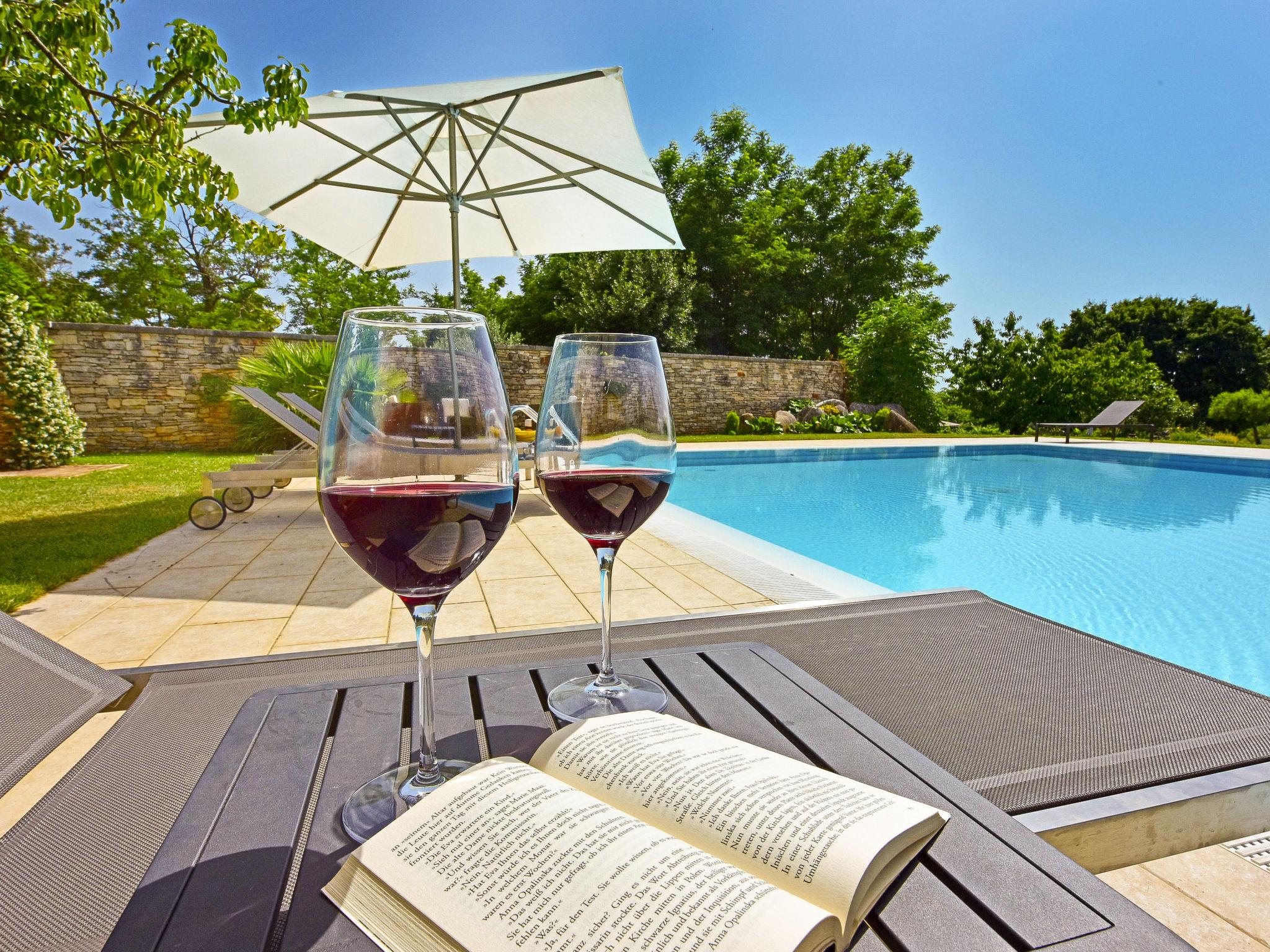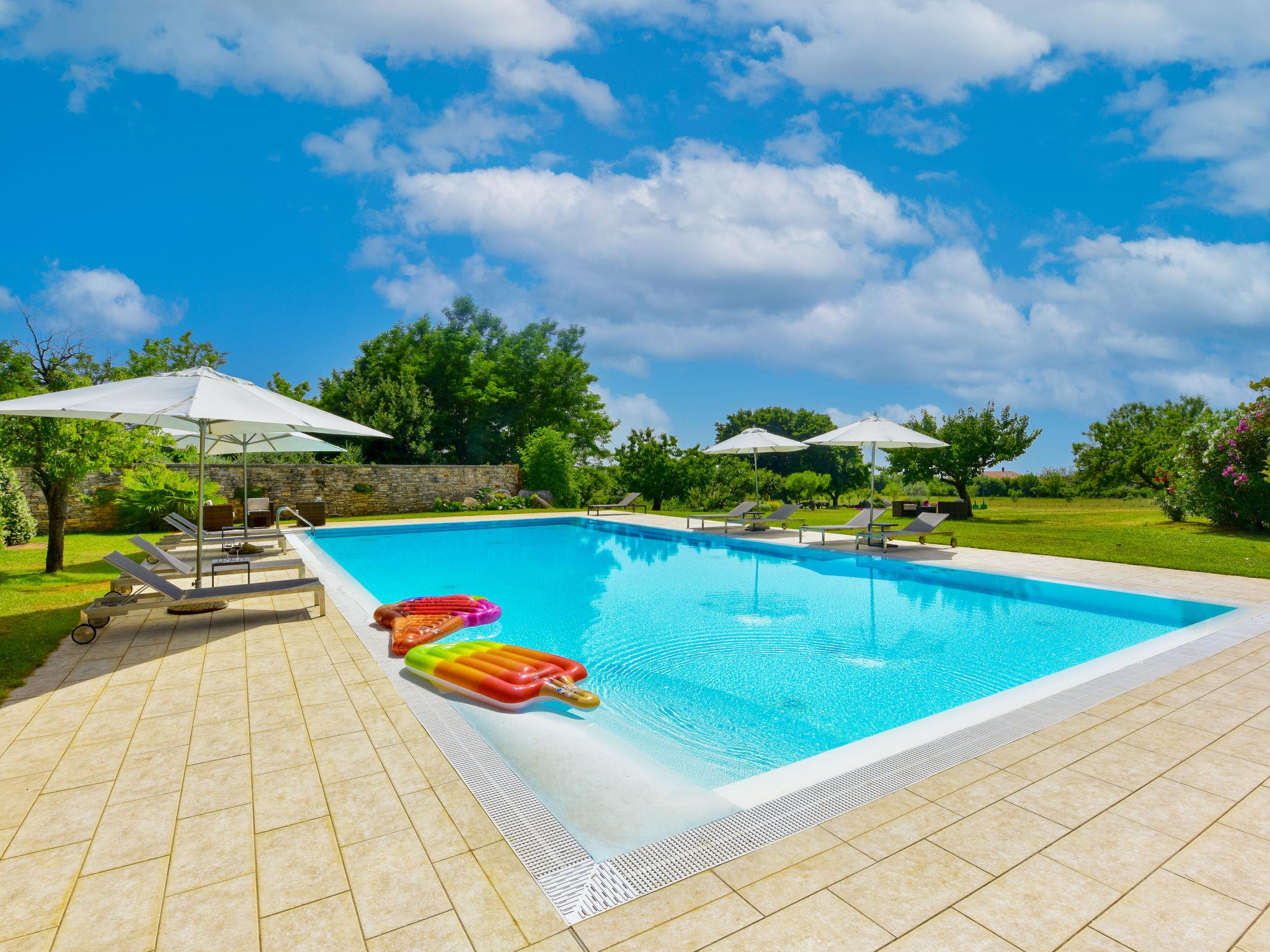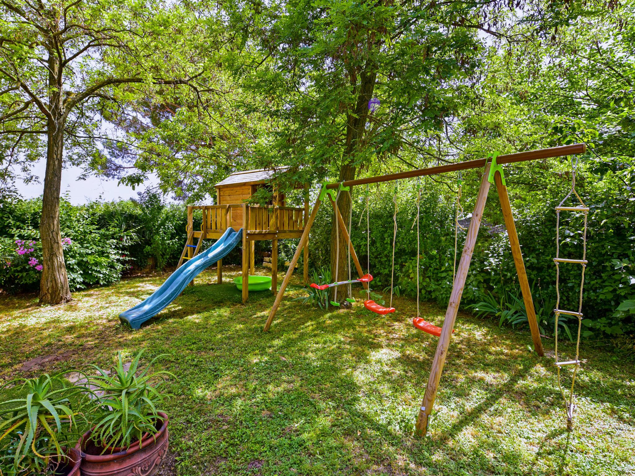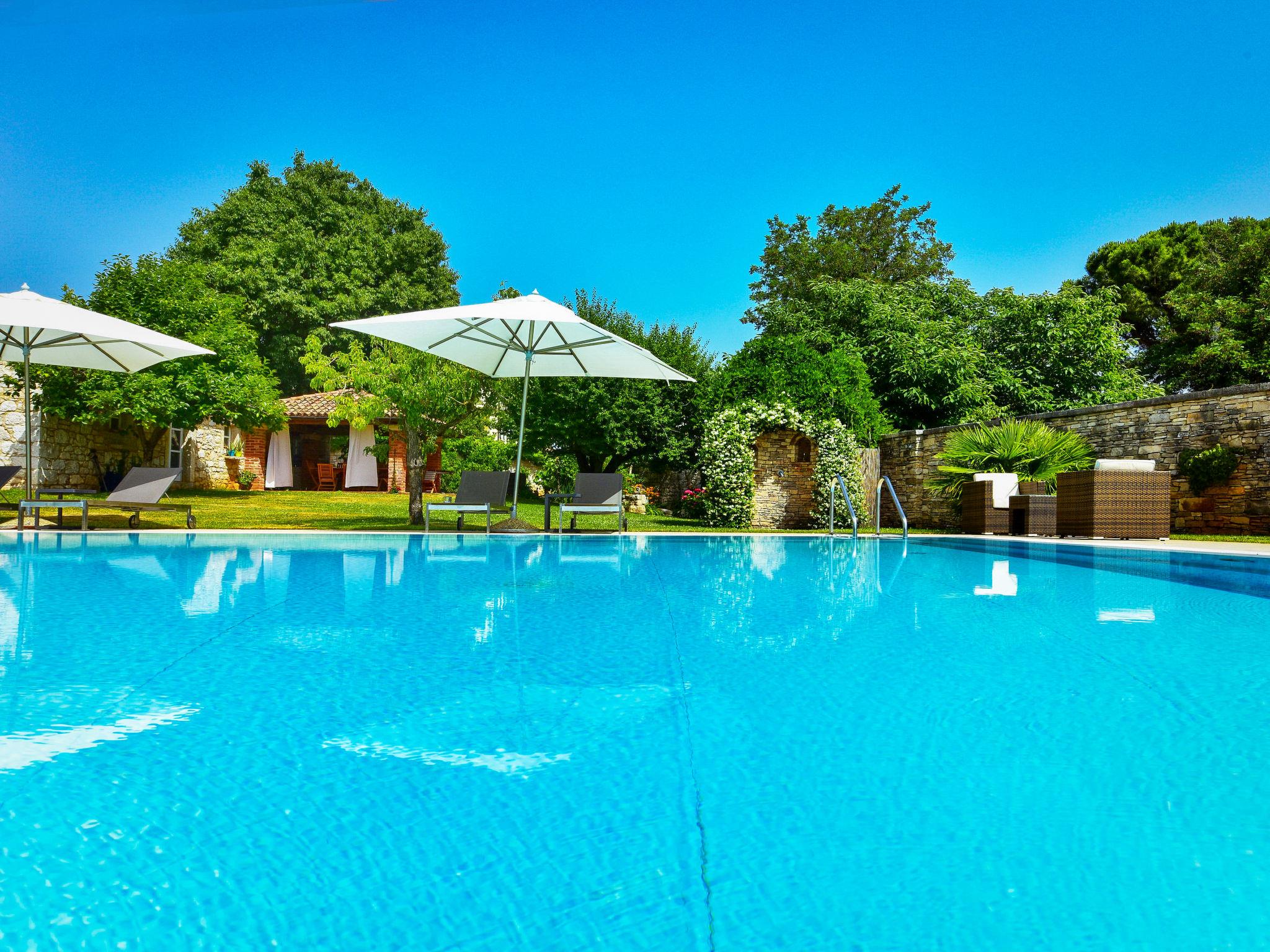 Semi-detached house "Glicinia". In the hamlet Labinci 13 km from the centre of Porec, 800 m from the centre of Kaštelir, 12 km from the centre of Novigrad, 7 km from the sea, in the countryside. For shared use: property 18'000 m2 with lawn and trees, swimming pool angular (16 x 8 m, depth 120 - 180 cm, seasonal availability: 01.May. - 01.Oct.) with internal staircase. Outdoor shower, table tennis, terrace, garden furniture, children's playground (slide, swing, sandbox), pool maintenance by the owner/gardener. In the house: internet access, trampoline. Parking on the premises. Shop 50 m, supermarket 800 m, restaurant 50 m, bus stop 6 km, rocky beach 7 km. Marina 12 km, children's playground 30 m.