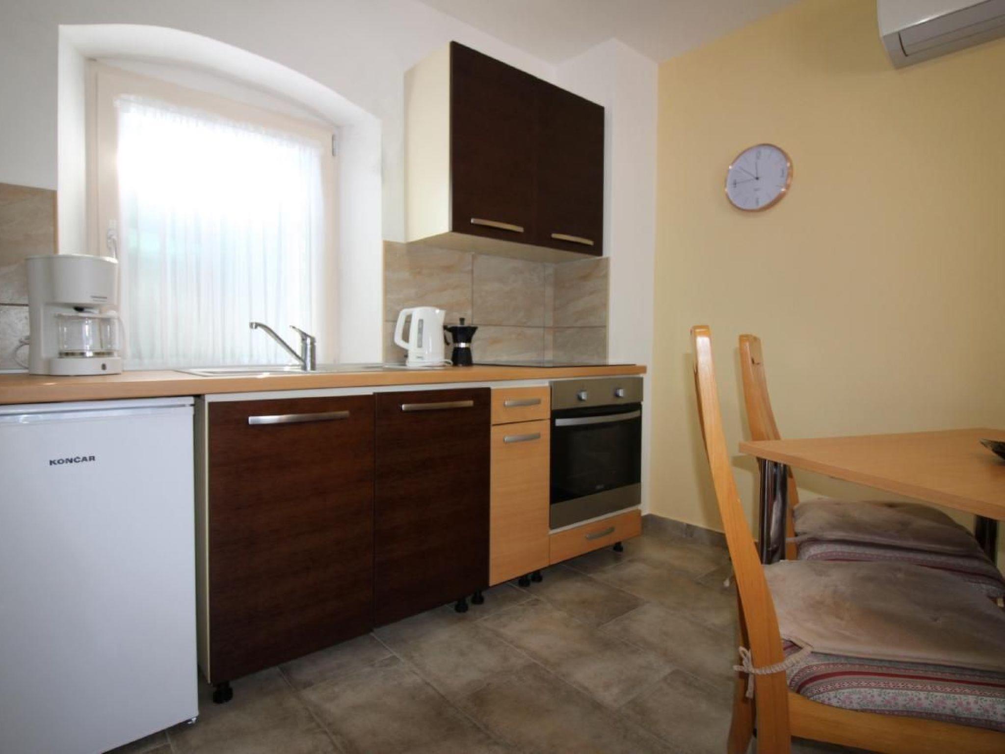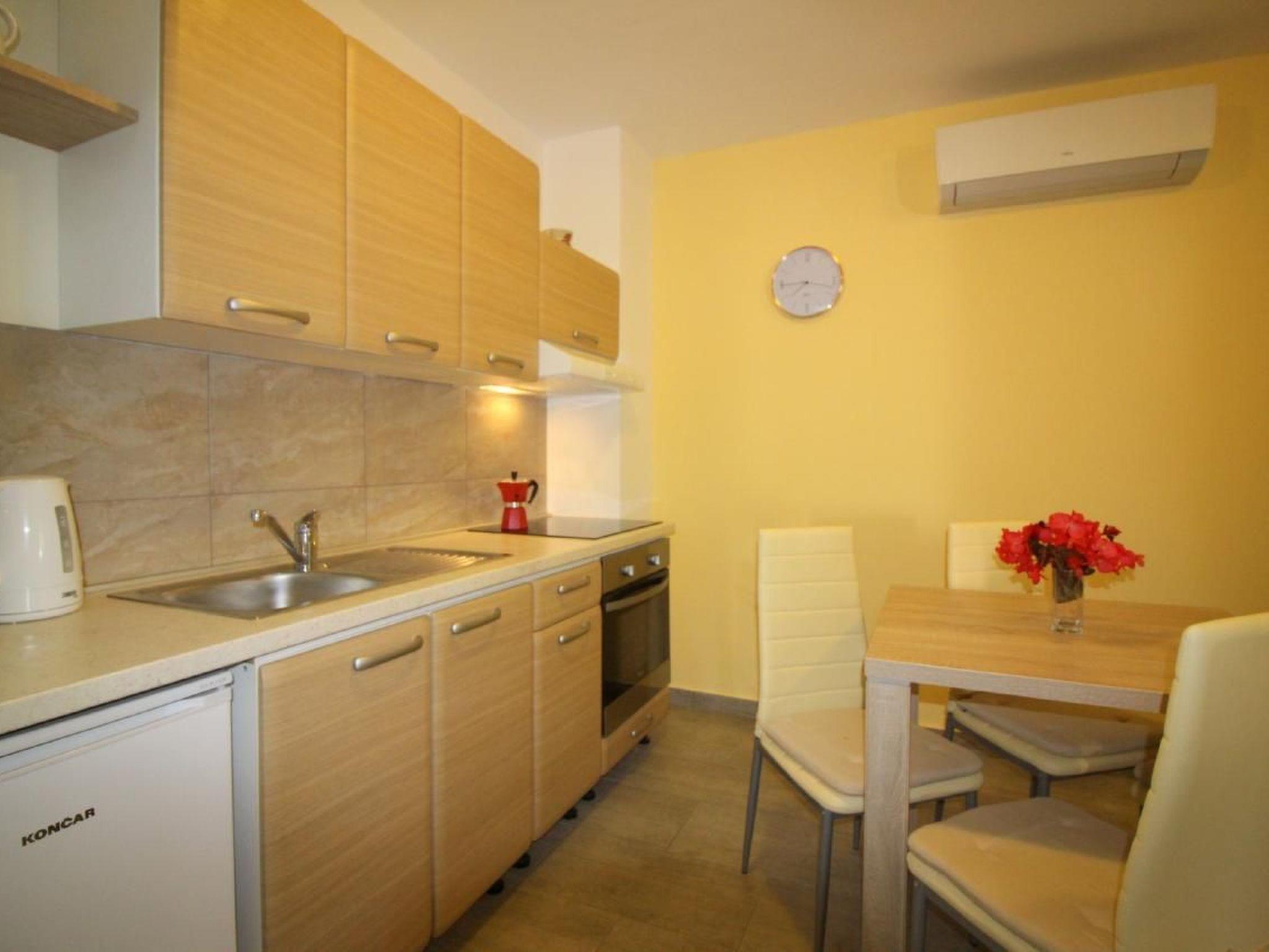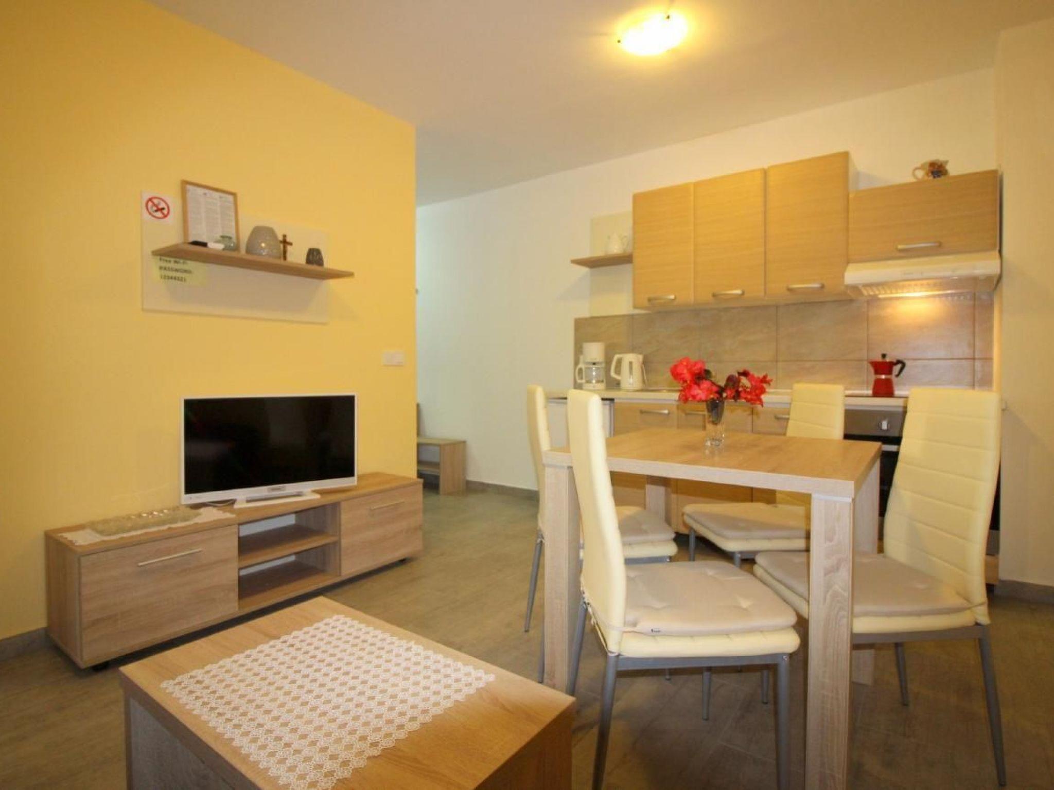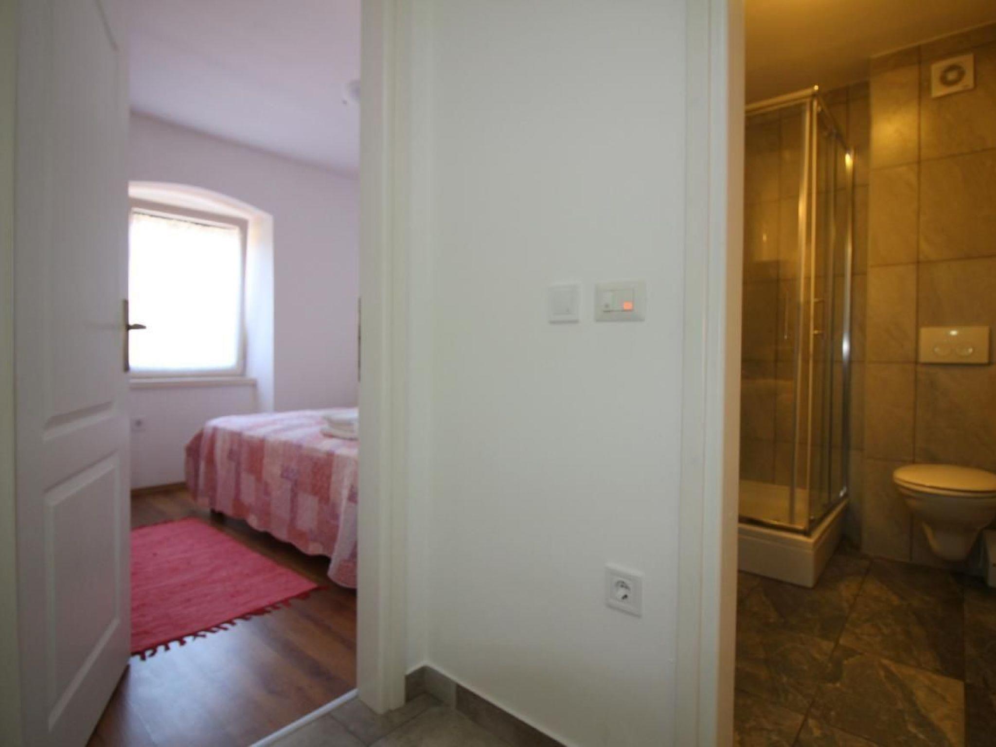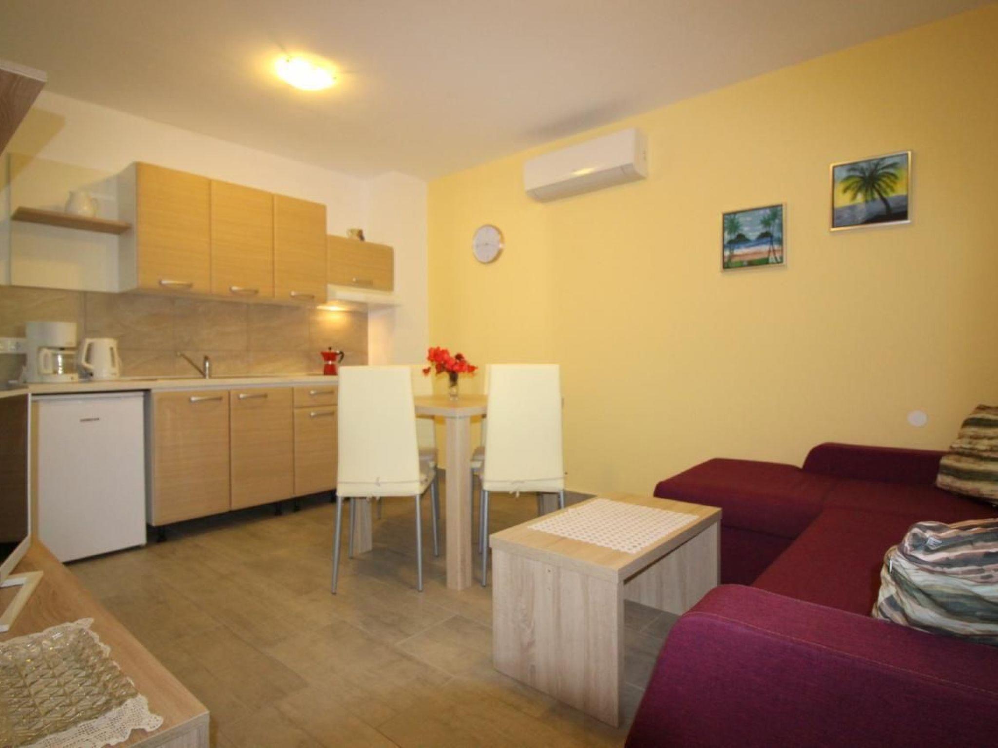 The semi-detached house has a total of 140m2 of living space spread over three floors and offers space for up to 12 people in three holiday flats, all accessible from the hallway with internal stairs. Each holiday flat is furnished for 2-4 people and has a 40m2 living area with kitchen, dining table and pull-out couch, double bedroom and bathroom with shower/WC. All flats are air-conditioned and Wi-Fi is available.