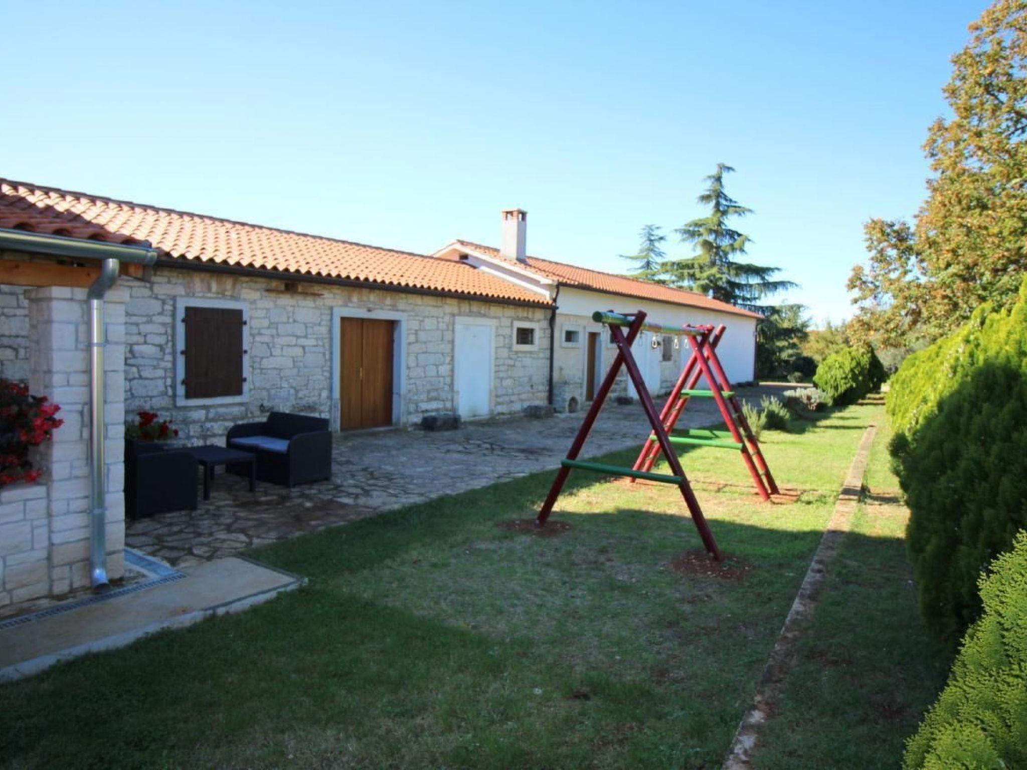 Holiday home Castello is a renovated country house located in Kaštelir, 10 km from Porec and 10 minutes drive from resort Lanterna with beautiful beaches. The house was completely renovated in 2016 and has its own, partially fenced plot of approx. 1000 m2 with a well-kept lawn and olive trees. The semi-detached house for sole use offers guests the following outdoor facilities: large covered terrace with benches for outdoor dining, barbecue, well-tended garden with children's swing, slide and trampoline, as well as several parking spaces in the courtyard.