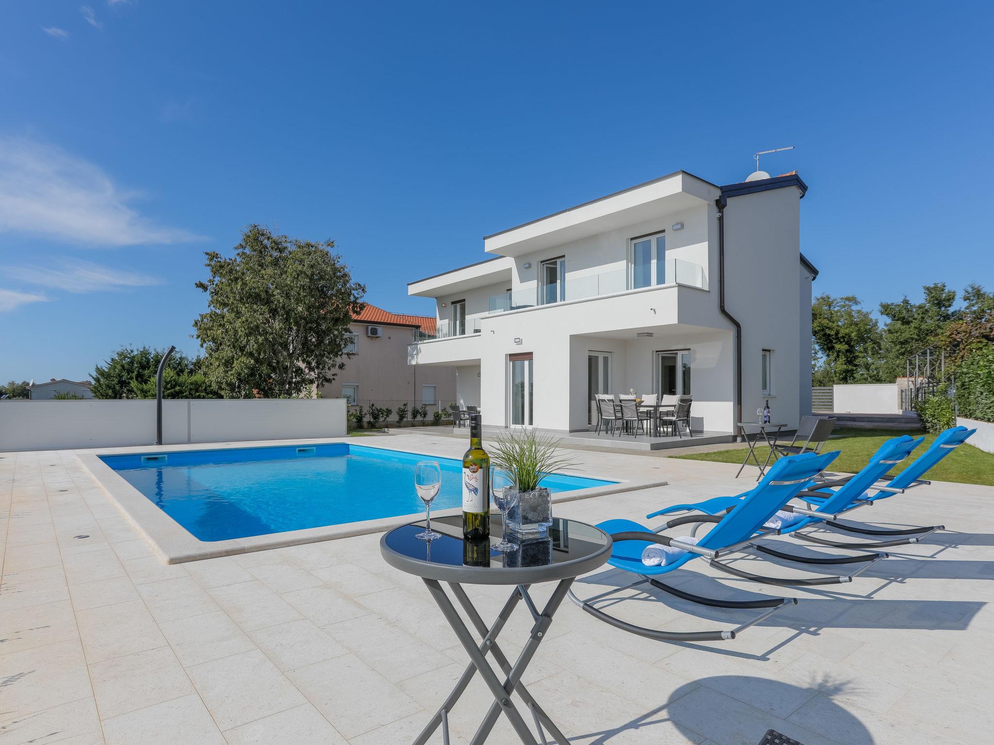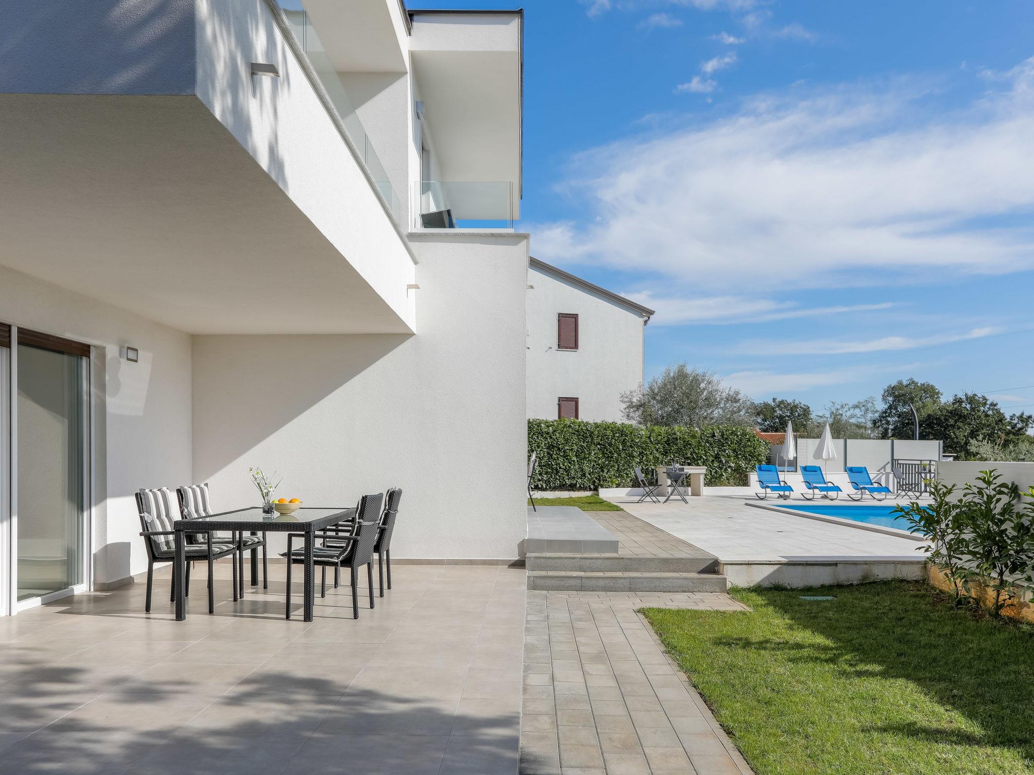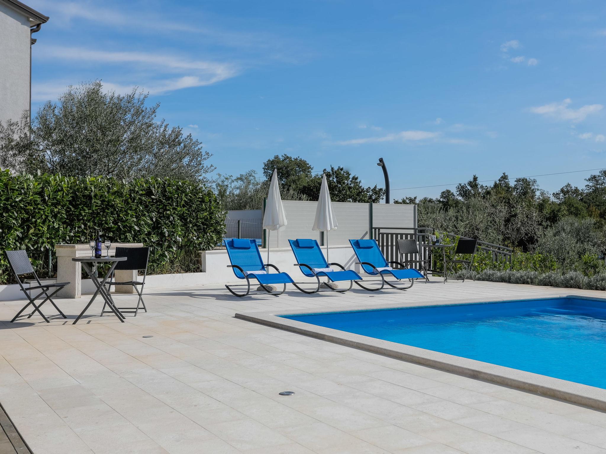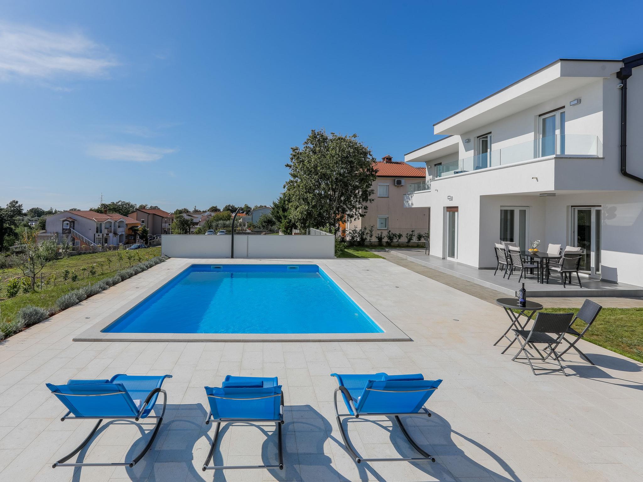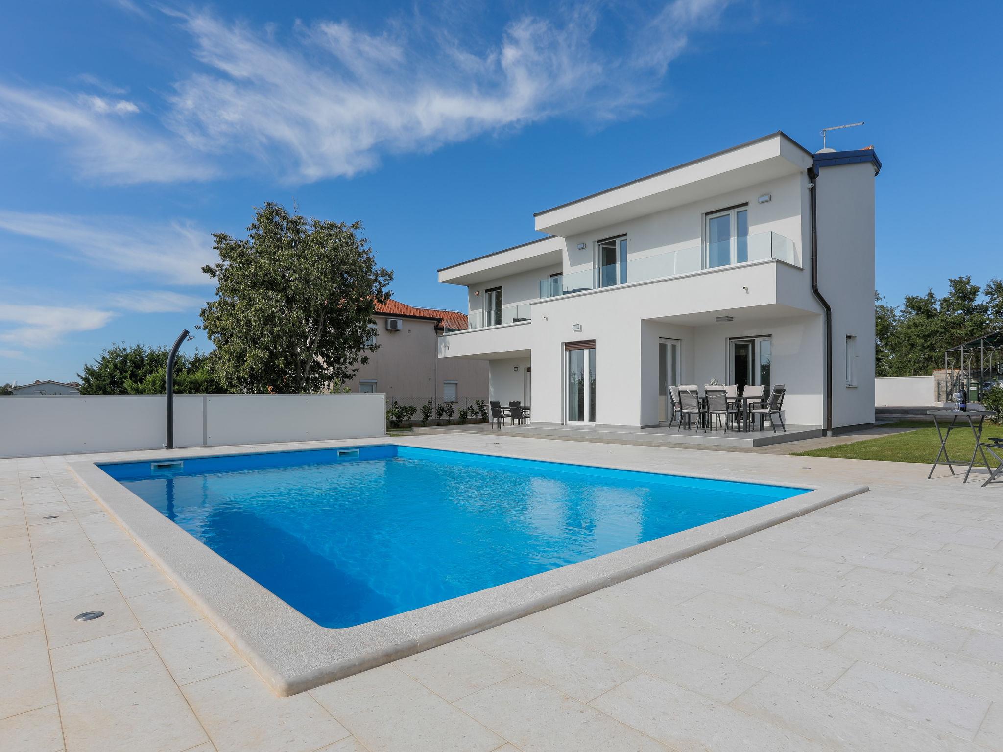Nova Vas 6 km from Porec: Beautiful single-family house "Villa Tonka", 2 storeys, built in 2019. 500 m from the centre of Nova Vas, in a sunny position, 5 km from the sea. Private: property 1'100 m2 (fenced), garden with lawn, swimming pool angular (10 x 4 m, depth 150 cm, seasonal availability: 01.May. - 15.Oct.) with internal staircase. Outdoor shower, terrace (15 m2), garden furniture, barbecue. In the house: internet access, washing machine. Parking (for 2 cars) at the house on the premises. Supermarket 600 m, restaurant 1 km, pebble beach 5 km, rocky beach 5 km, public bathing area 5 km. Tennis 5 km, riding stable 7 km, walking paths from the house 100 m, cycle lane 150 m. Nearby attractions: aquapark 10 km, amusement park 15 km. Please note: suitable for families. The owner does not accept any youth groups. Organizing a party is not allowed. The unit consists of 2 houses rented as one unit.