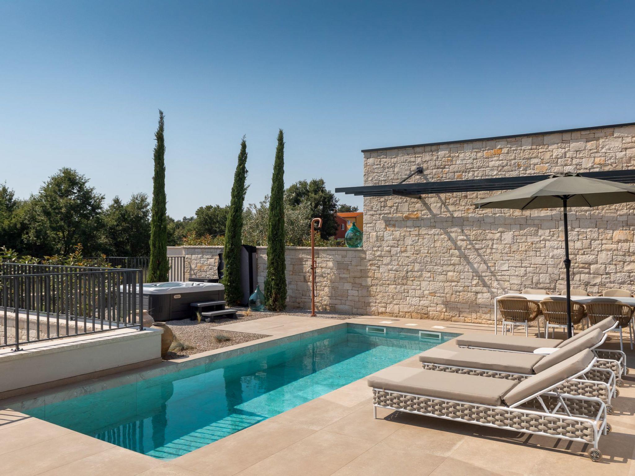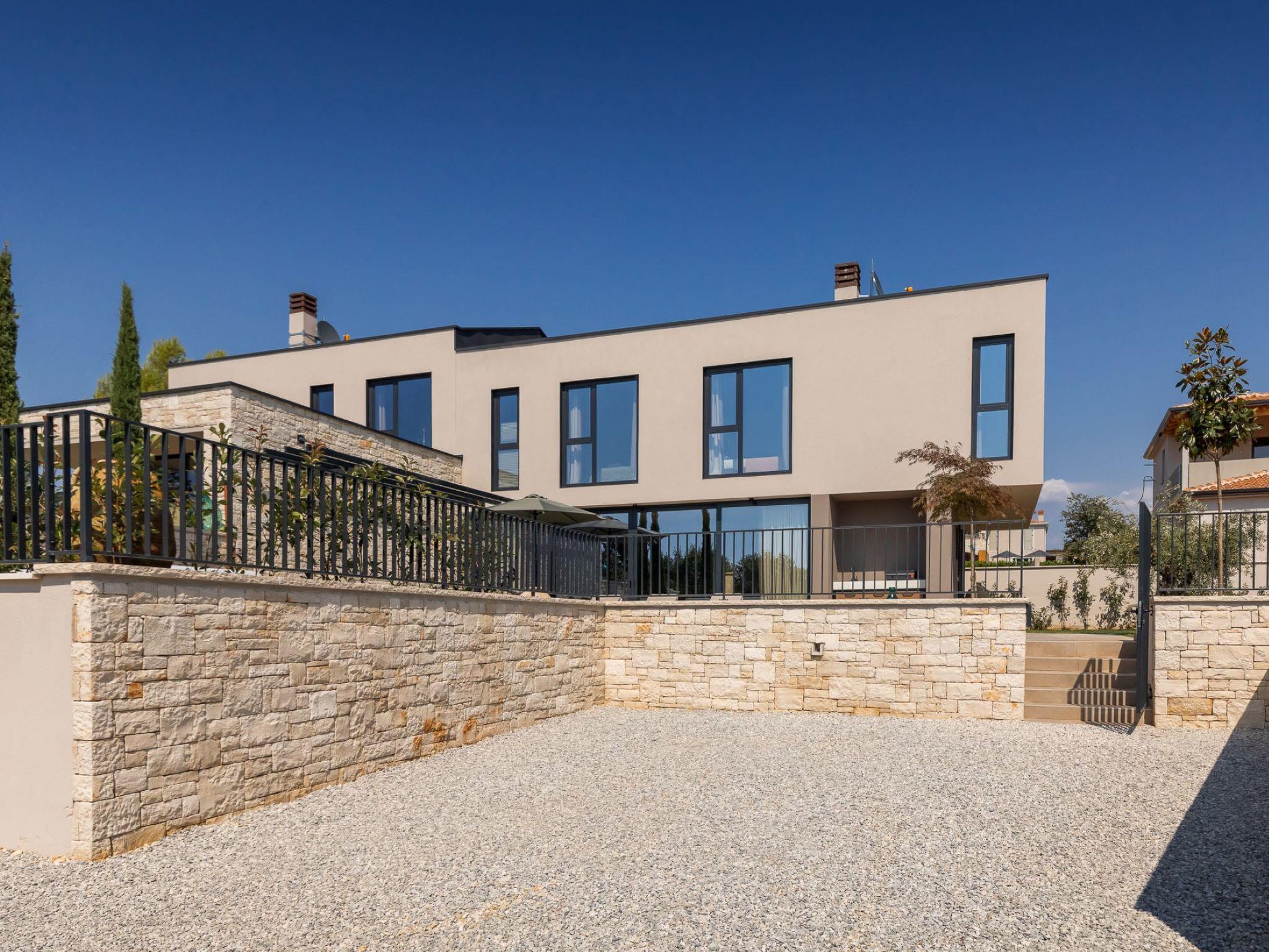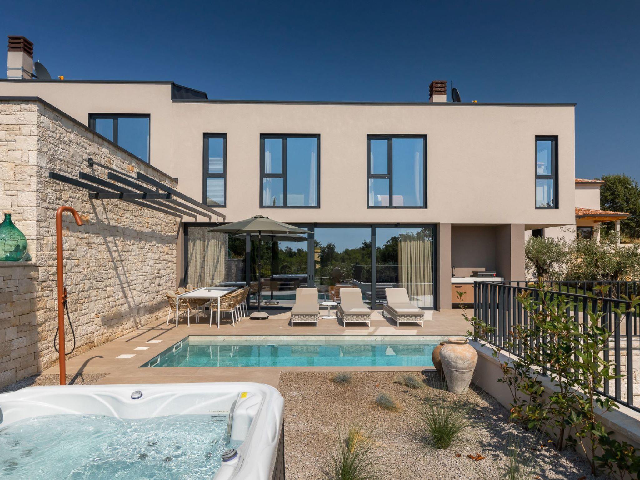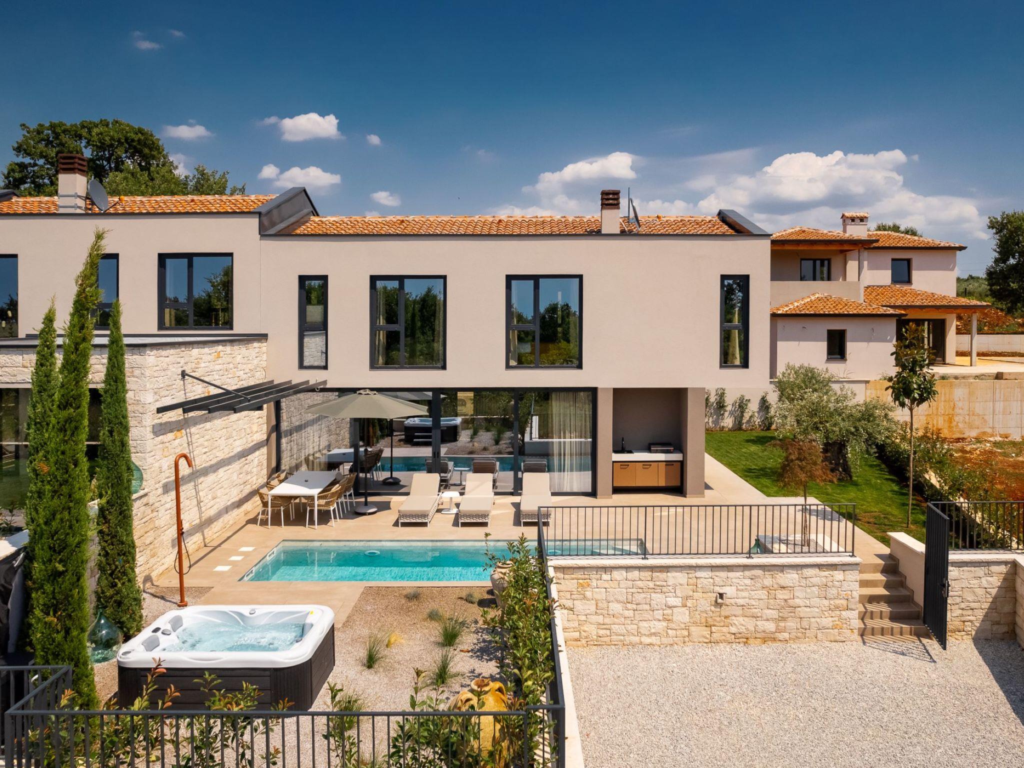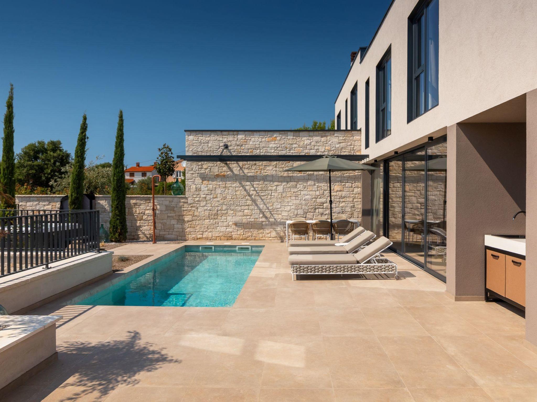 Very beautiful semi-detached house "Tia 2", 2 storeys, built in 2024. In the hamlet Mihatovici 1 km from the centre of Nova Vas, 5 km from the centre of Porec, 4.5 km from the sea, 4.5 km from the beach. Private: property 400 m2 (fenced), garden with lawn, swimming pool angular, heated (7 x 3 m, 21 m2, depth 140 cm, seasonal availability: 01.Apr. - 01.Nov.) with internal staircase and salt-electrolysis pool-cleaning system. Outdoor shower, terrace (20 m2), barbecue. In the house: internet access, sauna, hot tub, washing machine. Parking (for 2 cars) at the house on the premises. Shop 1.5 km, shopping centre 3 km, restaurant 70 m, café 1.5 km, bus stop 2.8 km, pebble beach 4.5 km, rocky beach 4.5 km. Nearby attractions: Aquapark 9 km. Groups of teenagers on request only. Please note: airfield 46 m from the property. Heated swimming pool (extra). It is necessary to notify us 7 days in advance if you wish to have the pool heating turned on.