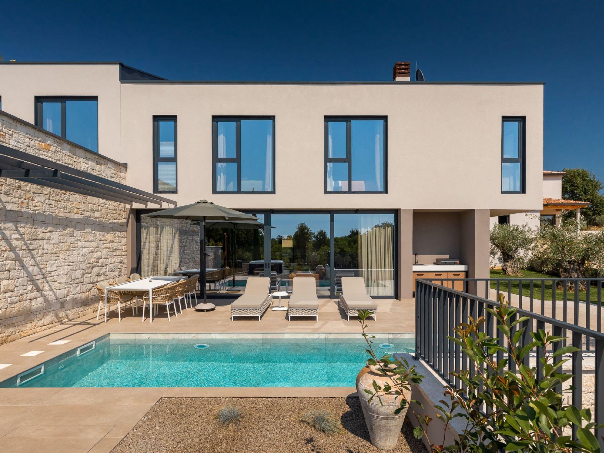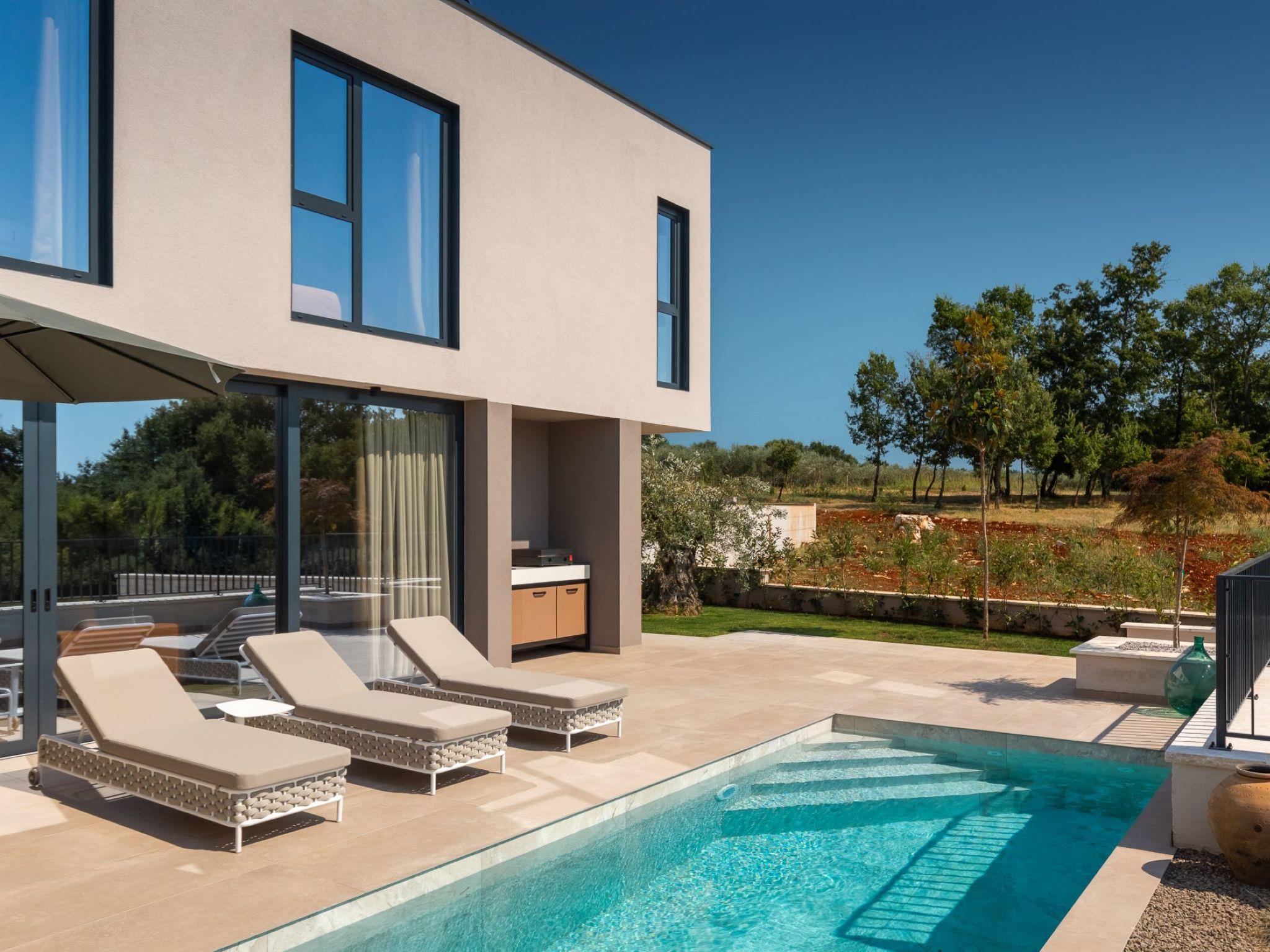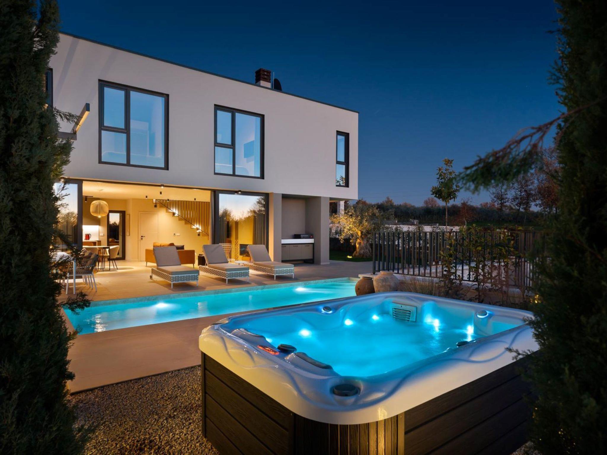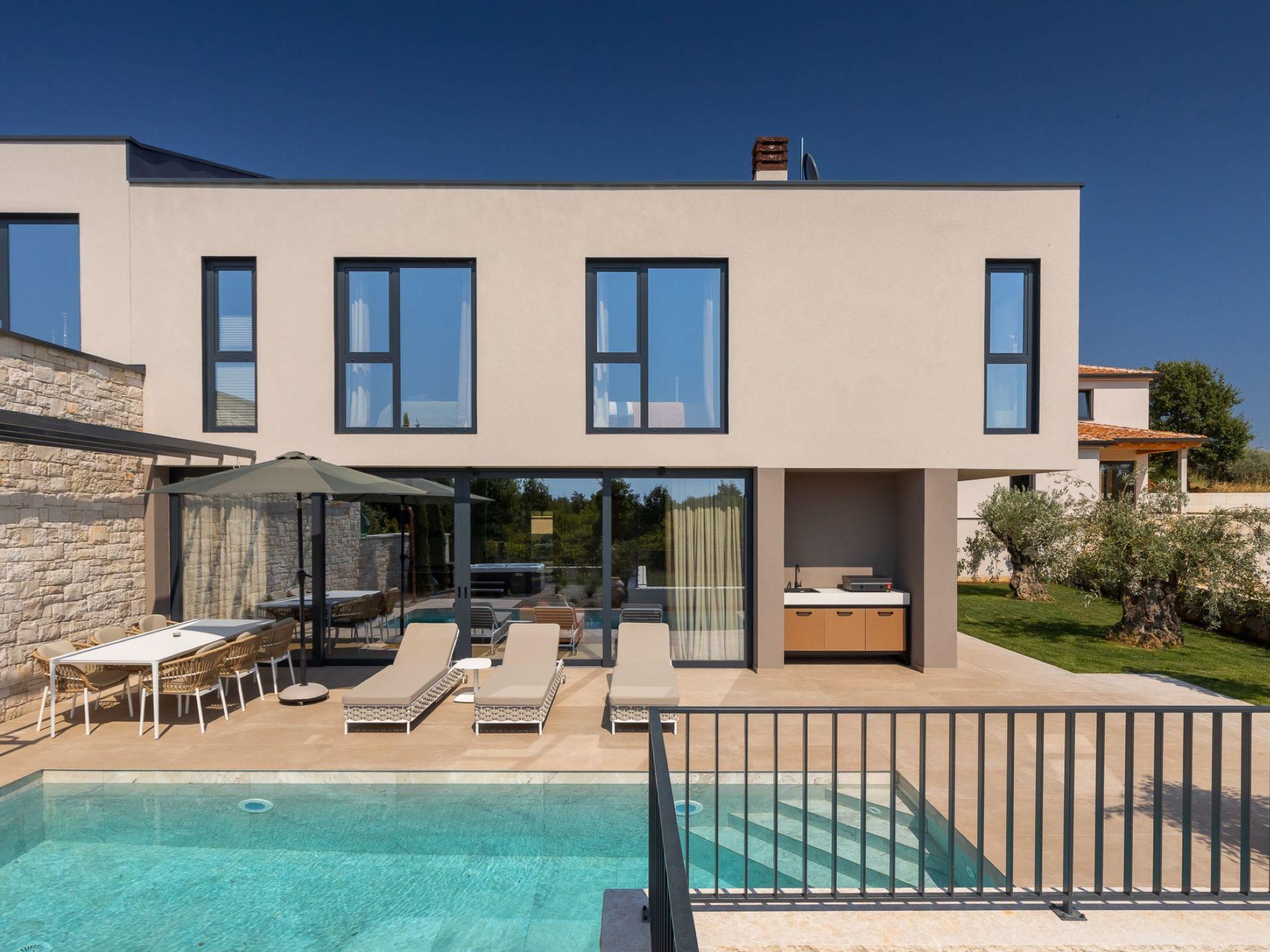 Very beautiful semi-detached house "Tia 2", 2 storeys, built in 2024. In the hamlet Mihatovici 1 km from the centre of Nova Vas, 5 km from the centre of Porec, 4.5 km from the sea, 4.5 km from the beach. Private: property 400 m2 (fenced), garden with lawn, swimming pool angular, heated (7 x 3 m, 21 m2, depth 140 cm, seasonal availability: 01.Apr. - 01.Nov.) with internal staircase and salt-electrolysis pool-cleaning system. Outdoor shower, terrace (20 m2), barbecue. In the house: internet access, sauna, hot tub, washing machine. Parking (for 2 cars) at the house on the premises. Shop 1.5 km, shopping centre 3 km, restaurant 70 m, café 1.5 km, bus stop 2.8 km, pebble beach 4.5 km, rocky beach 4.5 km. Nearby attractions: Aquapark 9 km. Groups of teenagers on request only. Please note: airfield 46 m from the property. Heated swimming pool (extra). It is necessary to notify us 7 days in advance if you wish to have the pool heating turned on.
