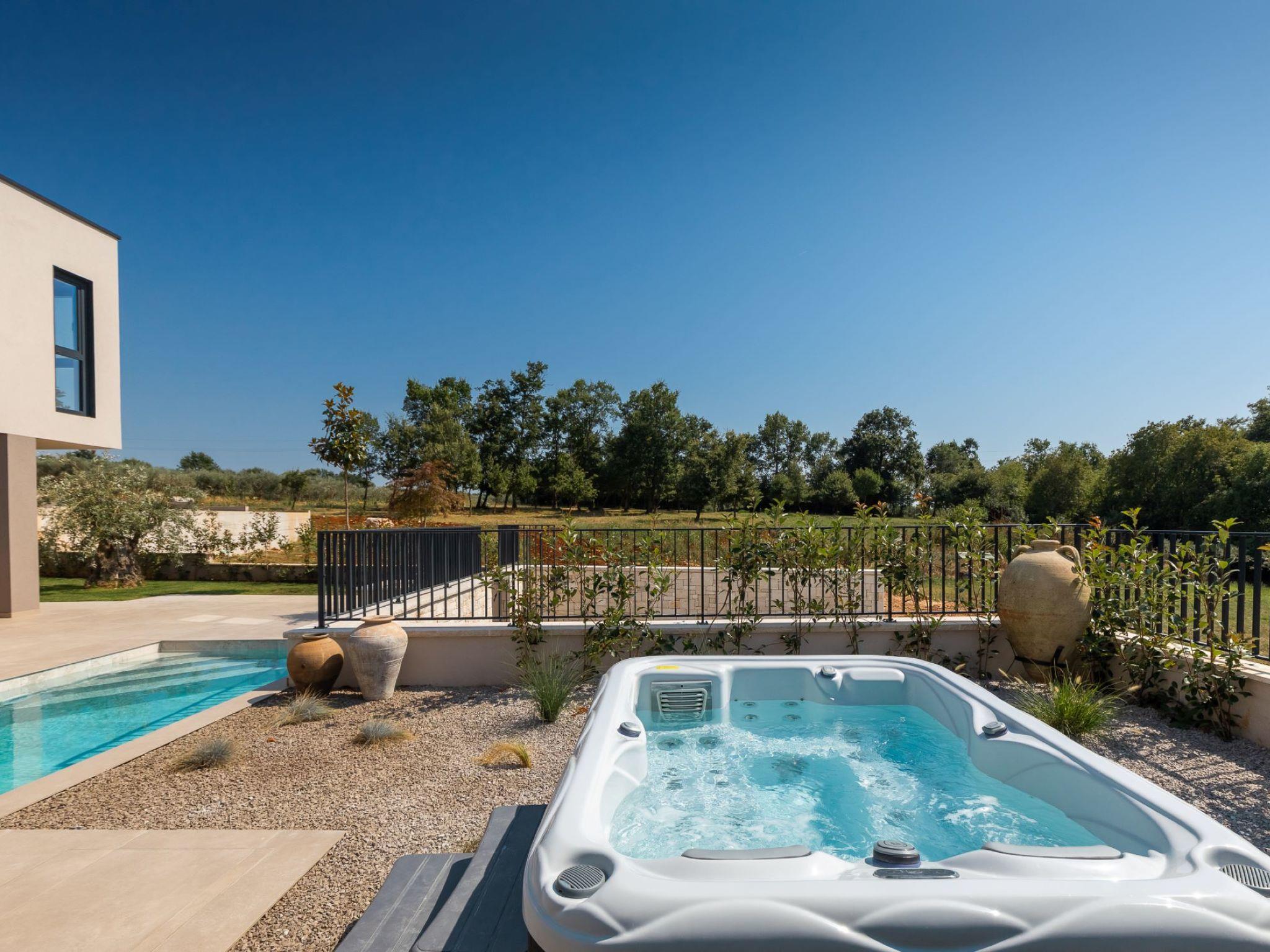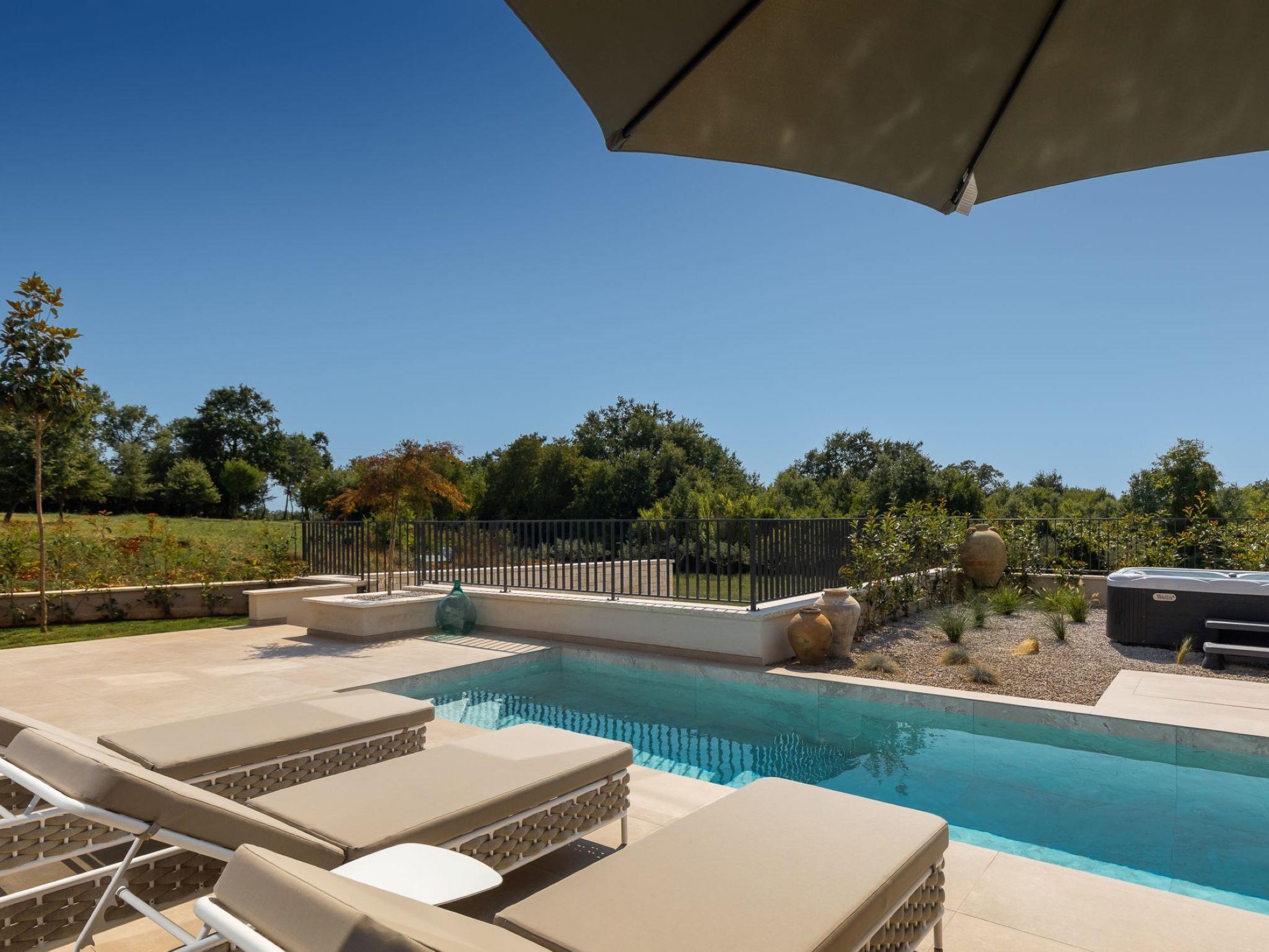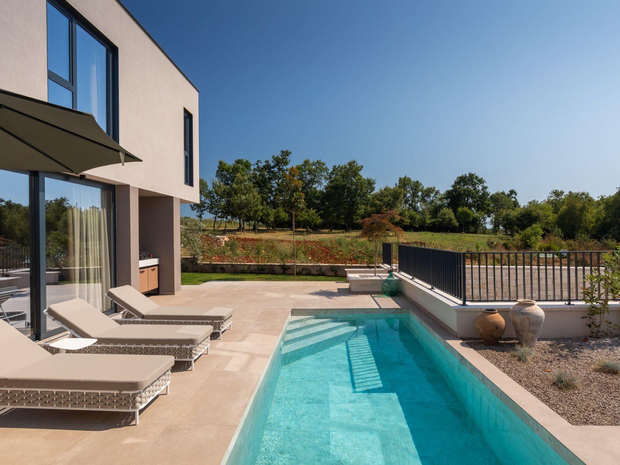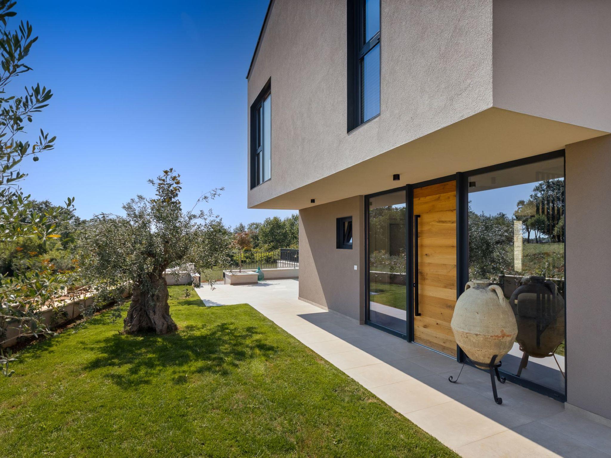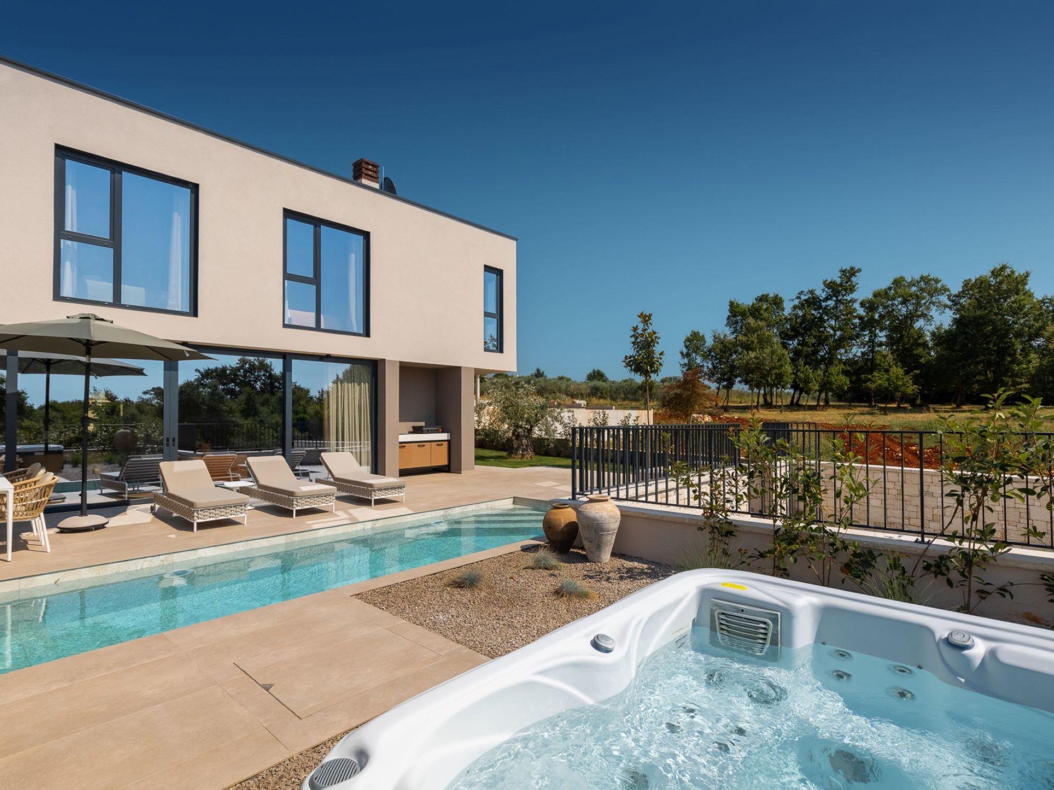 Very beautiful semi-detached house "Tia 2", 2 storeys, built in 2024. In the hamlet Mihatovici 1 km from the centre of Nova Vas, 5 km from the centre of Porec, 4.5 km from the sea, 4.5 km from the beach. Private: property 400 m2 (fenced), garden with lawn, swimming pool angular, heated (7 x 3 m, 21 m2, depth 140 cm, seasonal availability: 01.Apr. - 01.Nov.) with internal staircase and salt-electrolysis pool-cleaning system. Outdoor shower, terrace (20 m2), barbecue. In the house: internet access, sauna, hot tub, washing machine. Parking (for 2 cars) at the house on the premises. Shop 1.5 km, shopping centre 3 km, restaurant 70 m, café 1.5 km, bus stop 2.8 km, pebble beach 4.5 km, rocky beach 4.5 km. Nearby attractions: Aquapark 9 km. Groups of teenagers on request only. Please note: airfield 46 m from the property. Heated swimming pool (extra). It is necessary to notify us 7 days in advance if you wish to have the pool heating turned on.