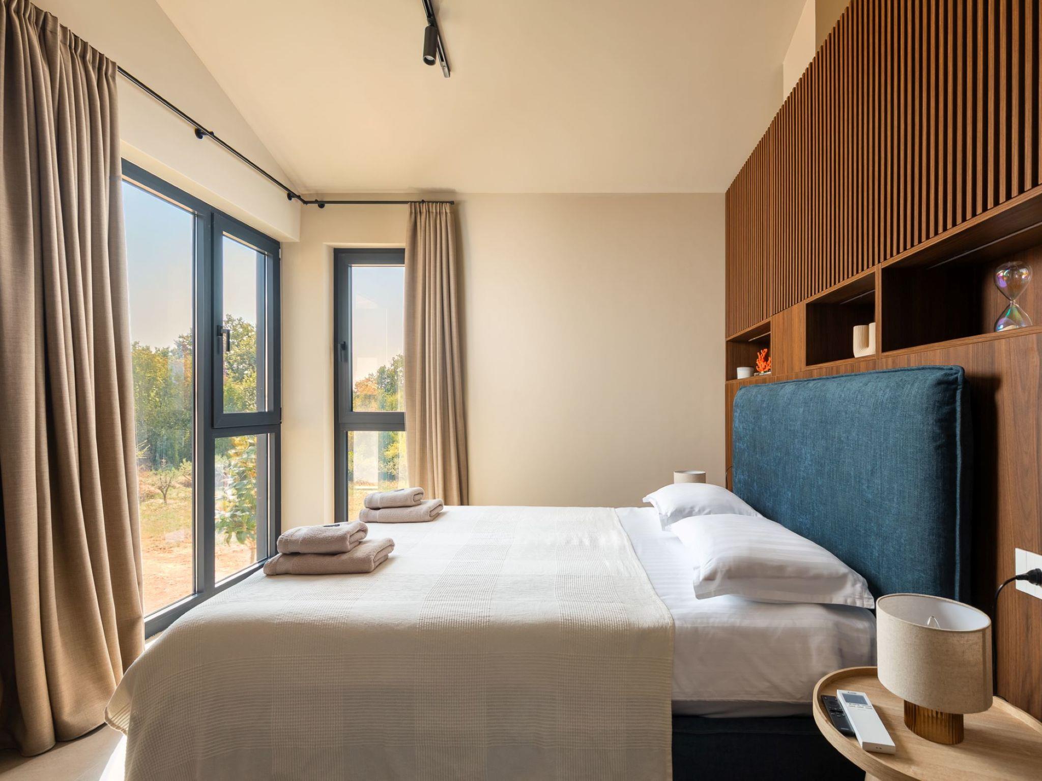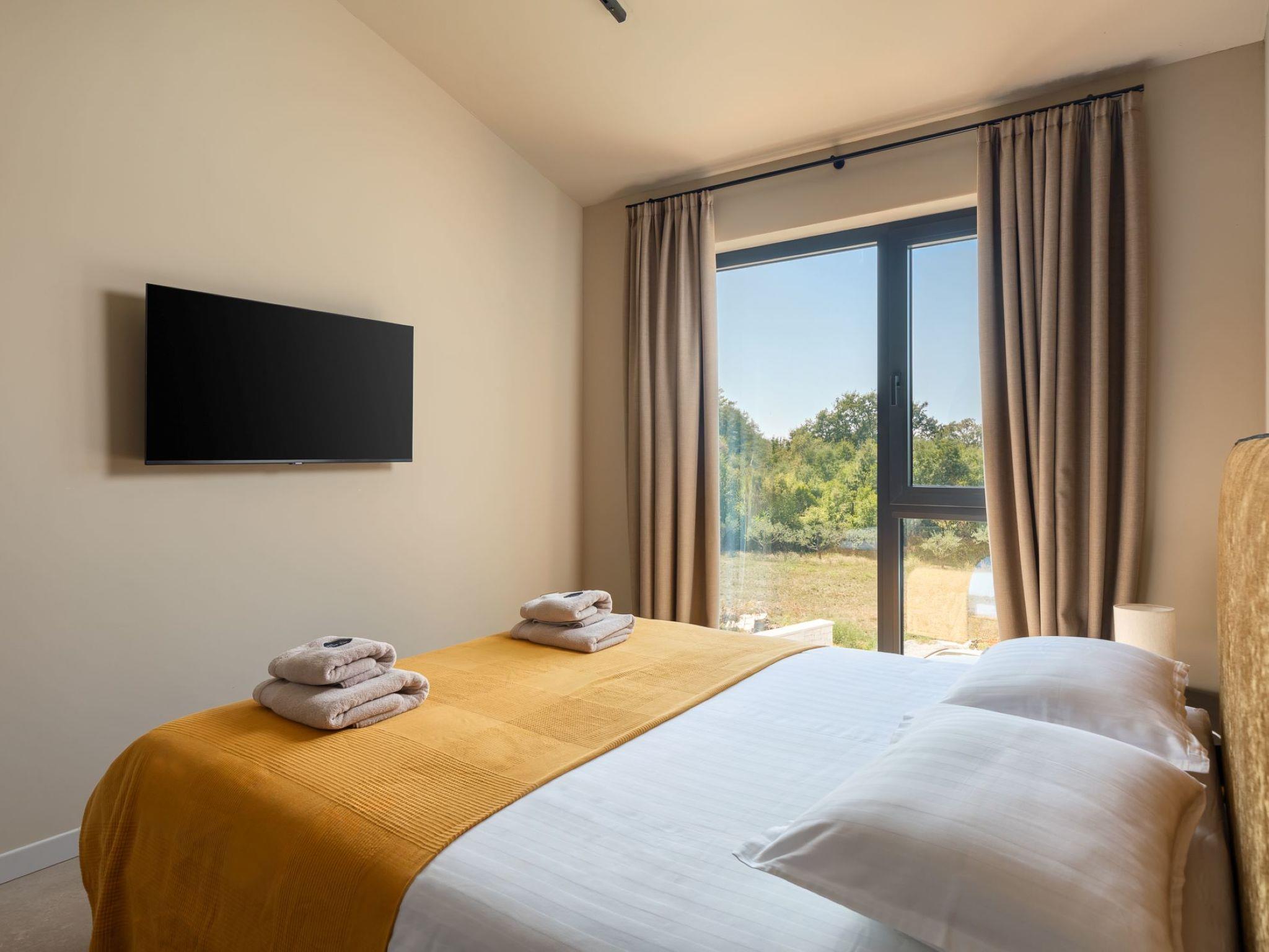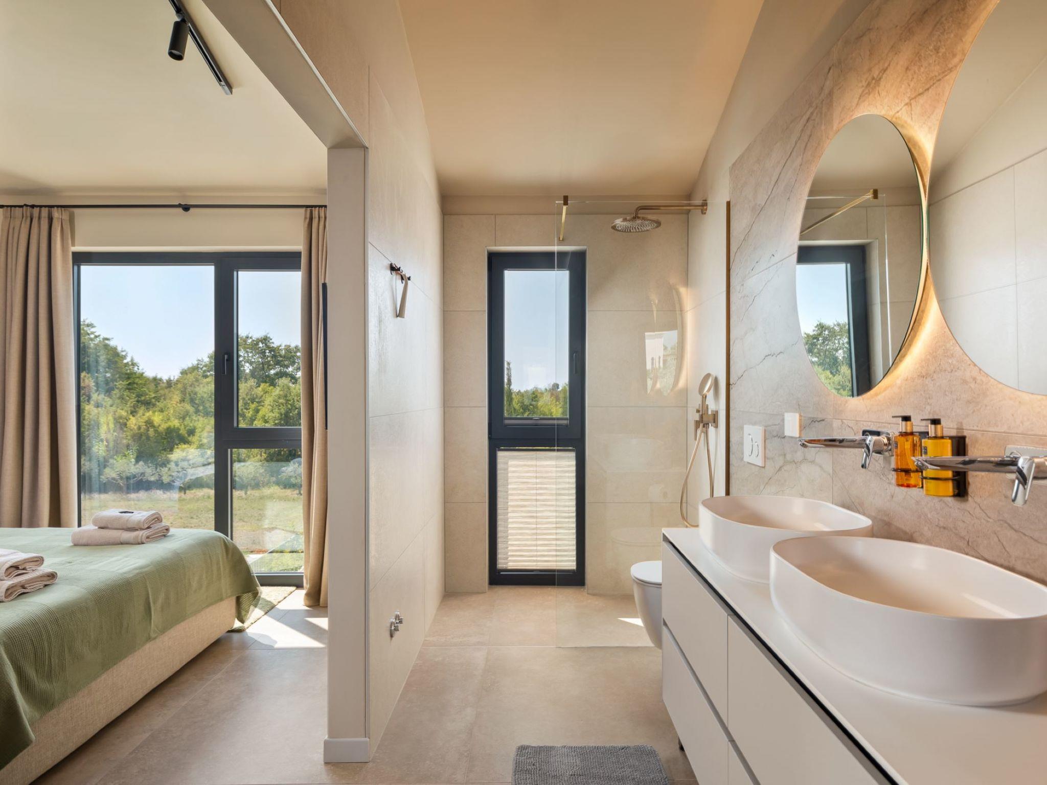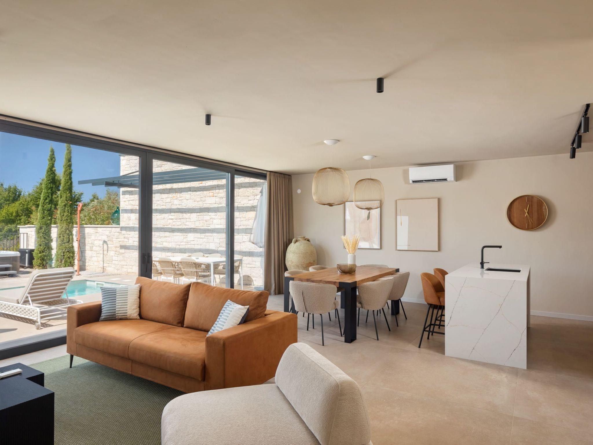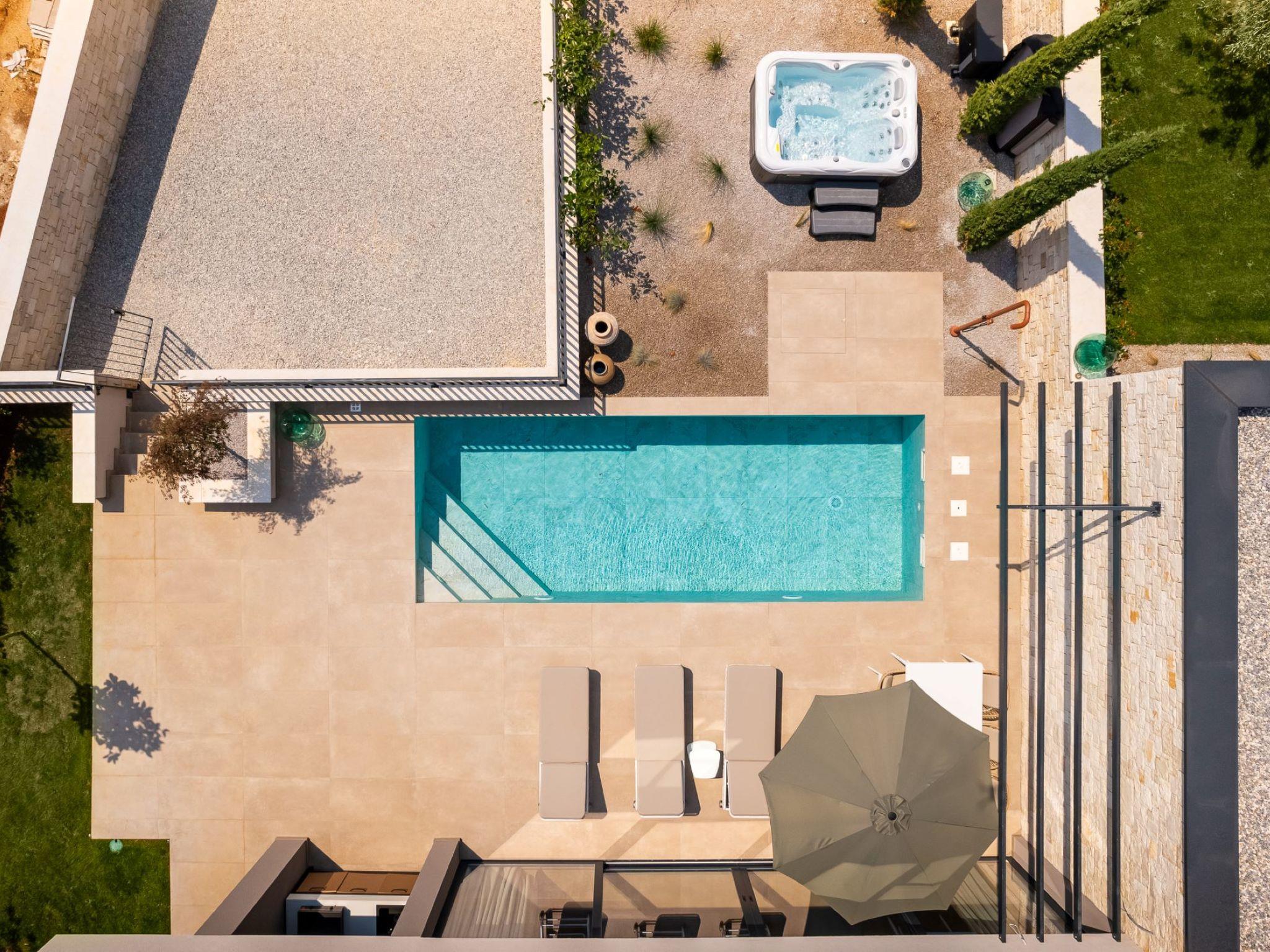 Very beautiful semi-detached house "Tia 2", 2 storeys, built in 2024. In the hamlet Mihatovici 1 km from the centre of Nova Vas, 5 km from the centre of Porec, 4.5 km from the sea, 4.5 km from the beach. Private: property 400 m2 (fenced), garden with lawn, swimming pool angular, heated (7 x 3 m, 21 m2, depth 140 cm, seasonal availability: 01.Apr. - 01.Nov.) with internal staircase and salt-electrolysis pool-cleaning system. Outdoor shower, terrace (20 m2), barbecue. In the house: internet access, sauna, hot tub, washing machine. Parking (for 2 cars) at the house on the premises. Shop 1.5 km, shopping centre 3 km, restaurant 70 m, café 1.5 km, bus stop 2.8 km, pebble beach 4.5 km, rocky beach 4.5 km. Nearby attractions: Aquapark 9 km. Groups of teenagers on request only. Please note: airfield 46 m from the property. Heated swimming pool (extra). It is necessary to notify us 7 days in advance if you wish to have the pool heating turned on.