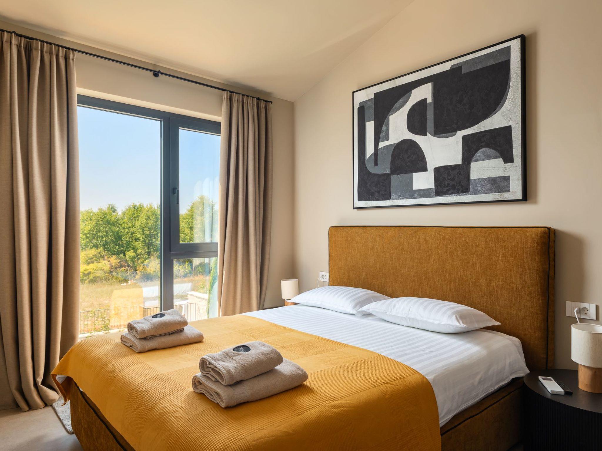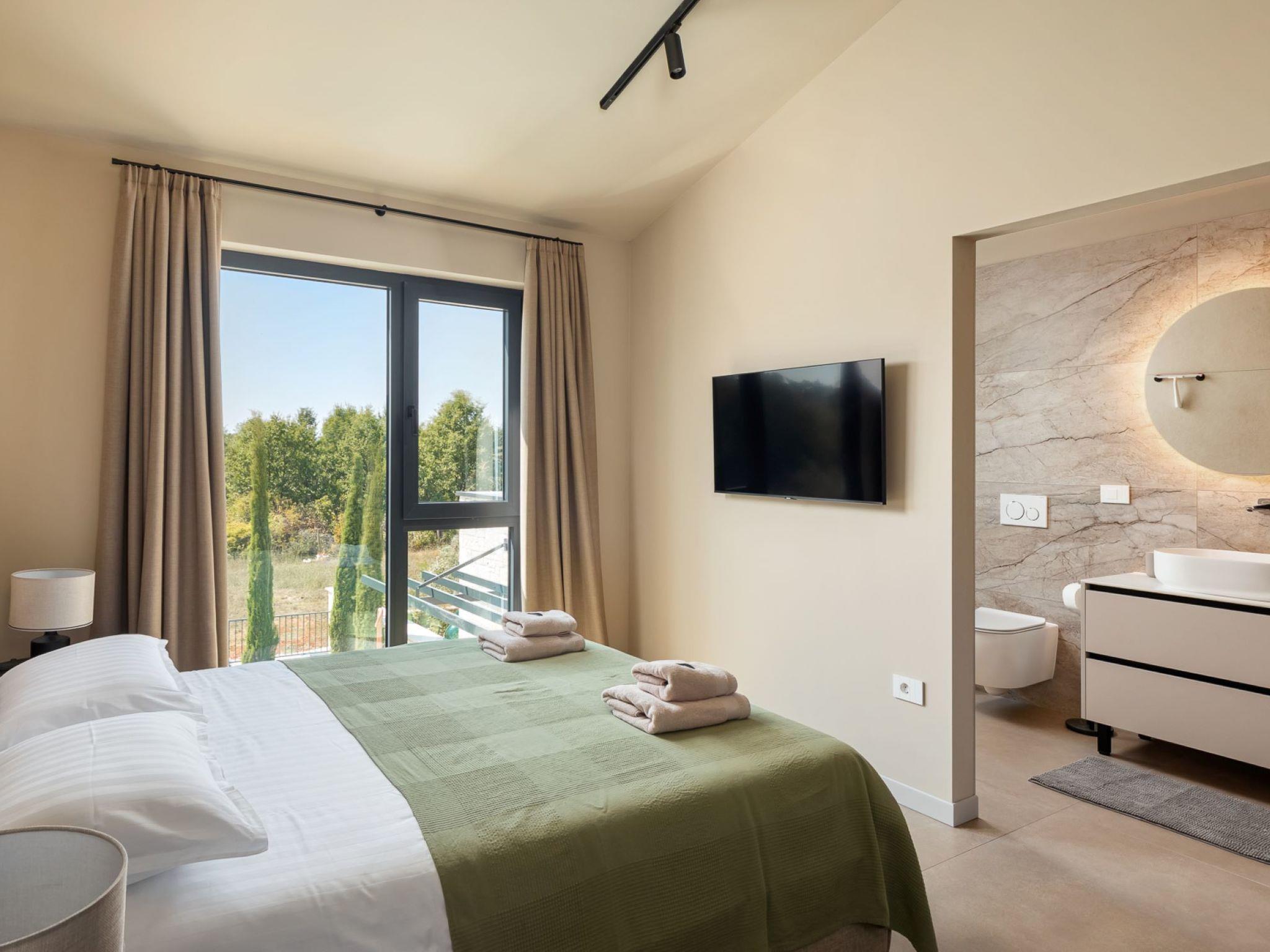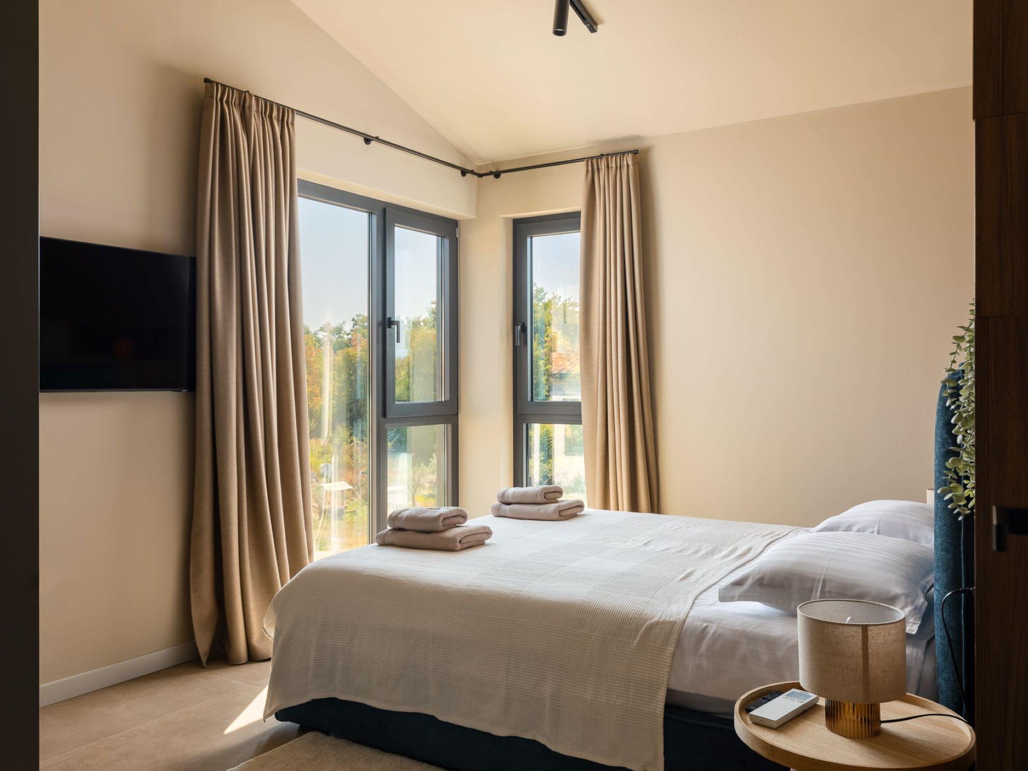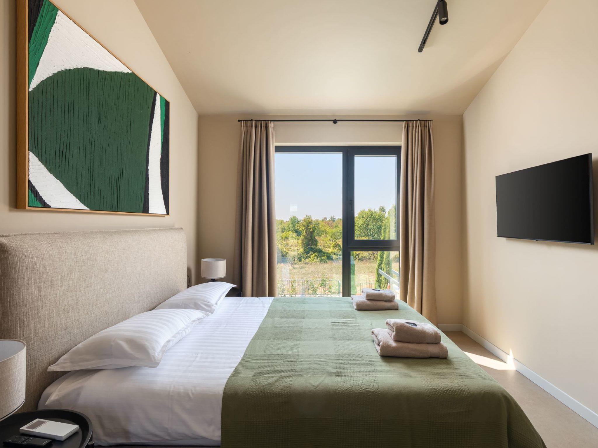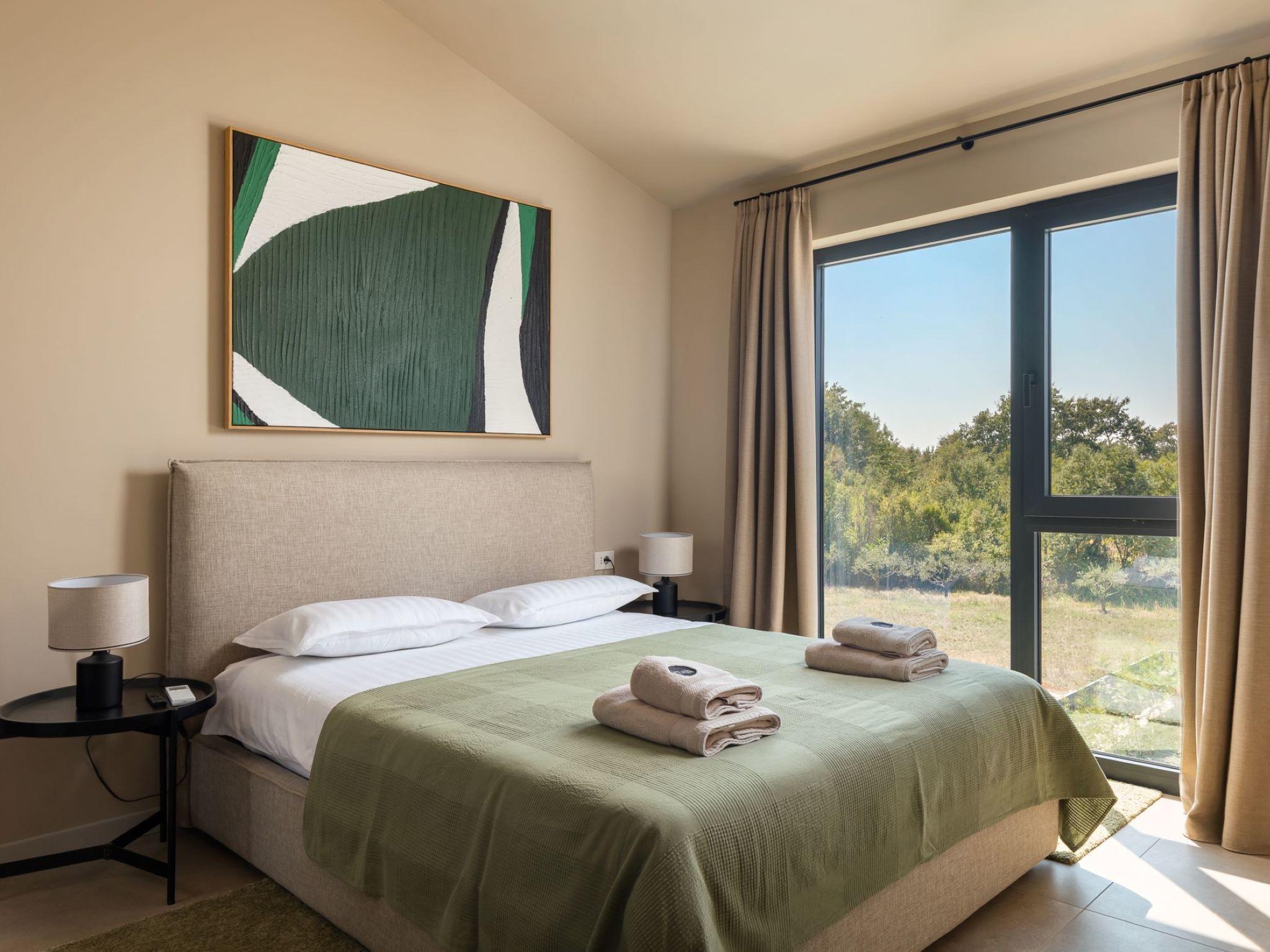 Very beautiful semi-detached house "Tia 2", 2 storeys, built in 2024. In the hamlet Mihatovici 1 km from the centre of Nova Vas, 5 km from the centre of Porec, 4.5 km from the sea, 4.5 km from the beach. Private: property 400 m2 (fenced), garden with lawn, swimming pool angular, heated (7 x 3 m, 21 m2, depth 140 cm, seasonal availability: 01.Apr. - 01.Nov.) with internal staircase and salt-electrolysis pool-cleaning system. Outdoor shower, terrace (20 m2), barbecue. In the house: internet access, sauna, hot tub, washing machine. Parking (for 2 cars) at the house on the premises. Shop 1.5 km, shopping centre 3 km, restaurant 70 m, café 1.5 km, bus stop 2.8 km, pebble beach 4.5 km, rocky beach 4.5 km. Nearby attractions: Aquapark 9 km. Groups of teenagers on request only. Please note: airfield 46 m from the property. Heated swimming pool (extra). It is necessary to notify us 7 days in advance if you wish to have the pool heating turned on.