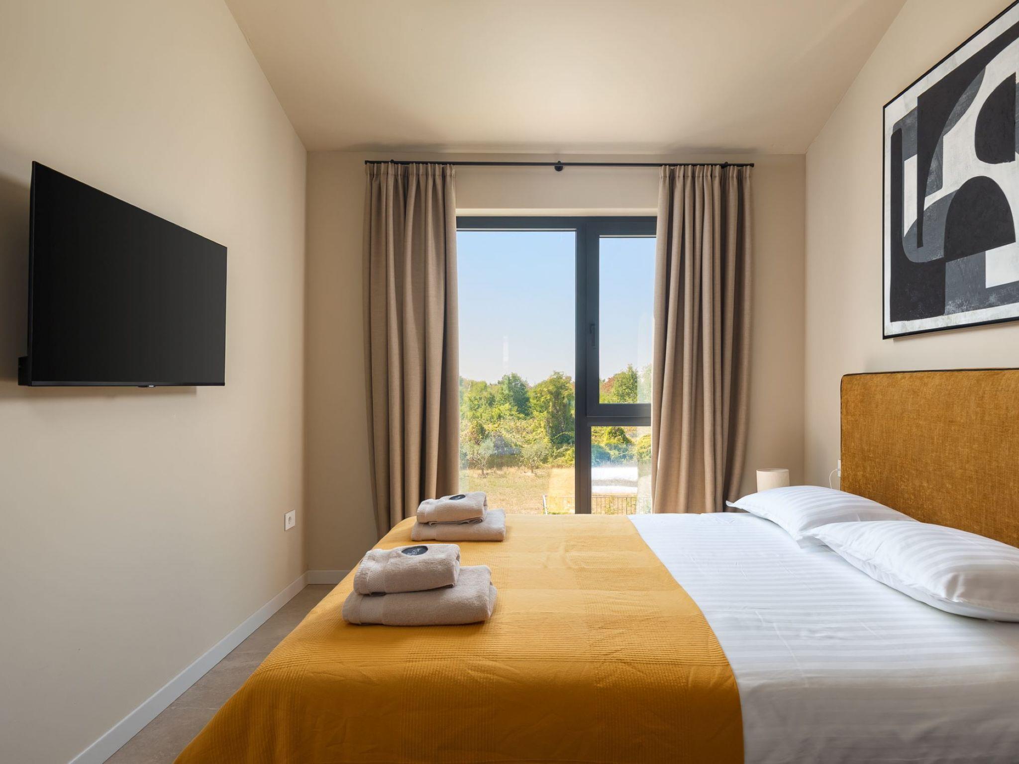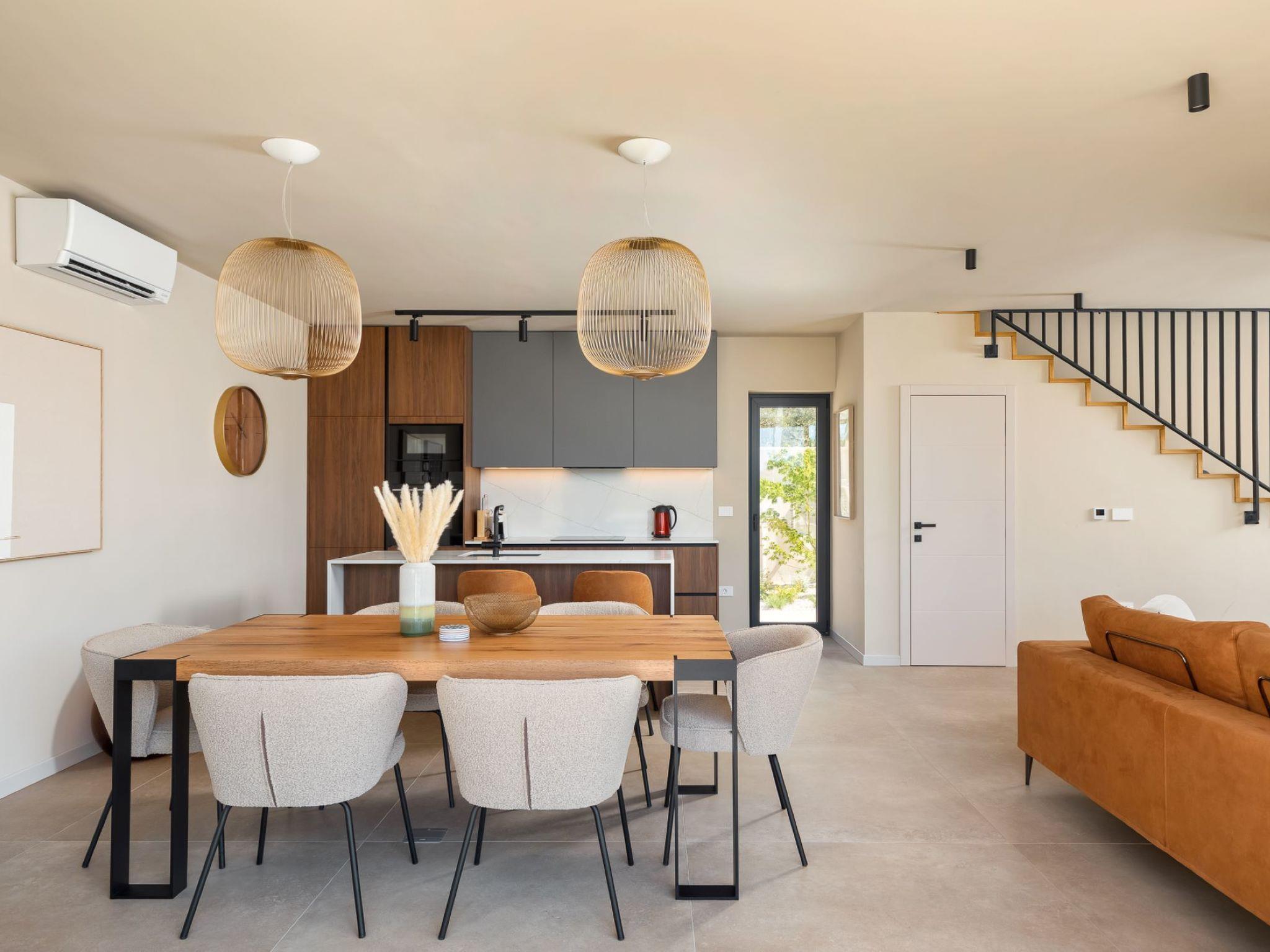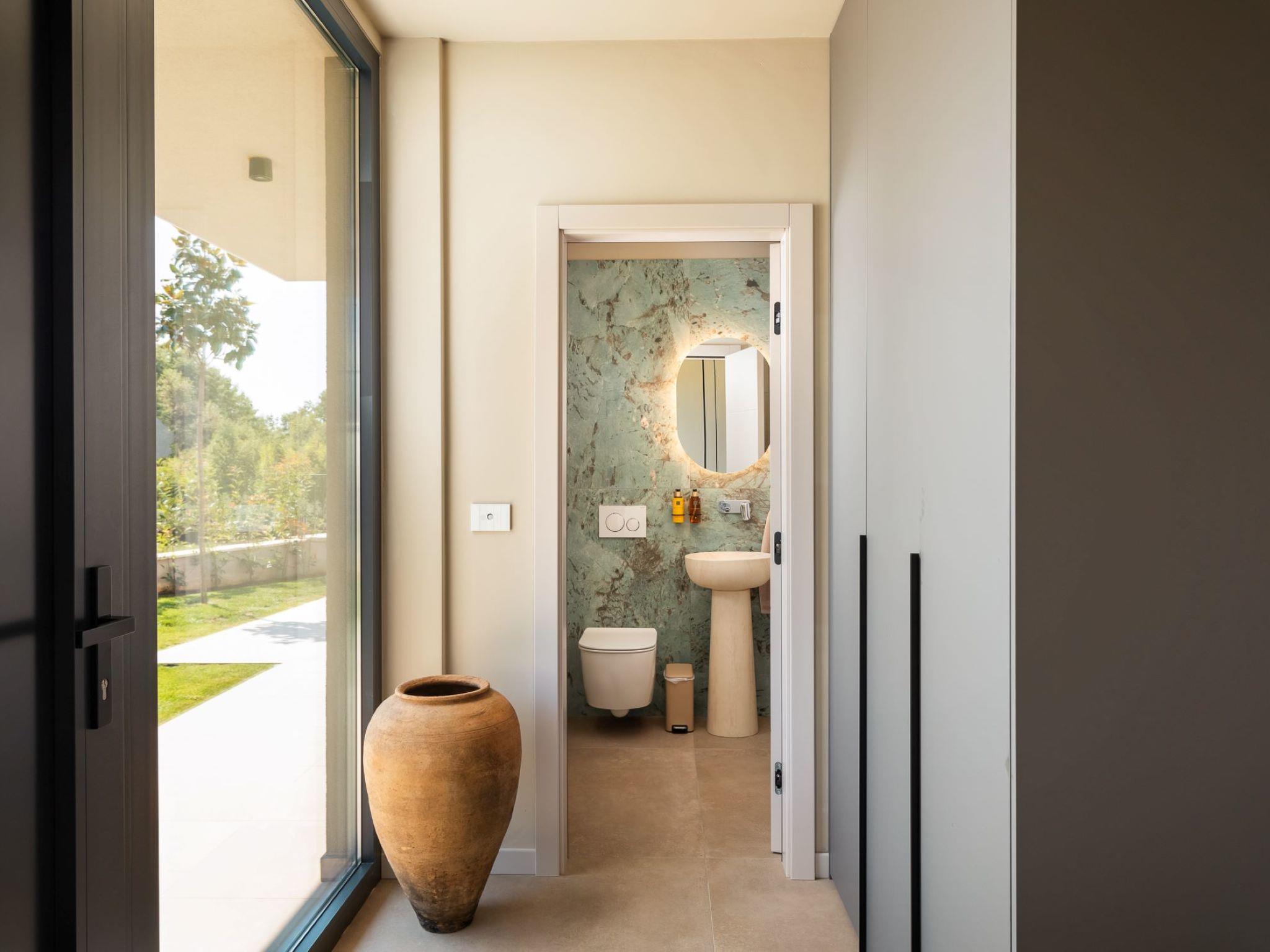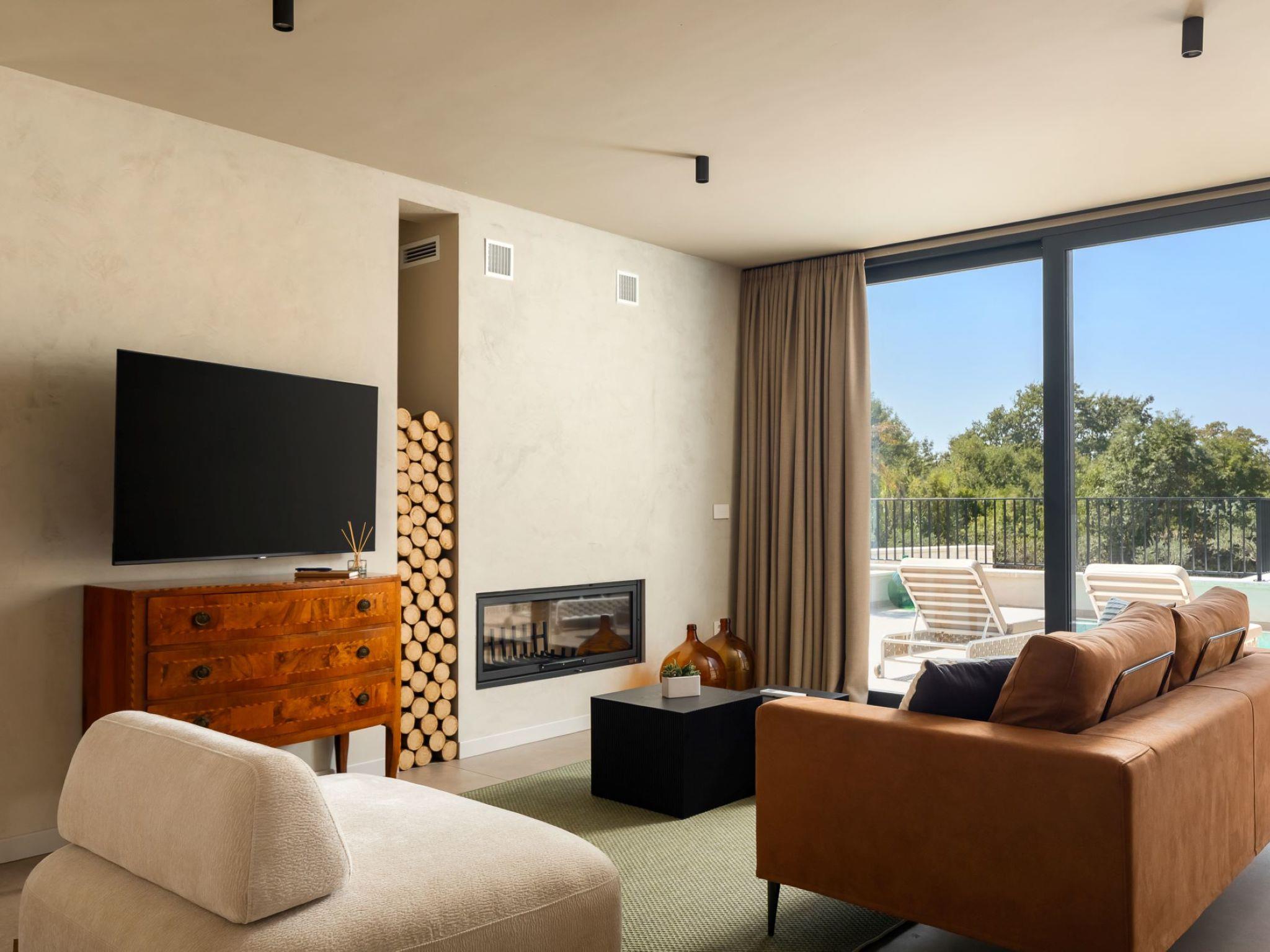 Very beautiful semi-detached house "Tia 2", 2 storeys, built in 2024. In the hamlet Mihatovici 1 km from the centre of Nova Vas, 5 km from the centre of Porec, 4.5 km from the sea, 4.5 km from the beach. Private: property 400 m2 (fenced), garden with lawn, swimming pool angular, heated (7 x 3 m, 21 m2, depth 140 cm, seasonal availability: 01.Apr. - 01.Nov.) with internal staircase and salt-electrolysis pool-cleaning system. Outdoor shower, terrace (20 m2), barbecue. In the house: internet access, sauna, hot tub, washing machine. Parking (for 2 cars) at the house on the premises. Shop 1.5 km, shopping centre 3 km, restaurant 70 m, café 1.5 km, bus stop 2.8 km, pebble beach 4.5 km, rocky beach 4.5 km. Nearby attractions: Aquapark 9 km. Groups of teenagers on request only. Please note: airfield 46 m from the property. Heated swimming pool (extra). It is necessary to notify us 7 days in advance if you wish to have the pool heating turned on.