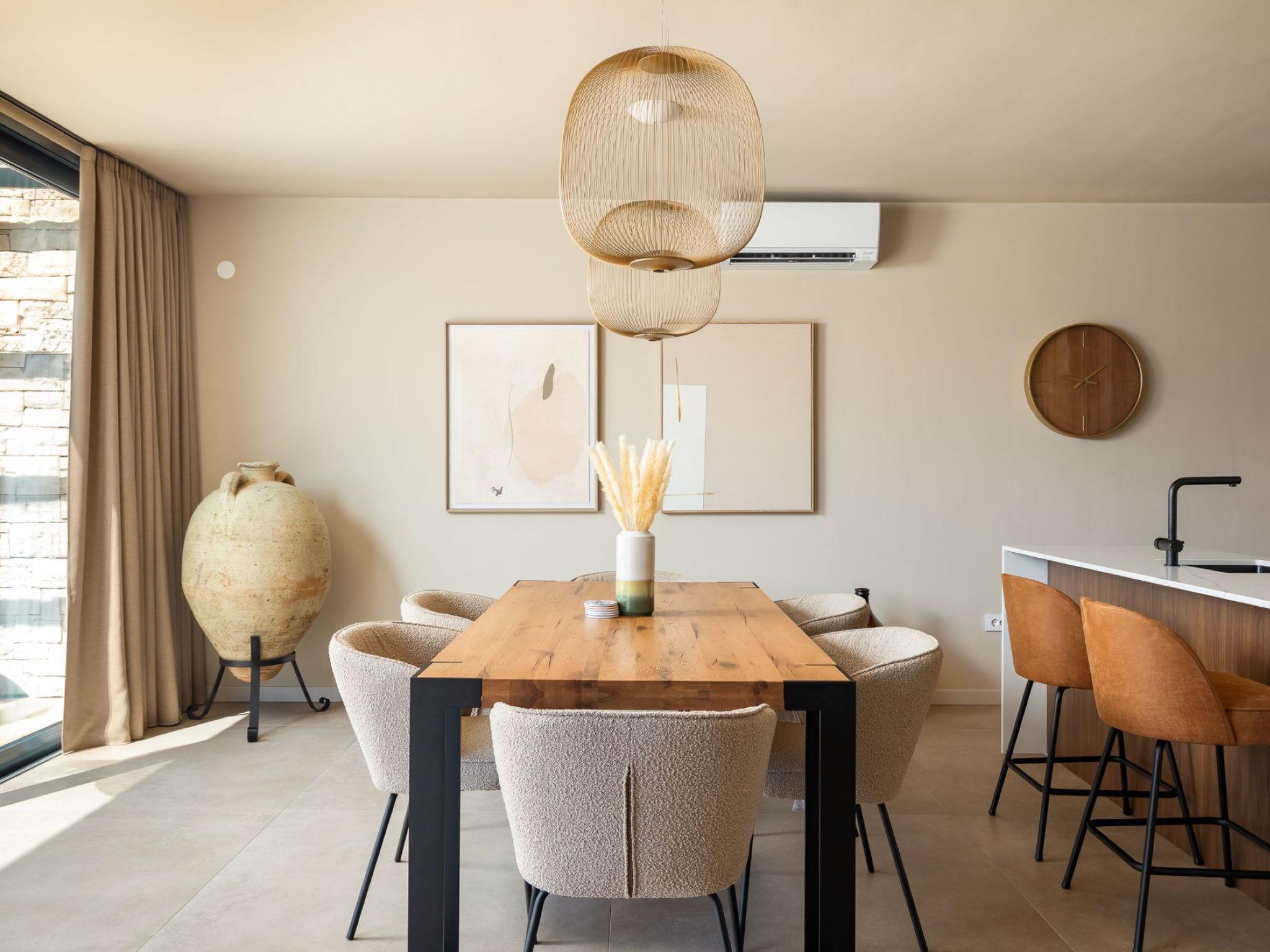 4-room semi-detached house 122 m2 on 2 levels. Modern and tasteful furnishings: living/dining room with satellite TV (flat screen), air conditioning. Exit to the terrace, to the swimming pool. Open kitchen (oven, dishwasher, 4 ceramic glass hob hotplates, microwave, freezer, electric coffee machine). Sep. WC. Upper floor: 1 room with 1 french bed (160 cm, length 200 cm), shower/WC and satellite TV (flat screen), air conditioning. 2 rooms, each room with 1 french bed (160 cm, length 200 cm), satellite TV (flat screen), air conditioning. Shower/WC. Underfloor heating. Terrace furniture, deck chairs. View of the swimming pool. Facilities: washing machine, iron, mosquito net, children's high chair, baby cot. Internet (WiFi, free). Please note: non-smoking house.
