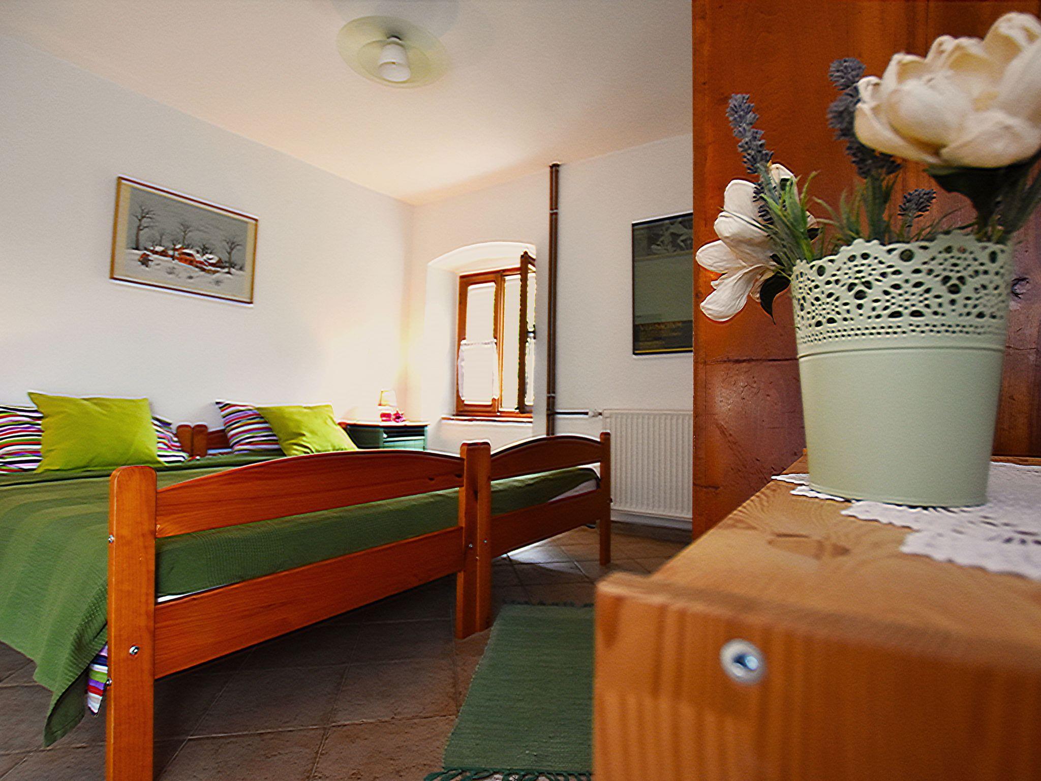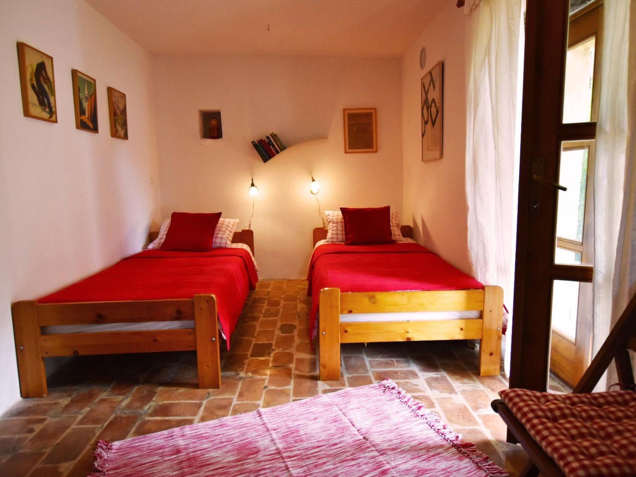 The Mediterranean stone house, built in 1900, modernized in 1999, is partly furnished with traditional Istrian furniture. It spreads across three floors, one bedroom on each: One is furnished with a 180 x 200 cm double bed, the other two each have two 90 x 200 cm single beds that can be pushed together to make a double bed. The rooms are simple and functional, combining rural and artistic style. In addition to the three bedrooms there are two bathrooms, a spacious living room on the first floor, a large, fully equipped kitchen with a dining room on the ground floor, from which you enter the garden. The villa also has a small reference library.