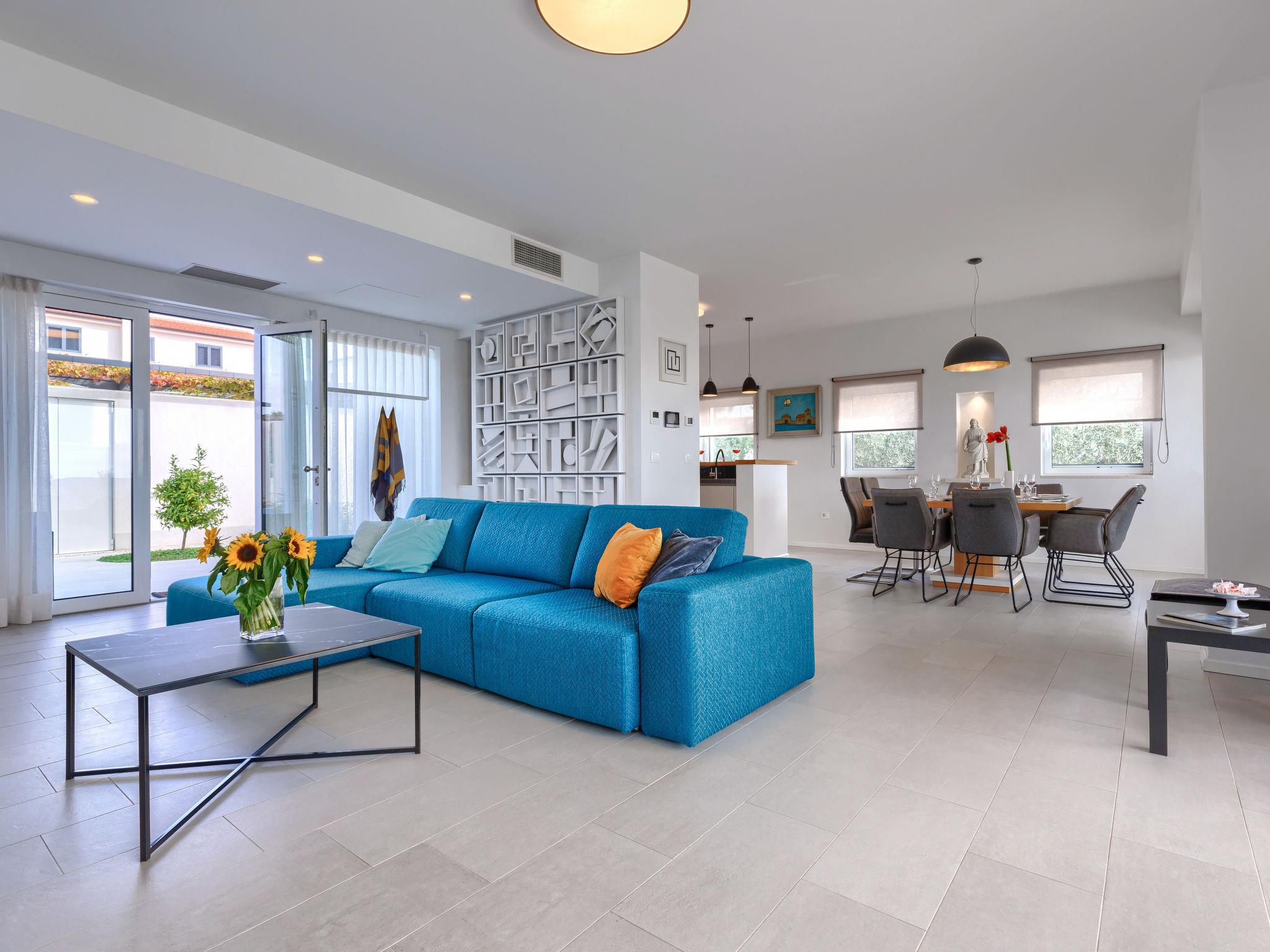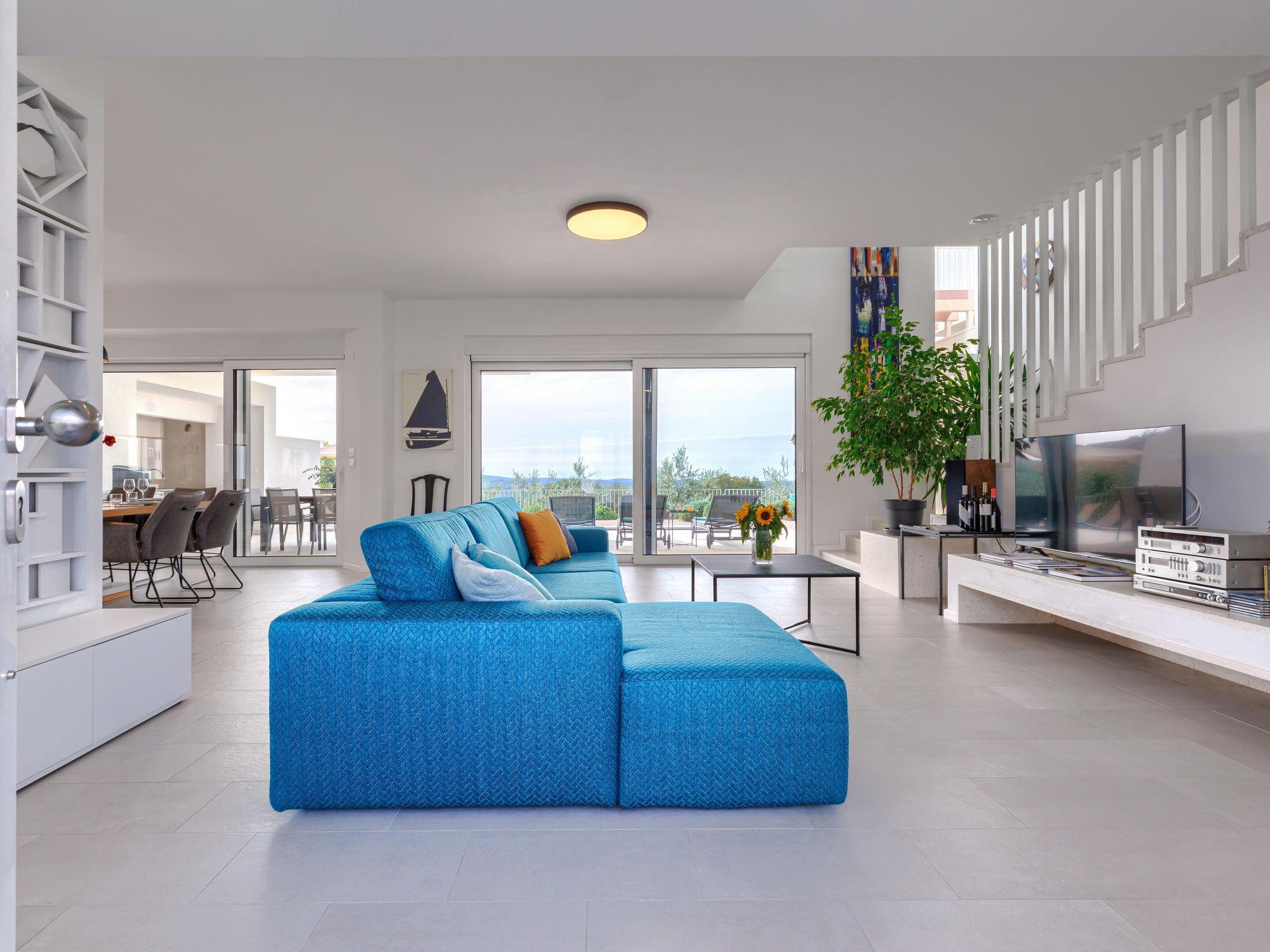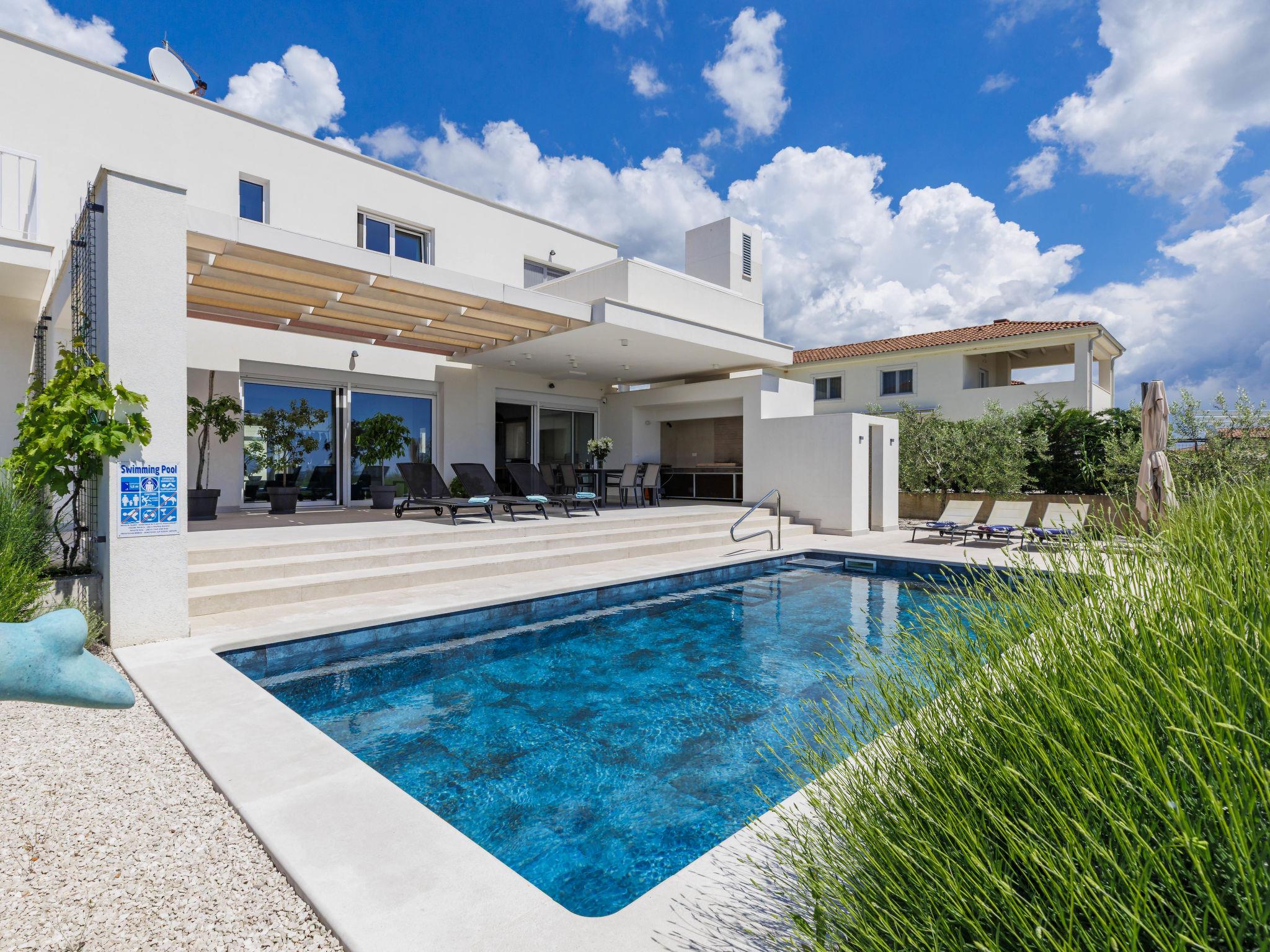 6-room villa 300 m2 on 3 levels. Spacious, modern and stylish furnishings: living/dining room with satellite TV and air conditioning. Exit to the terrace, to the swimming pool. 1 room with 1 french bed (180 cm, length 200 cm), shower/WC, satellite TV and air conditioning. Open kitchen (oven, dishwasher, 5 induction hot plates, kettle, microwave, freezer, electric coffee machine). Sep. WC. On the lower ground floor: playroom. Upper floor: 2 rooms, each room with 1 french bed (180 cm, length 200 cm), shower/WC, satellite TV and air conditioning. Exit to the balcony. 1 room with 2 beds (90 cm, length 200 cm), shower/WC, satellite TV and air conditioning. Forced-air heating. Balcony 6 m2, balcony 15 m2. Electric barbecue, deck chairs. View of the sea. Facilities: safe, iron, children's high chair, baby cot, hair dryer. Internet (WiFi, free). Maximum 1 pet/ dog allowed. The house is decorated with sculptures by the owner of the house, who is a Croatian academic sculptor.