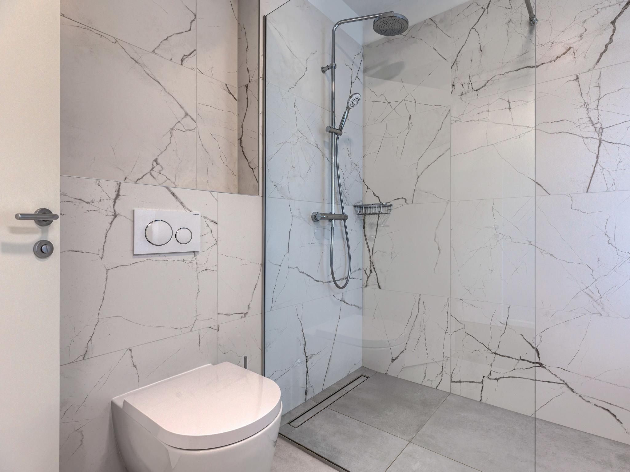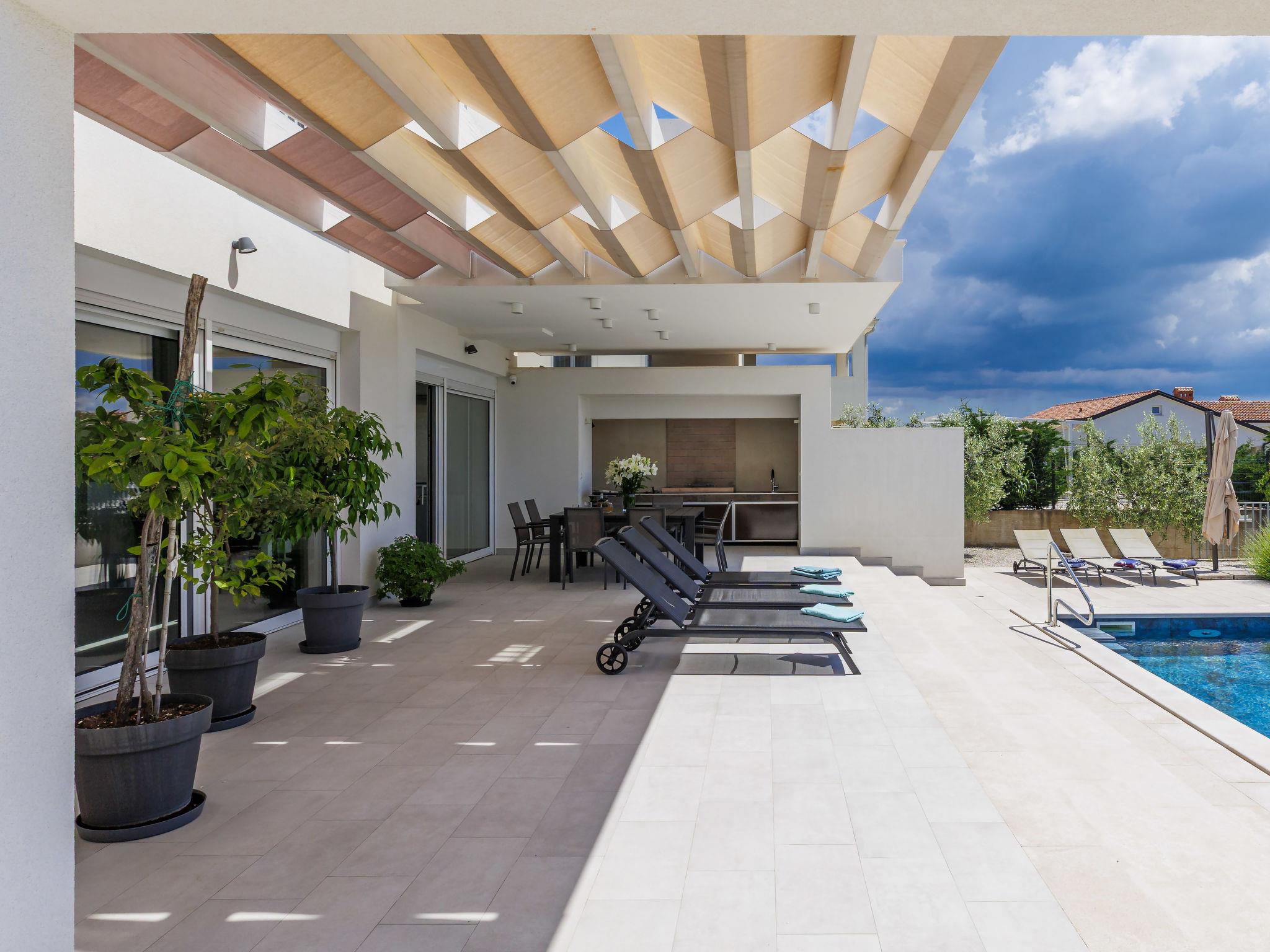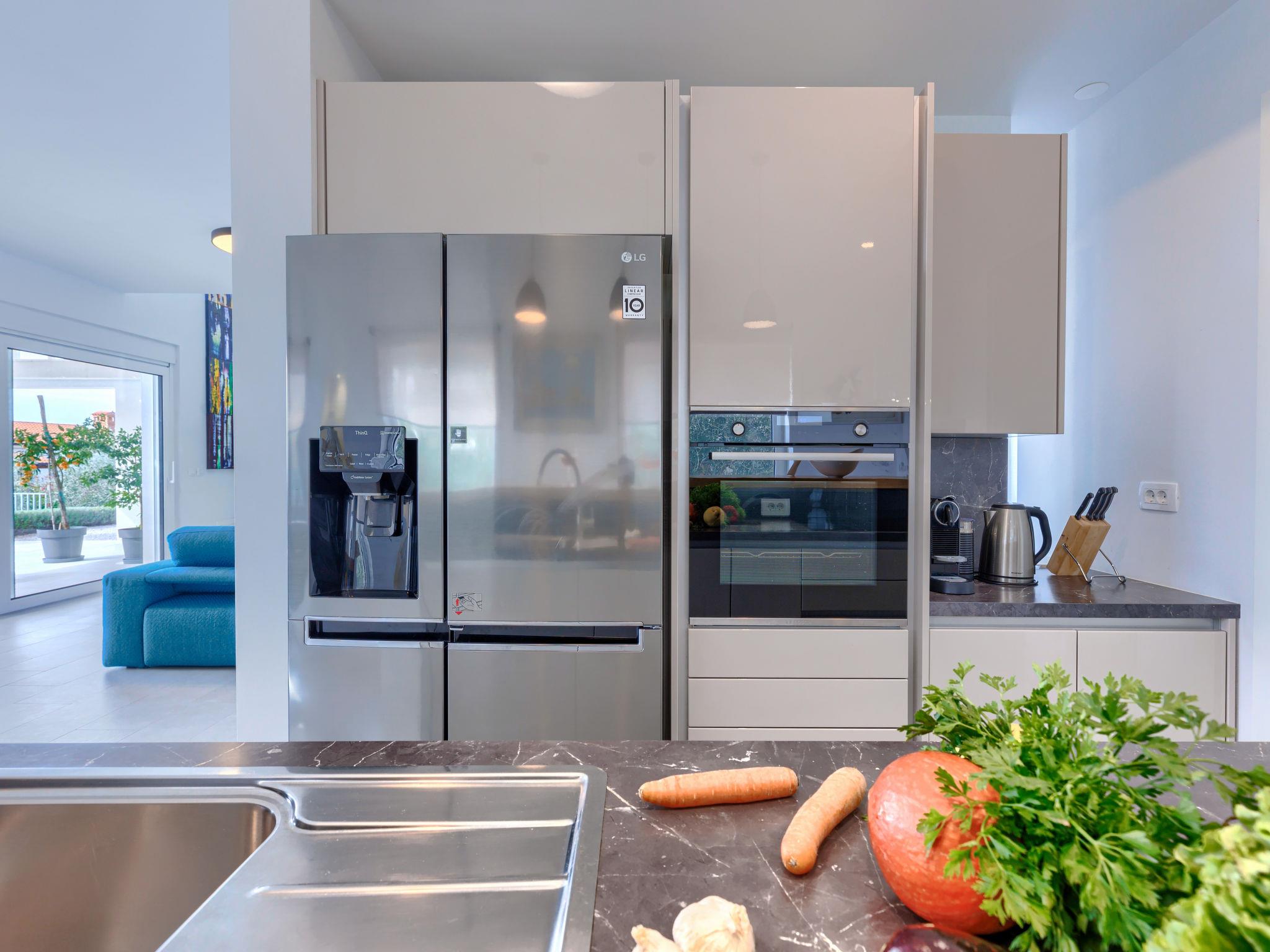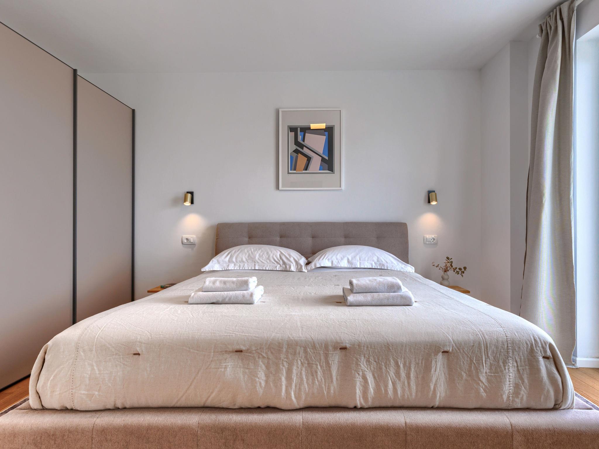 6-room villa 300 m2 on 3 levels. Spacious, modern and stylish furnishings: living/dining room with satellite TV and air conditioning. Exit to the terrace, to the swimming pool. 1 room with 1 french bed (180 cm, length 200 cm), shower/WC, satellite TV and air conditioning. Open kitchen (oven, dishwasher, 5 induction hot plates, kettle, microwave, freezer, electric coffee machine). Sep. WC. On the lower ground floor: playroom. Upper floor: 2 rooms, each room with 1 french bed (180 cm, length 200 cm), shower/WC, satellite TV and air conditioning. Exit to the balcony. 1 room with 2 beds (90 cm, length 200 cm), shower/WC, satellite TV and air conditioning. Forced-air heating. Balcony 6 m2, balcony 15 m2. Electric barbecue, deck chairs. View of the sea. Facilities: safe, iron, children's high chair, baby cot, hair dryer. Internet (WiFi, free). Maximum 1 pet/ dog allowed. The house is decorated with sculptures by the owner of the house, who is a Croatian academic sculptor.