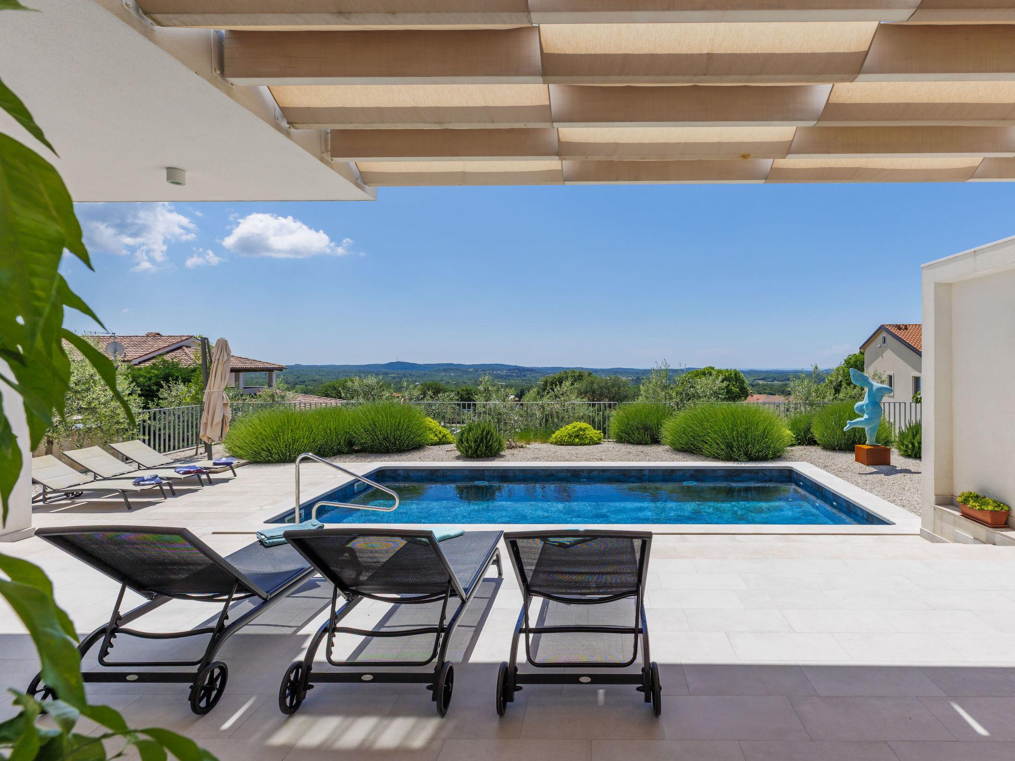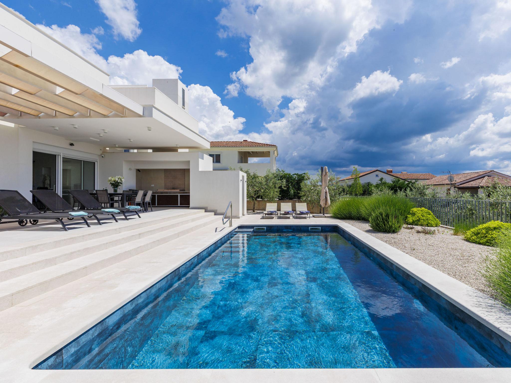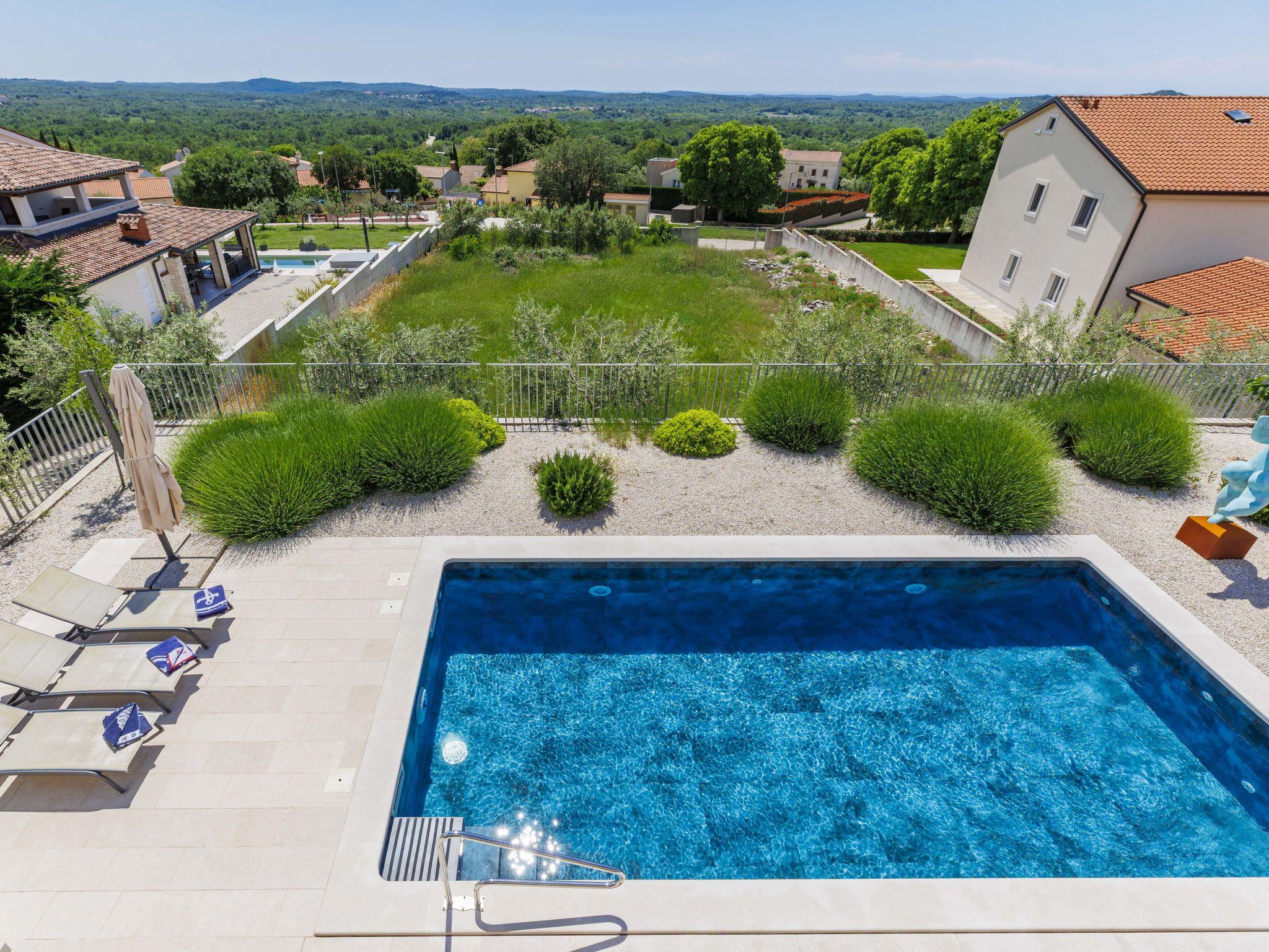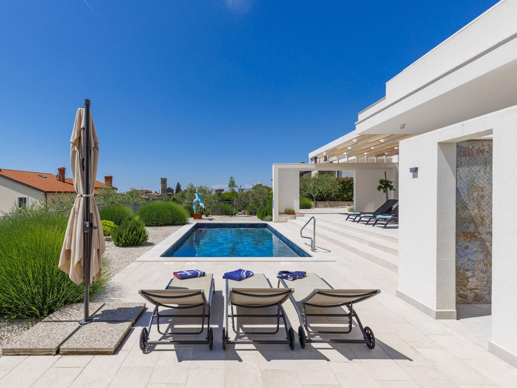 Sveti Lovrec 12 km from Porec: Luxurious villa "Aponia", 3 storeys. 400 m from the centre of Sveti Lovrec, in a sunny position, 8.5 km from the sea. Private: property 750 m2 (fenced) with wildlife garden, swimming pool angular (4 x 8 m, depth 140 cm, seasonal availability: 01.May. - 31.Oct.) with internal staircase. Outdoor shower, terrace (15 m2), garden furniture. In the house: internet access, billiard table, table football, washing machine, tumble dryer. Parking (for 4 cars) at the house on the premises. Shop 500 m, supermarket 12 km, restaurant 300 m, bus stop 500 m, pebble beach 12 km, rocky beach 12 km. Tennis 12 km, walking paths from the house 100 m, cycle lane 150 m. Nearby attractions: Aquapark 12 km. Please note: airfield 40 km from the property. Swimming pool with counterflow.