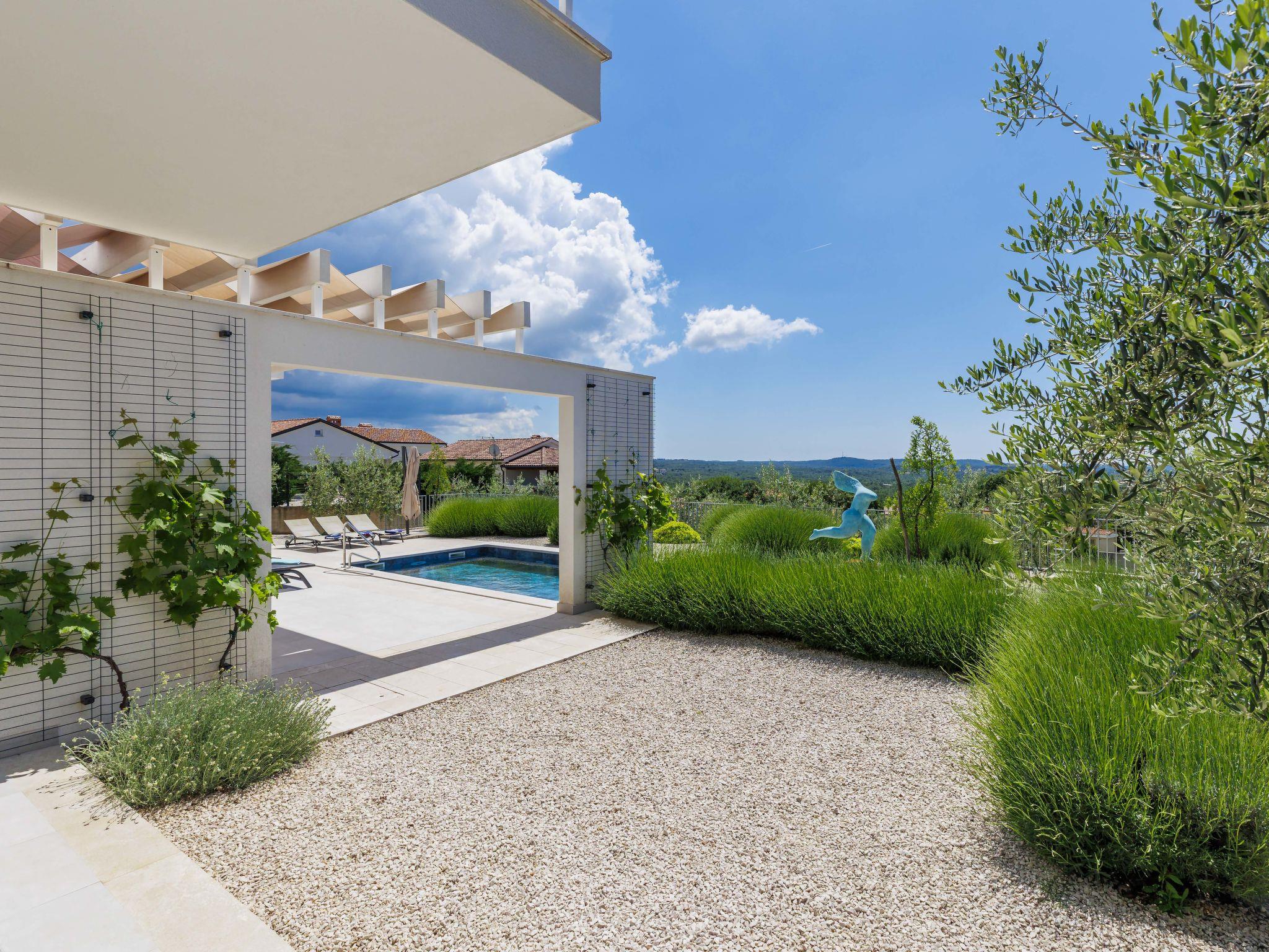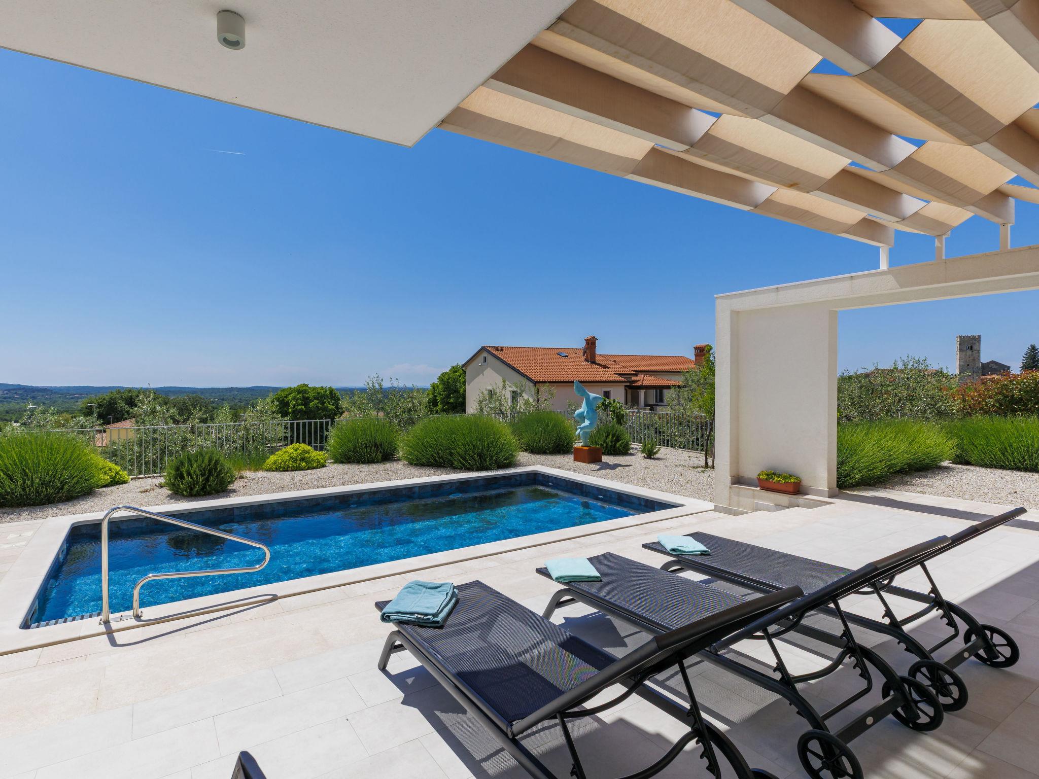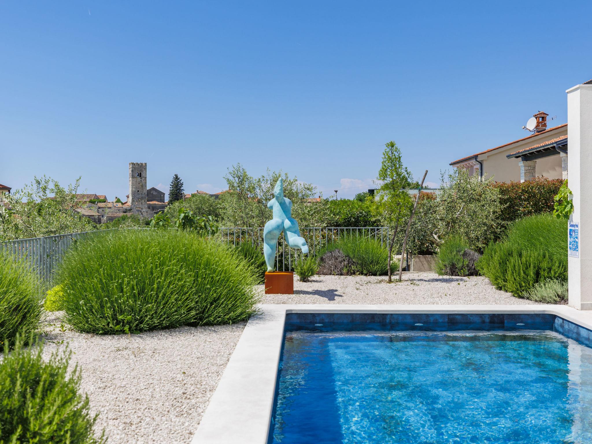 Sveti Lovrec 12 km from Porec: Luxurious villa "Aponia", 3 storeys. 400 m from the centre of Sveti Lovrec, in a sunny position, 8.5 km from the sea. Private: property 750 m2 (fenced) with wildlife garden, swimming pool angular (4 x 8 m, depth 140 cm, seasonal availability: 01.May. - 31.Oct.) with internal staircase. Outdoor shower, terrace (15 m2), garden furniture. In the house: internet access, billiard table, table football, washing machine, tumble dryer. Parking (for 4 cars) at the house on the premises. Shop 500 m, supermarket 12 km, restaurant 300 m, bus stop 500 m, pebble beach 12 km, rocky beach 12 km. Tennis 12 km, walking paths from the house 100 m, cycle lane 150 m. Nearby attractions: Aquapark 12 km. Please note: airfield 40 km from the property. Swimming pool with counterflow.
