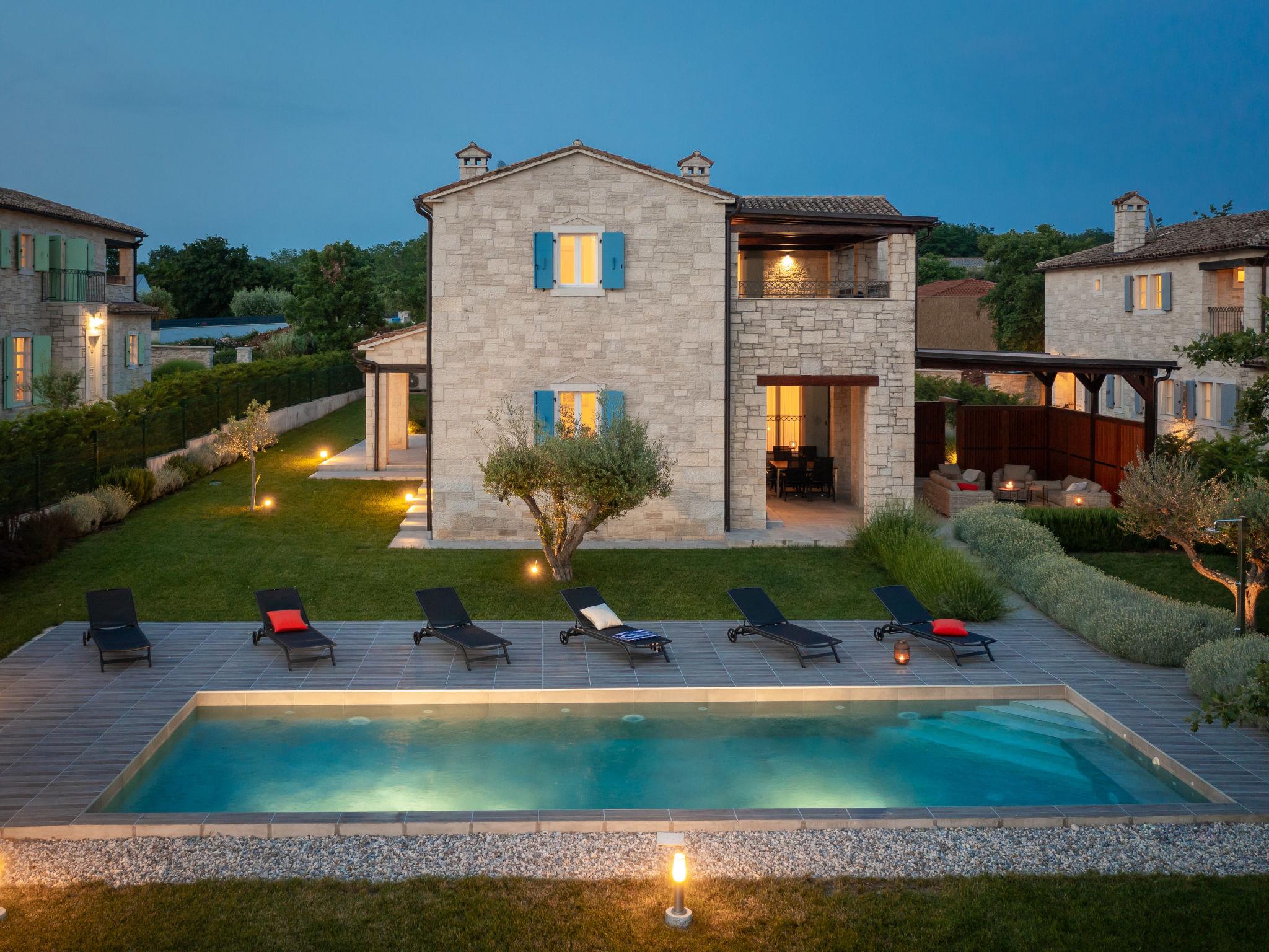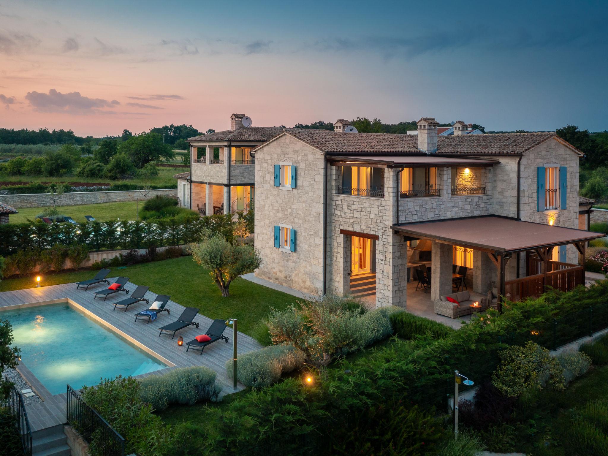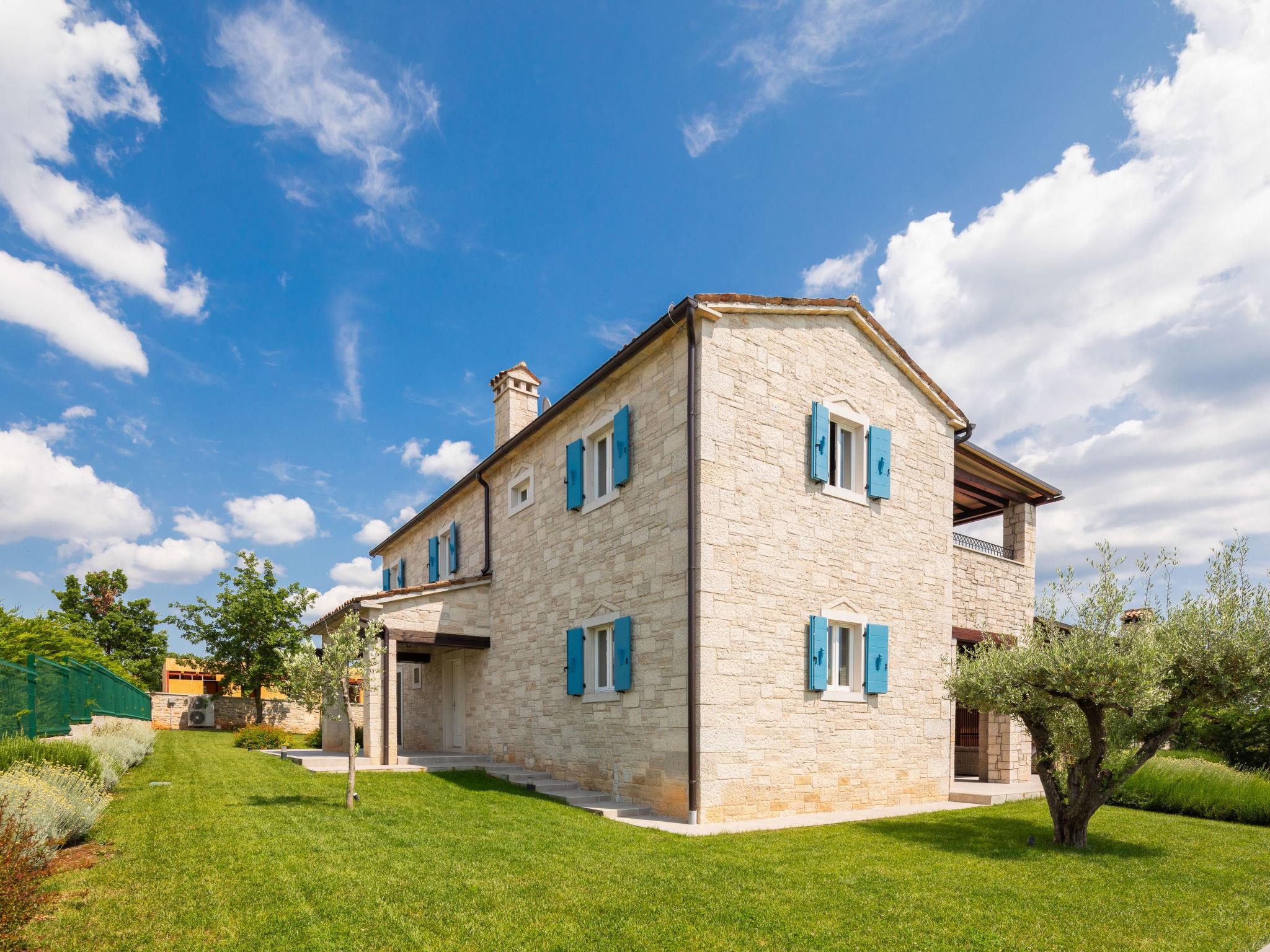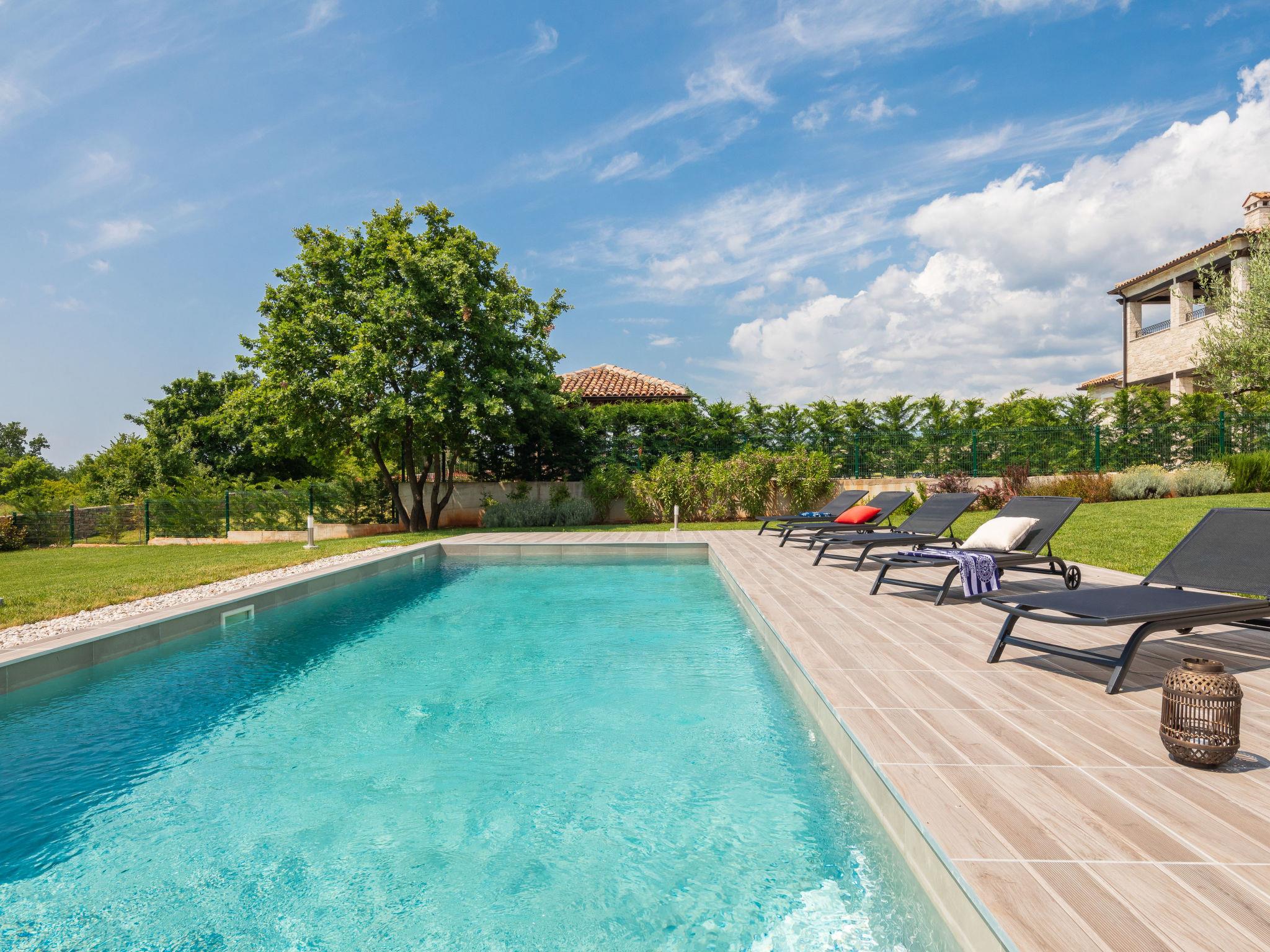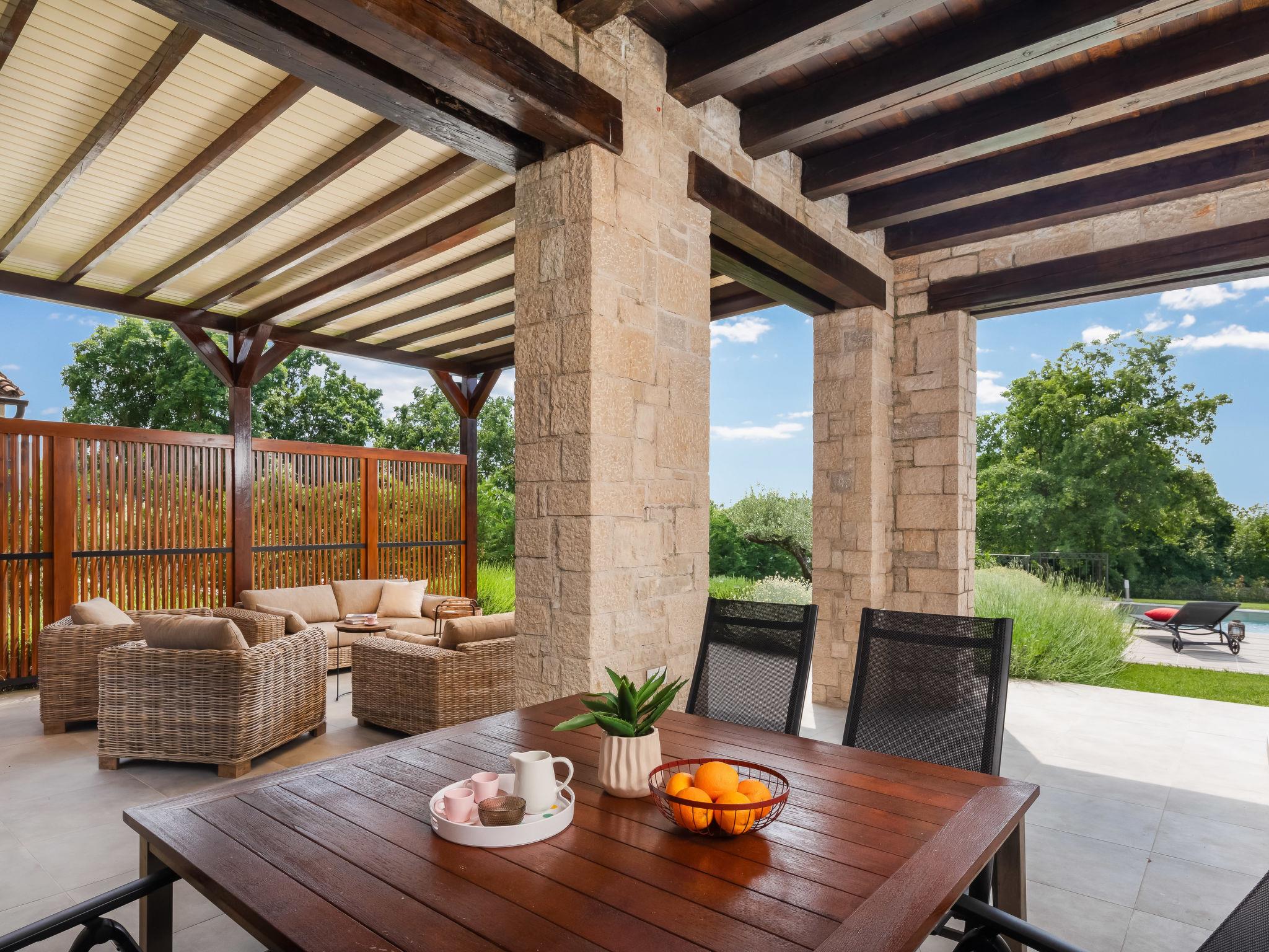 Sv. Lovrec 12 km from Porec: Beautiful house "Villa Grando II", 2 storeys. In the hamlet Mofardini 4.4 km from the centre of Sv. Lovrec, in a sunny position, 20 km from the sea. Private: property 1'400 m2 (fenced) with lawn, swimming pool angular, heated (40 m2, depth 160 cm, seasonal availability: 01.May. - 01.Nov.) with internal staircase. Outdoor shower, terrace (20 m2), garden furniture, barbecue. In the house: internet access, washing machine. Parking (for 2 cars) at the house on the premises. Shop 3.5 km, supermarket 3.5 km, restaurant 2 km, bus stop 300 m, pebble beach 20 km. Please note: airfield 45 km from the property. Swimming pool heated (extra).