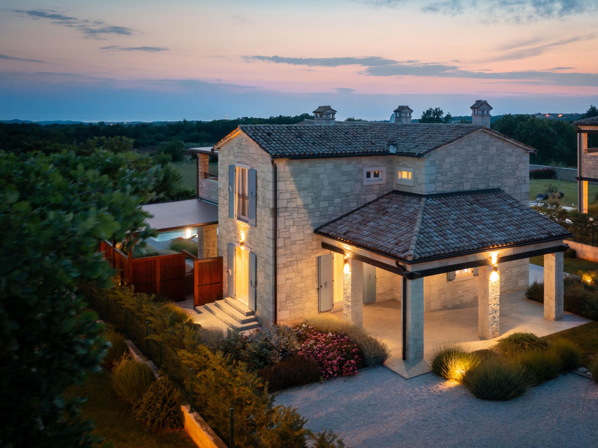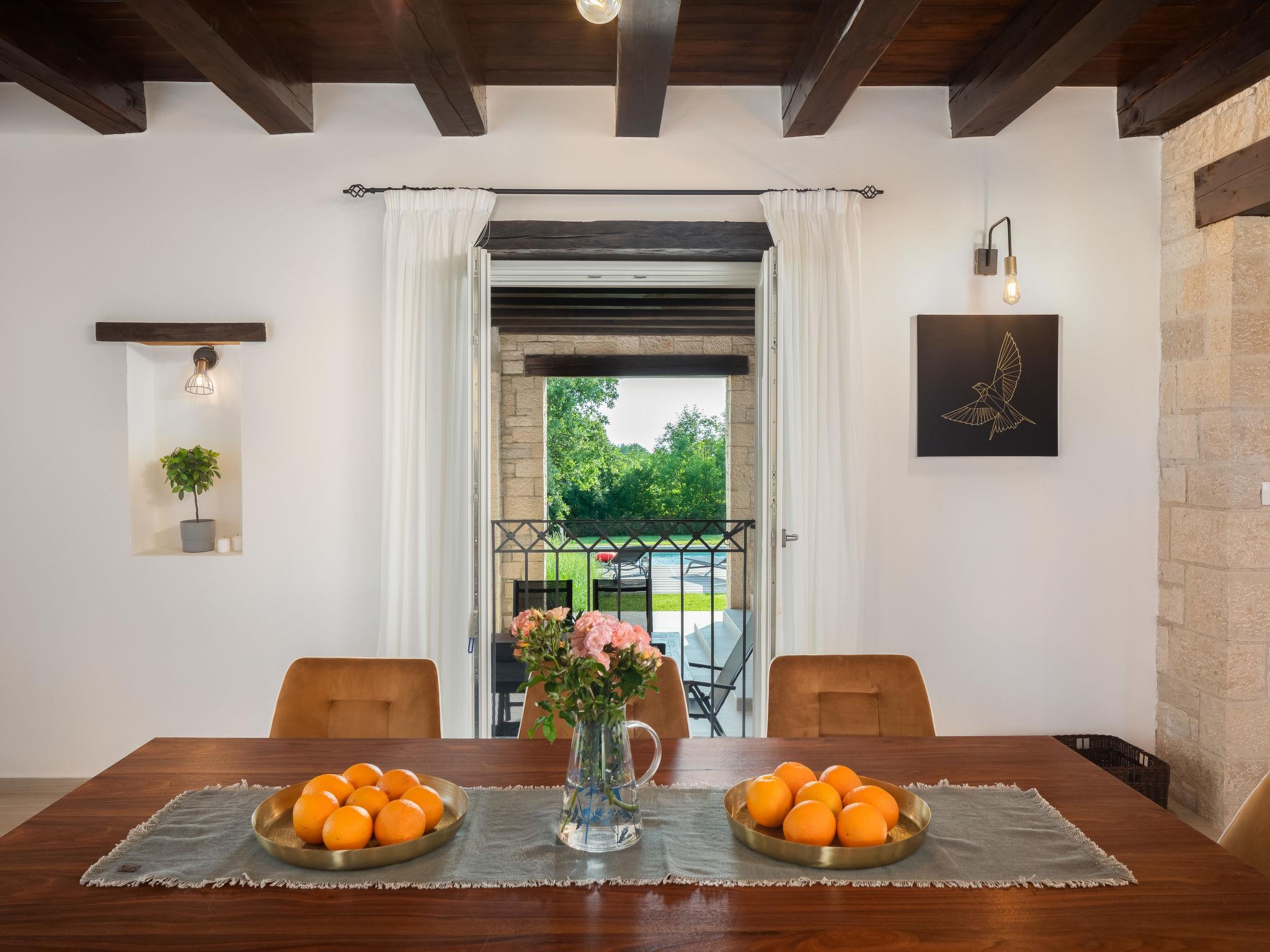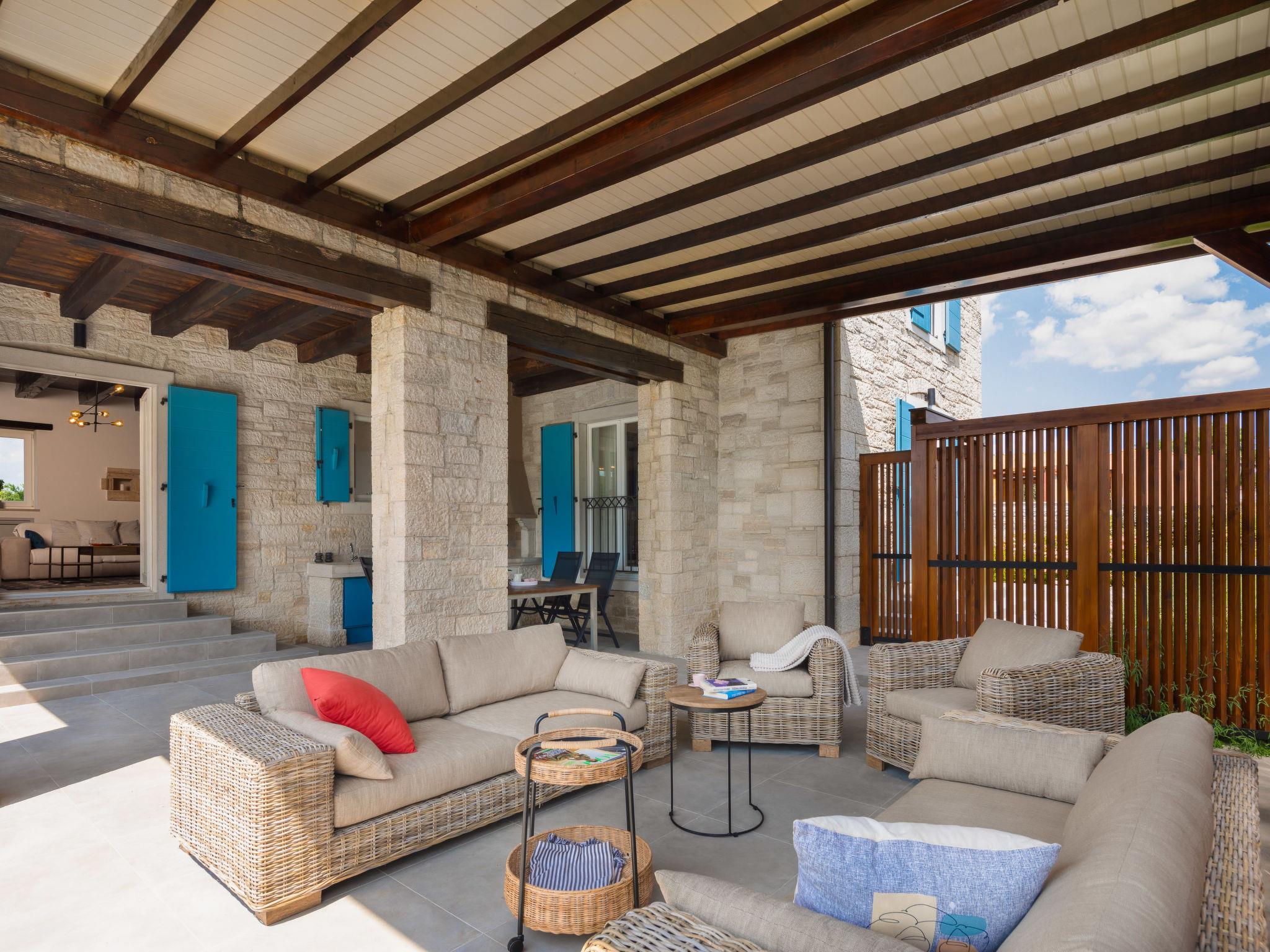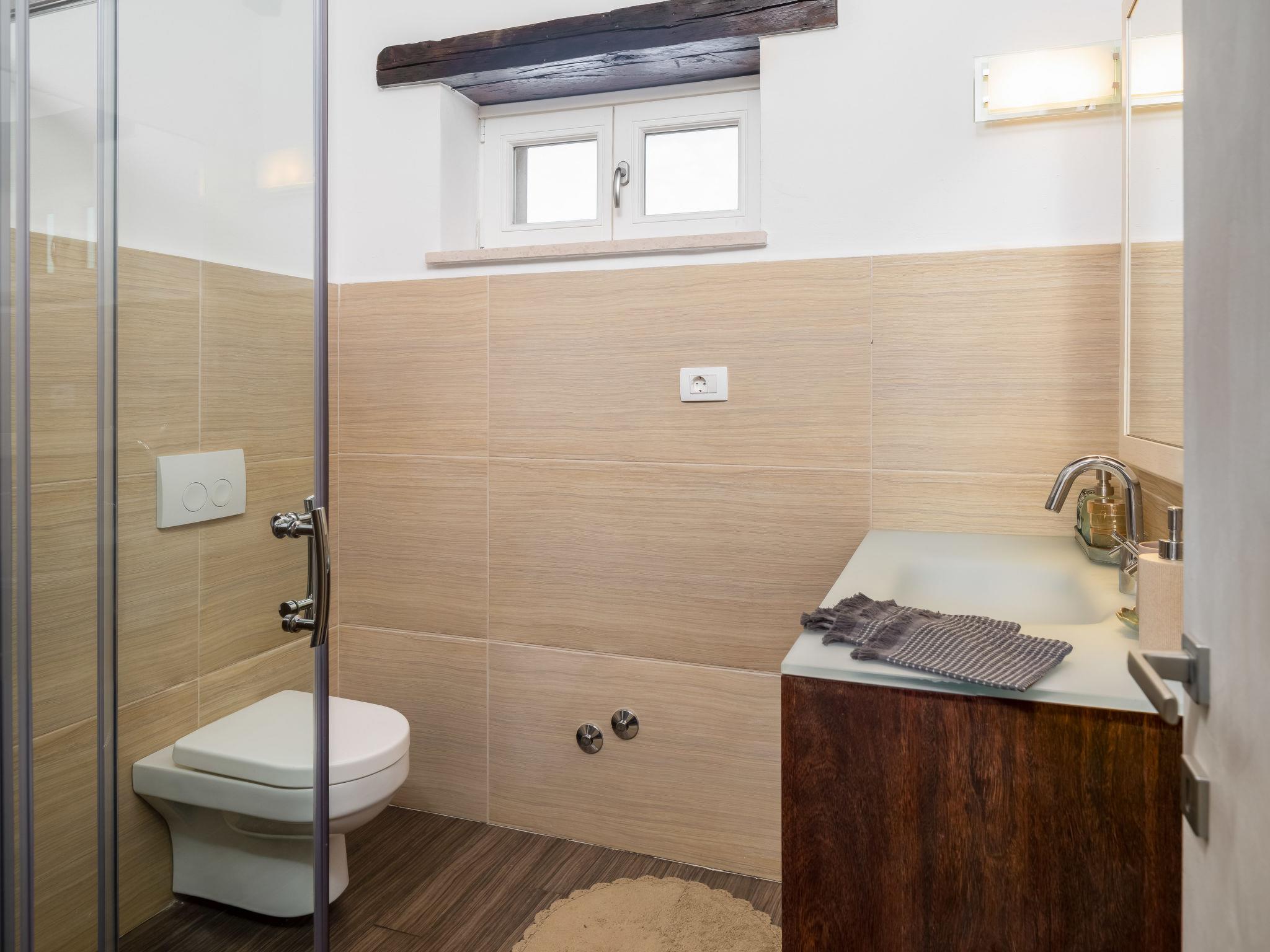Sv. Lovrec 12 km from Porec: Beautiful house "Villa Grando II", 2 storeys. In the hamlet Mofardini 4.4 km from the centre of Sv. Lovrec, in a sunny position, 20 km from the sea. Private: property 1'400 m2 (fenced) with lawn, swimming pool angular, heated (40 m2, depth 160 cm, seasonal availability: 01.May. - 01.Nov.) with internal staircase. Outdoor shower, terrace (20 m2), garden furniture, barbecue. In the house: internet access, washing machine. Parking (for 2 cars) at the house on the premises. Shop 3.5 km, supermarket 3.5 km, restaurant 2 km, bus stop 300 m, pebble beach 20 km. Please note: airfield 45 km from the property. Swimming pool heated (extra).