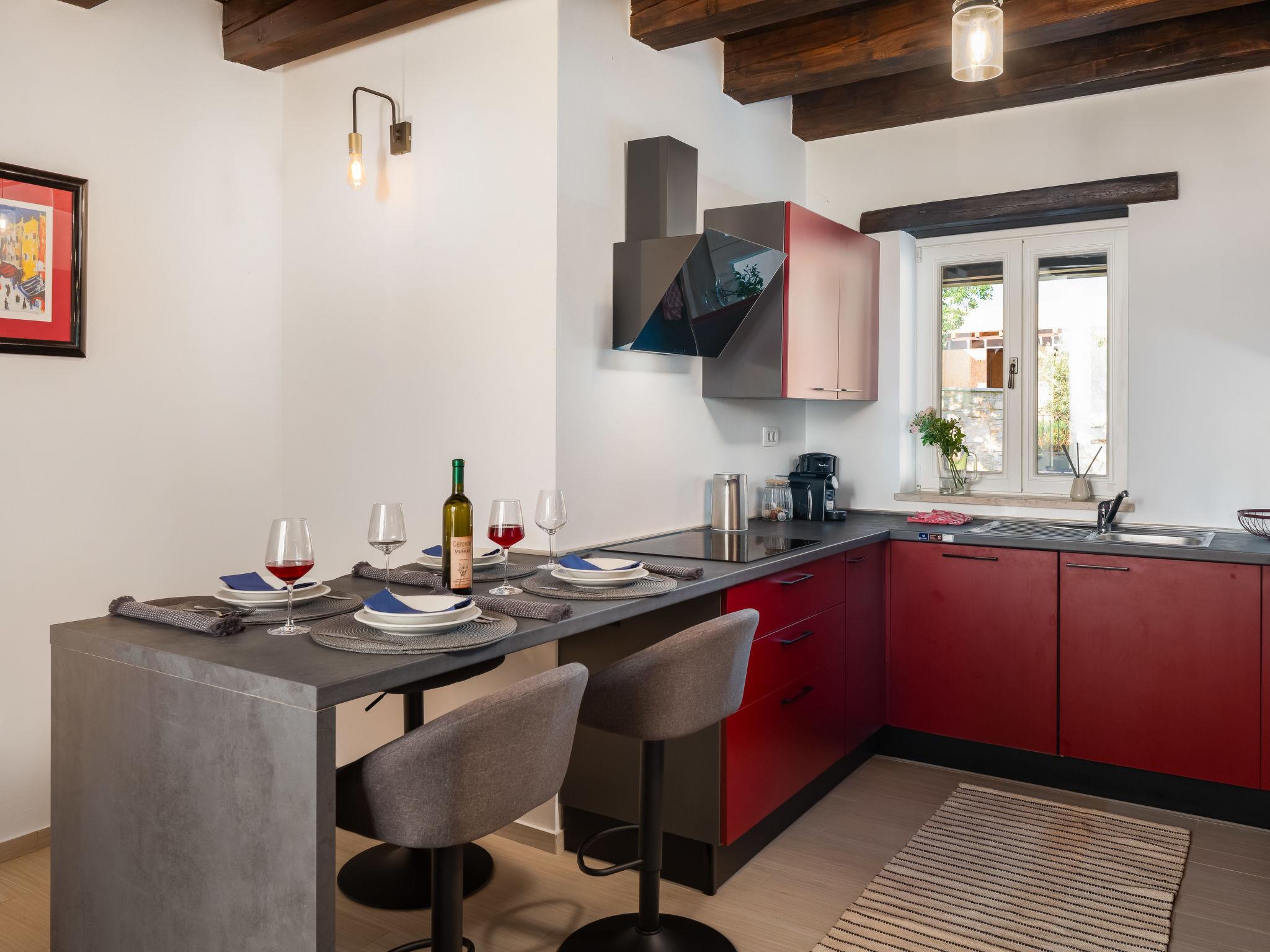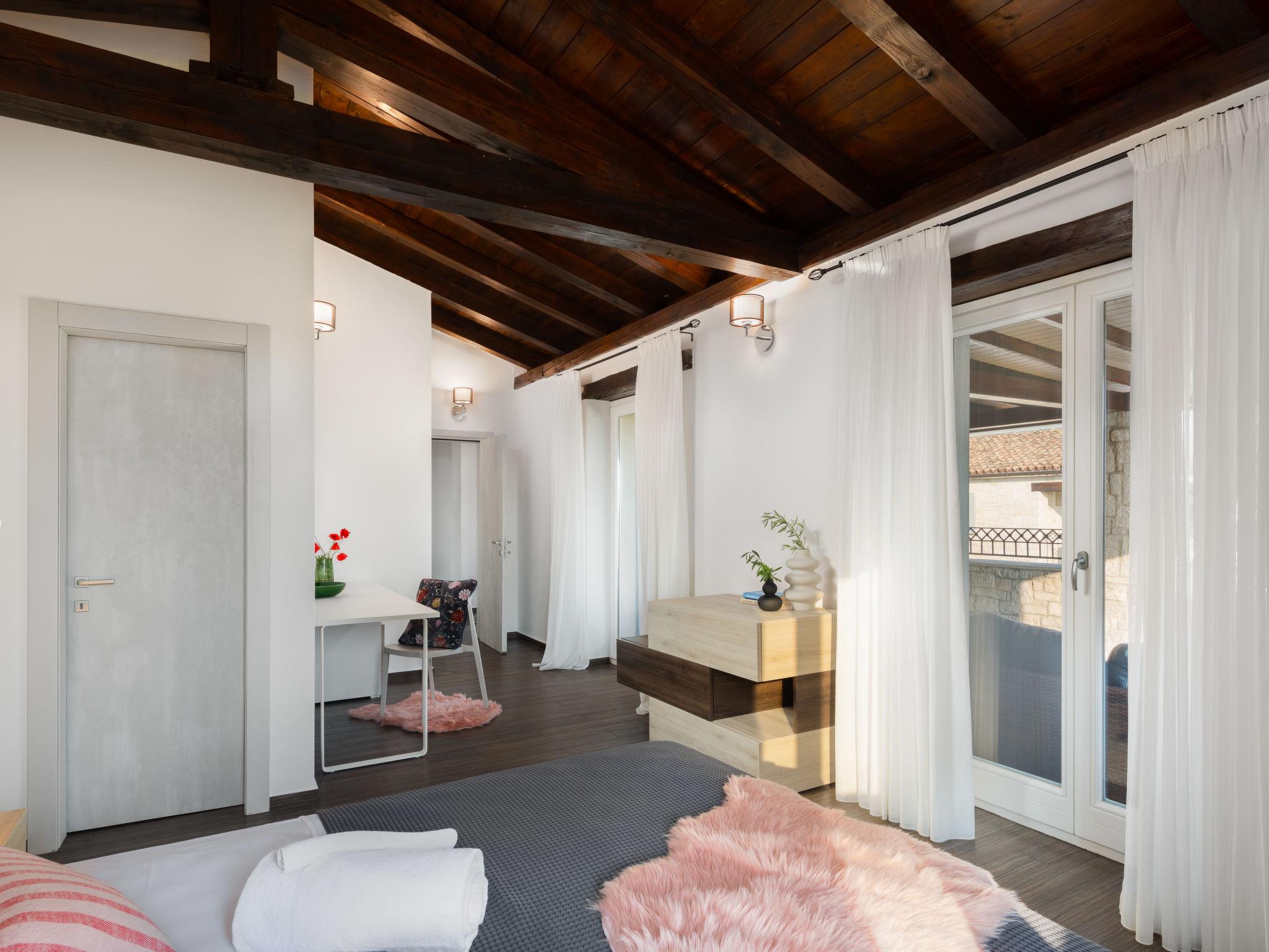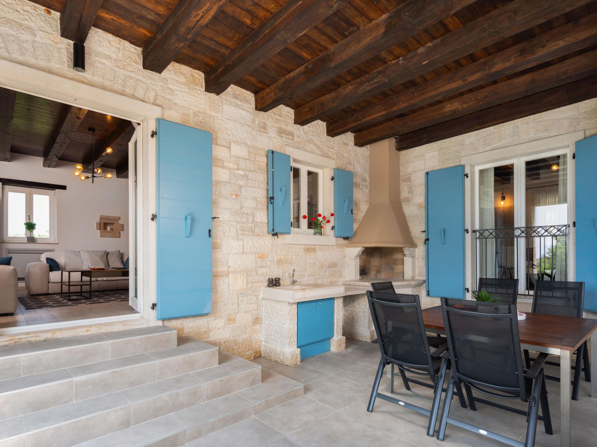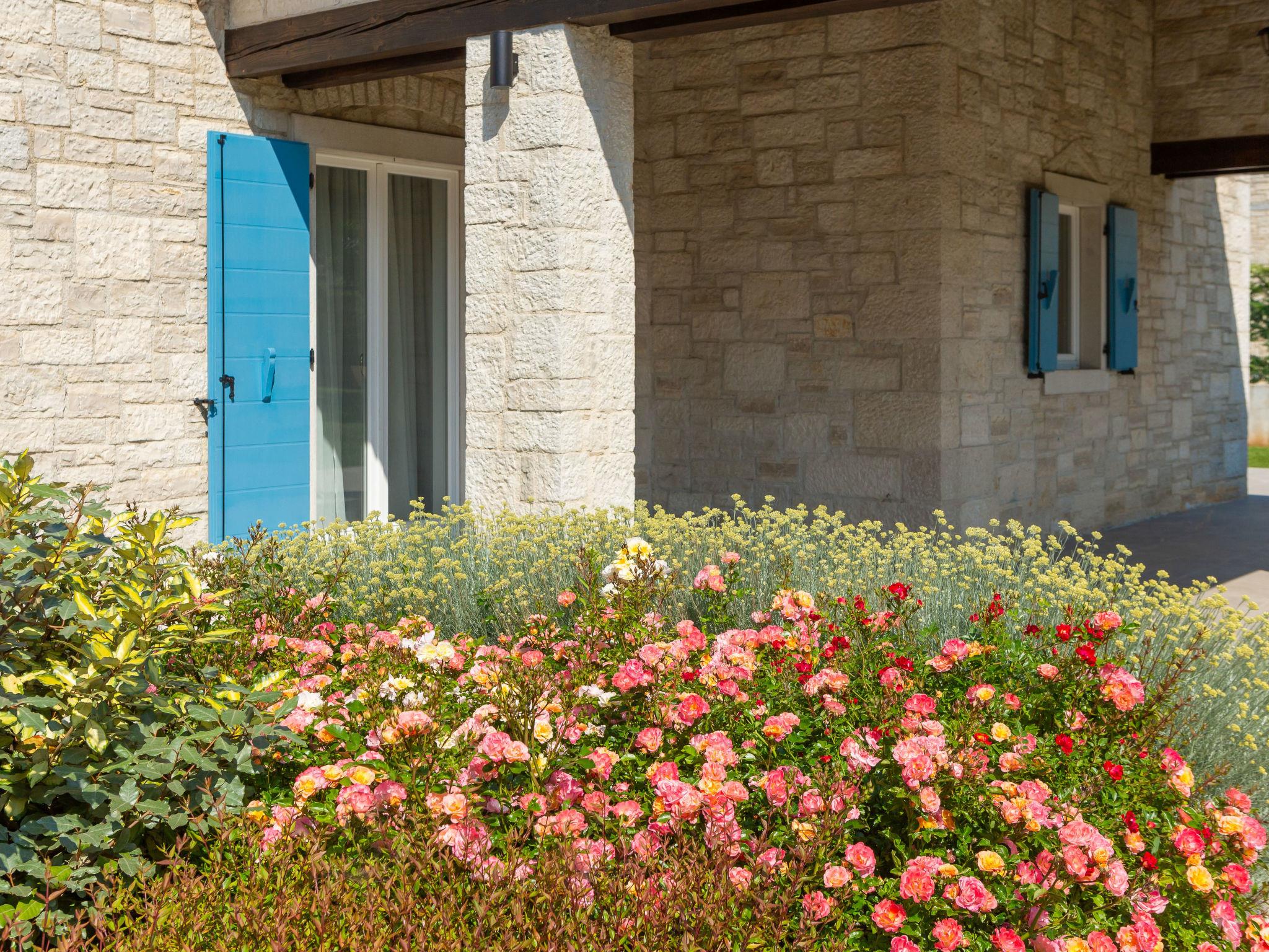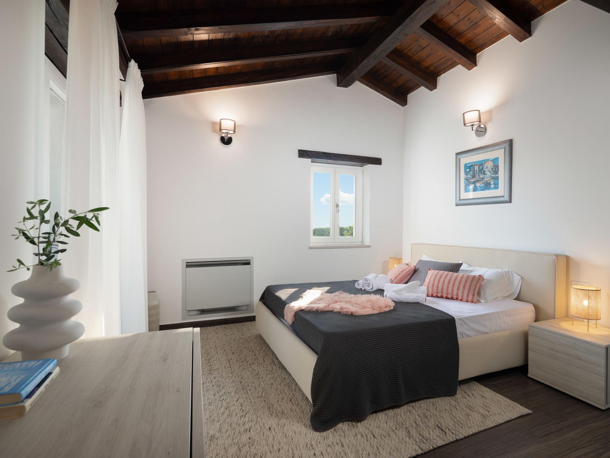 Sv. Lovrec 12 km from Porec: Beautiful house "Villa Grando II", 2 storeys. In the hamlet Mofardini 4.4 km from the centre of Sv. Lovrec, in a sunny position, 20 km from the sea. Private: property 1'400 m2 (fenced) with lawn, swimming pool angular, heated (40 m2, depth 160 cm, seasonal availability: 01.May. - 01.Nov.) with internal staircase. Outdoor shower, terrace (20 m2), garden furniture, barbecue. In the house: internet access, washing machine. Parking (for 2 cars) at the house on the premises. Shop 3.5 km, supermarket 3.5 km, restaurant 2 km, bus stop 300 m, pebble beach 20 km. Please note: airfield 45 km from the property. Swimming pool heated (extra).