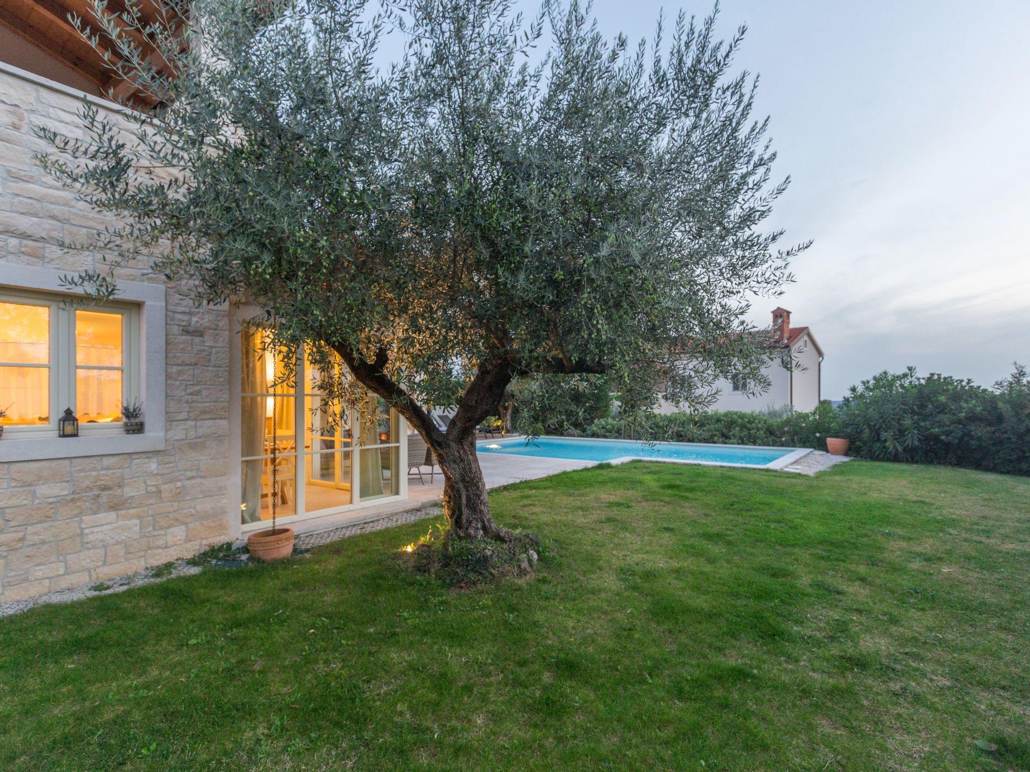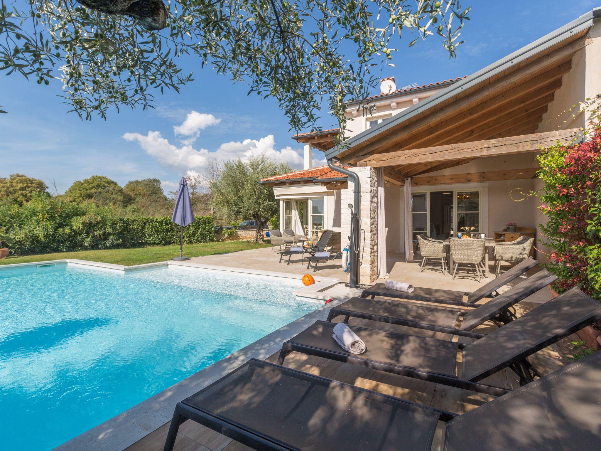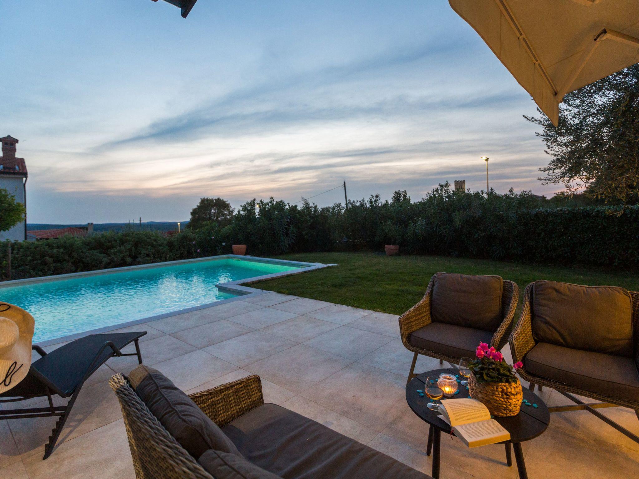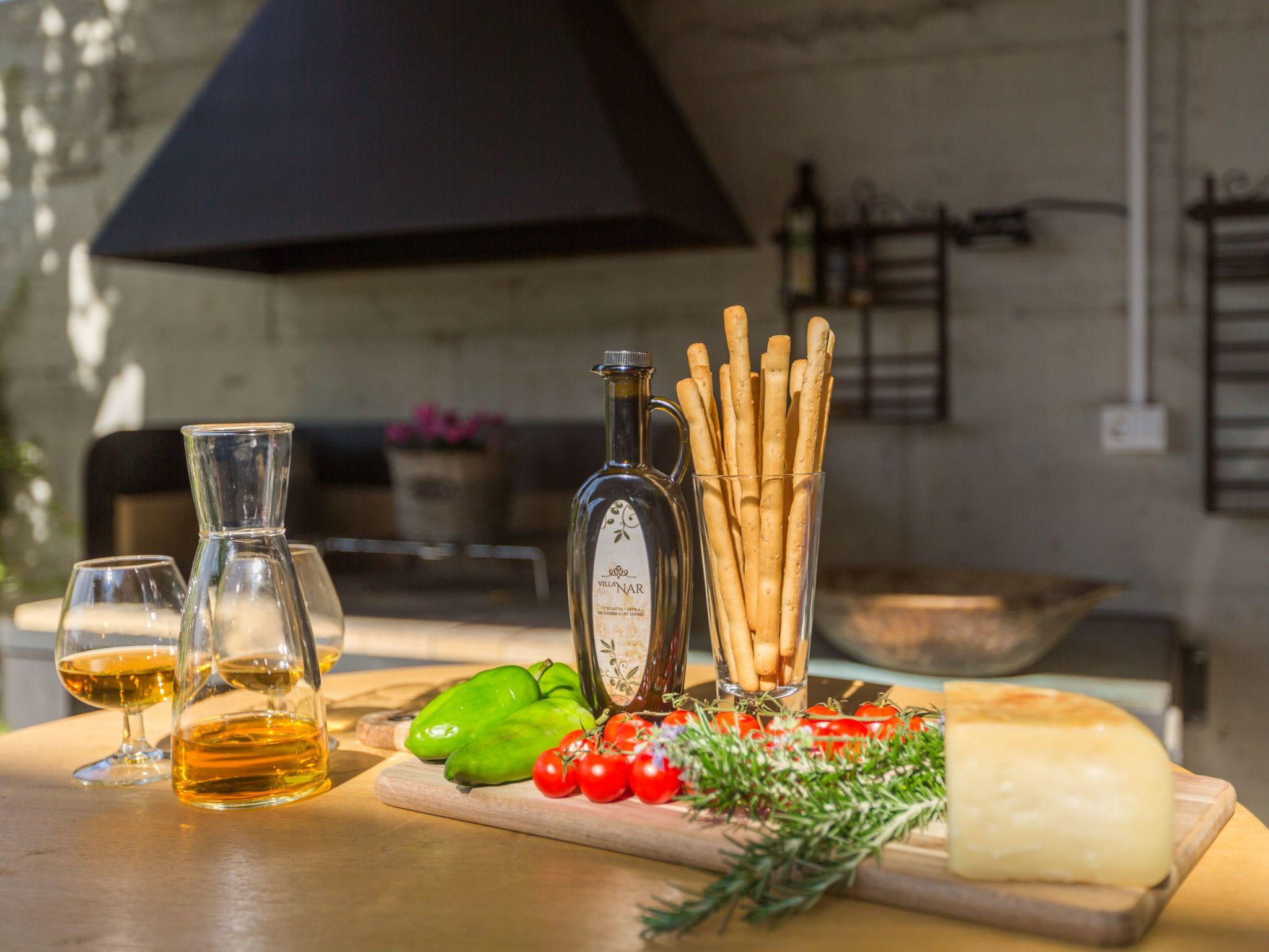 Villa Nar is a newly built villa in an elevated position with a wonderful panoramic view of the west coast of Istria and the sea, located on the outskirts of the picturesque village of Sveti Lovrec, 15 km from Porec and 20 km from Rovinj. On its own fenced plot of 250 sqm with manicured lawn it offers guests a pool of 40 sqm, spacious covered terrace with seating, barbecue, deck chairs, outdoor shower and parking.villa Nar for 6 people of 180 sqm on two floors is fully air-conditioned.on the ground floor there is a living room with seating and fireplace, satellite TV, dining room with dining table, fully equipped kitchen, here is also a double bedroom with shower / WC and a separate toilet.The ground floor has access to a large terrace with pool with a magnificent view of nature and the sea, as well as evening fairytale sunsets.on the first floor there are two bedrooms, both with private bathrooms and with exit to the shared balcony with seating and enchanting sea views.the pool is heated outside the summer season and table tennis and billiards are at your disposal.Villa Nar with pool for 6 people with panoramic sea views, as well as evening fairytale sunsets. Dogs are welcome.
