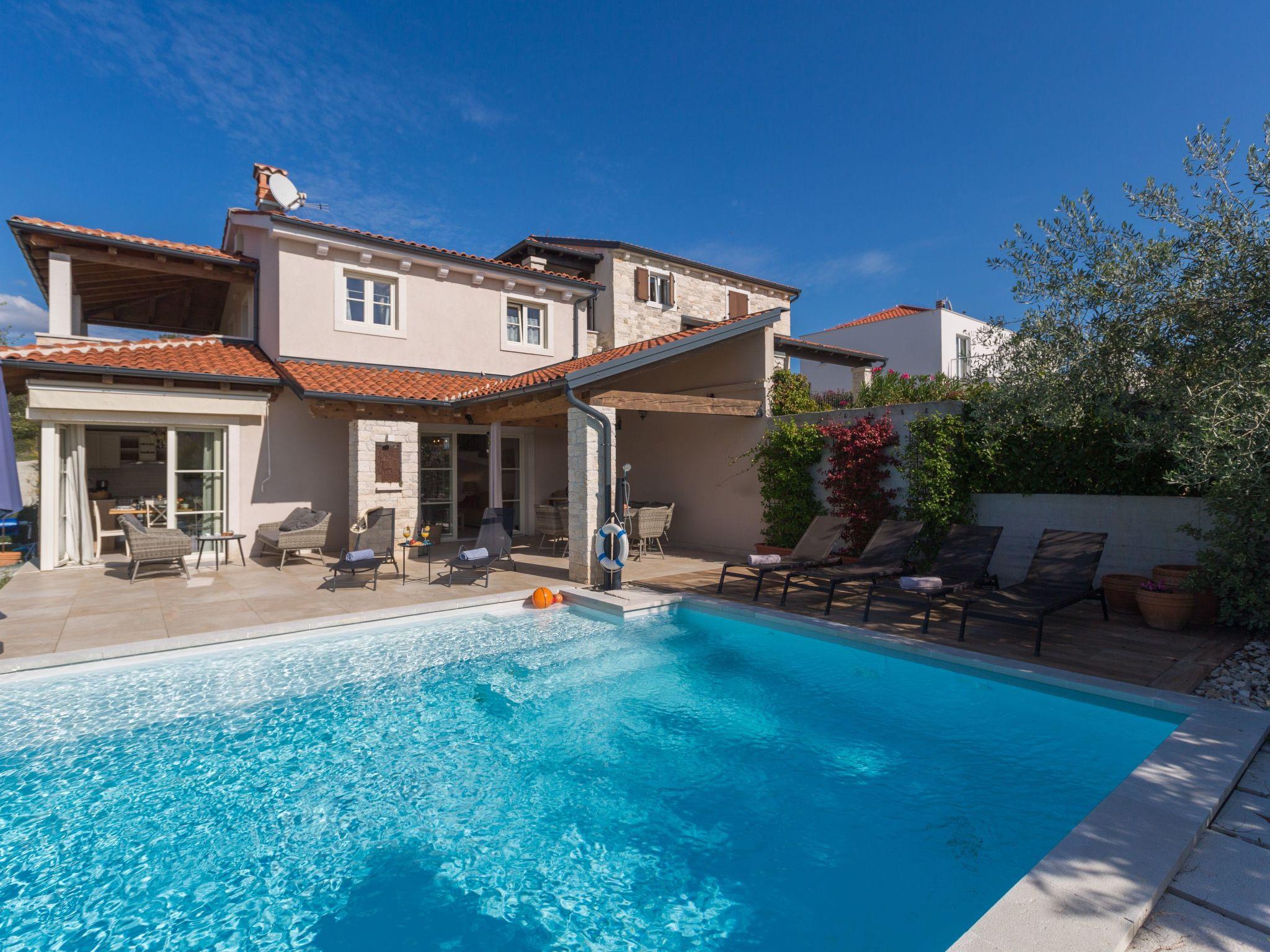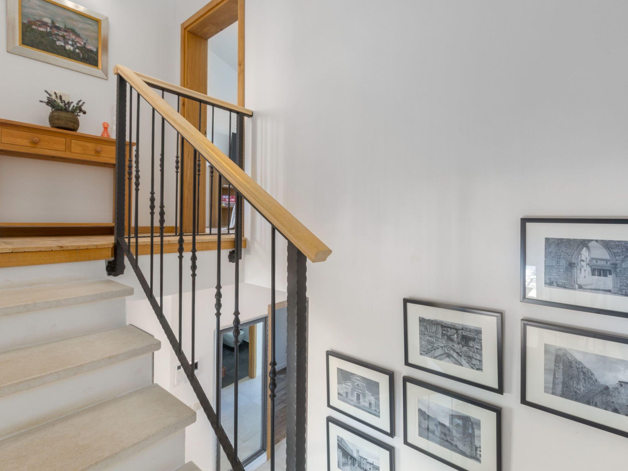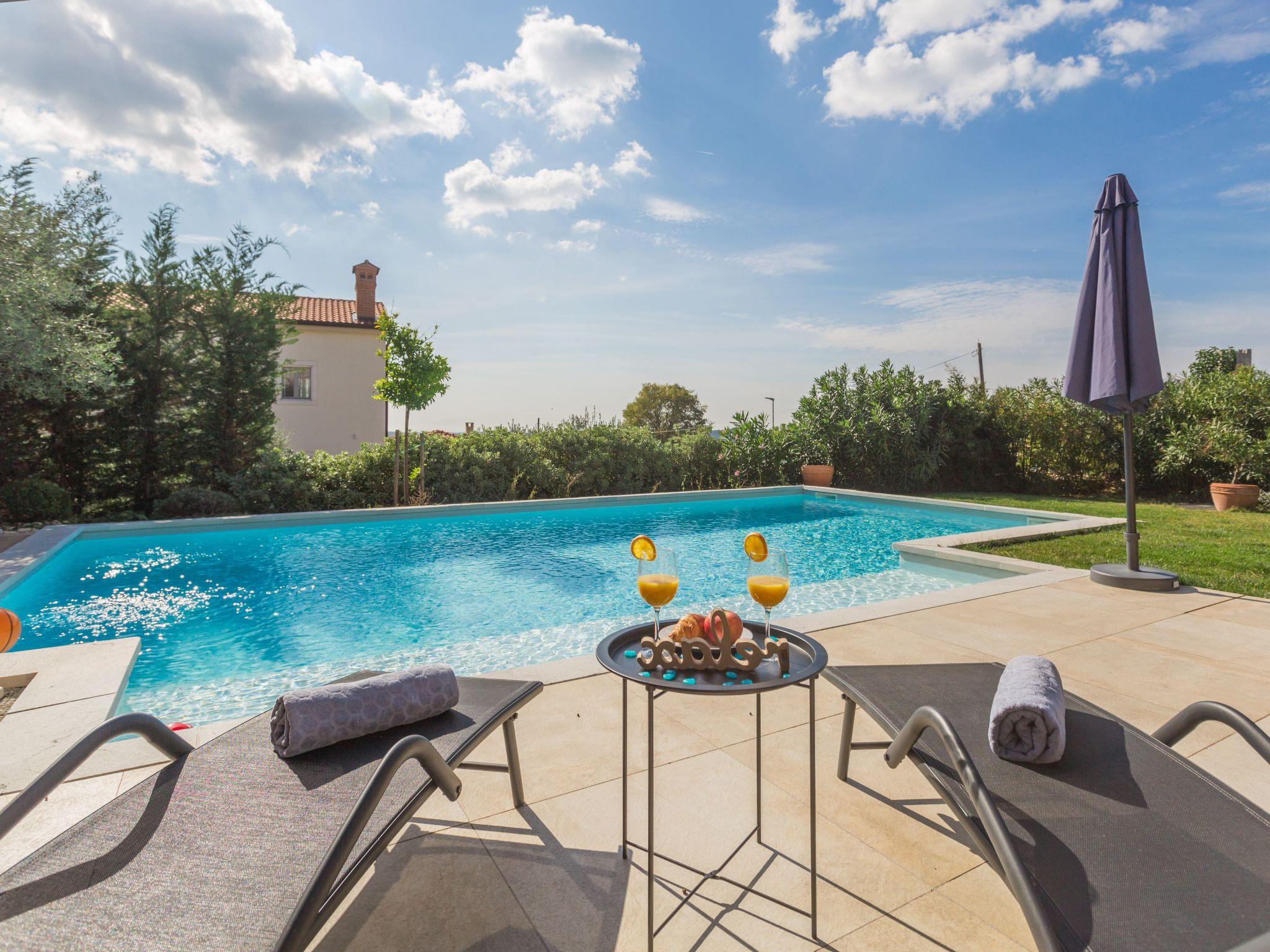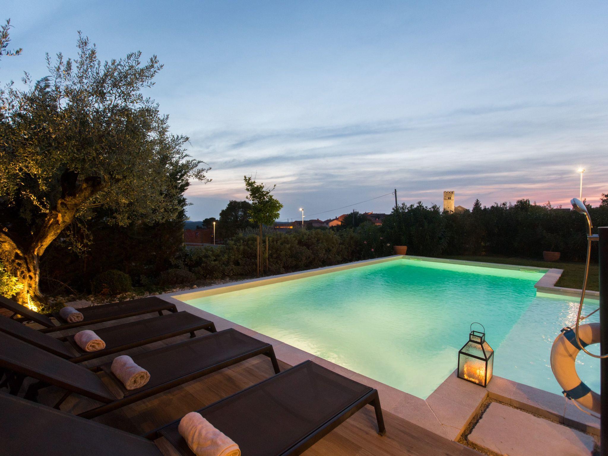 Villa Nar is a newly built villa in an elevated position with a wonderful panoramic view of the west coast of Istria and the sea, located on the outskirts of the picturesque village of Sveti Lovrec, 15 km from Porec and 20 km from Rovinj. On its own fenced plot of 250 sqm with manicured lawn it offers guests a pool of 40 sqm, spacious covered terrace with seating, barbecue, deck chairs, outdoor shower and parking.villa Nar for 6 people of 180 sqm on two floors is fully air-conditioned.on the ground floor there is a living room with seating and fireplace, satellite TV, dining room with dining table, fully equipped kitchen, here is also a double bedroom with shower / WC and a separate toilet.The ground floor has access to a large terrace with pool with a magnificent view of nature and the sea, as well as evening fairytale sunsets.on the first floor there are two bedrooms, both with private bathrooms and with exit to the shared balcony with seating and enchanting sea views.the pool is heated outside the summer season and table tennis and billiards are at your disposal.Villa Nar with pool for 6 people with panoramic sea views, as well as evening fairytale sunsets. Dogs are welcome.
