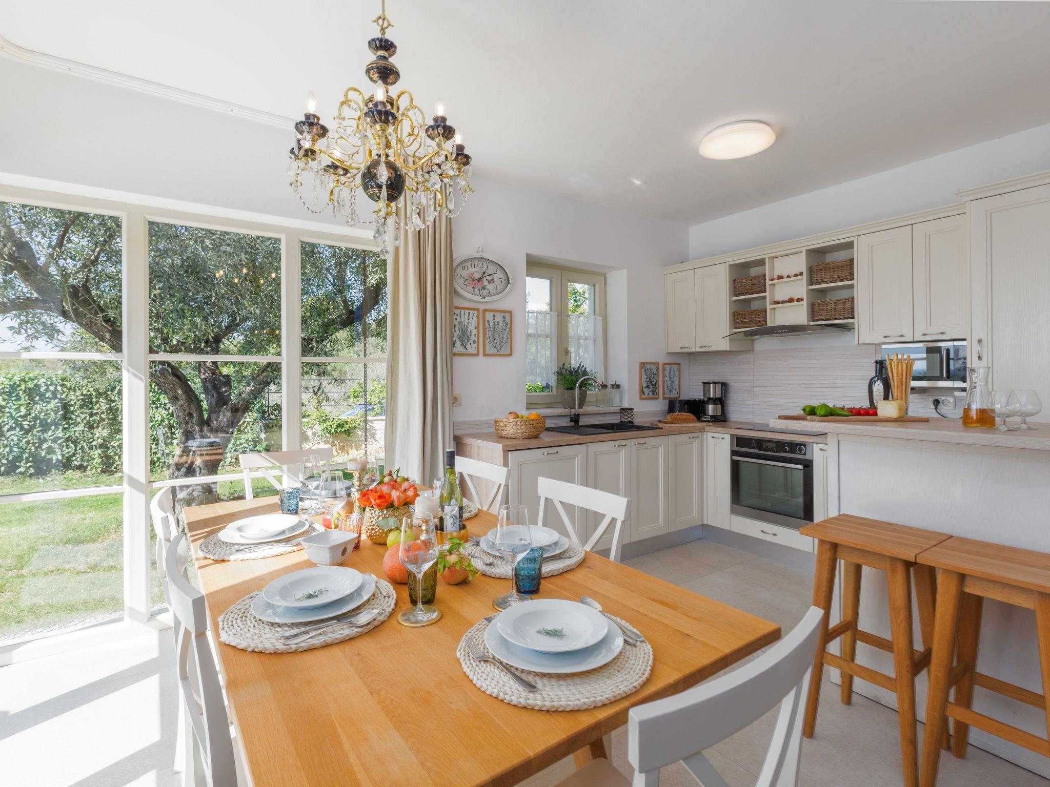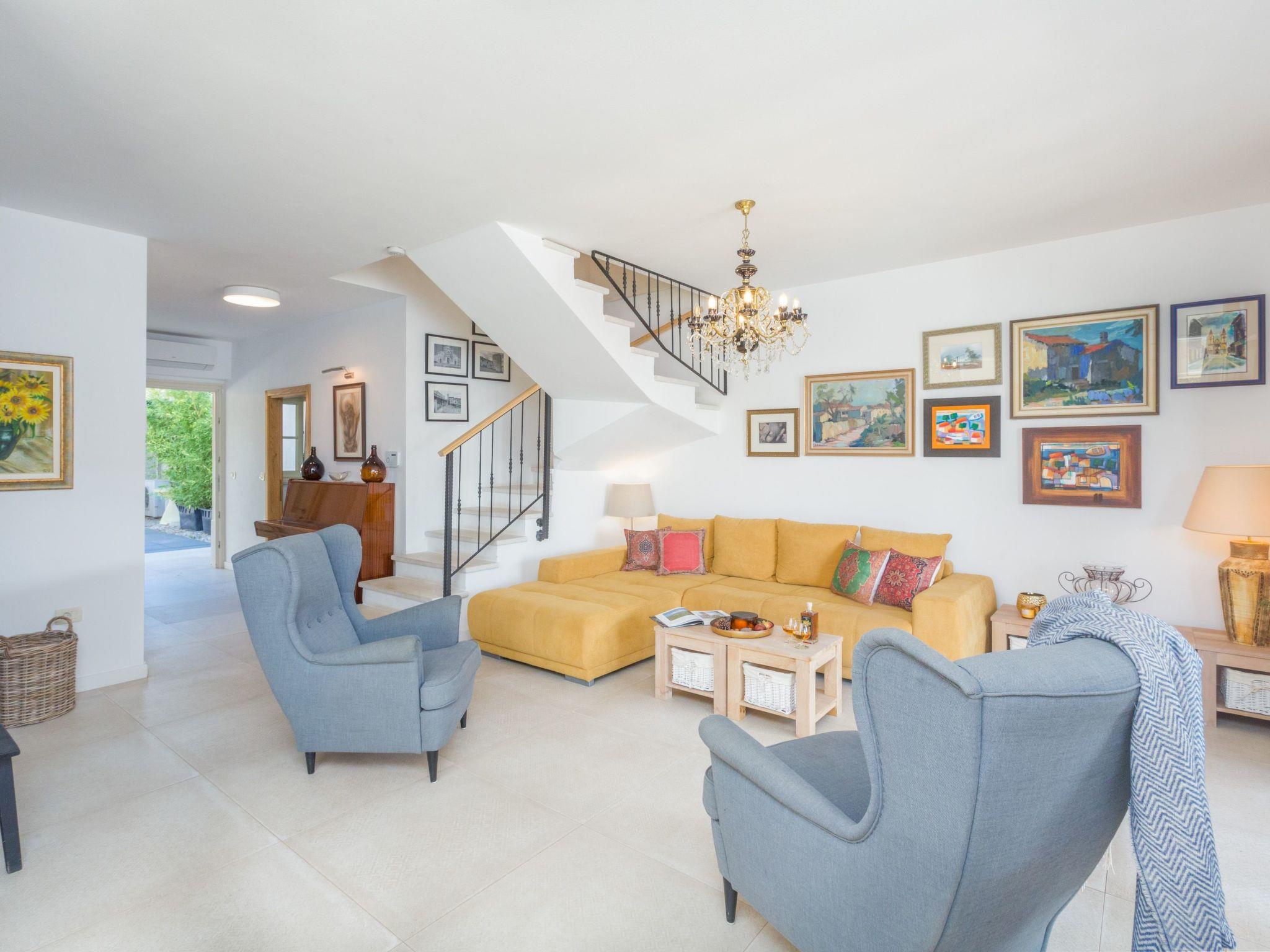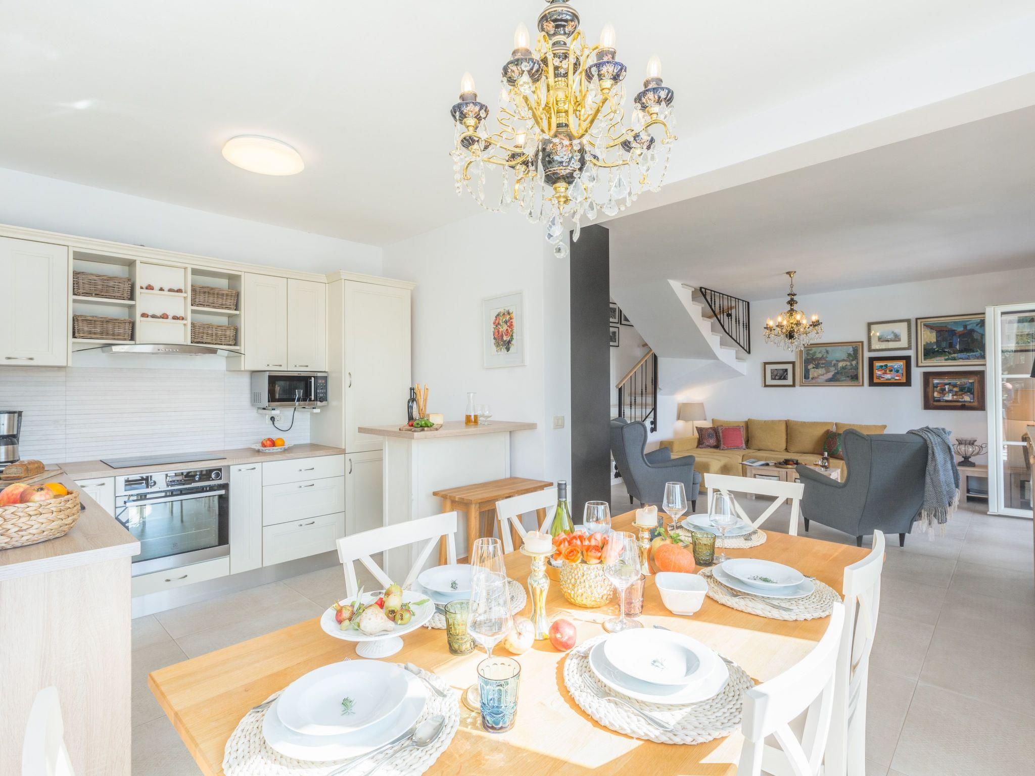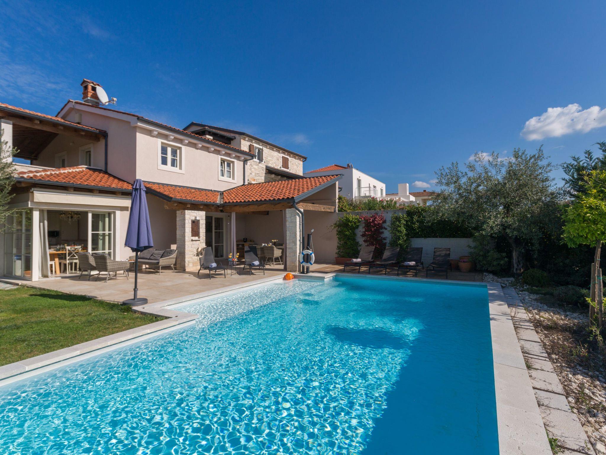 Villa Nar is a newly built villa in an elevated position with a wonderful panoramic view of the west coast of Istria and the sea, located on the outskirts of the picturesque village of Sveti Lovrec, 15 km from Porec and 20 km from Rovinj. On its own fenced plot of 250 sqm with manicured lawn it offers guests a pool of 40 sqm, spacious covered terrace with seating, barbecue, deck chairs, outdoor shower and parking.villa Nar for 6 people of 180 sqm on two floors is fully air-conditioned.on the ground floor there is a living room with seating and fireplace, satellite TV, dining room with dining table, fully equipped kitchen, here is also a double bedroom with shower / WC and a separate toilet.The ground floor has access to a large terrace with pool with a magnificent view of nature and the sea, as well as evening fairytale sunsets.on the first floor there are two bedrooms, both with private bathrooms and with exit to the shared balcony with seating and enchanting sea views.the pool is heated outside the summer season and table tennis and billiards are at your disposal.Villa Nar with pool for 6 people with panoramic sea views, as well as evening fairytale sunsets. Dogs are welcome.