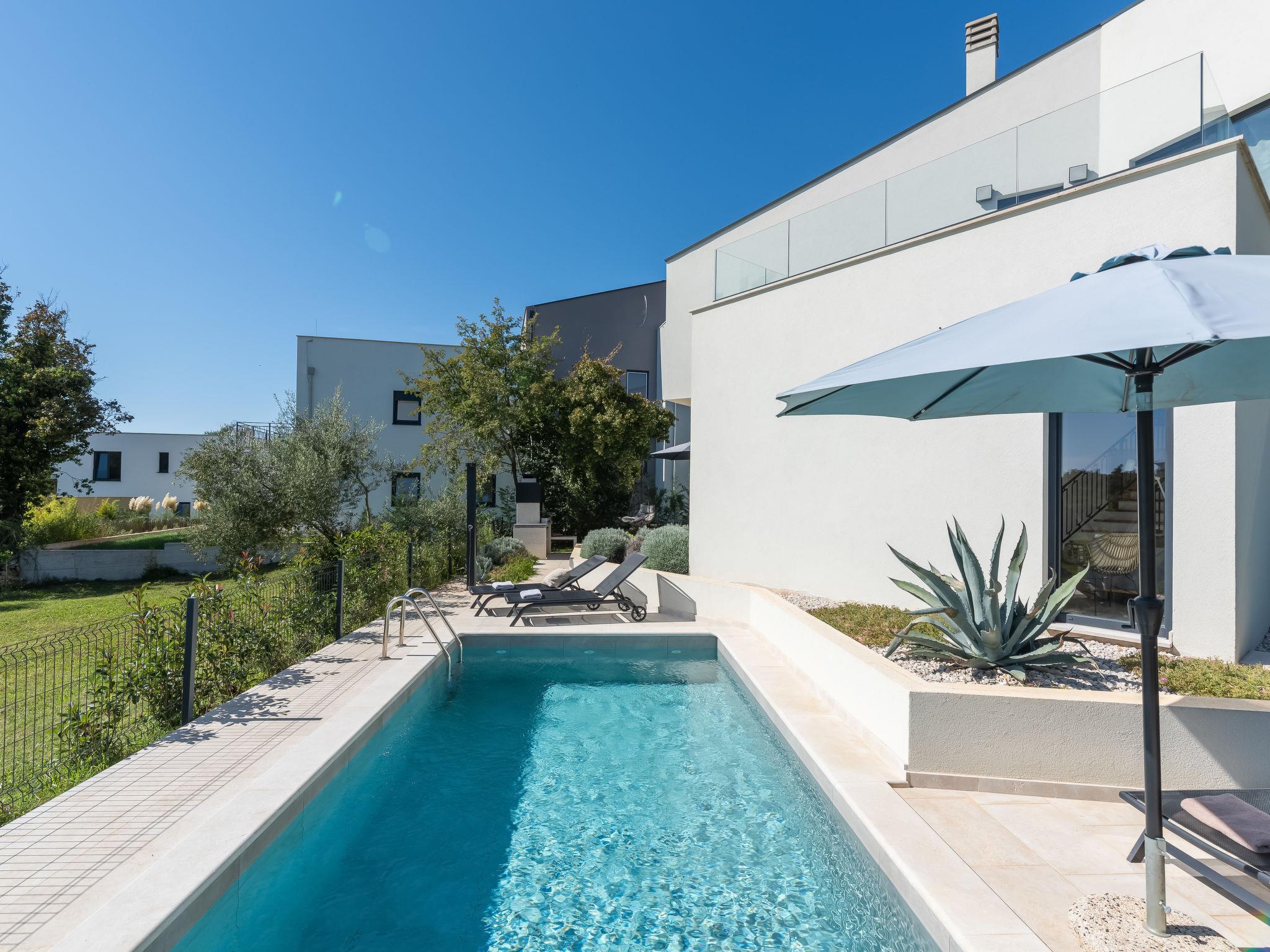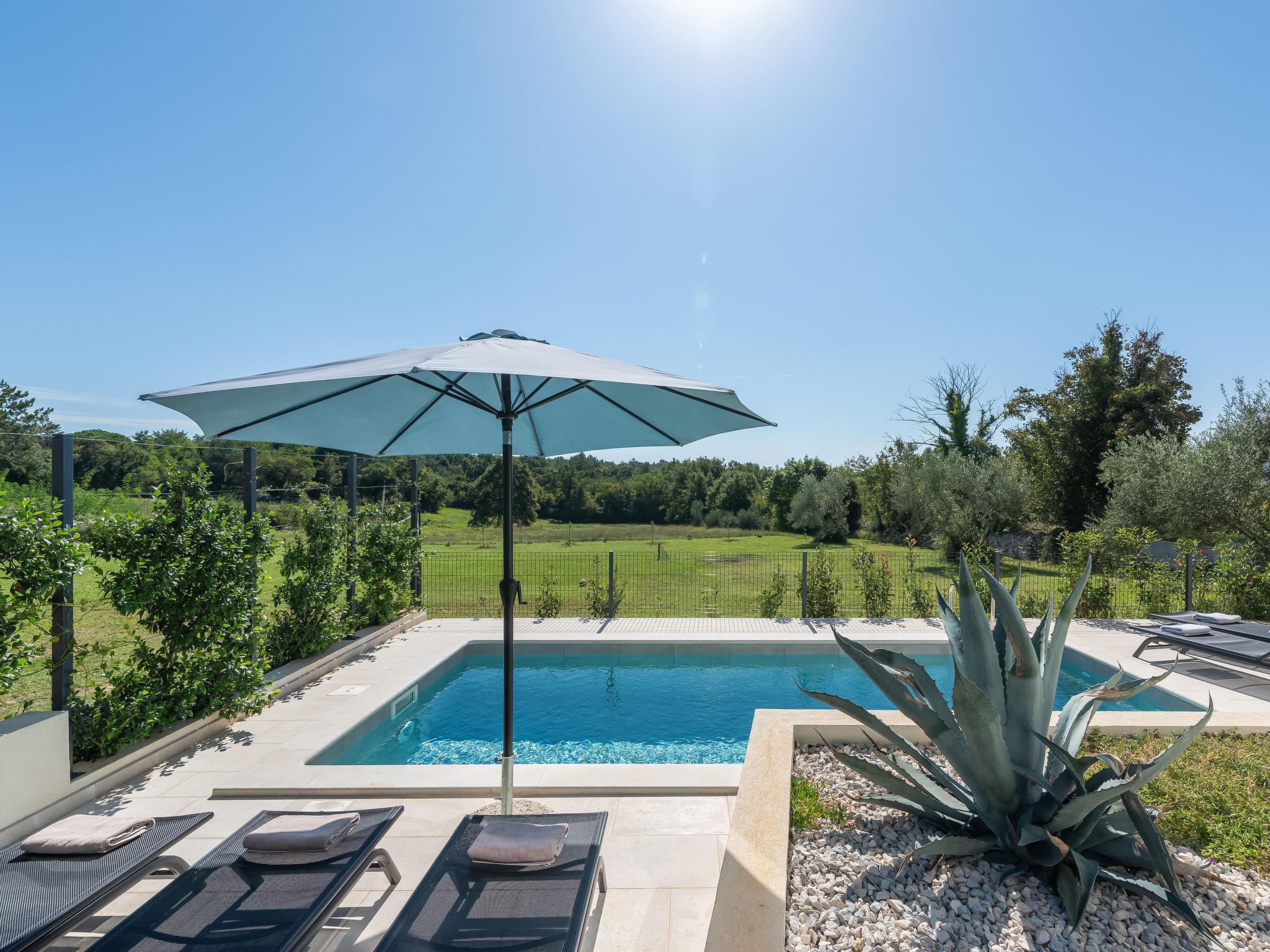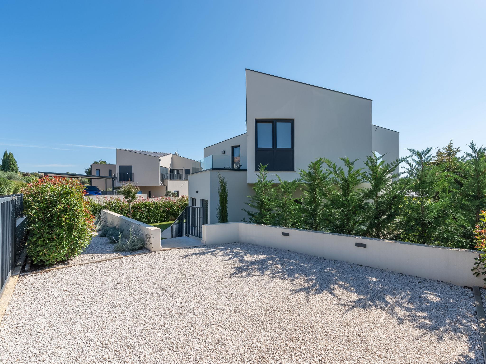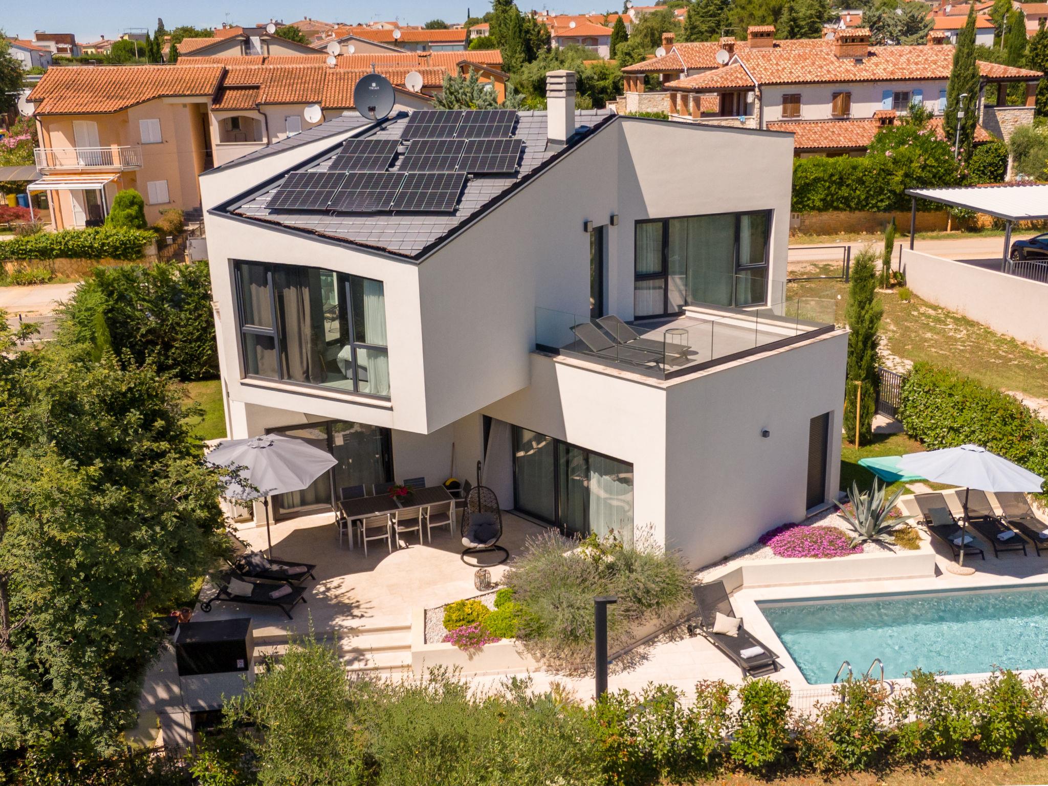 Tar 7 km from Porec: Modern villa "Marko Aurelia", 2 storeys. In the hamlet Vabriga 1 km from the centre of Tar, in a sunny position, 2 km from the sea, 2 km from the beach. Private: property 550 m2 (fenced), lawn, swimming pool angular (6 x 4 m, depth 150 cm, seasonal availability: 01.May. - 30.Sep.) with salt-electrolysis pool-cleaning system. Outdoor shower, garden furniture, barbecue. In the house: internet access, washing machine. Parking (for 2 cars) at the house on the premises. E-charging station. Shop 800 m, restaurant 300 m, bus stop 1.2 km, pebble beach 2 km, rocky beach 2 km. Walking paths from the house 100 m, cycle lane 150 m. Nearby attractions: Aquapark 14 km. The owner does not accept any youth groups. Electric vehicle charging station (domestic socket, on request and extra).