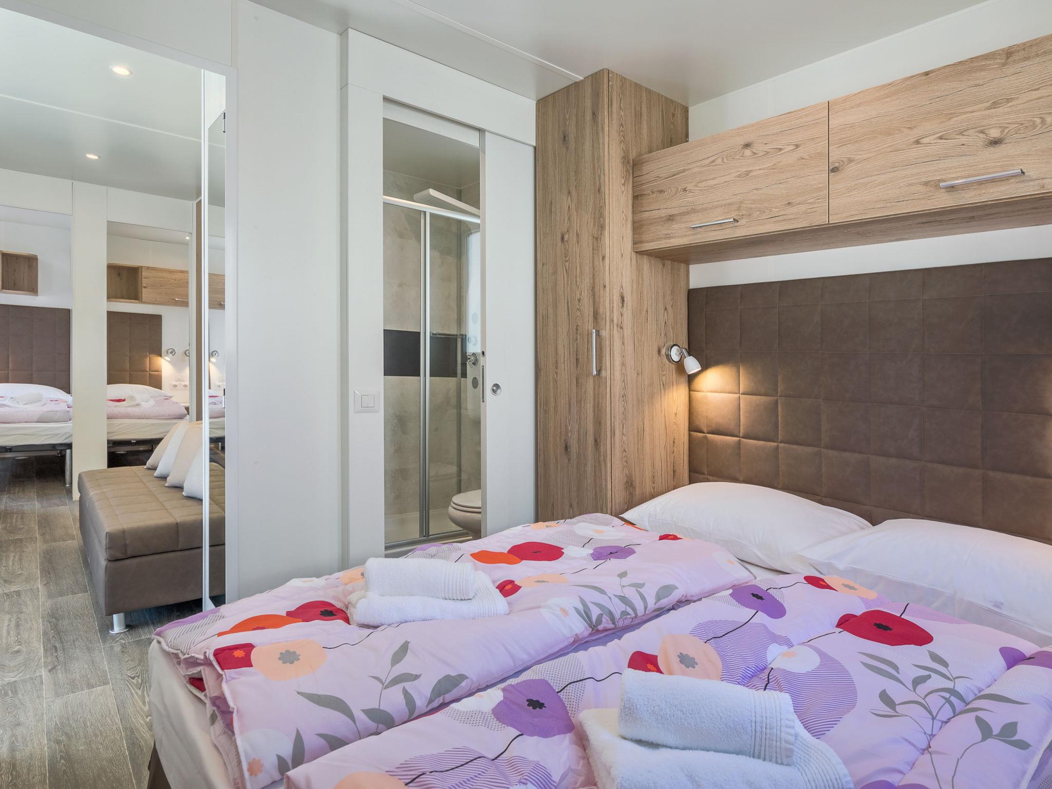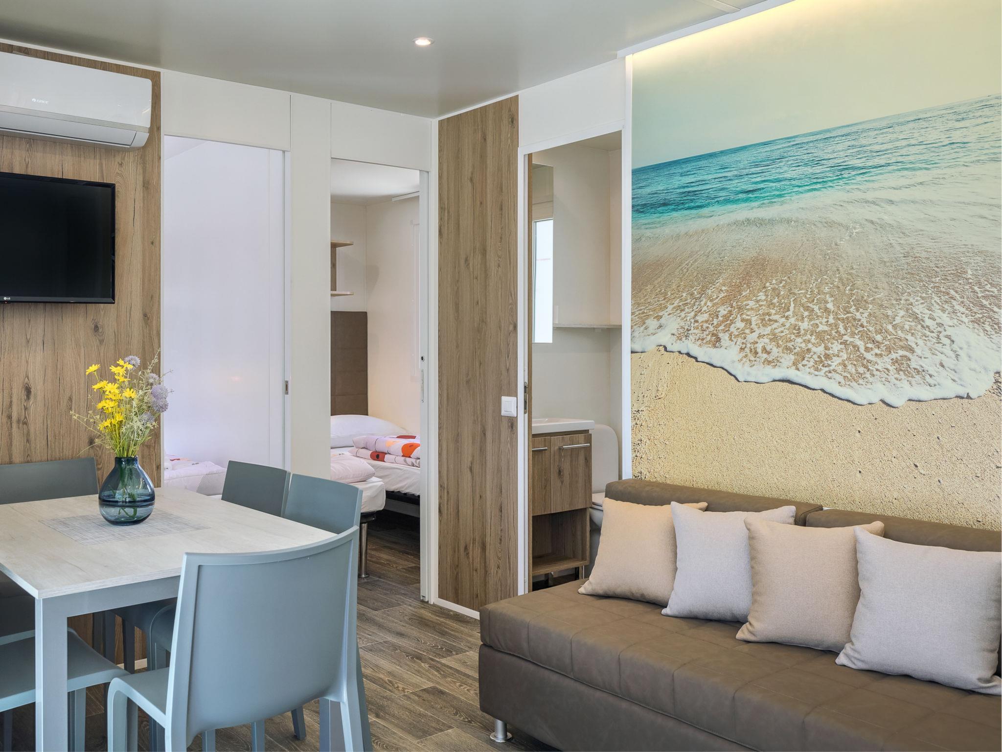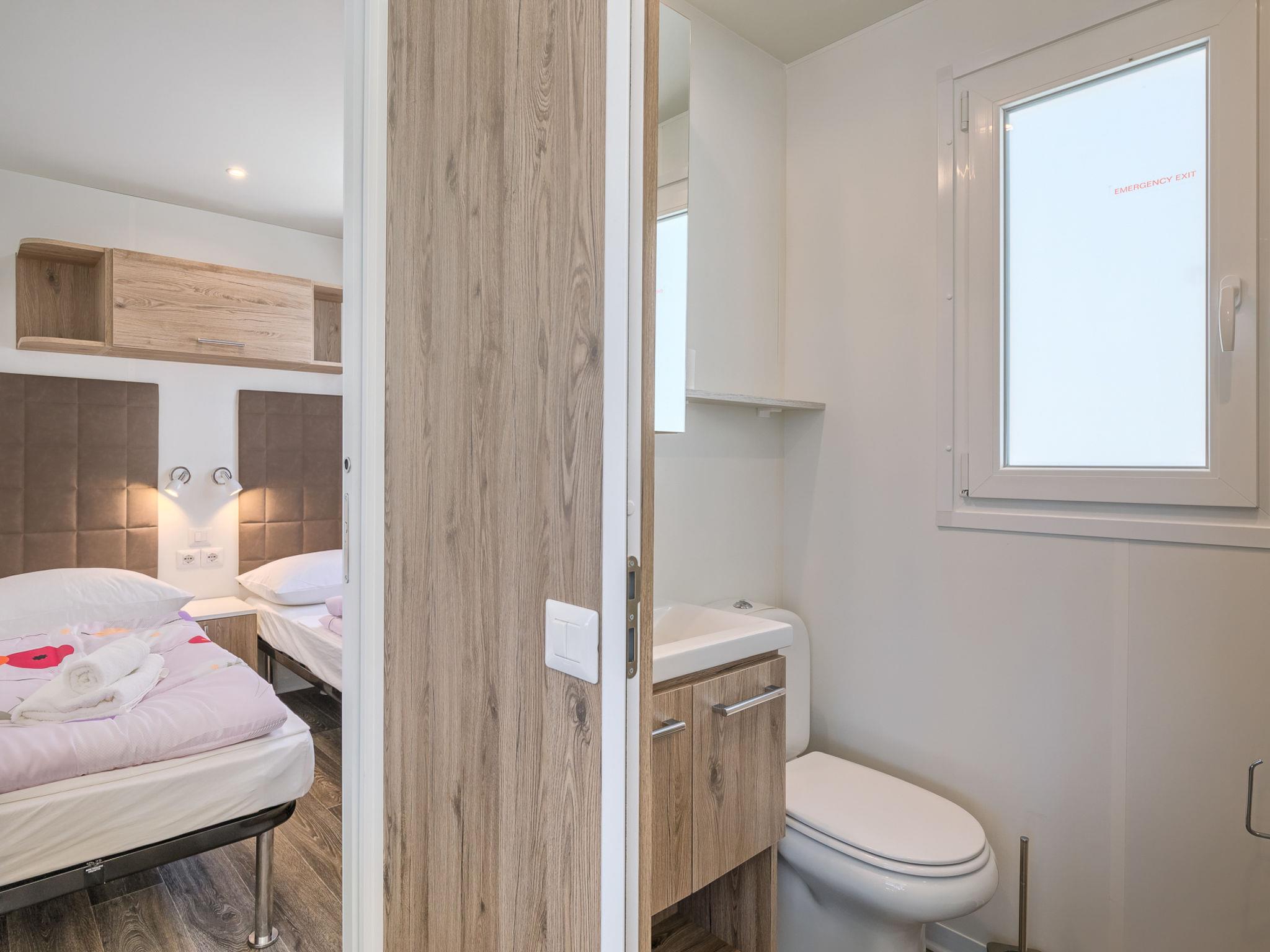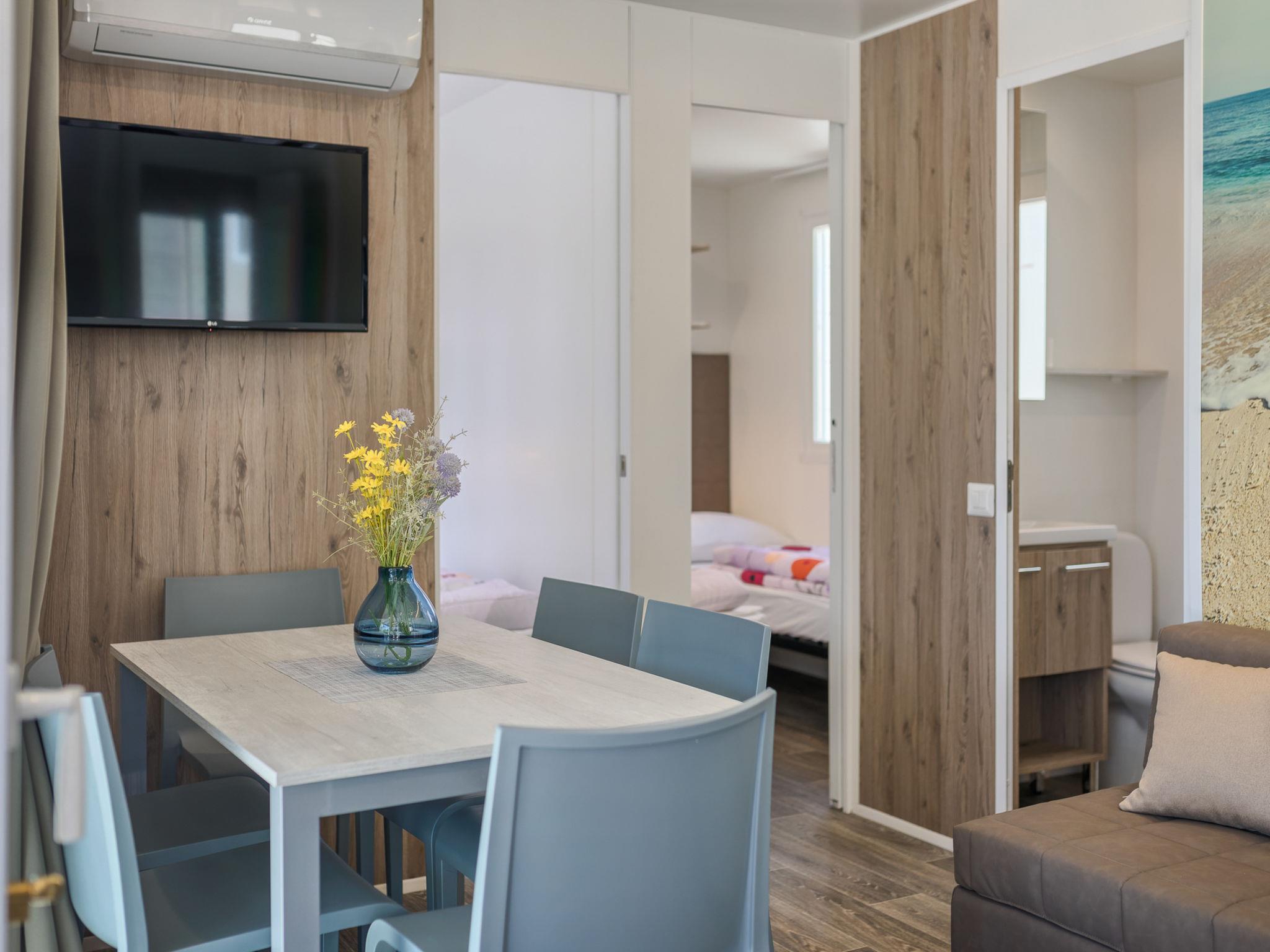 4-room mobile home 34 m2. Living/dining room with satellite TV (flat screen), air conditioning. Exit to the terrace. 2 rooms, each room with 1 french bed (160 cm, length 200 cm). 1 room with 2 beds (80 cm, length 200 cm). Open kitchen (dishwasher, 4 ceramic glass hob hotplates, microwave, electric coffee machine). 2 showers/WC. Terrace 25 m2, roofed. Terrace furniture. Facilities: Internet (WiFi, free). Suitable for families.
