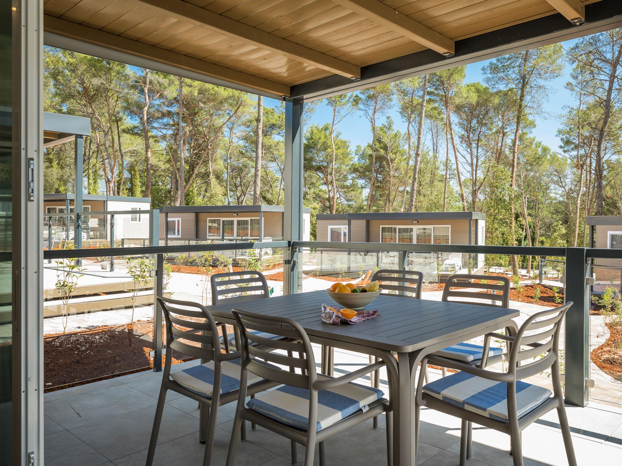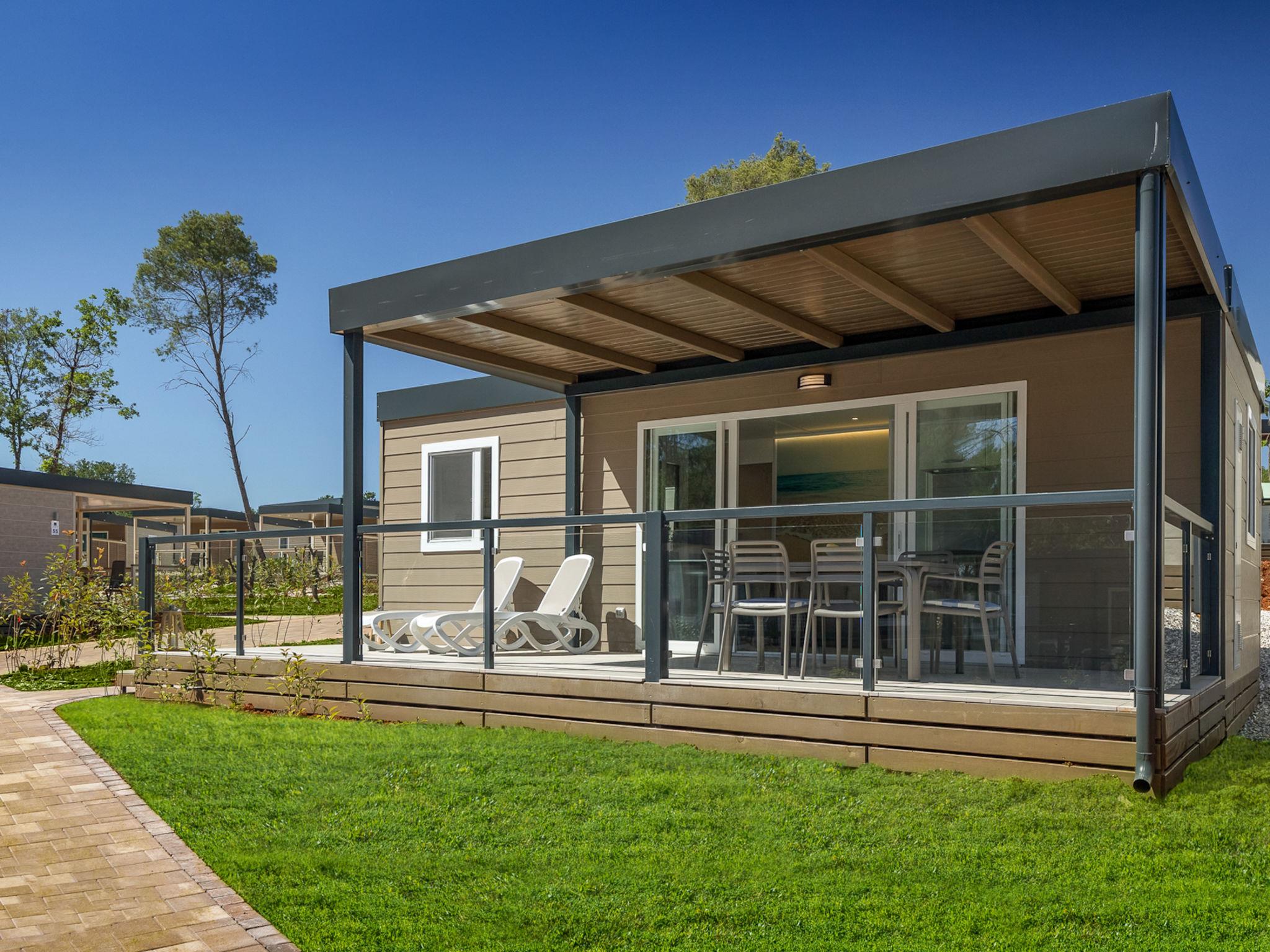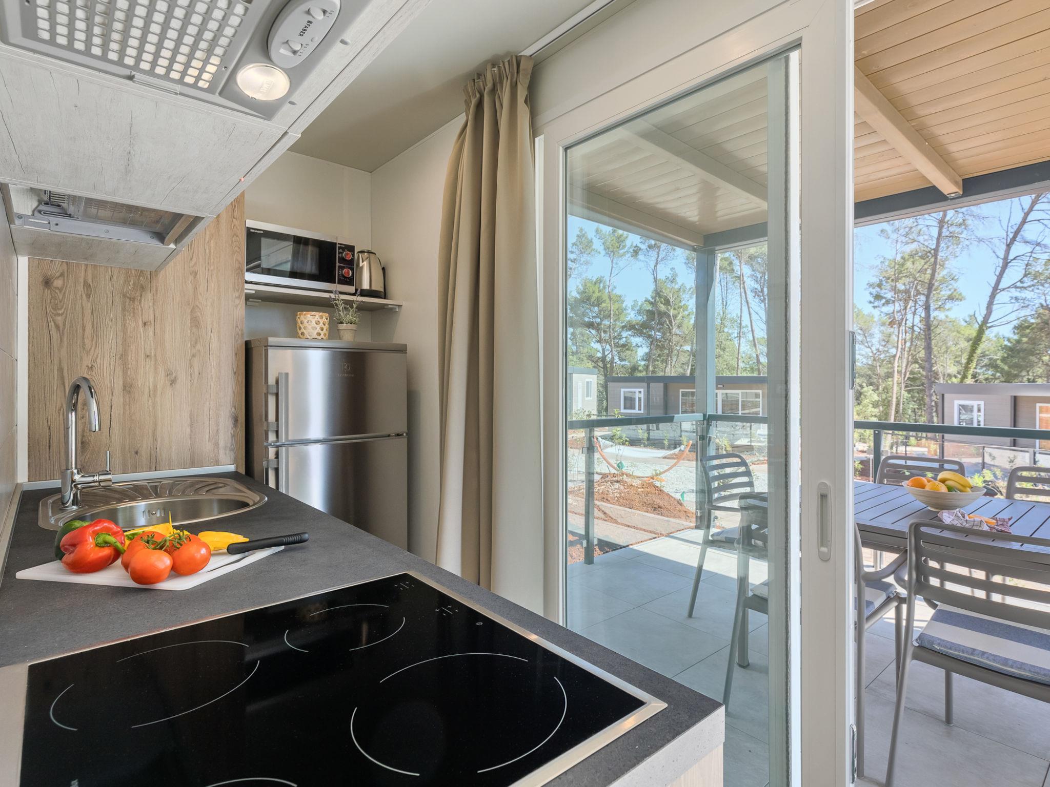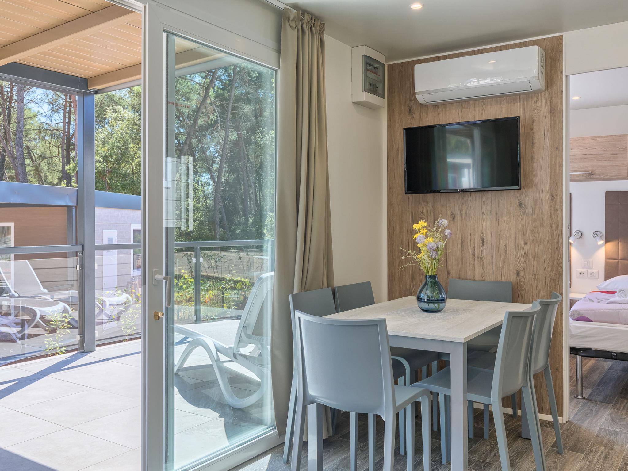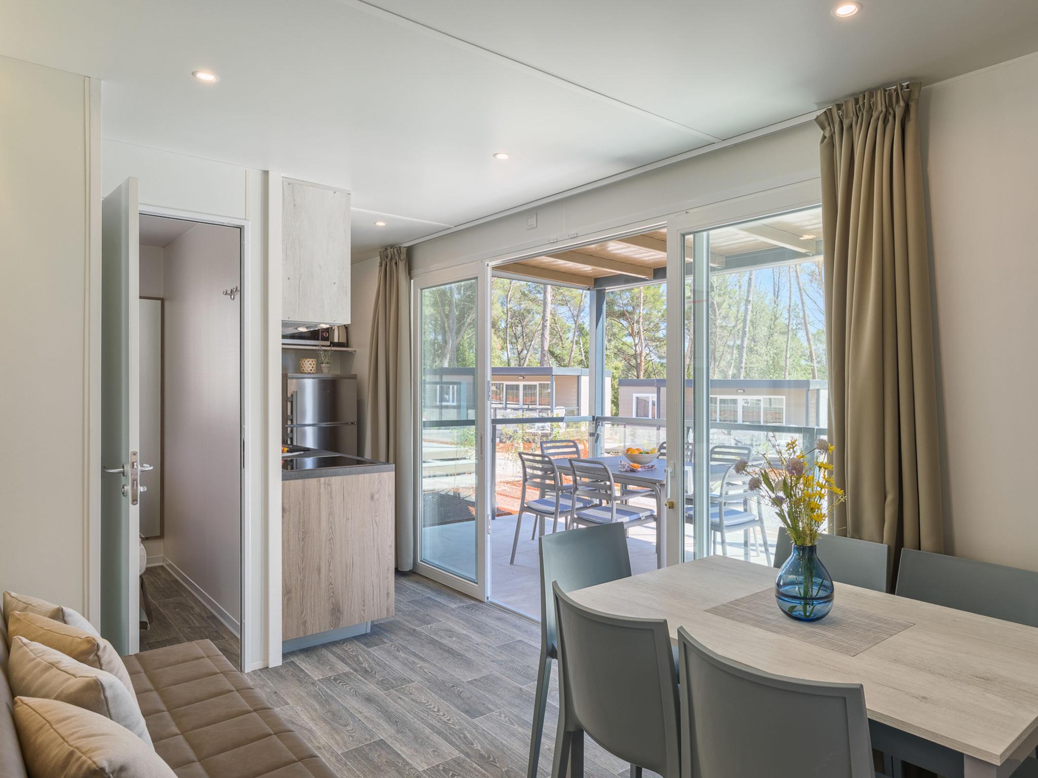 4-room mobile home 34 m2. Living/dining room with satellite TV (flat screen), air conditioning. Exit to the terrace. 2 rooms, each room with 1 french bed (160 cm, length 200 cm). 1 room with 2 beds (80 cm, length 200 cm). Open kitchen (dishwasher, 4 ceramic glass hob hotplates, microwave, electric coffee machine). 2 showers/WC. Terrace 25 m2, roofed. Terrace furniture. Facilities: Internet (WiFi, free). Suitable for families.