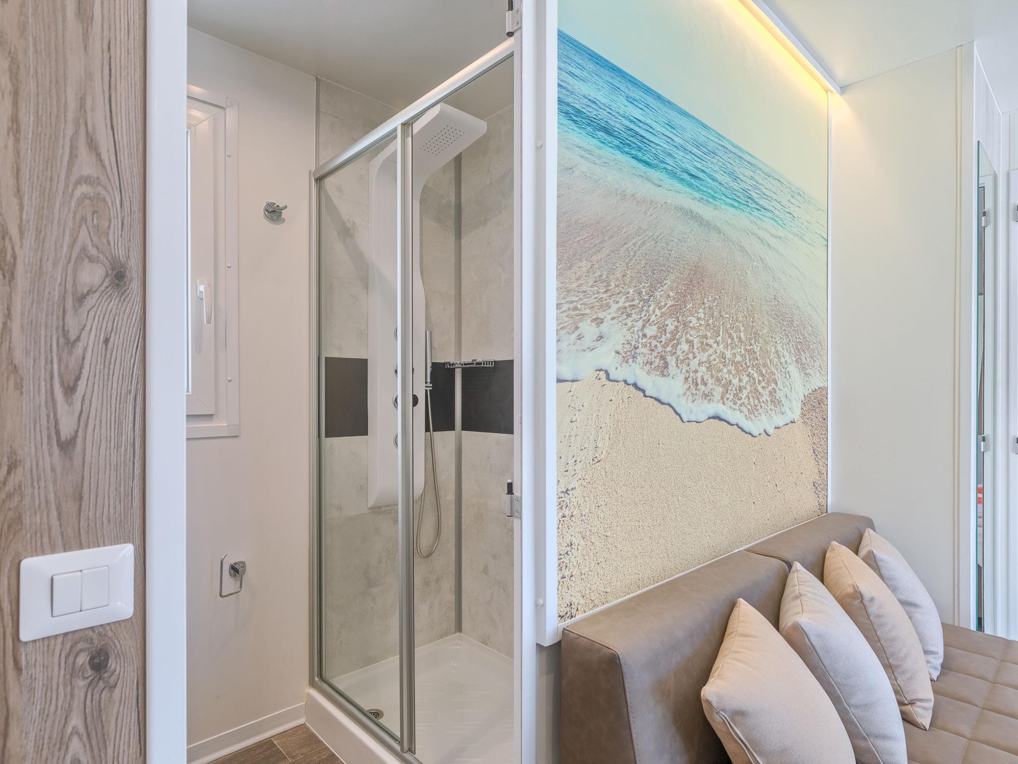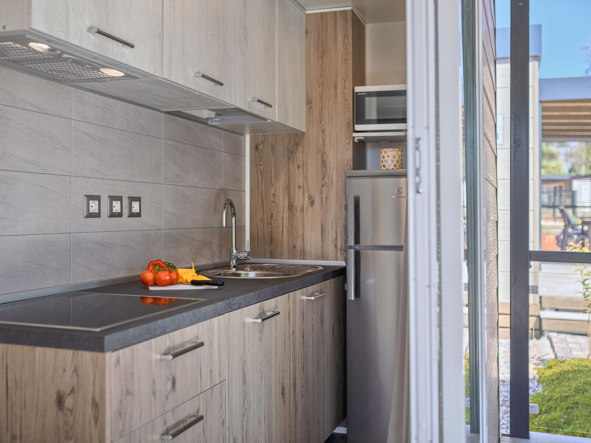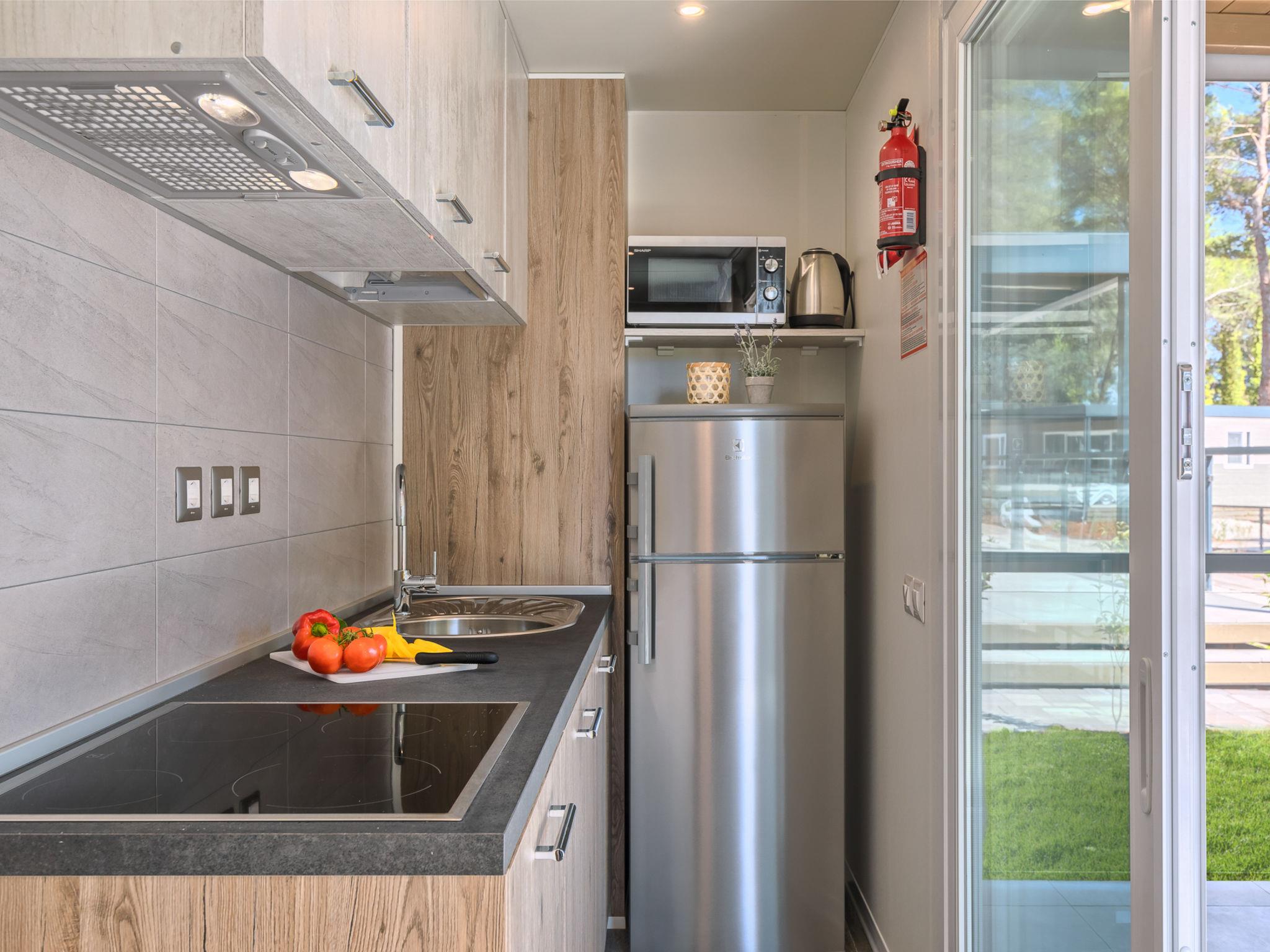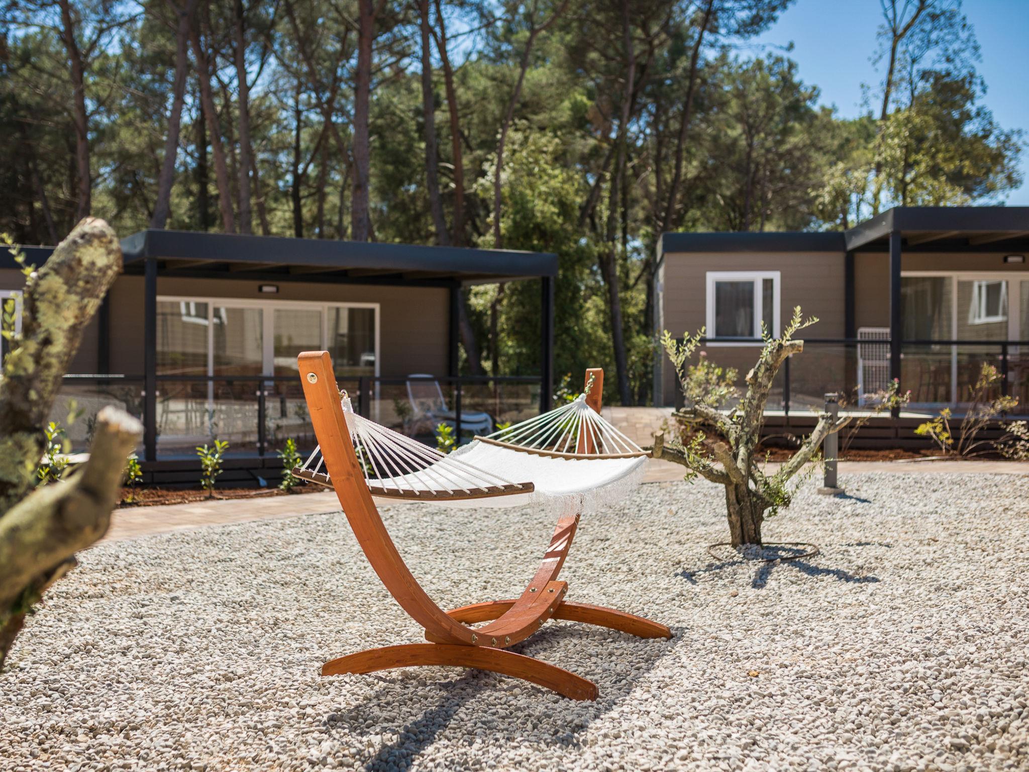 4-room mobile home 34 m2. Living/dining room with satellite TV (flat screen), air conditioning. Exit to the terrace. 2 rooms, each room with 1 french bed (160 cm, length 200 cm). 1 room with 2 beds (80 cm, length 200 cm). Open kitchen (dishwasher, 4 ceramic glass hob hotplates, microwave, electric coffee machine). 2 showers/WC. Terrace 25 m2, roofed. Terrace furniture. Facilities: Internet (WiFi, free). Suitable for families.