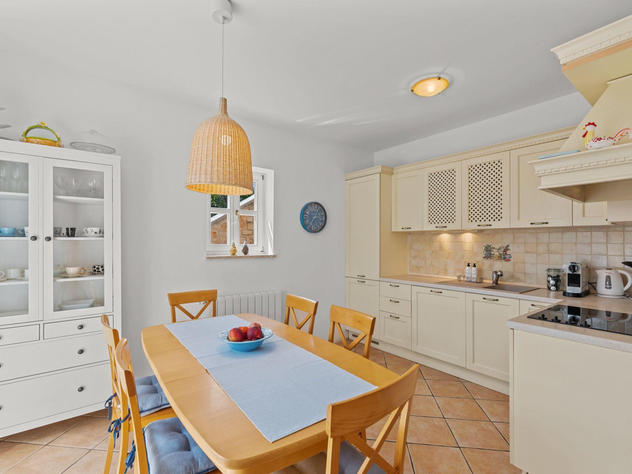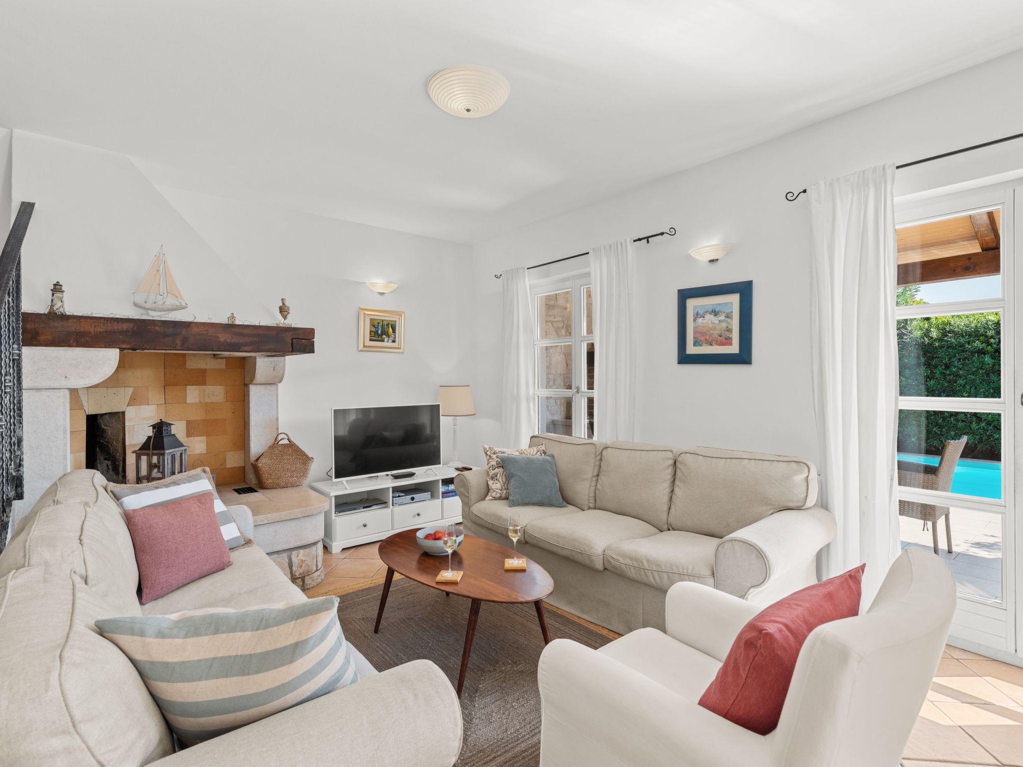 The villa is decorated in a modern, rustic elegant style and is spread over two floors. There are three bedrooms in the house, two double bedrooms are on the first floor, both with en suite bathroom. The third bedroom with two single beds and a bathroom are located on the ground floor. In one double bedroom and twin room is one sofa bed each so the house can accommodate 6+2 guests. There also is one cot and a high chair for a baby. Both bedrooms on the first floor have exit to pretty terrace ideal for alfresco drinks. Bed linen and towels are provided, you only have to bring beach towels. The living room on the ground floor provides comfortable sofas and a fireplace, as well as a flatscreen TV with digital and cable channels. The adjoining kitchen is equipped for everyday cooking: fridge, stove, oven, toaster, dishwasher and coffee machine. Both rooms are facing the swimming pool and have exit on outside covered terrace with BBQ. Free WiFi is available throughout entire house. There are many things like books, magazines, toys, DVD movies and games that make a house home. You will be greeted by the owner or representative on your arrival and he will be at your disposal during your stay in the house. He will also leave many useful information about the area to make your holiday even more enjoyable .