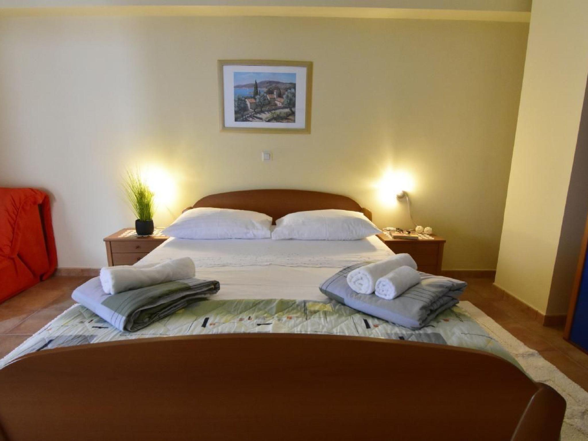 Inside, the air-conditioned flat on the first floor welcomes you with cosy furnishings. It includes a comfortable bedroom with a double bed and an additional single bed, fully equipped with bed linen changed weekly. There is a modern bathroom with shower cubicle, bidet, hairdryer and all necessities, as well as an inviting living area. This is complemented by a sofa bed, a flat-screen satellite TV, a dining table and a fully equipped kitchenette that leaves nothing to be desired.