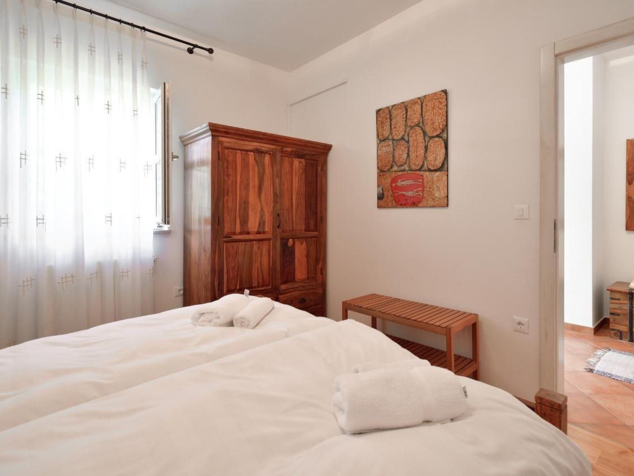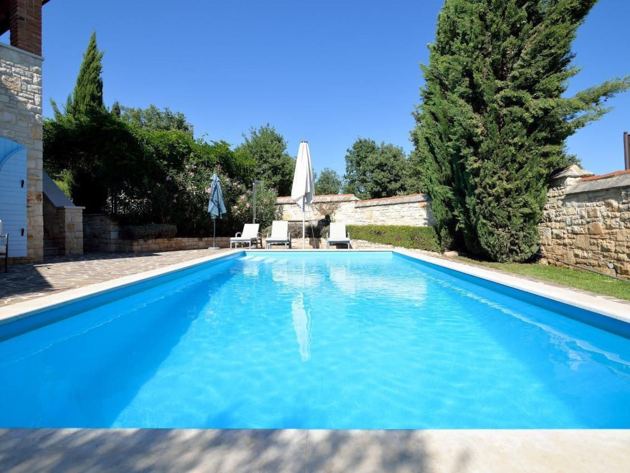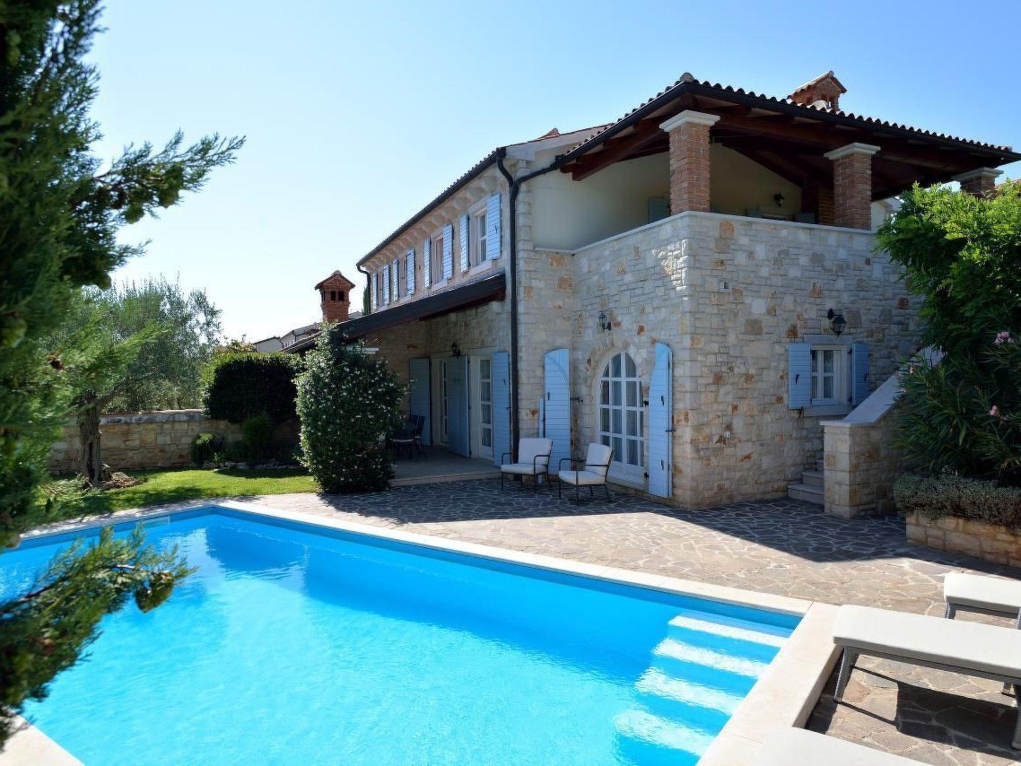 This is a luxury self-contained stone house in traditional Istrian style. The house, completed in 2006, has its own walled garden with private swimming pool (8 x 4 metres). It is tastefully equipped with modern kitchen and traditional Istrian style solid wood furniture. The house has a spacious & shady south facing ground floor terrace with barbecue as well as a sunny poolside patio for alfresco eating. There is also a beautiful traditional Istrian open hearth in the living room. Modern central heating also on hand for winter rentals. The shady car port has space for 2 cars but parking on the street is also no problem. Each bedroom has its own bathroom with shower and WC. The upstairs bathrooms are en-suite. In case you need to work, the master bedroom also has a comfortable desk and high speed internet access for your laptop. The two master bedrooms are simply and tastefully furnished with solid dark wood furniture in the traditional styles of the region. There is lots of storage space in the upstairs bedrooms as both have walk-in storage space. The kids' room sleeps a maximum of 4 adults or older children (2 single bunk beds plus a small double sofa bed). There is also a fold-away cot suitable for a baby or young child up to three years old. Located at the quiet edge of the small village of Vabriga, the house is 10 minutes walk from the sea. All nearby beaches are of pebble and stone with crystal clear waters. Boat hire is also available nearby. Vabriga & especially the nearby twin village of Tar offer numerous restaurants and local shops and you are 10 minutes by car from the lively town of Porec. The attractive coastal towns of Porec and Visnjan are also reached in minutes by car. Inland you will find vineyards, olive groves (and some say the best olive oil in the world) as well as quite villages in the Istrian countryside. The historic Venetian town of Rovijn and Pula with its Roman amphitheatre are also only short drives away along the modern road opened in 2005. You can also make day trip excursions to Triest (by road) and Venice (by high speed ferry from Porec) or explore truffle and wine country beyond picturesque Groznjan in the hills along the border with Slovenia. If you prefer the seaside, Lanterna, the largest resort on the coast of Croatia is only 2 km away. Here you can enjoy organized water-sports as well as tennis or simply swim in the crystal clear water on this side of the Adriatic.