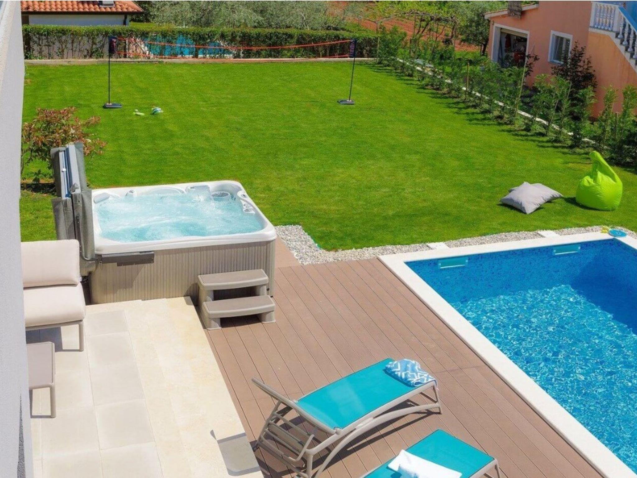 Villa Grande is a newly built charming two-storey villa located in Rogovici near Porec. The villa offers accommodation for eight people in four beautiful and fully decorated bedrooms. Each bedroom has air conditioning, satellite TV and a private bathroom, with access to a balcony or terrace with a table and chairs. On the ground floor of the house is a fully equipped kitchen with dining area and living room from which is possible a direct access to the terrace with deck chairs and swimming pool.Besides the pool, located in the center of the garden, there is a jacuzzi, a covered terrace with barbecue, and a spacious lawn with badminton nets. There is also a billiard table and darts in the courtyard, so you will surely miss the fun. Villa Grande is open all year round, so book your appointment and experience an unforgettable vacation in this gorgeous villa!