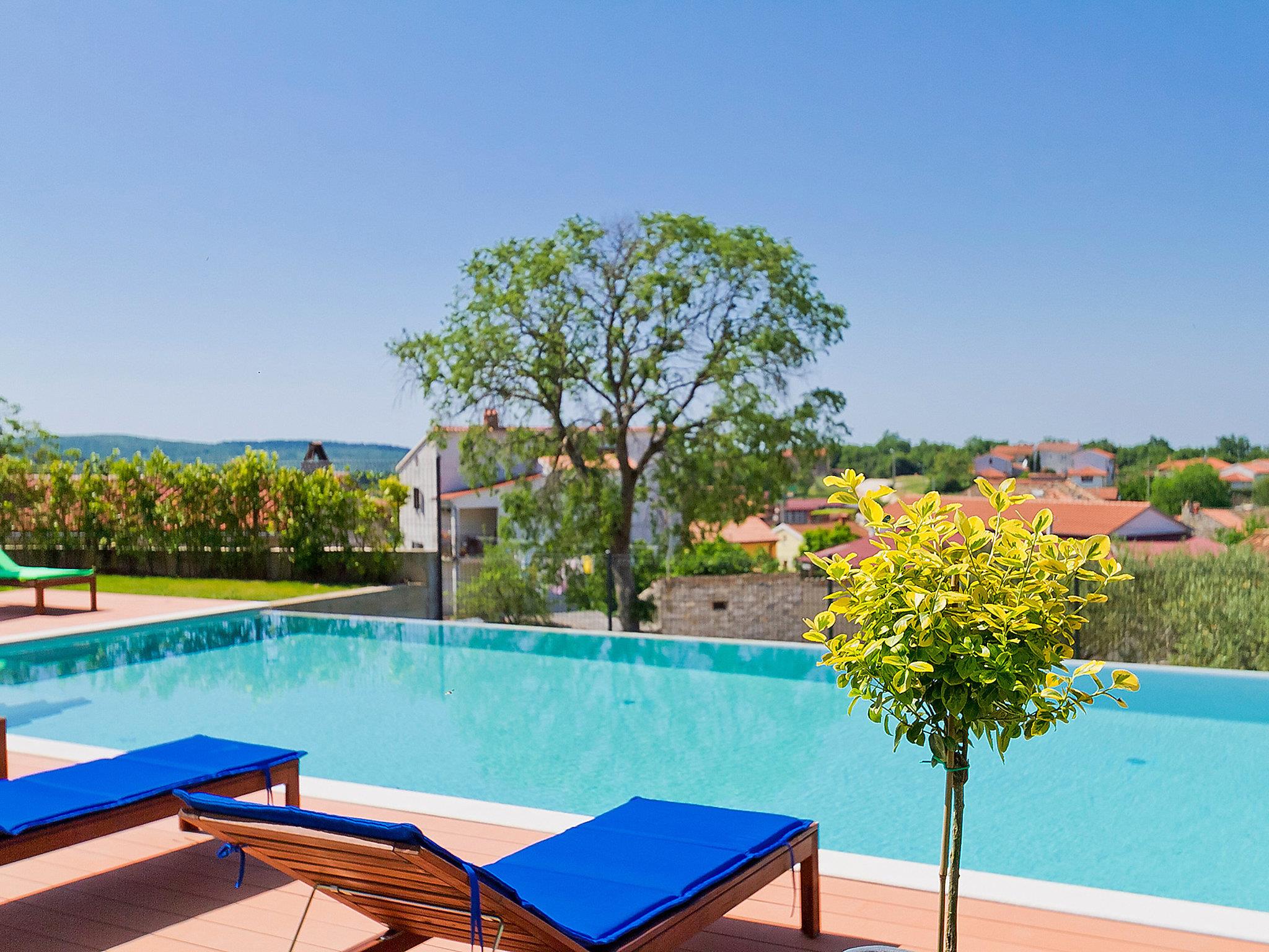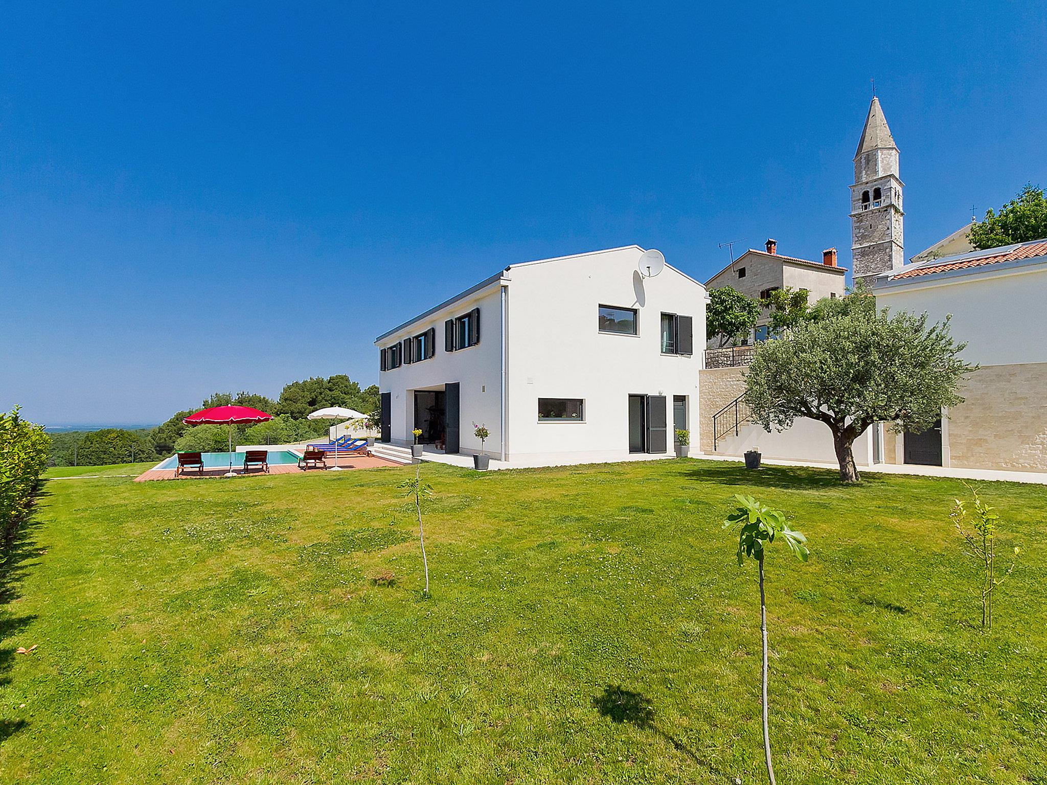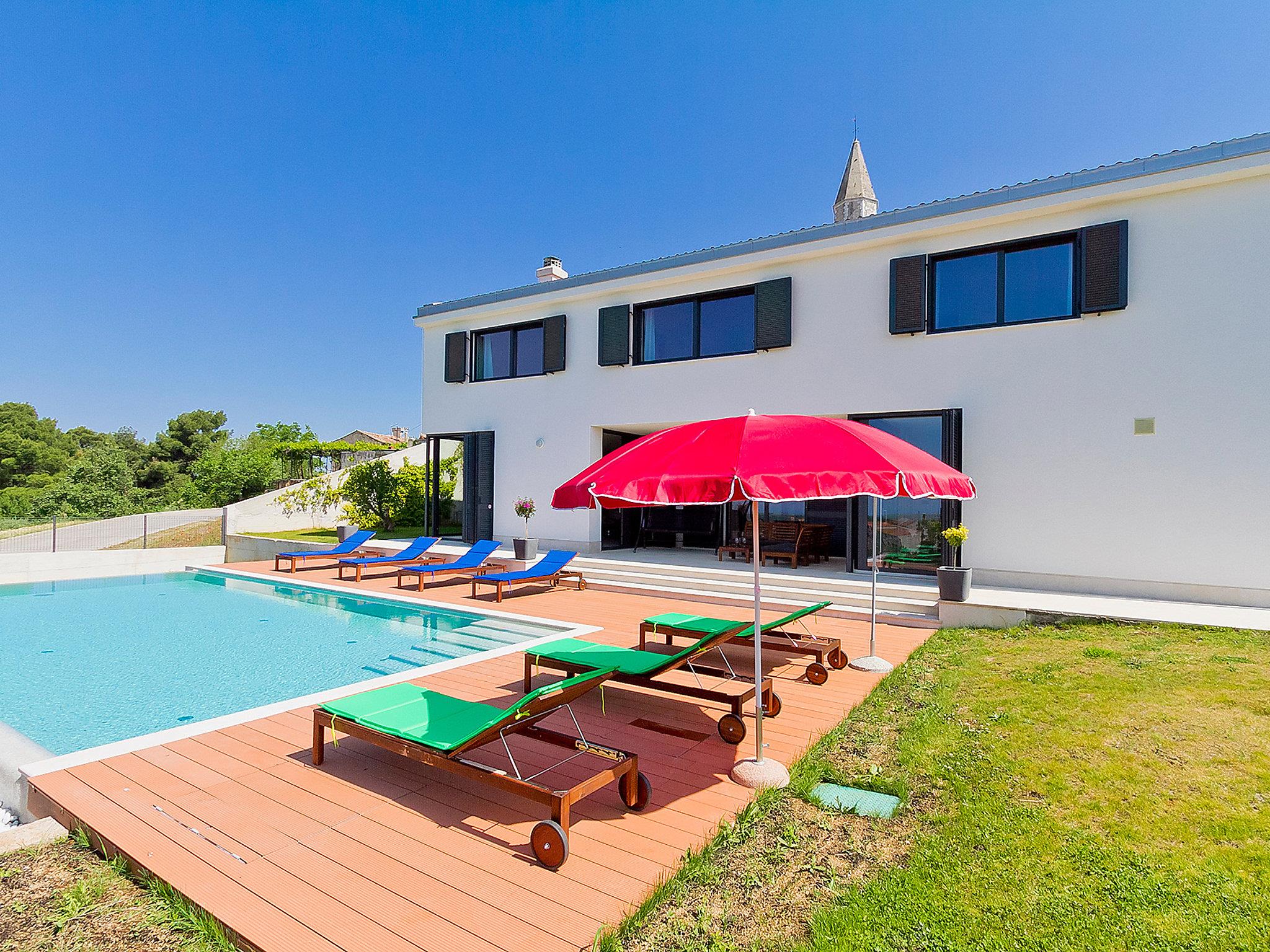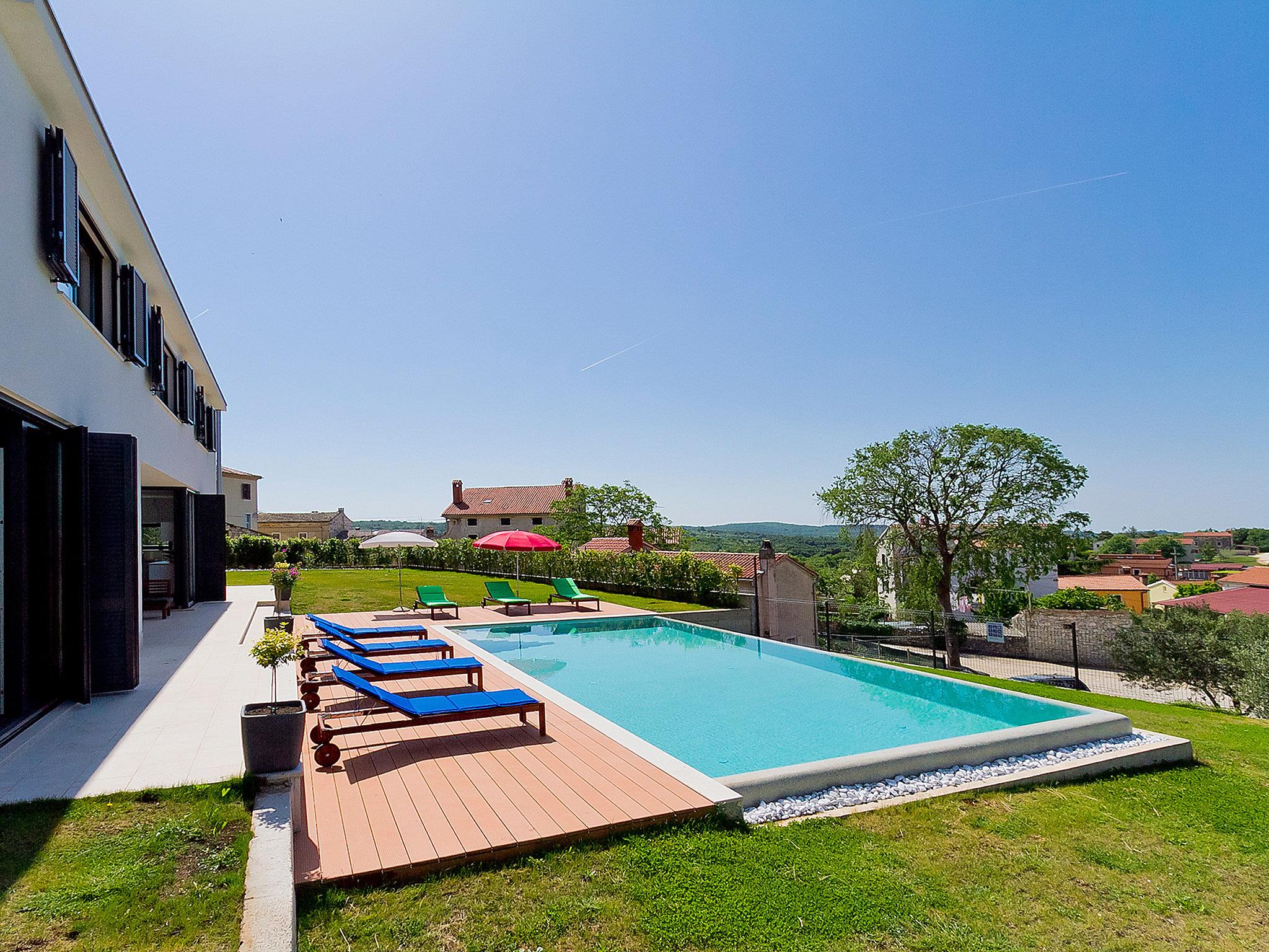 Višnjan 10 km from Porec: Modern, beautiful villa "Anna", 2 storeys. 300 m from the centre of Višnjan, in a quiet, sunny, elevated position, 11 km from the sea. Private: property 1'150 m2 (fenced), beautiful garden with lawn and wildlife garden, swimming pool angular (5 x 10 m, depth 125 - 145 cm, seasonal availability: 15.May. - 01.Oct.) with internal staircase. Table tennis, pergola, barbecue. In the house: internet access, table football, washing machine. Parking at the house on the premises. Shop 200 m, restaurant 400 m, bus stop 10 m, railway station 30 km, pebble beach 11 km. Tennis 10 km, walking paths from the house, cycle lane 100 m. The owner does not accept any youth groups.