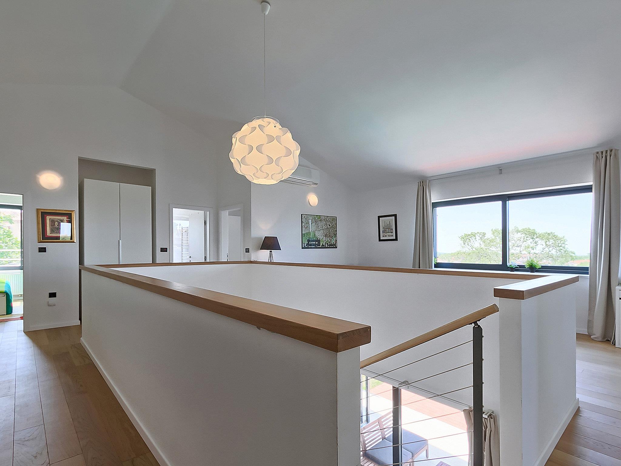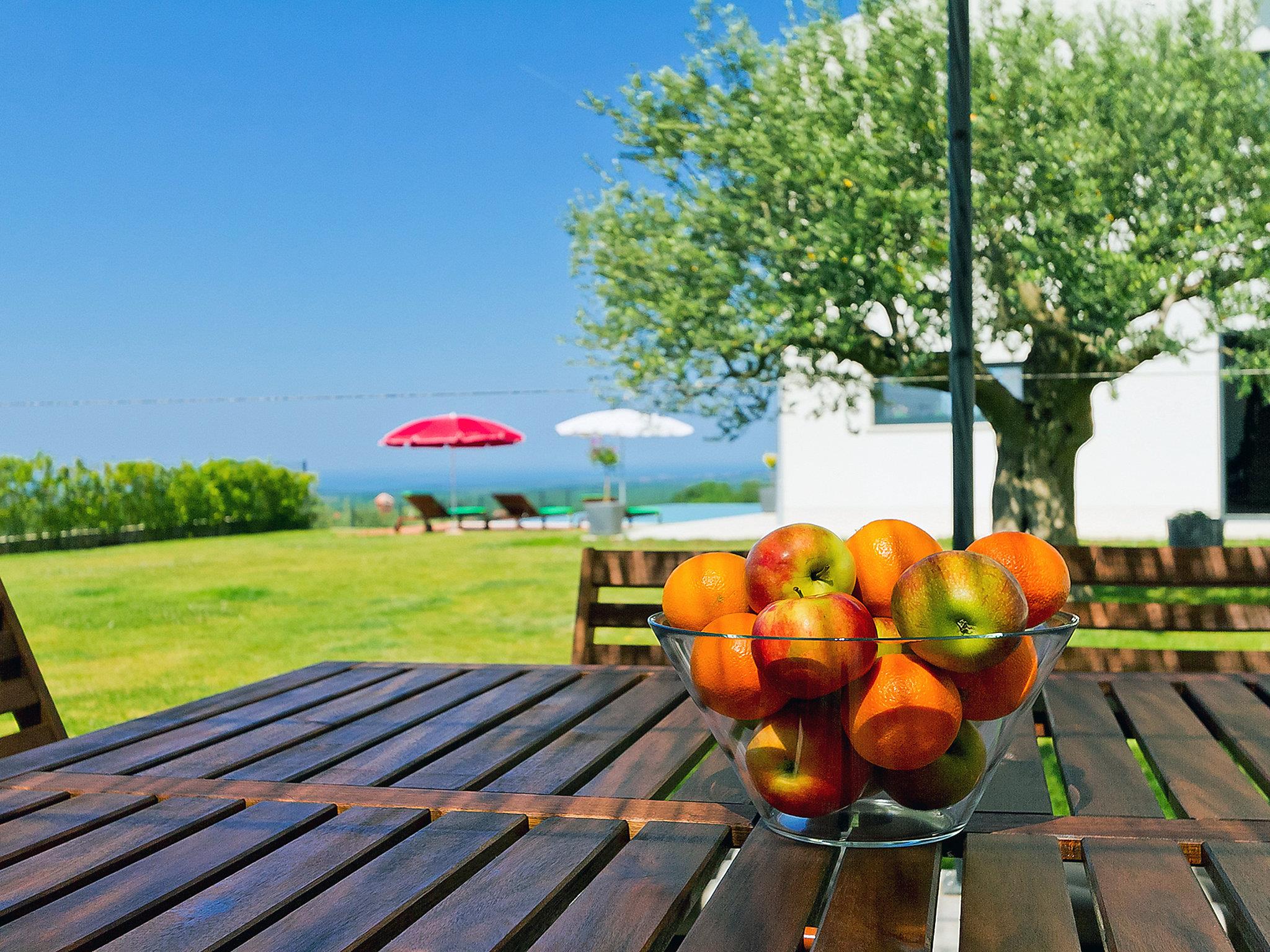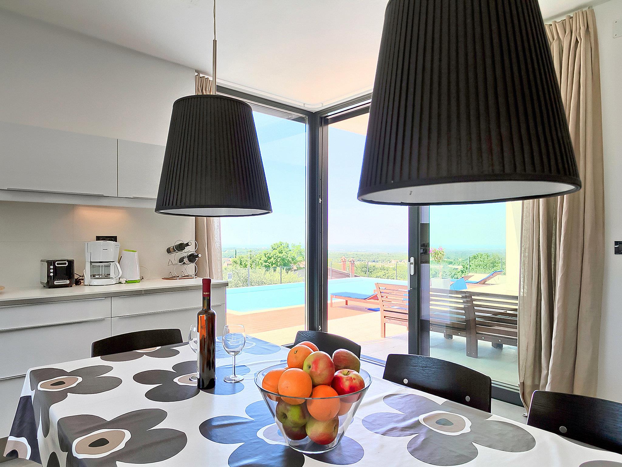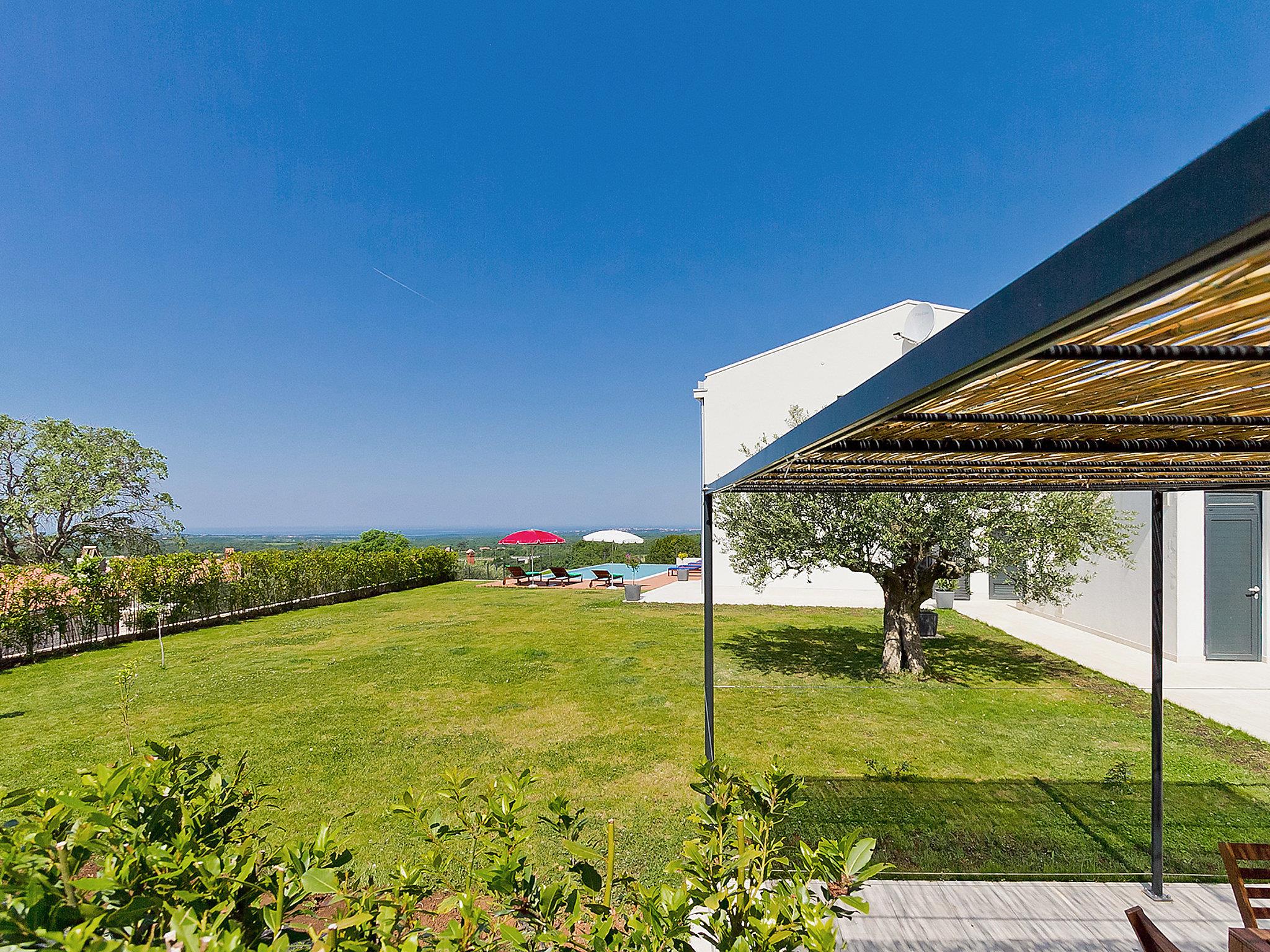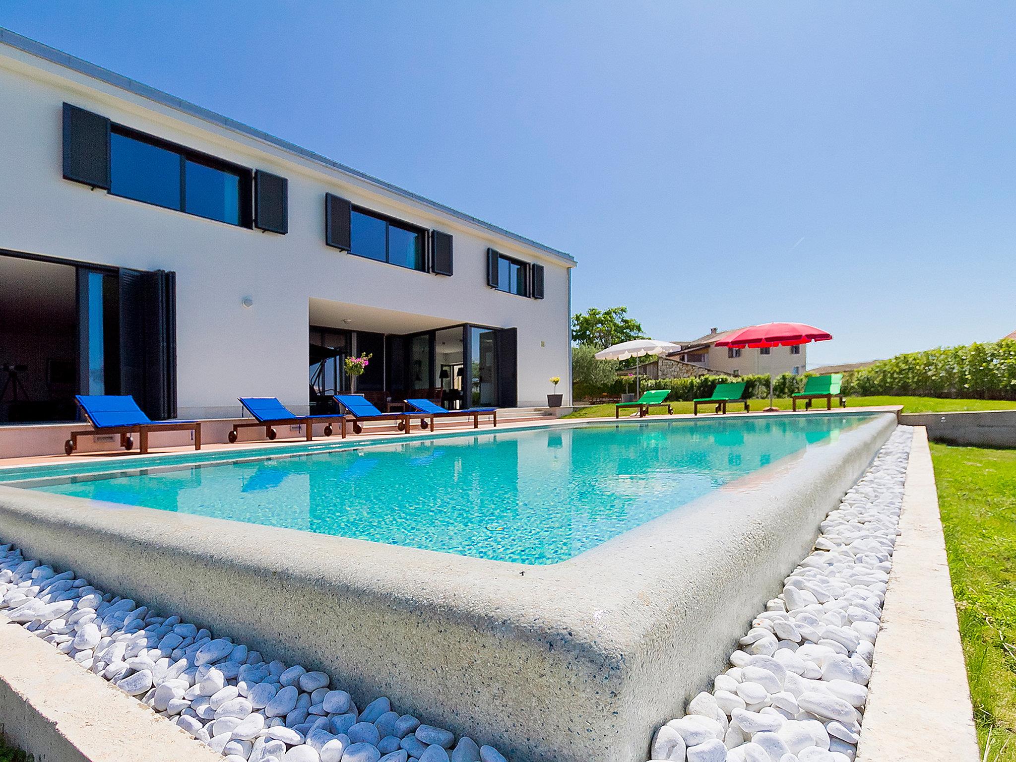 Višnjan 10 km from Porec: Modern, beautiful villa "Anna", 2 storeys. 300 m from the centre of Višnjan, in a quiet, sunny, elevated position, 11 km from the sea. Private: property 1'150 m2 (fenced), beautiful garden with lawn and wildlife garden, swimming pool angular (5 x 10 m, depth 125 - 145 cm, seasonal availability: 15.May. - 01.Oct.) with internal staircase. Table tennis, pergola, barbecue. In the house: internet access, table football, washing machine. Parking at the house on the premises. Shop 200 m, restaurant 400 m, bus stop 10 m, railway station 30 km, pebble beach 11 km. Tennis 10 km, walking paths from the house, cycle lane 100 m. The owner does not accept any youth groups.