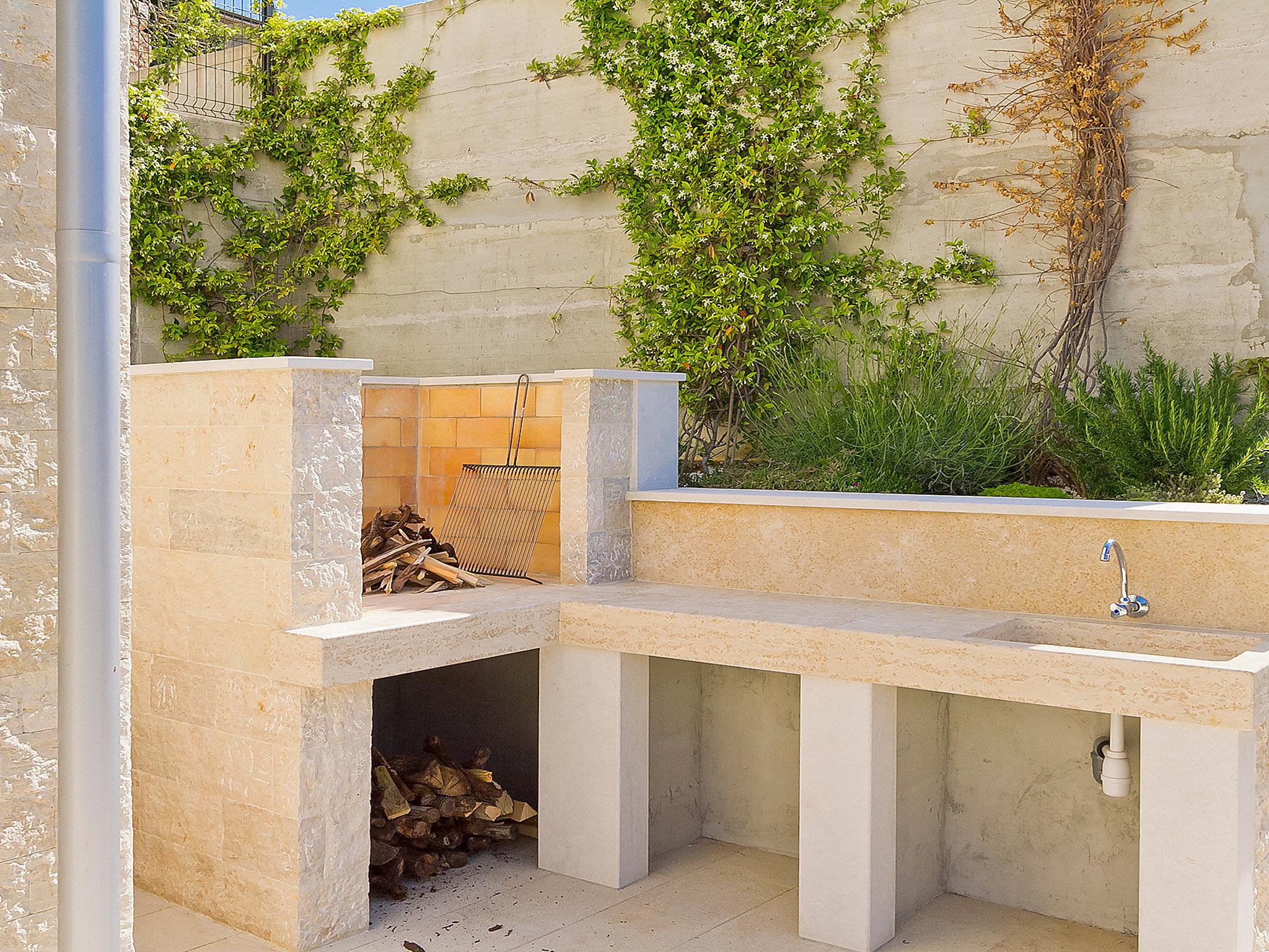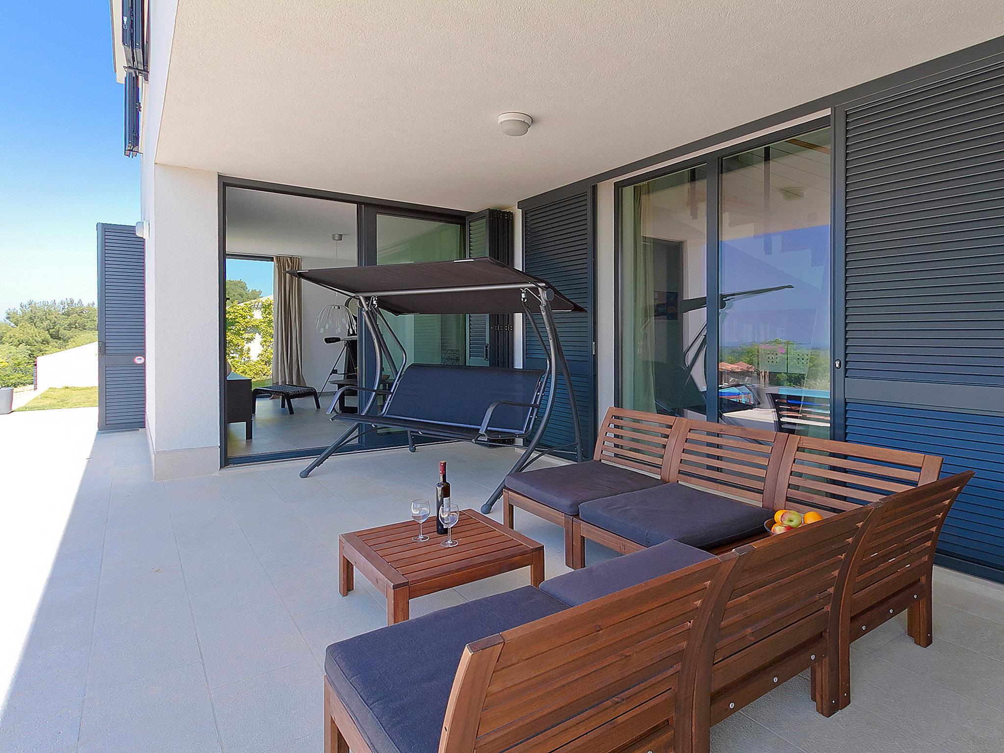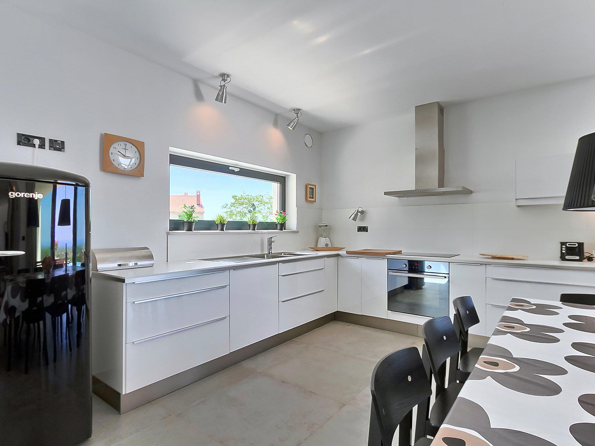 4-room villa 240 m2 on 2 levels. Living/dining room with satellite TV (flat screen), air conditioning. Exit to the terrace, to the swimming pool. Open kitchen (oven, dishwasher, 4 ceramic glass hob hotplates, microwave, freezer) with air conditioning. Sep. WC. Floor heating. Upper floor: open walk-through room with 1 double sofabed and satellite TV (flat screen), air conditioning. 1 room with 1 french bed (180 cm, length 200 cm), bath/WC and air conditioning. 1 room with 2 beds (90 cm, length 200 cm), air conditioning. 1 room with 1 french bed (160 cm, length 200 cm). Shower/WC. Floor heating. Terrace 15 m2, roofed. Terrace furniture, deck chairs. Panoramic view of the sea and the countryside. Facilities: safe, children's high chair, baby cot. Internet (WiFi, free). UP/I-335-03/14-01/140, URBROJ 2163-03-11-02/2-14-3