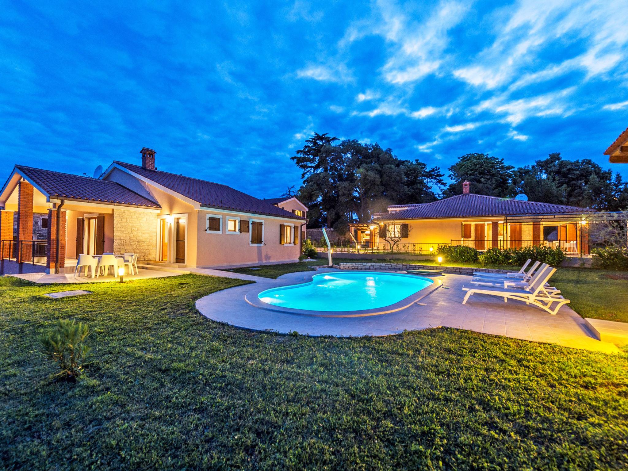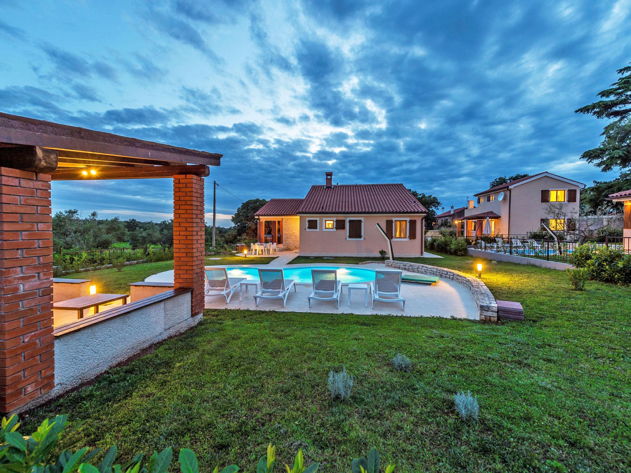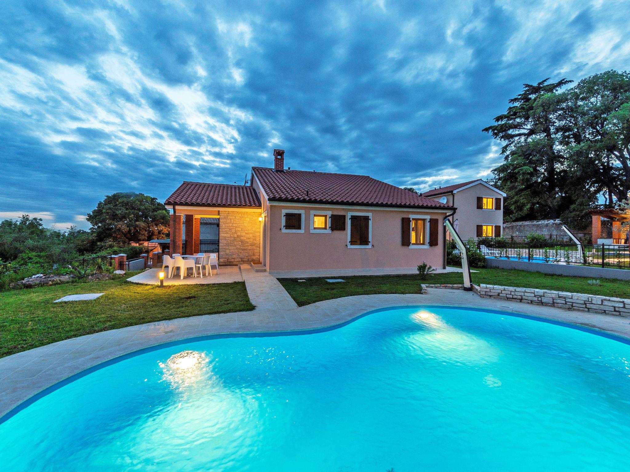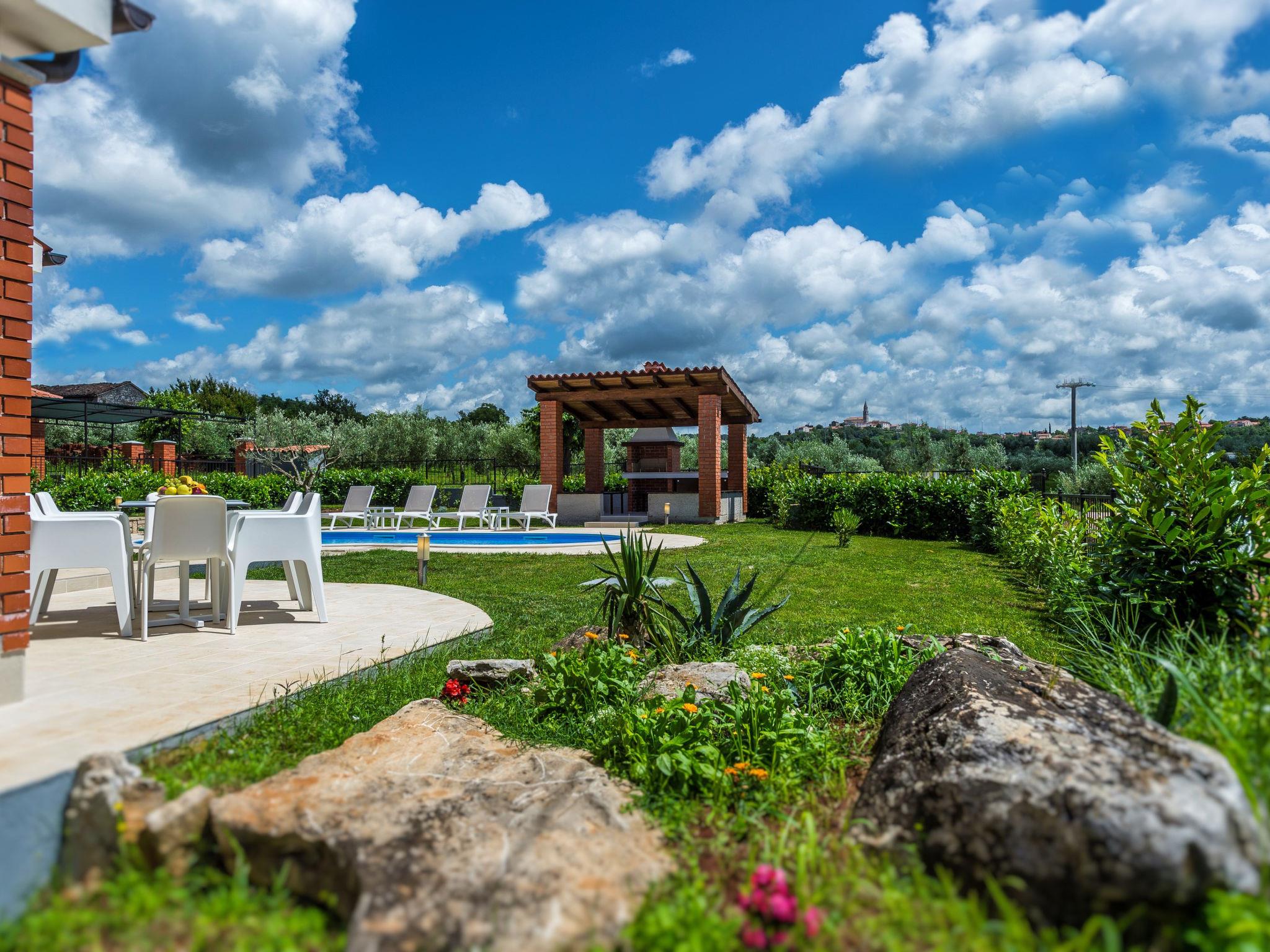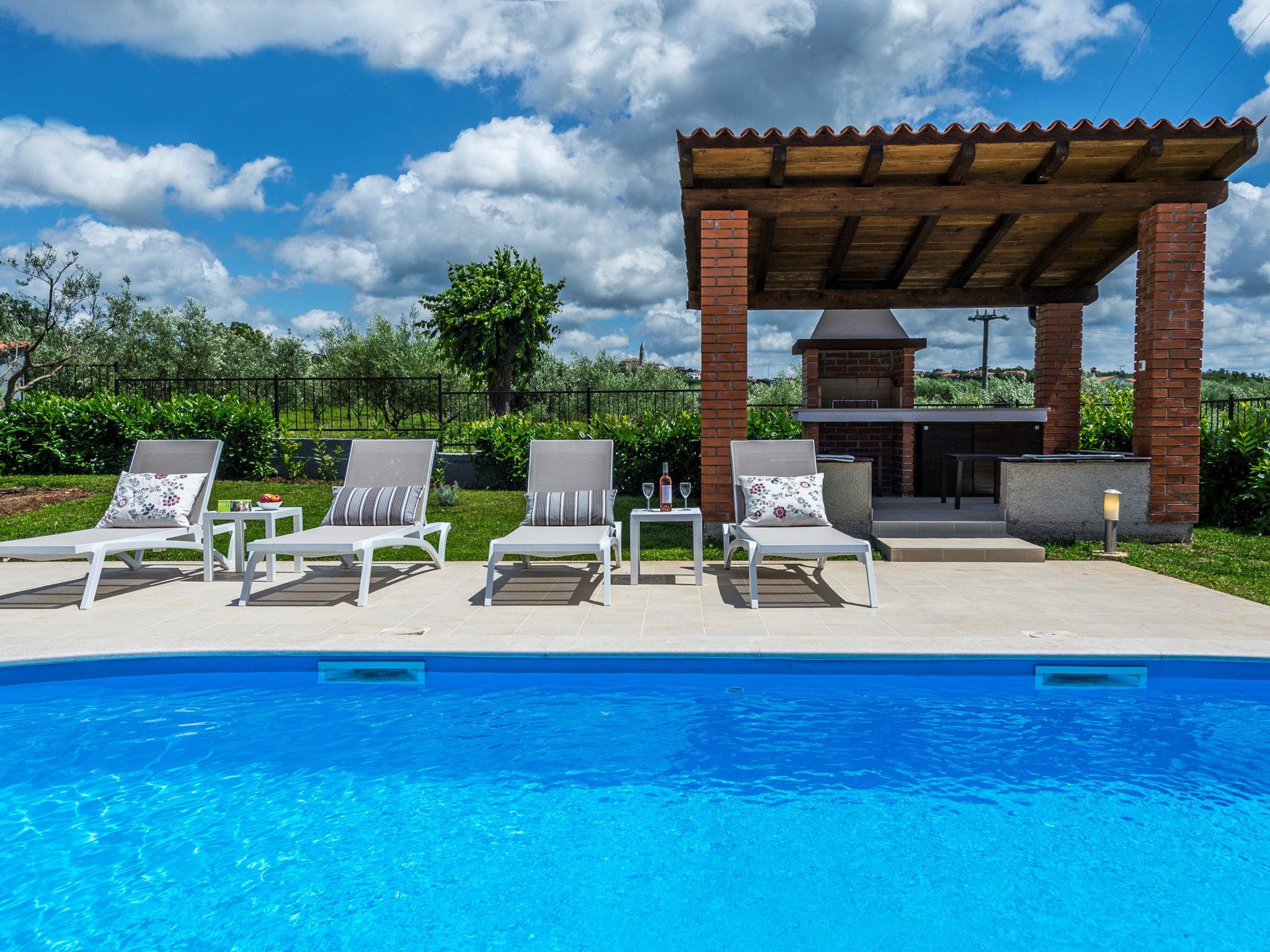 Višnjan 10 km from Porec: Single-family house "Dalia". In the hamlet Kolumbera 1 km from the centre of Višnjan, in a sunny position, 8 km from the sea. Private: property 800 m2 (fenced), garden with lawn, swimming pool (28 m2, depth 140 cm, seasonal availability: 20.Apr. - 28.Sep.). Unconventional pool shape. Outdoor shower, terrace (15 m2), garden furniture, barbecue. In the house: internet access, washing machine. Parking at the house on the premises. Shop 1 km, restaurant 500 m, pebble beach 8 km, rocky beach 8 km. Tennis 13 km, riding stable 10 km, walking paths from the house 100 m, cycle lane 150 m.