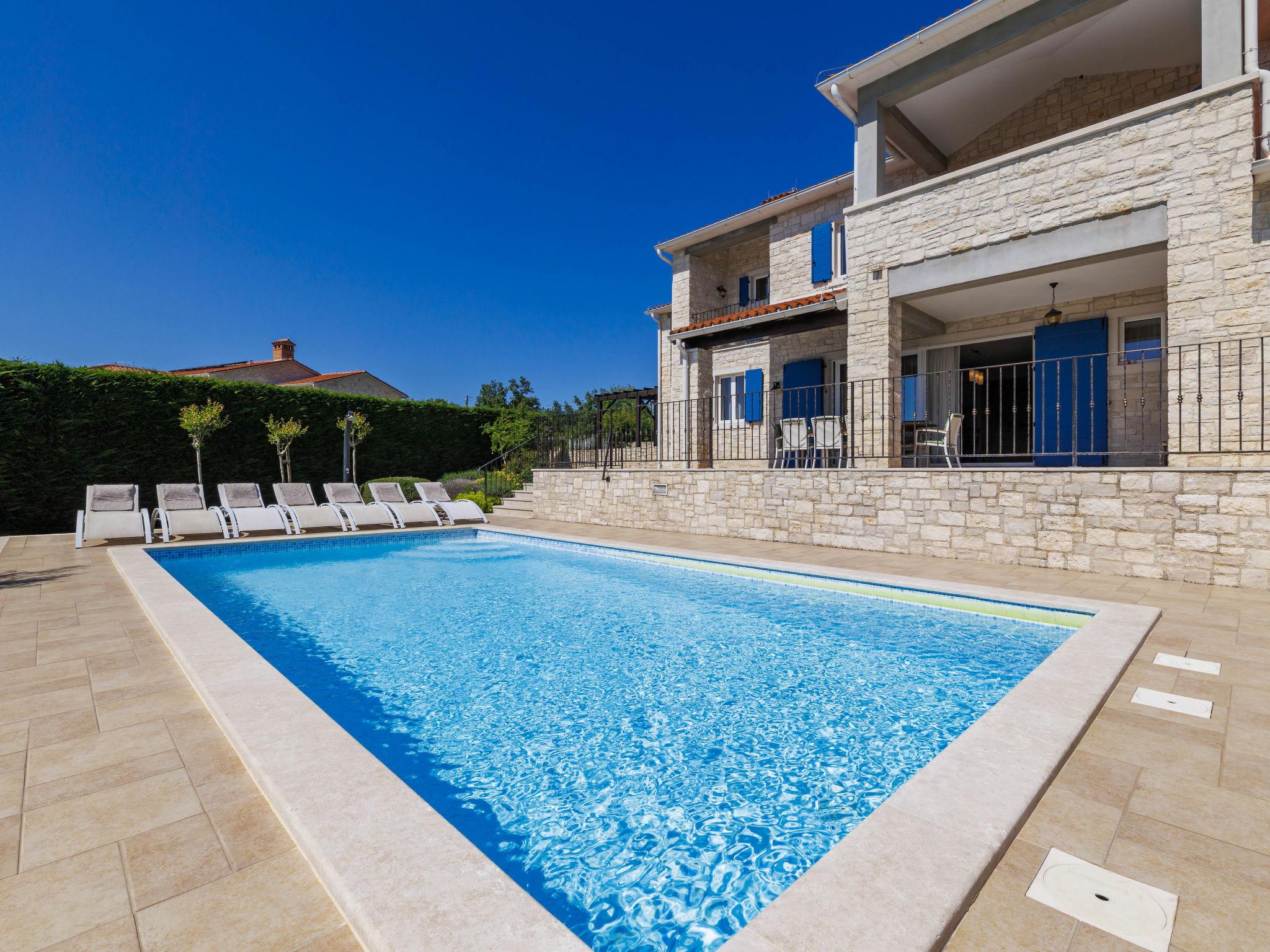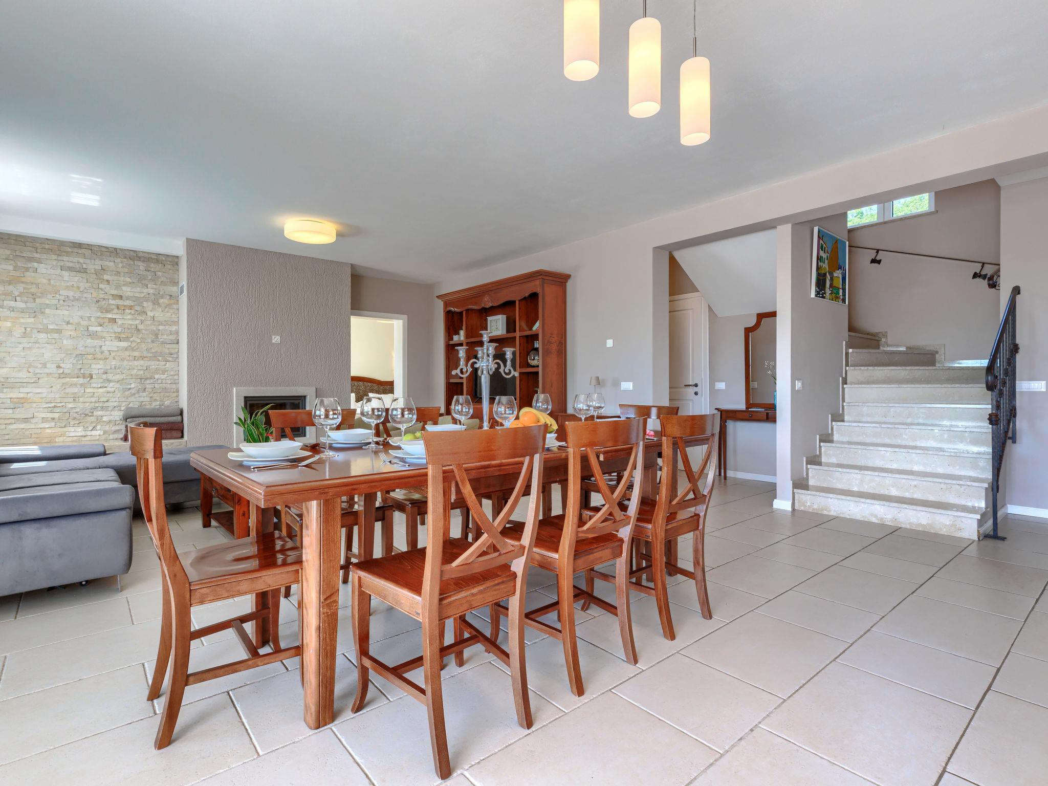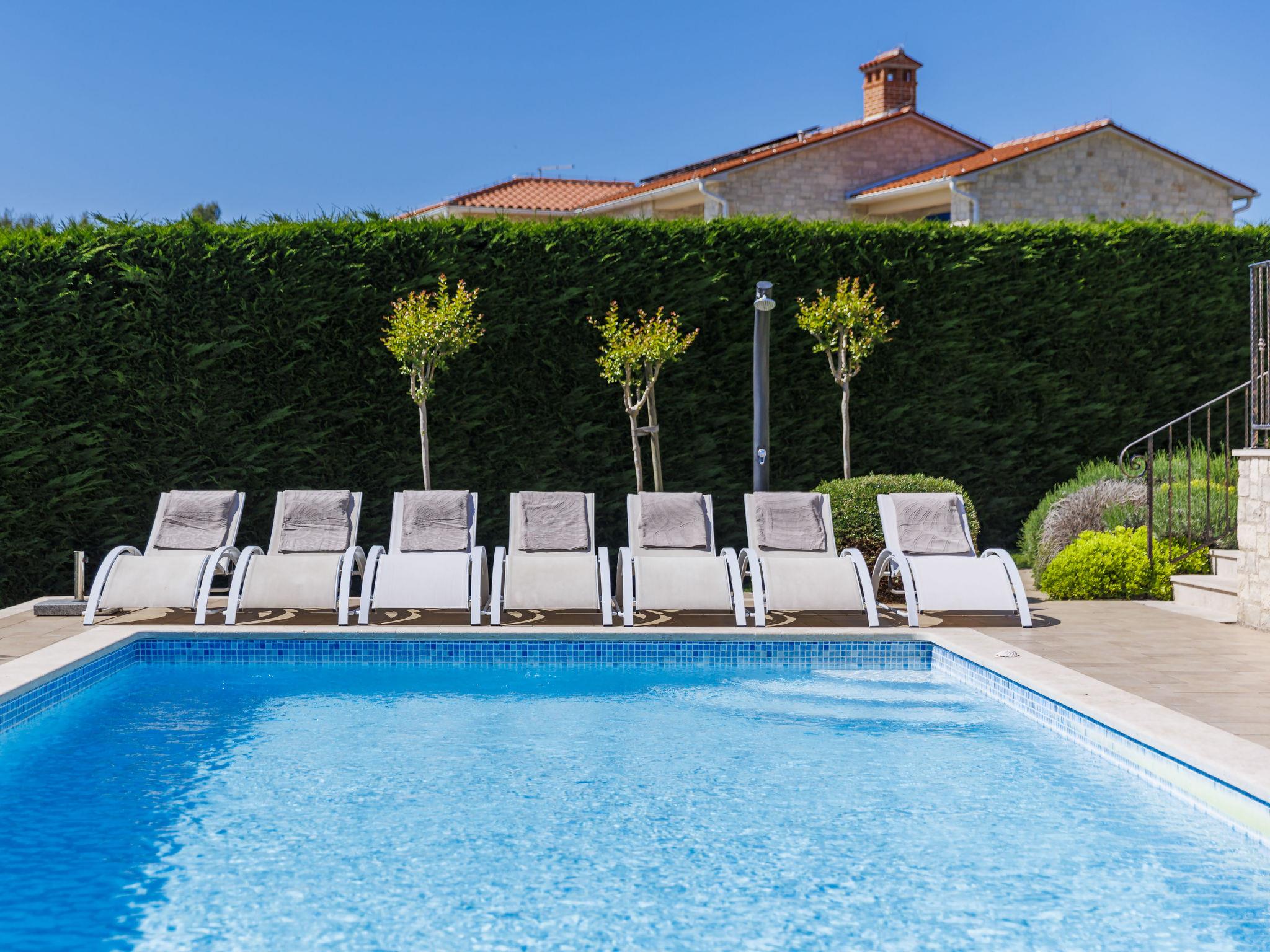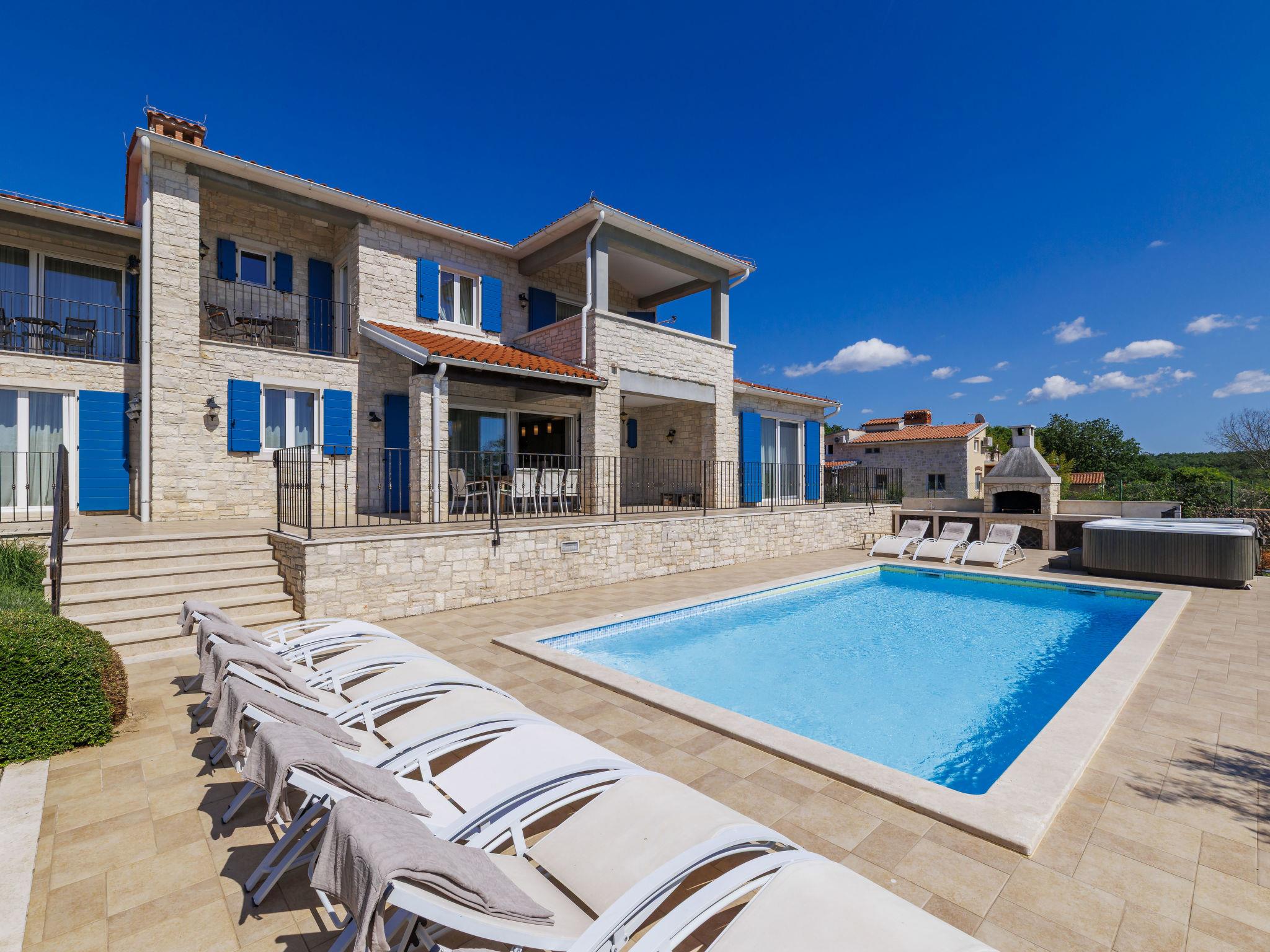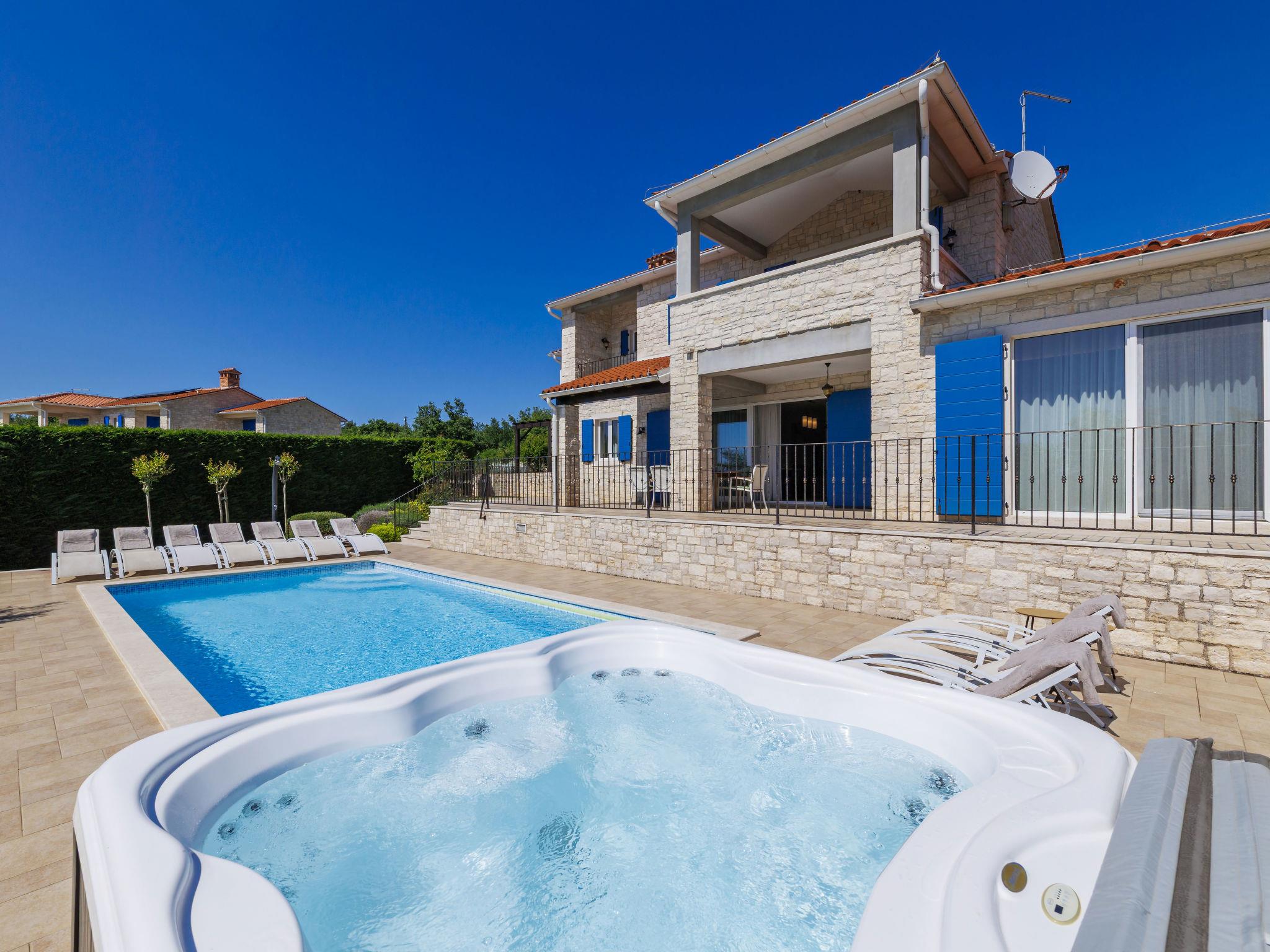 Beautiful villa "Babudri", 2 storeys. In the hamlet Strpacici 2 km from the centre of Višnjan, 12 km from the centre of Porec, in a sunny position, 15 km from the sea, 15 km from the beach. Private: property 1'120 m2 (fenced) with lawn, swimming pool angular, heated (4 x 8 m, depth 140 cm, seasonal availability: 01.May. - 01.Nov.) with internal staircase. Outdoor shower, hot tub, garden furniture, barbecue. In the house: internet access, sauna, washing machine, tumble dryer. Parking (for 3 cars) at the house on the premises. Supermarket 2 km, restaurant 2 km, bus stop 3 km, pebble beach 15 km, rocky beach 15 km. Walking paths from the house 100 m, cycle lane 150 m. Swimming pool heated (extra).