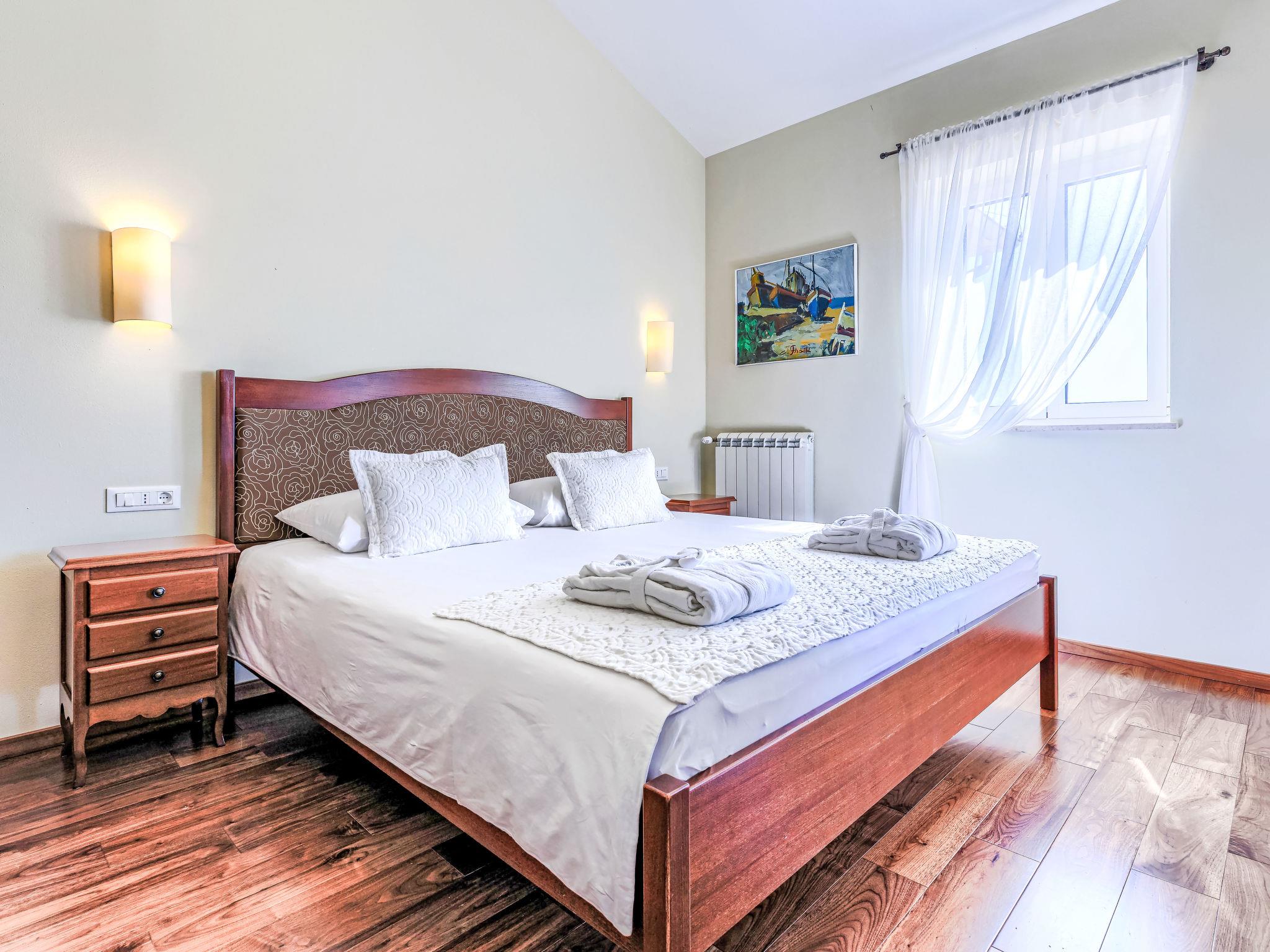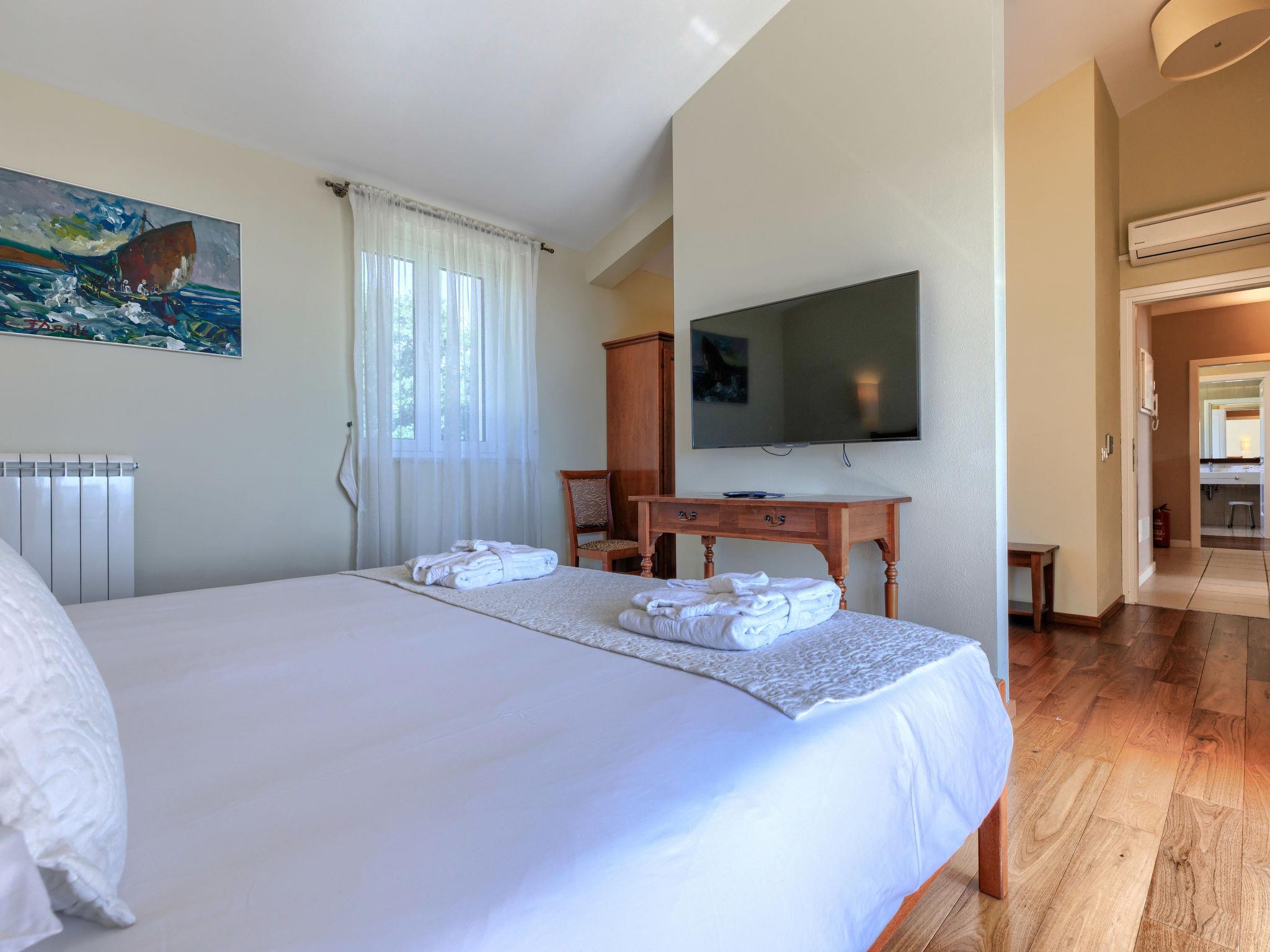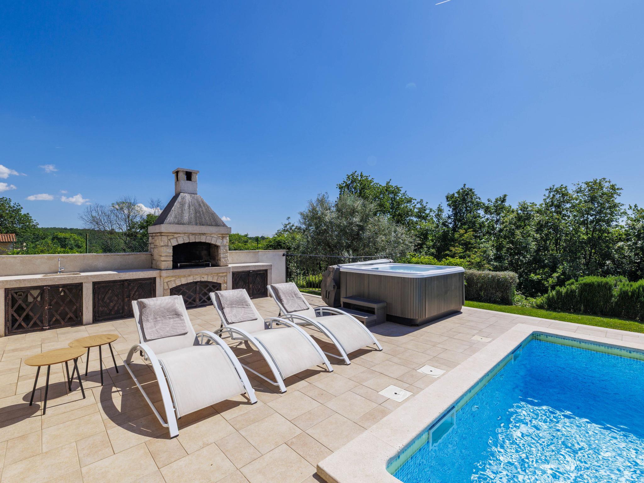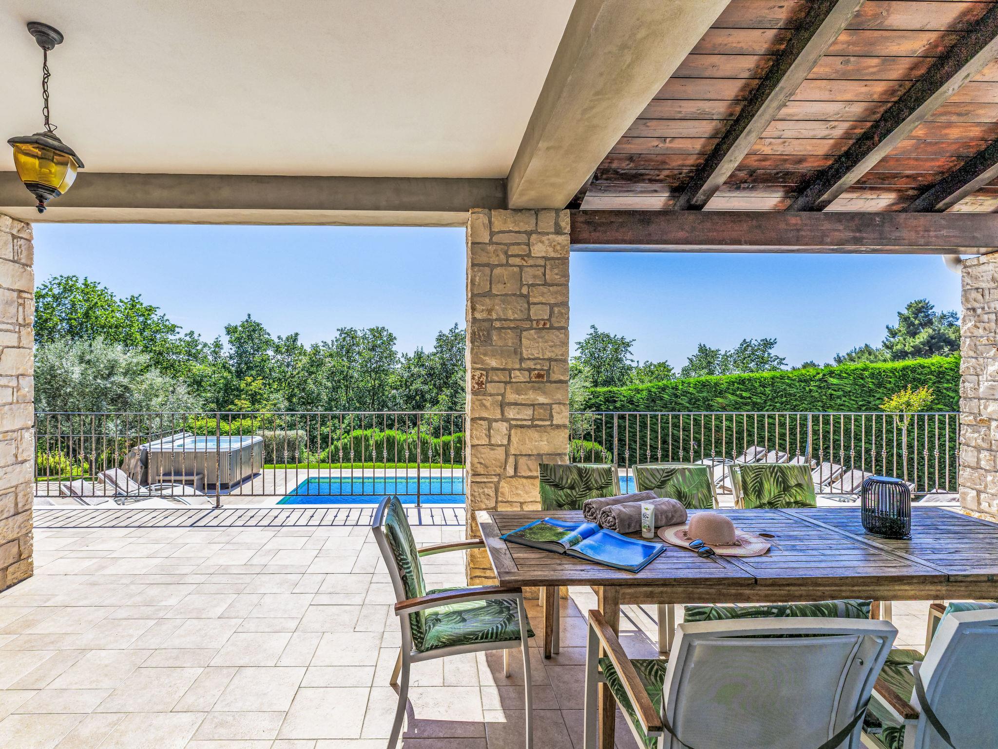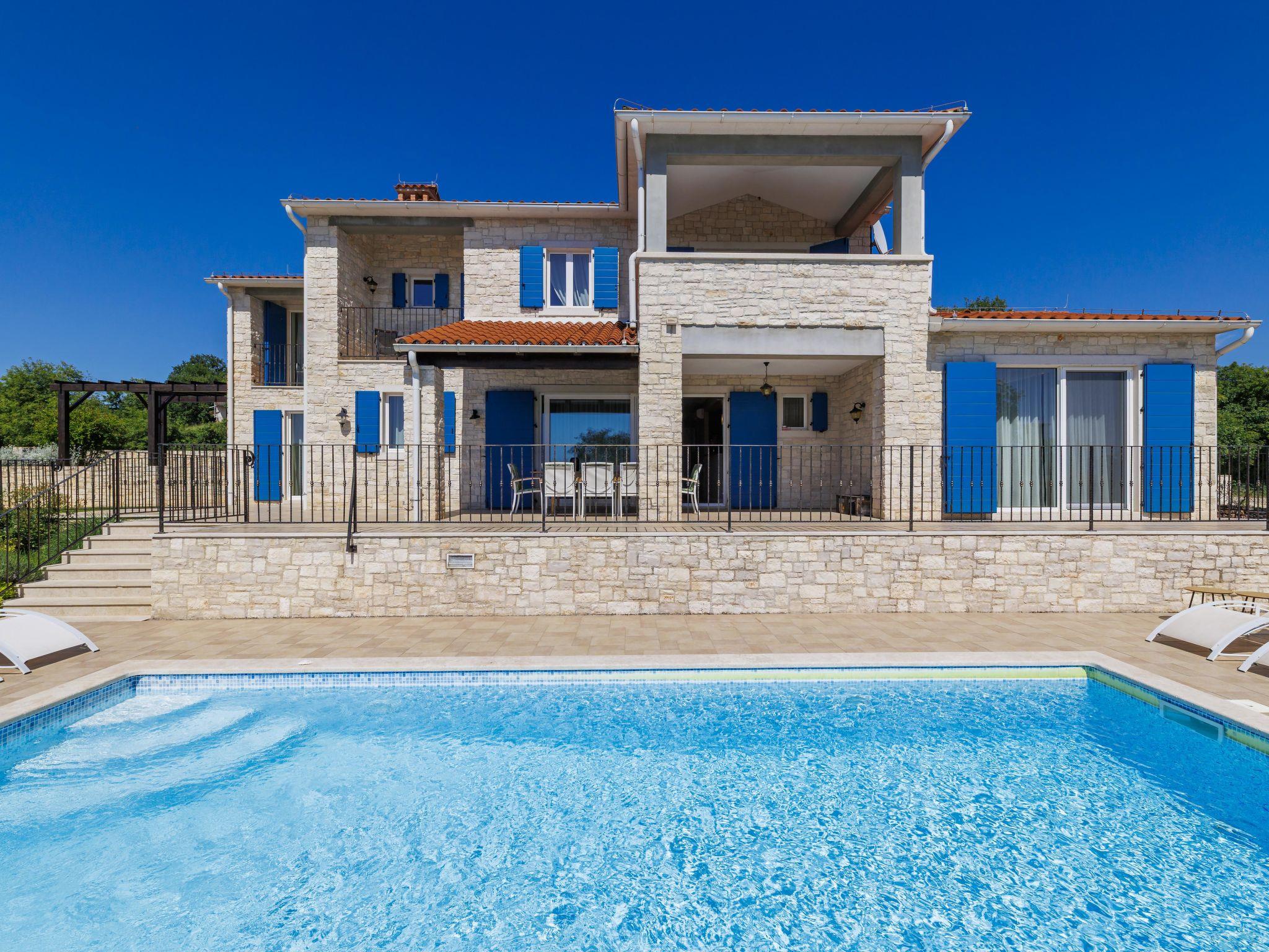 Beautiful villa "Babudri", 2 storeys. In the hamlet Strpacici 2 km from the centre of Višnjan, 12 km from the centre of Porec, in a sunny position, 15 km from the sea, 15 km from the beach. Private: property 1'120 m2 (fenced) with lawn, swimming pool angular, heated (4 x 8 m, depth 140 cm, seasonal availability: 01.May. - 01.Nov.) with internal staircase. Outdoor shower, hot tub, garden furniture, barbecue. In the house: internet access, sauna, washing machine, tumble dryer. Parking (for 3 cars) at the house on the premises. Supermarket 2 km, restaurant 2 km, bus stop 3 km, pebble beach 15 km, rocky beach 15 km. Walking paths from the house 100 m, cycle lane 150 m. Swimming pool heated (extra).